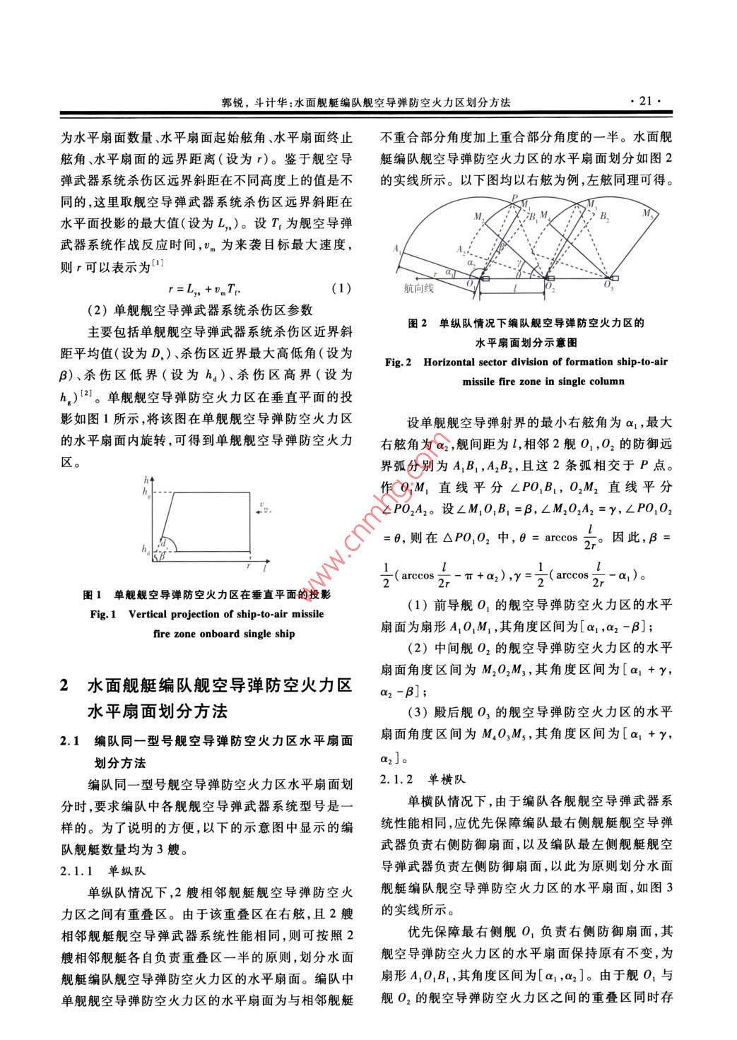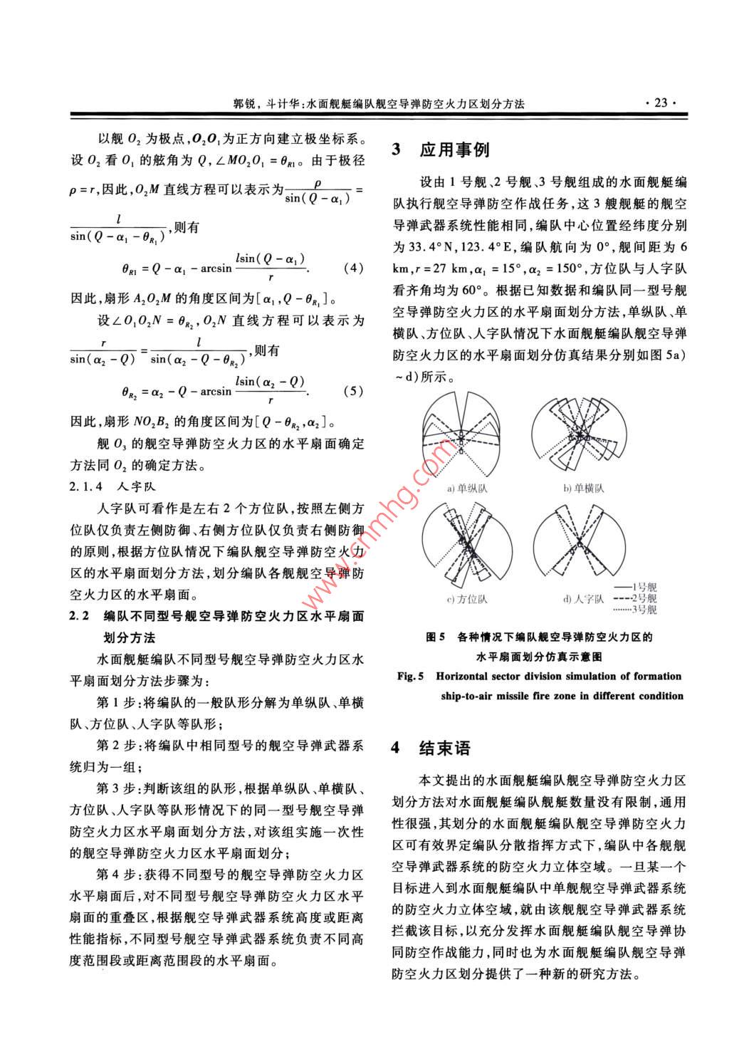 2015年6月現(xiàn)代防御技術(shù)Jun.2015第43卷第3期MODERN DEFENCE TECHNOLOGYVol 43 No. 3口史天防御體系與武器水面艦艇編隊(duì)艦空導(dǎo)彈防空火力區(qū)劃分方法郭銳,斗計(jì)華(海軍大連艦艇學(xué)院,遼寧大連116018)摘要:在分析水面艦艇單艦艦空導(dǎo)彈防空火力區(qū)的基礎(chǔ)上,提出了編隊(duì)艦空導(dǎo)彈防空火力區(qū)劃分方法,對單縱隊(duì)、單橫隊(duì)、方位隊(duì)等典型隊(duì)形的編隊(duì)艦空導(dǎo)彈防空火力區(qū)的水平扇面進(jìn)行劃分,并給出主要扇面參數(shù)。研究結(jié)論可有效劃分編隊(duì)艦空導(dǎo)彈防空火力區(qū),從而為充分發(fā)揮編隊(duì)綜合防空作戰(zhàn)能力提供科學(xué)依據(jù)。關(guān)鍵詞:水面艦艇編隊(duì);艦空導(dǎo)彈;防空火力區(qū);防空隊(duì)形doi:10.3969/j.isn.1009086x2015.03.004中圖分類號(hào):T762.3·3文獻(xiàn)標(biāo)志碼:A文章編號(hào):1009086X(2015)030020405Formation Ship to Air Missile Fire Zone Division MethodGUO Rui, dou Ji-huaDalian Navy Academy, Liaoning Dalian 116018, China)Abstract: Based on the proposed single ship ship to air missile fire zone method, formation ship toair missile fire zone division method is proposed, which can divide the plane sectors of the formation shijto air missile fire zone for representative orders such as single column, single row and azimuth order, andpresent the main parameters of the sectors. The formation ship to air missile fire zone can be effectivelyresearch results, and it can provide scientific gist for fully exerting the integrated airKey words: surface ship formation; ship to air missile; fire zone; aerial defense order0引言艇編隊(duì)隊(duì)形樣式,提出了水面艦艇編隊(duì)艦空導(dǎo)彈防空火力區(qū)劃分方法,建立了相關(guān)數(shù)學(xué)模型,可有效用水面艦艇編隊(duì)艦空導(dǎo)彈防空火力區(qū)決定了水面來劃分編隊(duì)艦空導(dǎo)彈防空火力區(qū),從而充分發(fā)揮水艦艇編隊(duì)艦空導(dǎo)彈武器系統(tǒng)對來襲空中目標(biāo)的作戰(zhàn)面艦艇編隊(duì)艦空導(dǎo)彈協(xié)同防空作戰(zhàn)能力。能力,其劃分方法成為水面艦艇編隊(duì)艦空導(dǎo)彈防空作戰(zhàn)使用研究中的重難點(diǎn)問題之一。只有在編隊(duì)艦1單艦艦空導(dǎo)彈防空火力區(qū)空導(dǎo)彈防空火力區(qū)劃分合理的情況下,才能有效實(shí)單艦艦空導(dǎo)彈防空火力區(qū)是一個(gè)立體空域,其施編隊(duì)艦空導(dǎo)彈協(xié)同防空作戰(zhàn)。然而,目前國內(nèi)外主要參數(shù)有還缺乏得到一致認(rèn)可的水面艦艇編隊(duì)艦空導(dǎo)彈防空1)單艦艦空導(dǎo)彈防空火力區(qū)水平扇面參數(shù)火力區(qū)劃分方法-121。針對于此,本文結(jié)合水面艦單艦艦空導(dǎo)彈防空火力區(qū)的水平扇面主要參數(shù)收稿日期:2013-11-22;修回日期:2014-07-03作者簡介:郭銳(1973-),男,安徽泗縣人。副教授,博士,研究方向?yàn)楹\姂?zhàn)術(shù)、軍事運(yùn)籌通信地址:116018遼寧省大連市海軍大連艦艇學(xué)院科研部Emal:segr@163.com郭銳,斗計(jì)華:水面艦艇編隊(duì)艦空導(dǎo)彈防空火力區(qū)劃分方法為水平扇面數(shù)量、水平扇面起始舷角、水平扇面終止不重合部分角度加上重合部分角度的一半。水面艦舷角、水平扇面的遠(yuǎn)界距離(設(shè)為r)。鑒于艦空導(dǎo)艇編隊(duì)艦空導(dǎo)彈防空火力區(qū)的水平扇面劃分如圖2彈武器系統(tǒng)殺傷區(qū)遠(yuǎn)界斜距在不同高度上的值是不的實(shí)線所示。以下圖均以右舷為例,左舷同理可得。同的,這里取艦空導(dǎo)彈武器系統(tǒng)殺傷區(qū)遠(yuǎn)界斜距在水平面投影的最大值(設(shè)為L,)。設(shè)Tr為艦空導(dǎo)彈武器系統(tǒng)作戰(zhàn)反應(yīng)時(shí)間,"n為來襲目標(biāo)最大速度,A,則r可以表示為(1)航向線(2)單艦艦空導(dǎo)彈武器系統(tǒng)殺傷區(qū)參數(shù)主要包括單艦艦空導(dǎo)彈武器系統(tǒng)殺傷區(qū)近界斜圖2單縱隊(duì)情況下編隊(duì)艦空導(dǎo)彈防空火力區(qū)的水平扇面劃分示意圖距平均值(設(shè)為D,)殺傷區(qū)近界最大高低角(設(shè)為Fig. 2 Horizontal sector division of formation ship-to-airB)、殺傷區(qū)低界(設(shè)為ha)、殺傷區(qū)高界(設(shè)為missile fire zone in single columnh,)2。單艦艦空導(dǎo)彈防空火力區(qū)在垂直平面的投影如圖1所示,將該圖在單艦艦空導(dǎo)彈防空火力區(qū)設(shè)單艦艦空導(dǎo)彈射界的最小右舷角為a1,最大的水平扇面內(nèi)旋轉(zhuǎn),可得到單艦艦空導(dǎo)彈防空火力右舷角為a2,艦間距為相鄰2艦O1,O2的防御遠(yuǎn)界弧分別為A1B1,A2B2,且這2條弧相交于P點(diǎn)作O1M1直線平分∠POB1,O2M2直線平分∠PO242。設(shè)∠M1O1B1=B,∠M2O2A2=y,∠P0,O2=0,則在△POO2中,6= arccos.。因此,B=2(arcco- Er T+2),y=0(arccosl2r-a1)。圖1單艦艦空導(dǎo)彈防空火力區(qū)在垂直平面的投影(1)前導(dǎo)艦O1的艦空導(dǎo)彈防空火力區(qū)的水平Fig 1 Vertical projection of ship-to-air missilefire zone onboard single ship扇面為扇形A1O1M1,其角度區(qū)間為[ar1,a2-B(2)中間艦O2的艦空導(dǎo)彈防空火力區(qū)的水平扇面角度區(qū)間為M2O2M3,其角度區(qū)間為[α1+γ,2水面艦艇編隊(duì)艦空導(dǎo)彈防空火力區(qū)B]水平扇面劃分方法(3)殿后艦O3的艦空導(dǎo)彈防空火力區(qū)的水平21編隊(duì)同一型號(hào)艦空導(dǎo)彈防空火力區(qū)水平扇面扇面角度區(qū)間為M4O3M3,其角度區(qū)間為