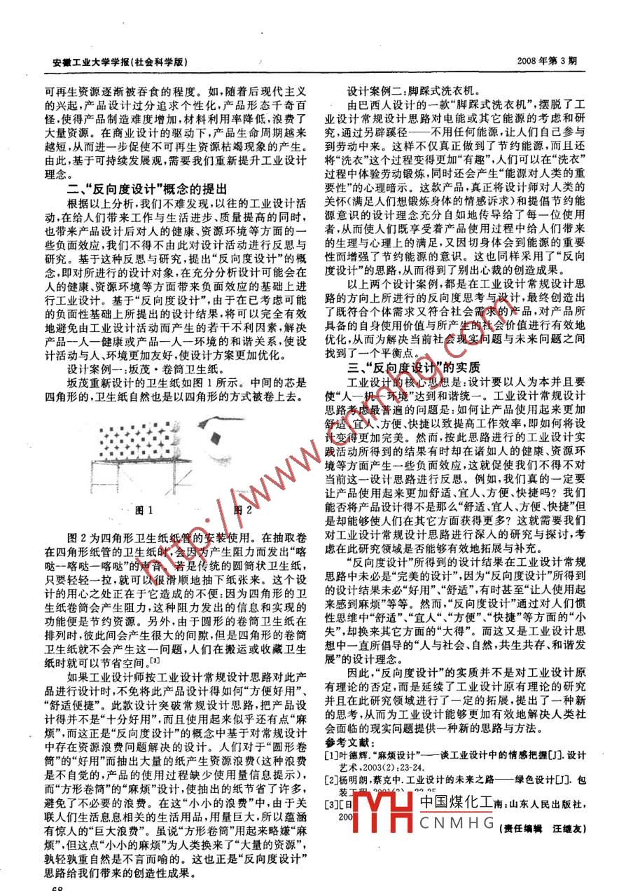 第25卷第3期安徽工業(yè)大學(xué)學(xué)報(社會科學(xué)版)Vol. 25, No.32008年5月Journal of Anhui University of Technology (Social Sciences)May,2008工業(yè)設(shè)計中的“反向度設(shè)計”王雪潔',許佳',晏 群”,盛亮(1.昆明理工大學(xué)文學(xué)院,云南昆明650093;2.安徽工業(yè)大學(xué)機械工程學(xué)院,安徽馬鞍山243002)摘要:“反向度設(shè)計”概念的提出,旨在解決傳統(tǒng)設(shè)計思路下的工業(yè)設(shè)計未能完整高效地解決設(shè)計后諸多現(xiàn)實問題與未來問題,其實質(zhì)不是對工業(yè)設(shè)計原有理論的否定,而是為工業(yè)設(shè)計自身發(fā)展拓展--種新的設(shè)計思路。關(guān)鍵詞:工業(yè)設(shè)計;反向度設(shè)計;設(shè)計思路中圉分類號:TB47;F403.6文獻標(biāo)識碼:A文章編號:1671-9247(2008)03-0067-02On“Reverse of Design" in Industrial DesignWANG Xueje',XU Jta',YAN Qum2 , SHENG Liang'(1. School of Arts, Kunming University of Science and Technology,Kunming 650039,Yunnan;2. School of Mechanical Engineering, AHUT, Ma'anshan 243002, Anbui, China)Abstract:The advancement of the concept of“reverse of design" aims to solve both practical and future problems failedto complete eficiently by traditional industrial design, which provides a new design idea for industrial design other than de-nying the current industrial design.Key worsindustrial design; reverse of design; design ideas工業(yè)設(shè)計發(fā)展至今,不僅為人類社會工業(yè)、經(jīng)濟與行 ,讓人們以車代步,遠(yuǎn)離鍛煉;電梯的設(shè)計,讓人上下生活等諸多方面的進步起到了巨大的推動作用,而且樓也不再登樓梯;電腦的設(shè)計使人在工作時長久在屏在解決人類社會現(xiàn)實與未來問題、創(chuàng)造人類健康工作幕[前端坐;鼠標(biāo)的工業(yè)設(shè)計,使手指因減少書寫而缺少與生活方面也發(fā)揮了巨大影響,其自身也在發(fā)展進程活動,等等類似問題,由此造成人們身體素質(zhì)嚴(yán)重下降中逐步形成了--些設(shè)計理念與方法,并在設(shè)計實踐中也就不難理解了。應(yīng)當(dāng)說這是科技進步與工業(yè)設(shè)計共不斷豐富與完善。隨著科學(xué)技術(shù)的高速發(fā)展、社會進同“縱容”的結(jié)果。[1對于這樣的情況,應(yīng)該說是工業(yè)設(shè)步的快速發(fā)展、生活環(huán)境的不斷改善、生活水平與質(zhì)量計師在進行產(chǎn)品設(shè)計時未能完全有效地考慮對健康因的不斷提高,工業(yè)設(shè)計越來越與人們的工作與生活空素所帶來的負(fù) 面效應(yīng),因為產(chǎn)品本身不僅僅是具有單間相融合。眾多的工業(yè)設(shè)計活動極大地推進了工業(yè)設(shè)-的使用功能,它應(yīng)該還有社會功能,應(yīng)努力減少設(shè)計計理論.思想與方法的研究與完善,指導(dǎo)著我們在工業(yè)所造成的負(fù)面效應(yīng)。如何讓產(chǎn)品代替設(shè)計師把對人的設(shè)計實踐活動中能夠切實有效地解決諸多現(xiàn)實問題,健康的關(guān)心傳達(dá)給消費者,是現(xiàn)代工業(yè)設(shè)計師應(yīng)該考為建設(shè)更加和諧的社會環(huán)境、提供更加優(yōu)質(zhì)的工作與慮的-一個問題。生活質(zhì)量發(fā)揮工業(yè)設(shè)計的作用。然而,通過若干產(chǎn)品.(二)資源環(huán)境問題設(shè)計現(xiàn)狀不難發(fā)現(xiàn),基于傳統(tǒng)設(shè)計思路下的工業(yè)設(shè)計工業(yè)設(shè)計在其形成與發(fā)展的過程中,從最初的裝未能完全有效地解決人類社會諸多現(xiàn)實問題與未來問飾主義、形式主義,到近代主義、理性主義,以及到后來題,這使我們基于傳統(tǒng)工業(yè)設(shè)計的思想進行產(chǎn)品設(shè)計的現(xiàn)代主義、后現(xiàn)代主義,其設(shè)計理念一直在不停地變面臨一個新的課題,需要加以研究?;?并不斷完善自己,改進自身存在的弊端。但無論--、工業(yè)設(shè)計中存在的現(xiàn)實問題傳統(tǒng)的工業(yè)設(shè)計理念怎么演變,對資源環(huán)境因素考慮(一)人類自身健康問題得不夠充分始終是其存在的缺憾,也從而間接地給人人類自身健康問題分為生理健康問題和心理健康類帶來了一些不良的影響,其集中體現(xiàn)在兩個方面:問題。就生理健康問題而言,據(jù)《當(dāng)代健康報》報道:在“產(chǎn)生大量的生活垃圾”與“加速地球上不可再生資源當(dāng)今社會,人群的健康狀況分布像個兩頭尖尖的橄欖的消耗”。球:15%的人是健康狀態(tài),稱第一狀態(tài);15%的人屬于我們知道,任何一種產(chǎn)品,無論其壽命有多長,但疾病狀態(tài),稱第二狀態(tài);其余70%的人都屬于亞健康最終避免不了因老化損壞被廢棄的結(jié)局。以往的設(shè)計,狀態(tài),即第三狀態(tài)。在亞健康人群中,知識分子尤其是因沒有綠色意識,造成產(chǎn)品被廢棄后不可回收,不可重中年知識分子是絕對的主力軍,高達(dá)70%。人類所生復(fù)利用,從而使產(chǎn)品廢棄物越積越多。同樣因為沒有存的社會環(huán)境機械化與自動化程度越來越高,人類體綠色設(shè)計意識,在設(shè)計中會選擇一些有毒的材料或難力勞動強度的越來越小,工業(yè)設(shè)計的結(jié)果讓產(chǎn)品變得以降解的材料,致使產(chǎn)生的產(chǎn)品廢棄物污染環(huán)境。隨使用更加方便、快捷的趨勢進-步促使人們在體力勞著世界人口的增長,產(chǎn)品廢棄物一--生活 垃圾產(chǎn)生的動方面變得更加“