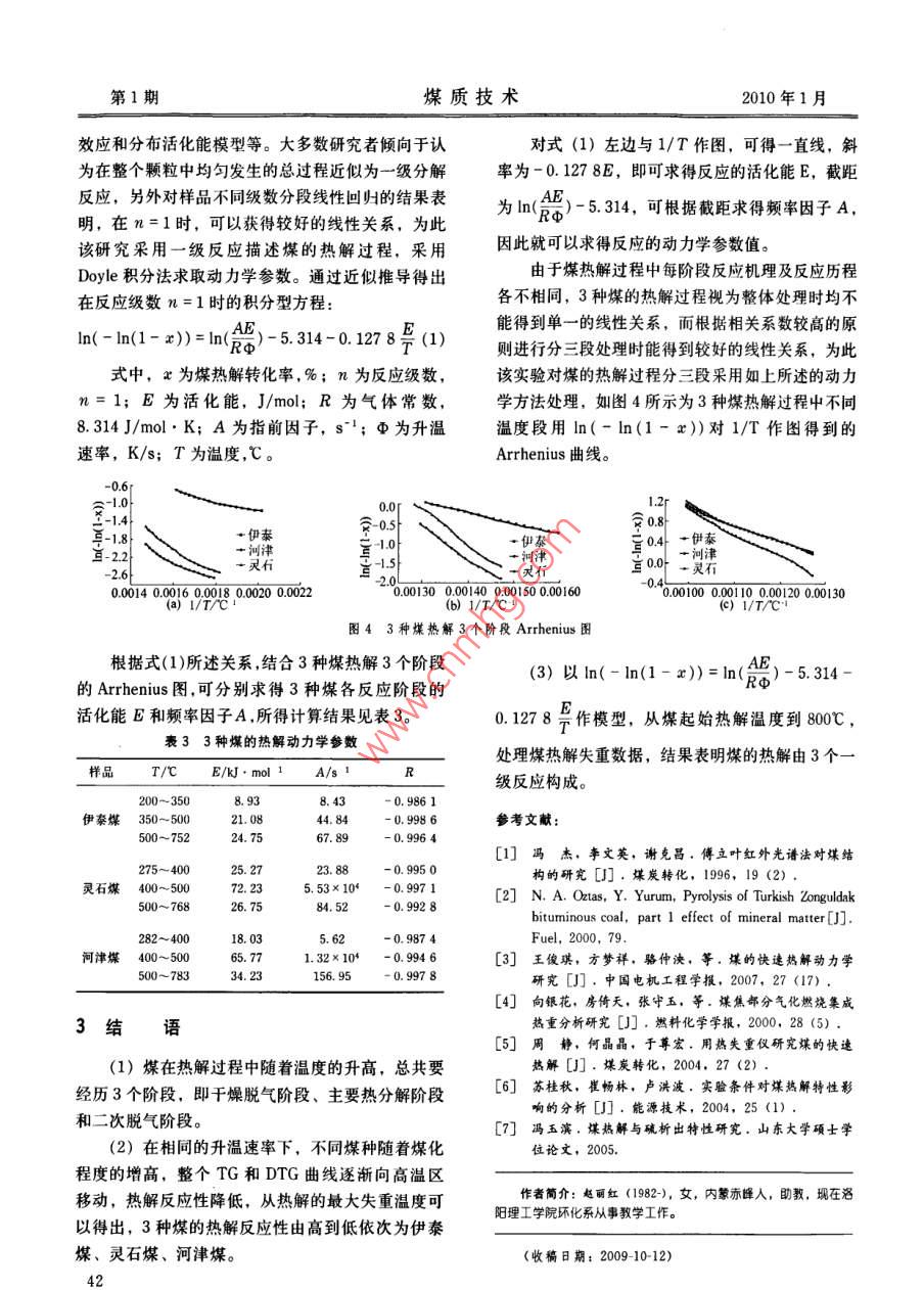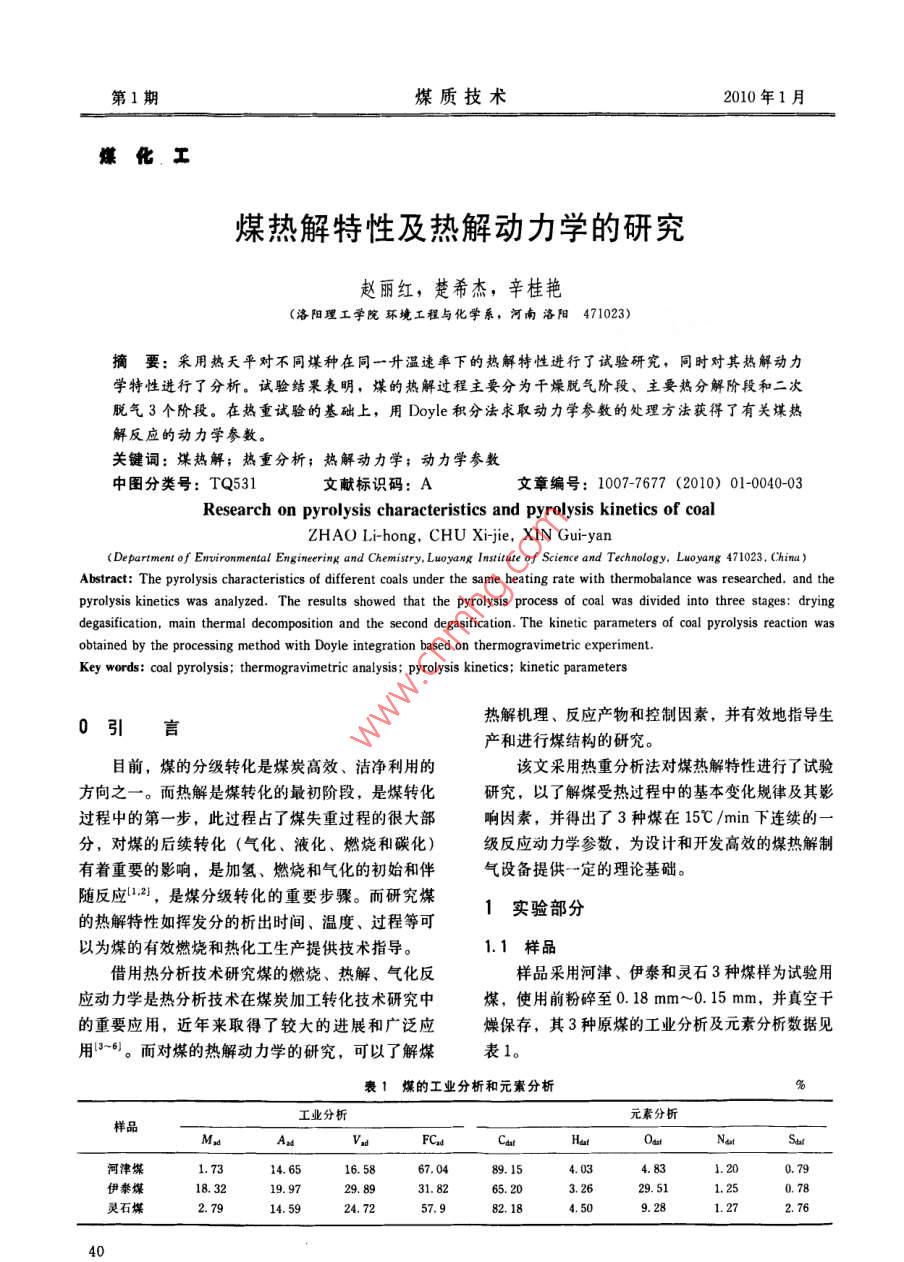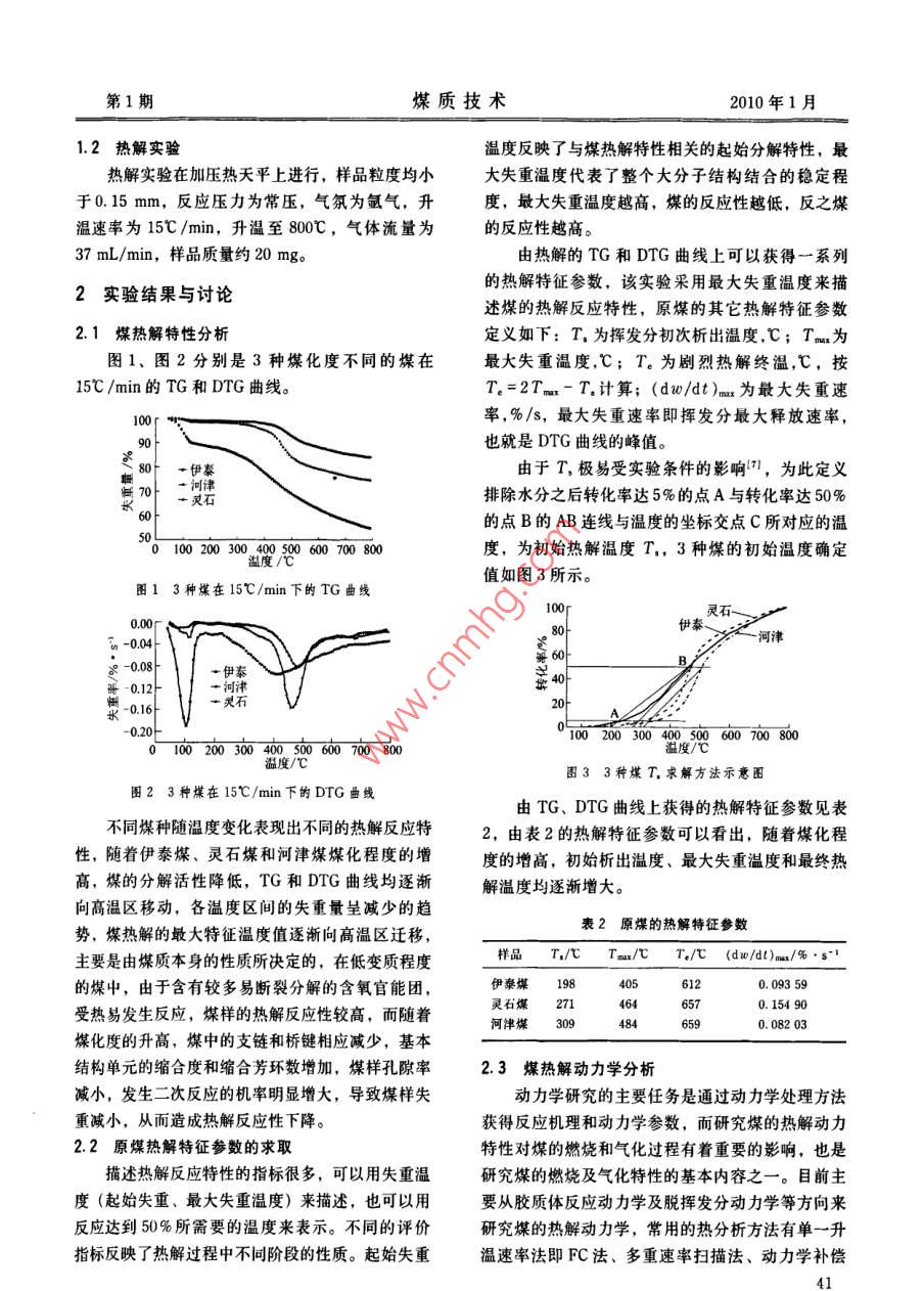 第1期煤質(zhì)技術(shù)2010年1月煤化,工煤熱解特性及熱解動力學(xué)的研究趙麗紅,楚希杰,辛桂艷(洛陽理工學(xué)院環(huán)境工程與化學(xué)系,河南洛陽471023)摘要:采用熱天平對不同煤種在同一升溫速率下的熱解特性進(jìn)行了試驗研究,同時對其熱解動力學(xué)特性進(jìn)行了分析。試驗結(jié)果表明,煤的熱解過程主要分為干燥脫氣階段、主要熱分解階段和二次脫氣3個階段。在熱重試驗的基礎(chǔ)上,用Doyle積分法求取動力學(xué)參數(shù)的處理方法獲得了有關(guān)煤熱解反應(yīng)的動力學(xué)參數(shù)。關(guān)鍵詞:煤熱解;熱重分析;熱解動力學(xué);動力學(xué)參數(shù)中圖分類號: TQ531文獻(xiàn)標(biāo)識碼: A文章編號: 1007-7677 (2010) 01-0040-03Research on pyrolysis characteristics and pyrolysis kinetics of coalZHAO Li-hong, CHU Xi-jie XIN Gui-yan(Deparment of Envig and Chemistry, LuoyInsitute of Science and Technology,Abstract: The pyrolysis characteristics of dfferent coals under the same heating rate with thermobalance was researched, and thepyrolysis kinetics was analyzed. The results showed that the pyrolysis process of coal was divided into three stages: dryingdegasifcation, main thermal decomposition and the second degasification. The kinetic parameters of coal pyrolysis reaction wasobtained by the processing method with Doyle integration based on thermogravimetric experiment.Key words: coal pyrolysis; thermogravimetric analysis; pyrolysis kinetics; kinetic parameters熱解機理、反應(yīng)產(chǎn)物和控制因素,并有效地指導(dǎo)生0引言產(chǎn)和進(jìn)行煤結(jié)構(gòu)的研究。目前,煤的分級轉(zhuǎn)化是煤炭高效、潔凈利用的該文采用熱重分析法對煤熱解特性進(jìn)行了試驗方向之一。而熱解是煤轉(zhuǎn)化的最初階段,是煤轉(zhuǎn)化研究,以了解煤受熱過程中的基本變化規(guī)律及其影過程中的第一步,此過程占了煤失重過程的很大部響因素,并得出了3種煤在15C /min下連續(xù)的一分,對煤的后續(xù)轉(zhuǎn)化(氣化、液化、燃燒和碳化)級反應(yīng)動力學(xué)參數(shù),為設(shè)計和開發(fā)高效的煤熱解制有著重要的影響,是加氫、燃燒和氣化的初始和伴氣設(shè)備提供一定的理論基礎(chǔ)。隨反應(yīng)L1.2),是煤分級轉(zhuǎn)化的重要步驟。而研究煤1實驗部分的熱解特性如揮發(fā)分的析出時間、溫度、過程等可以為煤的有效燃燒和熱化工生產(chǎn)提供技術(shù)指導(dǎo)。1.1 樣品借用熱分析技術(shù)研究煤的燃燒、熱解、氣化反樣品采用河津、伊泰和靈石3種煤樣為試驗用應(yīng)動力學(xué)是熱分析技術(shù)在煤炭加工轉(zhuǎn)化技術(shù)研究中煤,使用前粉碎至0.18 mm~0.15 mm,并真空干的重要應(yīng)用,近年來取得了較大的進(jìn)展和廣泛應(yīng)燥保存,其3種原煤的工業(yè)分析及元素分析數(shù)據(jù)見用13-61。而對煤的熱解動力學(xué)的研究,可以了解煤表1。表1煤的工業(yè)分析和元素分析工業(yè)分析元素分析樣品MsAsFCsatlat河津堞1.7314.6516. 5867.0489.154.034.831.200.79伊泰煤18. 3219.9729. 89.31. 82.65. 203.26;29. 511. 250.78靈石煤2.7914. 5924.7257.982.184.509.281.272.76l0第1期煤質(zhì)技術(shù)2010年1月1.2熱解實驗溫度反映了與煤熱解特性相關(guān)的起始分解特性,最熱解實驗在加壓熱天平上進(jìn)行,樣品粒度均小大失重溫度代表了整個大分子結(jié)構(gòu)結(jié)合的穩(wěn)定程于0.15 mm,反應(yīng)壓力為常壓,氣氛為氬氣,升度,最大失重溫度越高,煤的反應(yīng)性越低,反之煤溫速率為15C/min,升溫至800C,氣體流量為的反應(yīng)性越高。37 mL/min,樣品質(zhì)量約20 mg。由熱解的TG和DTG曲線上可以獲得一系列的熱解特征參數(shù),該實驗采用最大失重溫度來描2實驗結(jié)果與討論述煤的熱解反應(yīng)特性,原煤的其它熱解特征參數(shù)2.1煤熱解特性分析定義如下: T, 為揮發(fā)分初次析出溫度,C; T為圖1.圖2分別是3種煤化度不同的煤在最大失重溫度,C; T。為劇烈熱解終溫,C,按15C/min的TG和DTG曲線。T.=2Tm- T.計算; (dw/dt)m 為最大失重速率,%/s,最大失重速率即揮發(fā)分最大釋放速率,也就是DTG曲線的峰值。30個 伊泰由于T,極易受實驗條件的影響"”,為此定義一靈石排除水分之后轉(zhuǎn)化率達(dá)5%的點A與轉(zhuǎn)化率達(dá)50%0十的點B的AB連線與溫度的坐標(biāo)交點C所對應(yīng)的溫5001002003004000600700800度,為初始熱解溫度T.,3種煤的初始溫度確定溫度/心值如圖3所示。圖1 3種煤在15C/min下的TG曲線100靈石0.00~伊秦-河津-0.0406* -0.08伊泰; - 0.12.河津水-0.16--靈不石00.20-°TO0 200 30040500600 700 8000100200040050060700800圖33種煤T.求解方法示意圖圍2 3種煤在 15C/min下的DTG曲線由TG、DTG曲線上獲得的熱解特征參數(shù)見表不同煤種隨溫度變化表現(xiàn)出不同的熱解反應(yīng)特2,由表2的熱解特征參數(shù)可以看出,隨著煤化程性,隨著伊泰煤、靈石煤和河津煤煤化程度的增度的增高,初始析出溫度、最大失重溫度和最終熱高,煤的分解活性降低,TG和DTG曲線均逐漸解溫度均逐漸增大。向高溫區(qū)移動,各溫度區(qū)間的失重量呈減少的趨表2原煤的熱解特征參數(shù)勢,煤熱解的最大特征溫度值逐漸向高溫區(qū)遷移,主要是由煤質(zhì)本身的性質(zhì)所決定的,在低變質(zhì)程度樣品T./心Tmn/tT。/T (dw/dl1)ma/%.s-'的煤中,由于含有較多易斷裂分解的含氧官能團(tuán),伊秦煤1984056120. 093 59靈石煤27146650. 154 90受熱易發(fā)生反應(yīng),煤樣的熱
