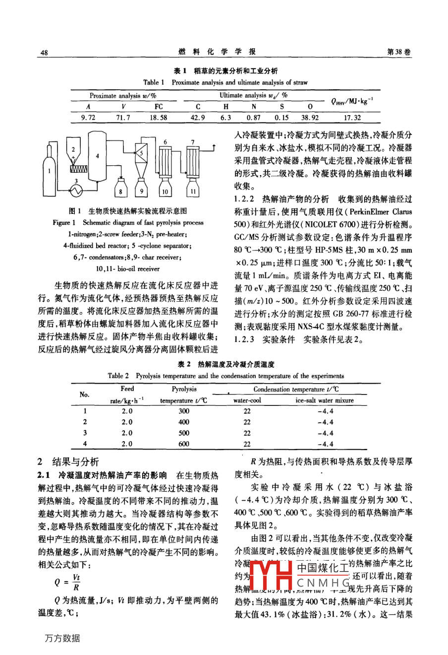 第38卷第1期燃料化學學報Vol. 38 No. 12010年2月Journal of Fuel Chemistry and TechnologyFeb.2010章編號:0253-2409(2010)0140047405溫度對稻草流化床快速熱解液相產(chǎn)物影響的研究栗冬,郭強,郝代林,陳雪莉,王輔臣(華東理工大學煤氣化教育部重點實驗室,上海200237)摘要:研究了溫度對稻草流化床快速熱解中熱解油產(chǎn)率的影響,利用GCMS、FTR考察了不同熱解溫度(300℃-600℃)及冷凝溫度(22℃、-4.4℃)下,稻草經(jīng)過熱解所獲得的熱解油組成。結(jié)果表明,稻草在400℃熱解溫度下可獲得最高熱解油產(chǎn)率43.1%;冷凝溫度對熱解油的品質(zhì)有較大影響,降低冷凝溫度能夠增加熱解油中有機物的含量,熱解油中的水分含量隨之降低,同時熱解油的熱值也隨之得到提高關(guān)鍵詞:生物質(zhì);快速熱解;熱解油;冷凝中圖分類號:TK6文獻標識碼:AEffect of temperature on the bio-oil from fast pyrolysis of straw in a fluidized bed reactorLI Dong, GUO Qiang, HAO Dai-lin, CHEN Xue-li, WANG Fu-chenKey Laboratory of Coal Gasification of Ministry of EducationEast China University of Science and Technology, Shanghai 200237, China)Abstract: The present work focused on the effect of pyrolysis temperatures on the yield of bio-oil from fast pyrolysisof straw in a fluidized bed reactor. The chemical compositions of bio-oil, obtained at 300C -600C coupling withcondensation at 22C or-4.4C, were examined by GC/MS and FT-IR. The results show that the highest bio-oilyield of 43. 1% is obtained at 400 C. The condensation temperature significantly affects the quality of bio-oilLower condensation temperature facilitates increasing of its heat value and the content of organics, and consequentlydecreasing the concentration of water. Based on the present result, the subsequent technology could be flexibly setup to meet the objective requirements and obtain operation parameters to optimize the pyrolysis processKey words: biomass; fast pyrolysis; bio-oil; condensation中國的生物質(zhì)能資源豐富理論資源量50億噸較大的不同; Puton等研究表明,隨著熱解溫度升左右。現(xiàn)階段可供利用開發(fā)的資源主要為生物質(zhì)廢髙,生物油含羥基、羰基功能團物質(zhì)減少;王樹榮棄物包括農(nóng)作物秸稈、薪柴禽畜糞便、工業(yè)有機廢等用氣相色譜/質(zhì)譜法分析了生物油的組成,發(fā)棄物和城市固體有機垃圾等。隨著世界石油儲量的現(xiàn)不同種類的生物油中主要組分的相對含量大致相減少,生物質(zhì)熱解油作為一種替代油品得到了較高同,生物油的黏度和pH值隨原料的不同而不同。的關(guān)注,快速熱解生物質(zhì)獲取熱解油成為有效利用在前人關(guān)于冷凝條件對快速熱解液態(tài)產(chǎn)物研究生物質(zhì)的方式之的基礎(chǔ)上,本研究主要探討稻草流化床快速熱解過對于生物質(zhì)快速熱解氣的冷凝及產(chǎn)物形態(tài),各程中,由于熱解溫度與冷凝溫度的改變,對主要熱解國研究者進行了大量的研究。在已開展的研究中,產(chǎn)物熱解油組成及性質(zhì)的影響。對熱解氣的冷凝均采用了快速冷凝的方式冷凝方1實驗部分式一般采取多級低溫冷凝的方式)。朱錫鋒等21.1實驗材料選用的材料為上海郊縣的稻草。在設(shè)計快速熱解反應(yīng)器時,采用了大流量噴霧直接經(jīng)粉碎機粉碎烘干、篩分后,取粒徑為0.12mm~冷凝收集生物油并分析了其成分;譚洪等研究了0.18mm的稻草粉體作為實驗原料。該原料為針狀纖維素半纖維素與木質(zhì)素在不同溫度下的熱解油產(chǎn)率的變化規(guī)律; Sipila等4利用CCMS研究了熱不規(guī)則粉體堆積密度1553kg/m3其工業(yè)分析元解油水溶相及非水溶相中的物質(zhì)組成; Mullen等(5)分析見表1。1.2實驗流程與條件利用GCMS、HPC分析了兩種苜蓿稈和草飼料快1.2守酪滀回圖1。速熱解油的組成,指出不同種類的熱解油其組成有中國煤化工收稿日期:20090509;修回日期:200908-11CNMHG基金項目:國家重點基礎(chǔ)研究發(fā)展規(guī)劃(973計劃,2004CB217703);長江學者和創(chuàng)新團隊發(fā)展計劃(TRm620)。聯(lián)系作者:陳雪莉(1975-),女,博士,E-mail;cxl@ecus.edu.cn。作者簡介:粟冬(1980-),男,山東濟寧人,博士研究生,研究方向生物質(zhì)熱解氣化,E-mail: lidongyeah@sin燃料化學學報第38卷表1稻草的元素分析和工業(yè)分析Table 1 Proximate analysis and ultimate analysis of strawProximate analysis w/%Ultimate analysis w,/%FCQm/M…kgCH71.742.96.30.0.1538.917.32人冷凝裝置中;冷凝方式為間壁式換熱,冷凝介質(zhì)分別為自來水、冰鹽水模擬不同的冷凝工況。冷凝器采用盤管式冷凝器,熱解氣走殼程,冷凝液體走管程的形式,共二級冷凝。冷凝獲得的熱解油由收料罐收集。1.2.2熱解油產(chǎn)物的分析收集到的熱解油經(jīng)過圖1生物質(zhì)快速熱解實驗流程示意圖稱重計量后,使用氣質(zhì)聯(lián)用儀( PerkinElmer Clarusigure 1 Schematic diagram of fast pyrolysis process500)和紅外光譜儀( NICOLET6700)進行分析檢測I-nitrogen; 2-screw feeder: 3-N, pre-heaterC/MS分析測試參數(shù)設(shè)定:色譜條件為升溫程序4-fluidized bed reactor; 5 -cyclone separator;80℃→300℃;柱型號HP5MS柱,30m×0.25mm6, 7-condensators: 8, 9-char receiver;10.11-bio-oil receiver0.25μm;進樣口溫度300℃;分流比50:1;載氣流量1mL/min。質(zhì)譜條件為電離方式El、電離能生物質(zhì)的快速熱解反應(yīng)在流化床反應(yīng)器中進量70eV、離子源溫度250℃、傳輸線溫度250℃、掃行。氮氣作為流化氣體經(jīng)預(yù)熱器預(yù)熱至熱解反應(yīng)描(m/2)10~500。紅外分