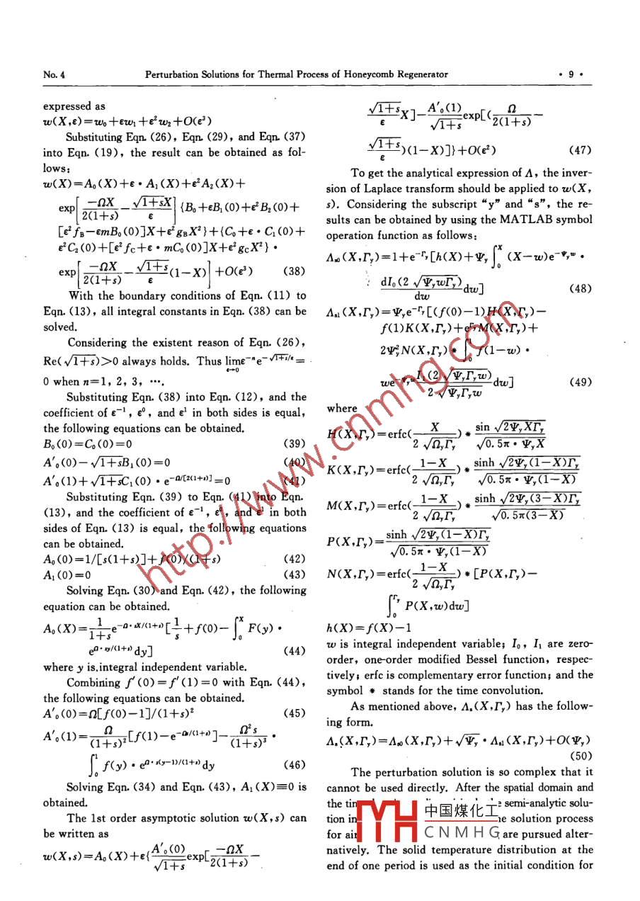 Available online at www.sciencedirect.comScienceDirectJ0URNAL OF IRON AND STEEL RESEARCH, INTERNATIONAL. 2007, 14(4); 06-10, 48Perturbation Solutions for Thermal Process of Honeycomb RegeneratorAI Yuan-fang,MEI Chi,HUANG Guo dong, JIANG Shao-jian(School of Energy Science and Enginering, Central South Univeriy, Changsha 410083, Hunan, China)Abstract; A parameter perturbation for the unsteadystate heat transfer characteristics of honeycomb regenerator ispresented, It is limited to the cases where the storage matrix has a small wall thickness s0 that no temperature varia-tion in the matrix perpendicular to the flow direction is .considered. Starting from a two phase transient thermal mod-el for the gas and storage matrix, an approximate solution for regenerator heat transfer process is derived using themultiple scale method for the limiting case where the longitudinal heat conduction of solid matrix is far less than theconvective heat transfer between the gas and the solid. The regenerator temperature profiles are expressed as Taylorseries of the cofficient of solid heat conduction item in the model. The analytical validity is shown by comparing theperturbation solution with the experinent and the numerical solution. The results show that it is possible for the per-turbation to improve the effectiveness and economics of thermal research on regenerators.Key words: honeycomb regenerator; thermal process; asymptotic analysis; semi-analytic methodHigh-temperature air combustion[1 used in themal performance. The analytical process withoutforging furnaces, soaking furnaces, continuousconsidering longitudinal solid heat conduction is easy.heating furnaces, ladle bakers, gas-fired radiantbut coarse, Considering the solid heat conductiontubes, and aluminum melting furnaces of the meta!-parallel to flow direction, Klein H[8] derived an ap-lurgical industry can provide high thermal efficien-proximate heat transfer solution using the Taylor' scy,reduced NO: emission, and uniform heat fluxseries expansions as a function of switch time t forfield. Most of these furnaces use the honeycomb re-the limiting case where the period of heating andgenerator-2.8. Its thermal characteristics such as thecooling process became infinitesimally small. Histemperature fluctuation and the temperature effi~conclusions could not be applied to the real situationciency are critical to achieve the optimal thermal per-because he treated“switching rapidly" as“t→0" andformance. Therefore, a more accurate research onassumed a0/at to be differentiable on t=0. In theregenerator heat transfer process is required,present study, the asymptotic solution of heat trans-Numerical simulation[4-61 is a theoretical meth-fer process for weak solid heat conduction is ob-od often used to solve regenerator thermal perform-tained through the perturbation method.ance. The mathematical analysis is an effective andDynamic Energy Balancesconvenient method. Zheng C H7] had carried outseveral investigations on the analytic solutions inThe regenerator temperature changes continu-case that the storage matrix has a small wall thick-ously with its location and time. Temperature varia-ness so that no temperature variation in the matrixtion perpendicular to the flow direction can be usual-perpendicular to the flow direction is considered,ly neglected because regenerators have a compara-but they are limited to the case where the longitudi-tively small wall thickness. Because the residual gasnal heat conduction is neglected. For regenerator,mass (the volume of the gas within the honeycombespecially compact regenerator, operating at a shortmatrix void) is less than 0.1% of the total gas massswitching period, the solid heat conduction in theflow, its effect on heat transfer is negligible'7間. There-length direction may lead to the change in the ther-fore,中國(guó)煤化工state and two-phaseFoundatlon Item:Item Sponsoted by High Technology Research and DevelopmentMHC N M H G0lAA514013)Biography: AI Yuan-fang(1968-), Male, Doctor, Associate Professor; E mail: yfai@maiL csu. edu. cn Revised Date; April 10, 2006No.4.Perturbation Solutions for Thermal Process of Honeycomb Regeneratorheat transfer model with energy balance equations(a,L)/(A.p.cp.), X=x/l, A.=(B, -0.,)/(8.o -..),for the gas and solid matrix can be sufficient.Ay=(), -0.)/(6,.o -08.1), the dimensionless constantsConsidering the symmetrical geometry of the幾= (a,LI)/(qm,yCp,) and業(yè)= (入.A.)/(a,Ll2), the :honeycomb structure, it can be assumed that theabove equations can be rewritten asdistribution of physical parameters is the same forAA./ar,-Q,H*A,/aX2 = =A,-A.(3)each cell of the honeycomb matrix. The region be-AAy/aX= -業(yè),(A,-A.)tween two symmetrical adiabatic surfaces shown inA,(0,F,)=1,JA. (0,r,)/aX=aA,(1,r,)/aX=0 (5)Fig. 1 is taken as the control volume. The flue gasA,(X,0)= f(X)and air are regarded as the ideal gas.Eqn. (3) to Eqn. (6) are the 2nd order linearDuring the flue gas cooling period shown inpartial differential equations with constant coeffi-Fig. 1, the coordinate origin is at the flue gas inlet,cients. Under certain conditions, its solution exists'andx axis is along the flow direction. The energyand is unique, continuous, and differentiable.balance for the element dx at x shown in Fig. 1The subscript “y" and“s" can be neglected toyields the following equations:simplify the expression, Combining Eqn. (3) withA.p.cp..a0./at- A,A.J0,/ax2 =a,L(0,-θ.)(1) Eqn. (4), A, can be eliminated and thereforegqm,yCp,DU,/Ax=-a,L(O, -0,)(2)a.|2A_ -341+2+ 23A- ψ°A=0(7)whereA is area, m2; P is density, (kg ●m~*); cp is”|示ax|taxtaxarspecific heat at constant pressure, (kJ.kg-'●K-);θIntroducing the complex variables s and w(X,s)==is temperature,"C; tis time, s; λ is thermal conduc-L[A(X,r)], and considering the derivative theoremtivity, (kW●m-1● K-); a is surface coefficient ofand Eqn. (6), the following equation can be ob-heat transfer including heat convection an