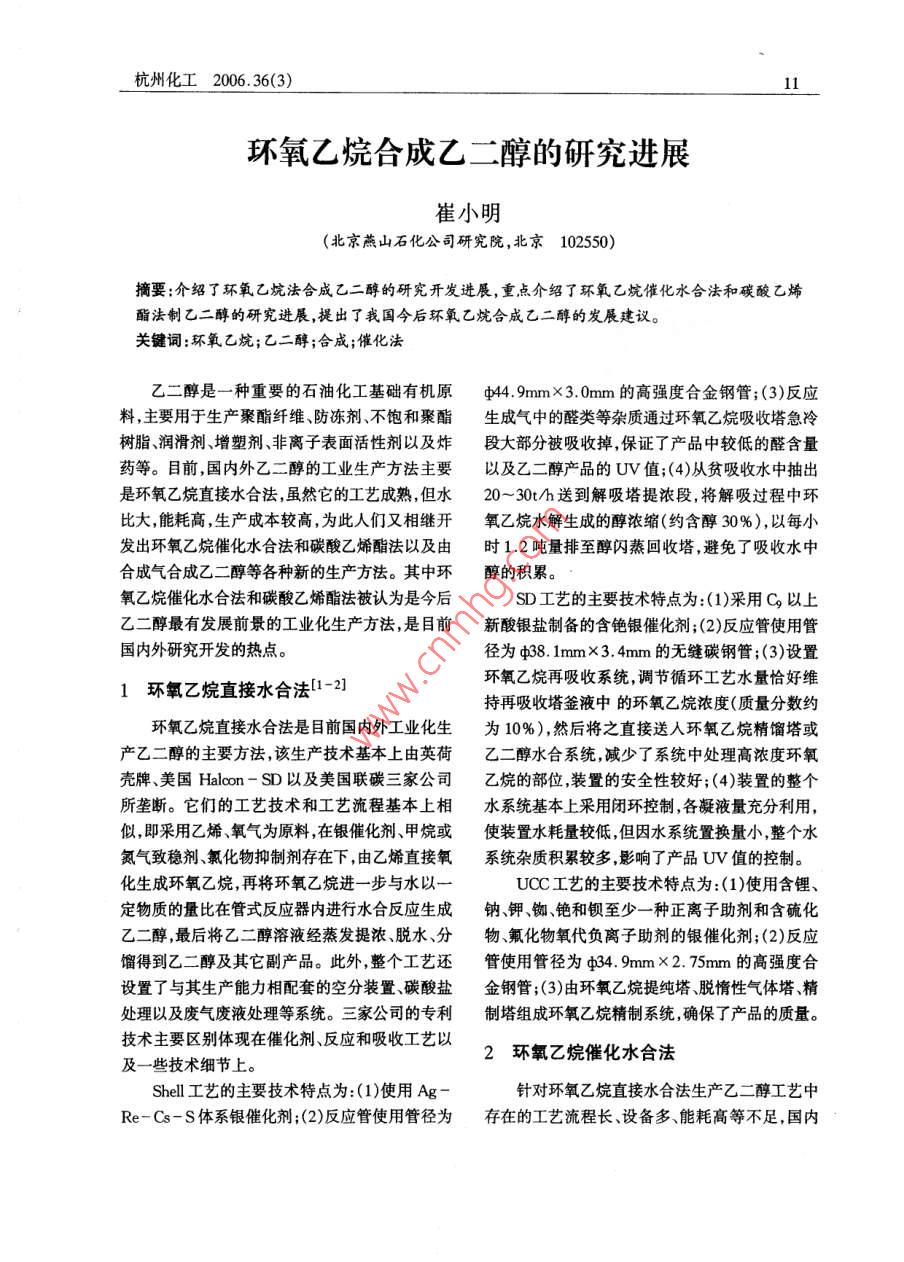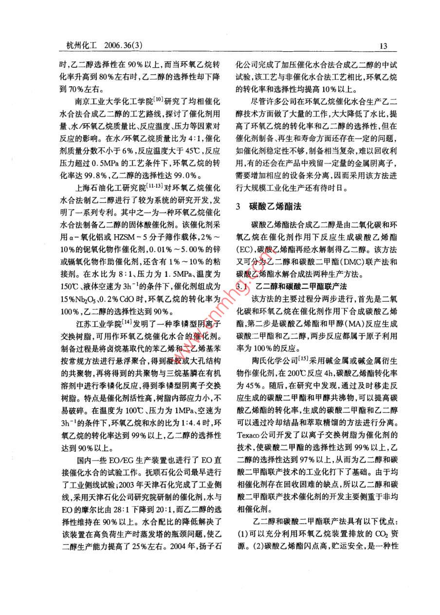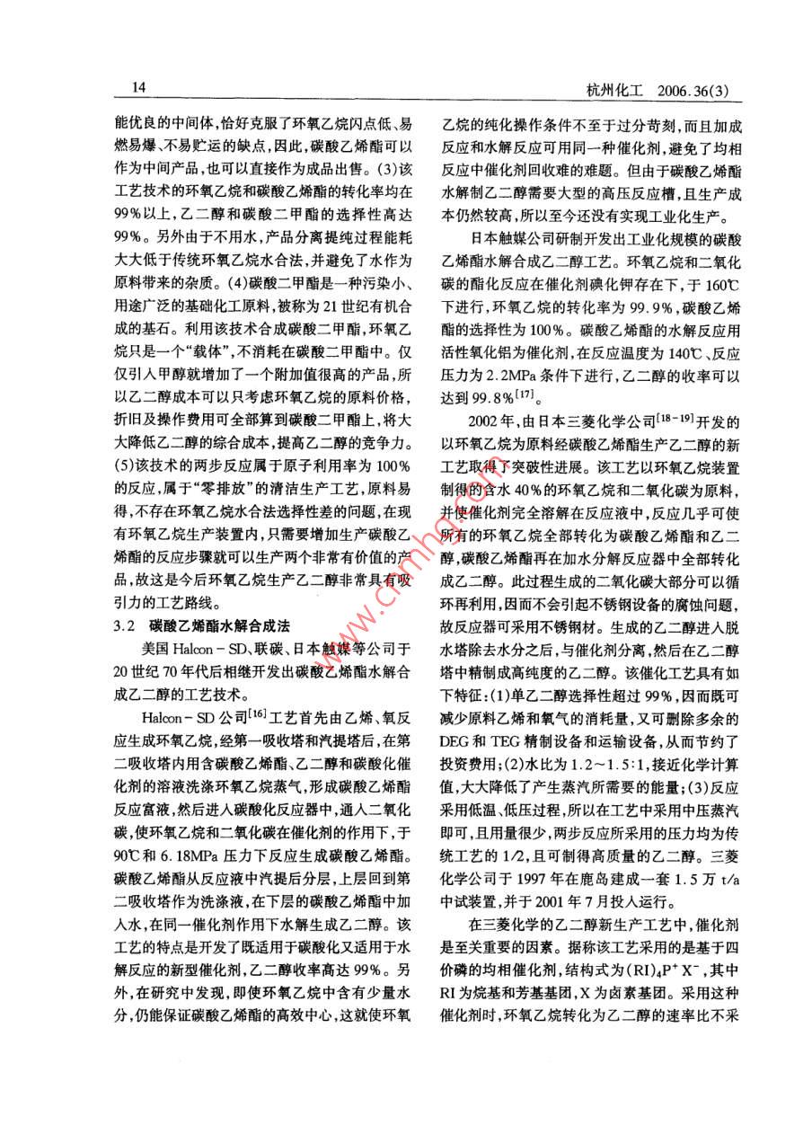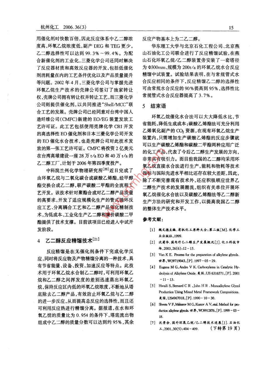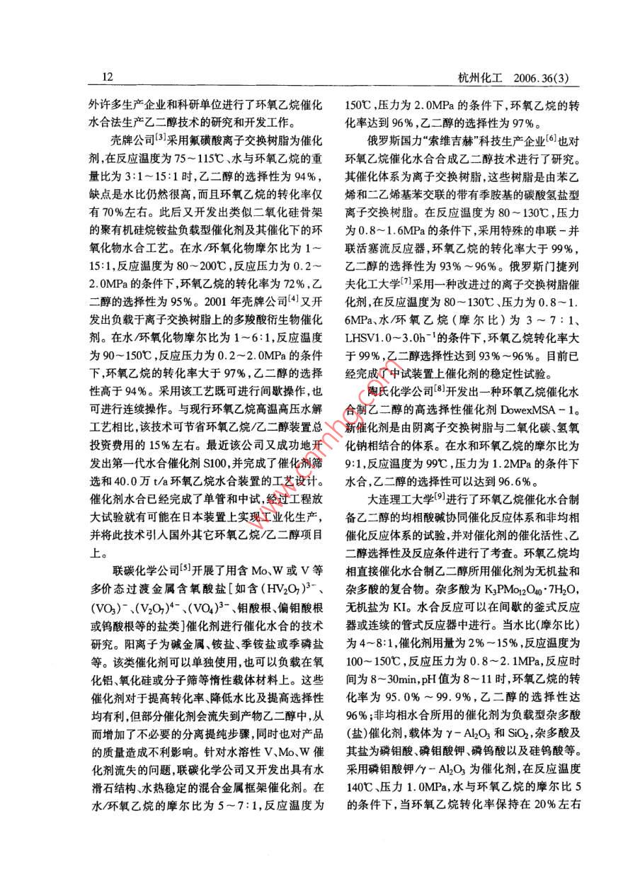 杭州化工2006.36(3)環(huán)氧乙烷合成乙二醇的研究進(jìn)展崔小明(北京燕山石化公司研究院,北京102550)摘要:介紹了環(huán)氧乙烷法合成乙二醇的研究開(kāi)發(fā)進(jìn)展,重點(diǎn)介紹了環(huán)氧乙炕催化水合法和碳酸乙烯酯法制乙二醇的研究進(jìn)展,提出了我國(guó)今后環(huán)氧乙炕合成乙二醇的發(fā)展建議。關(guān)鍵詞:環(huán)氧乙烷;乙二醇;合成;催化法乙二醇是一種重要的石油化工基礎(chǔ)有機(jī)原中44.9mm×30mm的高強(qiáng)度合金鋼管;(3)反應(yīng)料,主要用于生產(chǎn)聚酯纖維、防凍劑、不飽和聚酯生成氣中的醛類(lèi)等雜質(zhì)通過(guò)環(huán)氧乙烷吸收塔急冷樹(shù)脂、潤(rùn)滑劑、增塑劑、非離子表面活性劑以及炸段大部分被吸收掉,保證了產(chǎn)品中較低的醛含量藥等。目前,國(guó)內(nèi)外乙二醇的工業(yè)生產(chǎn)方法主要以及乙二醇產(chǎn)品的UV值;(4)從貧吸收水中抽出是環(huán)氧乙烷直接水合法,雖然它的工藝成熟,但水20~30t/h送到解吸塔提濃段,將解吸過(guò)程中環(huán)比大,能耗高,生產(chǎn)成本較高,為此人們又相繼開(kāi)氧乙烷水解生成的醇濃縮(約含醇30%),以每小發(fā)出環(huán)氧乙烷催化水合法和碳酸乙烯酯法以及由時(shí)12噸量排至醇閃蒸回收塔,避免了吸收水中合成氣合成乙二醇等各種新的生產(chǎn)方法。其中環(huán)醇的積累。氧乙烷催化水合法和碳酸乙烯酯法被認(rèn)為是今后SD工藝的主要技術(shù)特點(diǎn)為:(1)采用C以上乙二醇最有發(fā)展前景的工業(yè)化生產(chǎn)方法,是目前新酸銀鹽制備的含銫銀催化劑;(2)反應(yīng)管使用管?chē)?guó)內(nèi)外研究開(kāi)發(fā)的熱點(diǎn)徑為中381mm×3.4mm的無(wú)縫碳鋼管;(3)設(shè)置1環(huán)氧乙烷直接水合法1-2環(huán)氧乙烷再吸收系統(tǒng),調(diào)節(jié)循環(huán)工藝水量恰好維持再吸收塔釜液中的環(huán)氧乙烷濃度(質(zhì)量分?jǐn)?shù)約環(huán)氧乙烷直接水合法是目前國(guó)內(nèi)外工業(yè)化生為10%),然后將之直接送入環(huán)氧乙烷精餾塔或產(chǎn)乙二醇的主要方法,該生產(chǎn)技術(shù)基本上由英荷乙二醇水合系統(tǒng)減少了系統(tǒng)中處理高濃度環(huán)氧殼牌、美國(guó) Halcon-SD以及美國(guó)聯(lián)碳三家公司乙烷的部位,裝置的安全性較好;(4)裝置的整個(gè)所壟斷。它們的工藝技術(shù)和工藝流程基本上相水系統(tǒng)基本上采用閉環(huán)控制,各凝液量充分利用,似,即采用乙烯氧氣為原料,在銀催化劑、甲烷或使裝置水耗量較低,但因水系統(tǒng)置換量小,整個(gè)水氮?dú)庵路€(wěn)劑氯化物抑制劑存在下,由乙烯直接氧系統(tǒng)雜質(zhì)積累較多影響了產(chǎn)品UV值的控制。化生成環(huán)氧乙烷,再將環(huán)氧乙烷進(jìn)一步與水以UCC工藝的主要技術(shù)特點(diǎn)為:(1)使用含鋰、定物質(zhì)的量比在管式反應(yīng)器內(nèi)進(jìn)行水合反應(yīng)生成鈉鉀銣、銫和鋇至少一種正離子助劑和含硫化乙二醇最后將乙二醇溶液經(jīng)蒸發(fā)提濃、脫水、分物、氟化物氧代負(fù)離子助劑的銀催化劑;(2)反應(yīng)餾得到乙二醇及其它副產(chǎn)品。此外,整個(gè)工藝還管使用管徑為中349mm×2.75mm的高強(qiáng)度合設(shè)置了與其生產(chǎn)能力相配套的空分裝置、碳酸鹽金鋼管;(3)由環(huán)氧乙烷提純塔、脫惰性氣體塔、精處理以及廢氣廢液處理等系統(tǒng)。三家公司的專(zhuān)利制塔組成環(huán)氧乙烷精制系統(tǒng),確保了產(chǎn)品的質(zhì)量。技術(shù)主要區(qū)別體現(xiàn)在催化劑、反應(yīng)和吸收工藝以及一些技術(shù)細(xì)節(jié)上。2環(huán)氧乙烷催化水合法SheI工藝的主要技術(shù)特點(diǎn)為:(1)使用Ag針對(duì)環(huán)氧乙烷直接水合法生產(chǎn)乙二醇工藝中Re-Cs-S體系銀催化劑;(2)反應(yīng)管使用管徑為存在的工藝流程長(zhǎng)、設(shè)備多、能耗高等不足,國(guó)內(nèi)杭州化工2006.36(3)外許多生產(chǎn)企業(yè)和科研單位進(jìn)行了環(huán)氧乙烷催化150℃,壓力為2.0MPa的條件下,環(huán)氧乙烷的轉(zhuǎn)水合法生產(chǎn)乙二醇技術(shù)的研究和開(kāi)發(fā)工作化率達(dá)到96%,乙二醇的選擇性為97%。殼牌公司3采用氟磺酸離子交換樹(shù)脂為催化俄羅斯國(guó)力“索維吉赫”科技生產(chǎn)企業(yè)6也對(duì)劑,在反應(yīng)溫度為75~115℃、水與環(huán)氧乙烷的重環(huán)氧乙烷催化水合合成乙二醇技術(shù)進(jìn)行了研究。量比為3:1-15:1時(shí),乙二醇的選擇性為94%,其催化體系為離子交換樹(shù)脂,這些樹(shù)脂是由苯乙缺點(diǎn)是水比仍然很高,而且環(huán)氧乙烷的轉(zhuǎn)化率僅烯和二乙烯基苯交聯(lián)的帶有季胺基的碳酸氫鹽型有70%左右。此后又開(kāi)發(fā)出類(lèi)似二氧化硅骨架離子交換樹(shù)脂。在反應(yīng)溫度為80~130℃,壓力的聚有機(jī)硅烷銨鹽負(fù)載型催化劑及其催化下的環(huán)為0.8~1.6MPa的條件下,采用特殊的串聯(lián)-并氧化物水合工藝。在水/環(huán)氧化物摩爾比為1~聯(lián)活塞流反應(yīng)器,環(huán)氧乙烷的轉(zhuǎn)化率大于99%15:1,反應(yīng)溫度為80~200℃,反應(yīng)壓力為0.2乙二醇的選擇性為93%~96%。俄羅斯門(mén)捷列20MPa的條件下環(huán)氧乙烷的轉(zhuǎn)化率為72%,乙夫化工大學(xué)(采用一種改進(jìn)過(guò)的離子交換樹(shù)脂催二醇的選擇性為9