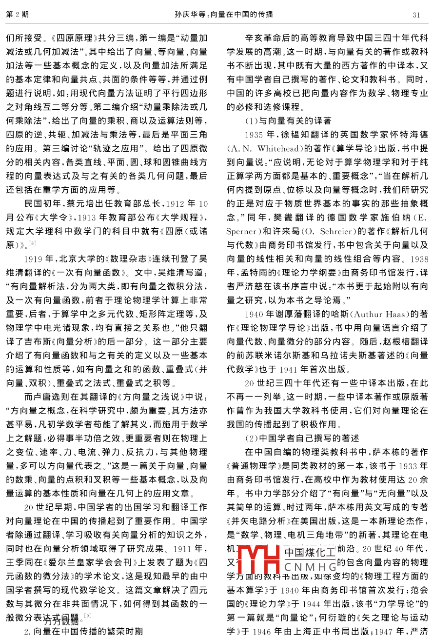 2006年6月太原理工大學(xué)學(xué)報(bào)(社會(huì)科學(xué)版)第24卷第2期Journal of Taiyuan University of Technology( Social Sciences EditionVol 24 No. 2向量在中國的傳播孫慶華12,包芳勛(1.西北大學(xué)數(shù)學(xué)系,陜西西安710069;2.山東大學(xué)數(shù)學(xué)與系統(tǒng)科學(xué)學(xué)院,山東濟(jì)南250100)摘要:文章考證了向量(矢量)名詞在中國的起源和演變過程,探討了與向量有關(guān)的中國早期的數(shù)學(xué)、物理教學(xué)和研究,梳理出向量在中國的傳播和發(fā)展過程。關(guān)鍵詞:向量;向量運(yùn)算;傳播過程中圖分類號(hào):O183文獻(xiàn)標(biāo)識(shí)碼:A文章編號(hào):1009-5837(2006)02-0029-05向量(矢量)是現(xiàn)代數(shù)學(xué)、物理學(xué)中的一個(gè)重要數(shù)學(xué)家。“ vector”的詞根源自拉丁詞“ venere”,意概念。力的平行四邊形法則、萊布尼茲(G.W思是“攜帶”(這個(gè)拉丁詞的過去分詞是 vectus),其Leibniz,1646~1716)位置幾何以及復(fù)數(shù)的幾何表含義隱含著將某物從此處帶到彼處的意思。2周達(dá)示思想是向量理論起源的三個(gè)重要思想源泉。19在《調(diào)查日本算學(xué)記》(1903年)中說到:“英語世紀(jì)中葉哈密頓(W.R. Hamilton)的四元數(shù)理論和 vectors,意即有定方數(shù)量也?!倍陬櫝畏g的美國格拉斯曼(H.G. Grassmann,1809~1877)的線性擴(kuò).S.哈代( Hardy A.S)著的《四原原理》(1909)張論是建立現(xiàn)代向量理論的基礎(chǔ),但格拉斯曼的著中,則把“ vector”譯為動(dòng)量,他說:“表依定方向,經(jīng)作由于內(nèi)容過于抽象、偏離傳統(tǒng)而又語言晦澀,故在定距離之移動(dòng)曰動(dòng)量( vector)?!毕喈?dāng)長的一段時(shí)間內(nèi)被人忽視,而四元數(shù)由于哈密1915年10月,中國駐歐留學(xué)生趙元任、任鴻頓的聲譽(yù)立即吸引了人們的注意隨后,英國數(shù)理學(xué)雋、胡明復(fù)等發(fā)起組成中國科學(xué)社,《社章》第三條就家泰特(P.G.Tait,1831~1901)和麥克斯韋(J.C.是:“編訂科學(xué)名詞,以期劃一而便學(xué)者”隨之,中國Maxwell1831~1879)等人對(duì)四元數(shù)的改進(jìn)工作,科學(xué)社出版的月刊《科學(xué)》雜志(Vol.2,No.12,邁出了四元數(shù)成為物理所需工具的第一步。物理學(xué)1916)刊登了《中國科學(xué)社現(xiàn)用名詞表》,其中包括名中電磁理論的偉大成功進(jìn)一步促進(jìn)了人們對(duì)向量理學(xué)、心理學(xué)、算學(xué)、物理學(xué)等學(xué)科名詞。在算學(xué)部分論的深入研究,現(xiàn)代意義上的獨(dú)立于四元數(shù)的向量把 vector譯為“有向數(shù)”,物理學(xué)部分則譯為“有向代數(shù)和向量分析,是由美國數(shù)理學(xué)家吉布斯(J.W.量Gibbs,1839~1903)和英國數(shù)理學(xué)家亥維賽(O1919年,北京大學(xué)創(chuàng)辦的《數(shù)理雜志》(Vol.2Heaviside,1850~1925)于19世紀(jì)80年代初各自獨(dú)No.1,2)連續(xù)刊登了吳維清翻譯的威爾遜(E.B.立創(chuàng)立的。向量理論創(chuàng)立初期也曾引起過一些爭議, Willson)所著的《吉布斯向量分析》中的第五章《但由于其廣泛的應(yīng)用性,特別是在物理學(xué)中的應(yīng)用,次有向量函數(shù)》,其中把 vector譯為“有向量”;同年而最終被物理學(xué)界和數(shù)學(xué)界普遍接受。伴隨著物理的該雜志第二期還刊登了黎樾廷翻譯的漢考克(E.學(xué)和數(shù)學(xué)知識(shí)的引進(jìn),作為舶來的向量理論,我們有L. Hancock)的著述《偶力》,其中的 vector也譯為必要理清它在中國的傳播過程有向量”。(一)向量(矢量)名詞的演變1921年,北京高等師范學(xué)校的《數(shù)理雜志》第3向量(矢量這個(gè)術(shù)語作為現(xiàn)代數(shù)學(xué)、物理學(xué)中卷第2期刊登了勒榮祿的文章《數(shù)之方向》,文中把的一個(gè)重要概念首先是由英國數(shù)學(xué)家哈密頓使用形中國煤化工為“有向數(shù)”;次年,該雜的,他是第一個(gè)用“向量( vector)”表示有向線段的志件HCNMHG《方向量之淺說》,其中收稿日期:2006-03-17作者筒數(shù)糖華(1970-),女,山東蒙陰人,山東大學(xué)講師西北大學(xué)博士生,主要從事數(shù)學(xué)史方面的研究;包芳勛(1968-),男,山東單縣人,博士,山東大學(xué)副教授,主要從事數(shù)學(xué)史方面的研究太原理工大學(xué)學(xué)報(bào)(社會(huì)科學(xué)版)第24卷vector譯為“方向量”。的 vector大都譯為“向量”。如 vector algebra譯為成立于1923年7月的中國科學(xué)社數(shù)學(xué)名詞審“向量代數(shù)”; vector analysis譯為“向量分析(學(xué))”;查委員會(huì)為了統(tǒng)一數(shù)學(xué)名詞,先后審定了許多數(shù)學(xué)tor function譯為“向量函數(shù)”等等。自此之后,在分支的譯名,并于1925~1932年間,在《科學(xué)》雜志數(shù)學(xué)中人們漸漸習(xí)慣于稱 vector為“向量上連續(xù)刊登了題為《數(shù)學(xué)名詞審查會(huì)算學(xué)名詞》的文1985年4月,經(jīng)國務(wù)院批準(zhǔn)正式成立了全國自章。在1925年的第10卷第6期的“微積分”部分給然科學(xué)名詞審定委員會(huì)。該審定會(huì)在1989年出版的出了 vector及相關(guān)詞語的翻譯,這里 vector譯為《物理學(xué)名詞》中將 vector譯為“矢量,向量”。根據(jù)矢”, vector function譯為“矢函數(shù)”, vector國務(wù)院授權(quán),全國自然科學(xué)名詞審定委員會(huì)審定公differentiation譯為