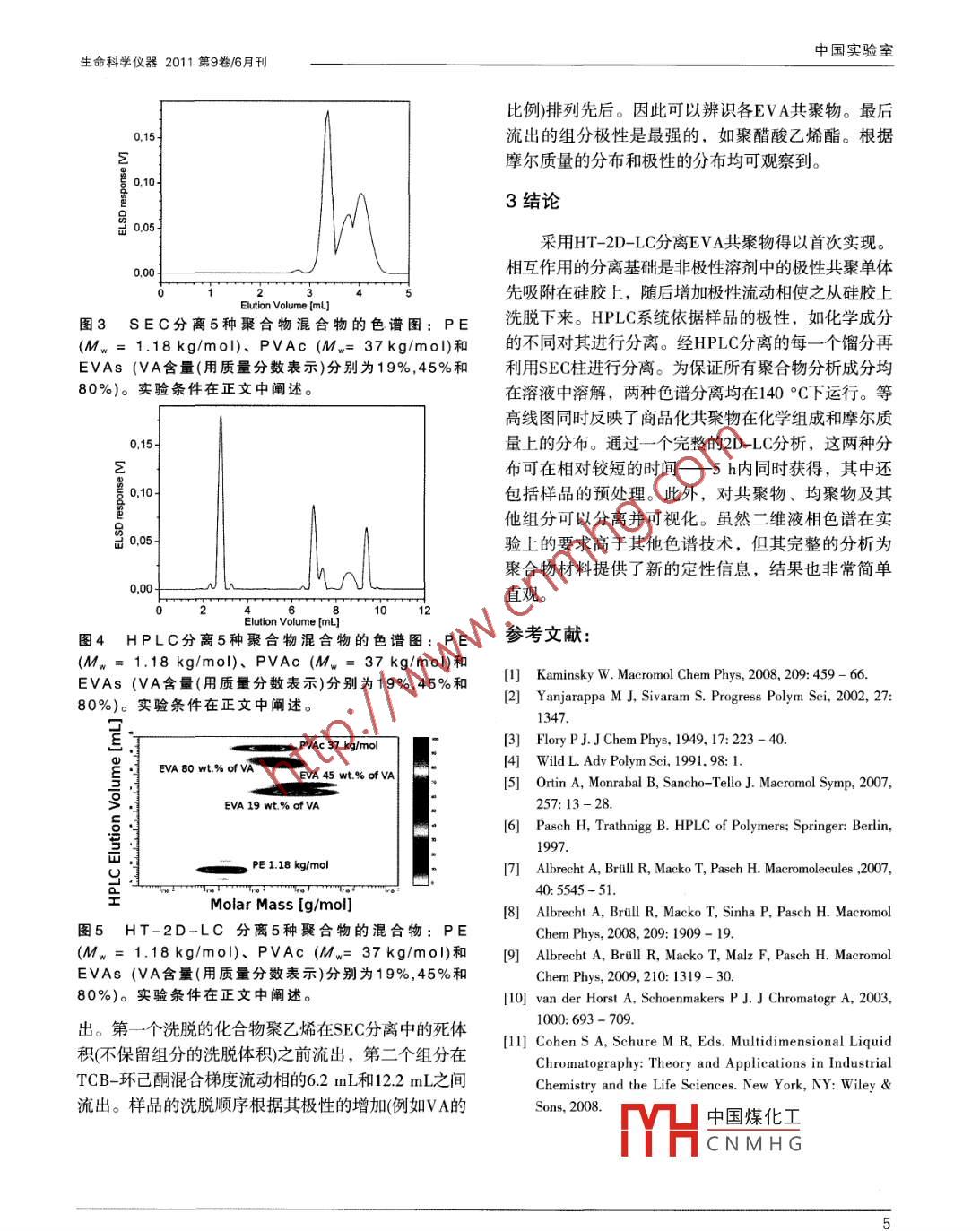 中國實(shí)驗(yàn)室生命科學(xué)儀器2011第9卷/6月刊利用高溫二維液相色譜對功能化聚烯烴進(jìn)行表征Anton GINZBURG. Tibor MACKO. Robert bRuLL摘要二維液相色譜2D-LC提供了合成聚合物和生物聚合物分子異質(zhì)性的不同方面的信息。聚烯烴材料的2D-LC分析需要高溫,但聚烯烴的高溫二維液相色譜HT-2D-LC)分析條件卻未見報(bào)道。通過高溫相互作用液相色譜系統(tǒng)(根據(jù)分析物分子化學(xué)成分的差異進(jìn)行分離)和體積排阻色譜(SEC根據(jù)分析物分子摩爾質(zhì)量的不同進(jìn)行分離)的聯(lián)用,乙烯乙酸乙烯酯共聚物的完整HT-2D-LC分離第一次得以實(shí)現(xiàn)功能化聚烯烴,例如乙烯-乙酸乙烯酯共聚物結(jié)晶分級 CRYSTAF)和升溫淋洗分級(TREF技術(shù)(EⅤA),是重要的商品化聚合物。根據(jù)共聚單體成通常用于確定半結(jié)晶烯烴共聚物的CCD值。這兩種分的不同,這些材料用于制作泡沫、膠片和熱熔黏技術(shù)均利用了 Flory的理論中單體成分和熱餾分結(jié)晶合劑。由于聚烯烴的通用性以及具有優(yōu)良的機(jī)械性間的關(guān)系。TREF也可以通過與SEC聯(lián)用來揭示整體能、低廉的價(jià)格和易于獲取的原材料,其市場以每的化學(xué)異質(zhì)性。這個(gè)過程可以通過離線或在線年5%~6%的速度增長。因此,功能化聚烯烴的表征的方式實(shí)現(xiàn)。然而,整個(gè)方法僅限于良好的結(jié)晶樣成為聚烯烴研究中的重要領(lǐng)域2。品,因此,單體含量較高的樣本(質(zhì)量分?jǐn)?shù)>10%)不聚烯烴具有多項(xiàng)評價(jià)參數(shù),例如化學(xué)組成、相能使用以上方法分析。另一個(gè)缺點(diǎn)是TREF方法比較對分子質(zhì)量、功能、支化度、鏈段長度和立構(gòu)規(guī)整費(fèi)時(shí)。度。綜合表征這些參數(shù)間的相互分布,對于理解其依據(jù)化學(xué)成分分離復(fù)雜的聚合物時(shí),一般采用催化性能以及優(yōu)化合成與結(jié)構(gòu)性質(zhì)間關(guān)系是十分重高效液相色譜(HPLC技術(shù)。HPLC中的分離可以通過要的。在功能化聚烯烴中,最重要的分布是相對分多種機(jī)理實(shí)現(xiàn),包括吸附-解吸和沉淀-再溶解向。子質(zhì)量分布(MMD和化學(xué)成分分布CCD),它們的相然而,HPLC迄今一直局限于在室溫條件下溶解聚合互關(guān)系被稱為化學(xué)異質(zhì)性物。作者的課題組開發(fā)了第一個(gè)高溫相互作用高效液許多分級技術(shù)已被應(yīng)用于聚烯烴分析。高溫體相色譜系統(tǒng),可在高溫條件下對功能化聚烯烴進(jìn)行積排阻色譜(HT-SEC)方法已被用于測定MMD。體積分離。結(jié)果表明,在140°C條件下,以硅膠為固定排阻的分離方法是基于分子在溶液中的體積流體力相,采用梯度非極性/極性溶劑為流動(dòng)相,可根據(jù)EVA學(xué)體積和它們被固定相孔隙排斥的程度。MMD和相共聚物、乙烯甲基丙烯酸酯共聚物國和乙烯-丁基應(yīng)的平均摩爾質(zhì)量可以通過繪制相對分子質(zhì)量和洗丙烯酸酯共聚物化學(xué)成分的差異對它們進(jìn)行有效的脫體積的校準(zhǔn)曲線獲得,或利用摩爾質(zhì)量在線檢測分離。為了表征化學(xué)異質(zhì)性,即CCD值和MMD值的關(guān)器如光散射或黏度測量法獲得。然而,一個(gè)高分子系SEC和相互作用HPLC串聯(lián)),使用2D-LC分離是必在溶液中的體積受它的分子結(jié)構(gòu)的影響,如分支,要的。 van der horst等詳細(xì)討論了采用 HPLC-SEC或并且化學(xué)成分也受所用溶劑的親和力的影響。這意SFC-HPIC兩種聯(lián)用技術(shù)的優(yōu)缺點(diǎn)。味著不同化學(xué)成分的大分子可能具有相同的流體力目前,標(biāo)準(zhǔn)的2D-LC流程和設(shè)備僅限于在常溫學(xué)體積,在SEC分離中被共同洗脫。下分離樣品,因此不能用于表征半結(jié)晶聚烯烴。作者簡介Mr. Ginzburg is a Ph. D. student; Dr. Macko is a Research Co-Worker; and Dr. Brull is a Deputy Manager of the AnalyticalDepartment in the Department of Analytics, German Institute for Polymers, Schlossgartenstr. 6, 64289 Darmstadt, Germany; tel.49 6151 162035; fax:+49 6151 292855; e-mail RBrull@dki. tu-darmstadt. de Mr. Ginzburg and Dr Macko are also with theDutch Polymer Institute, Eindhoven, The Netherlands. This project forms part of thevYH中國煤化工 project No642/643. The authors thank Mr. Alberto Ortin, Mr. Juan Sancho-Tello, and Dr. BelCNMHGhar, Valencia,Spain)for valuable discussions and technical support該文已獲得 American Laboratory/ abcompare再版許可中國實(shí)驗(yàn)室生命科學(xué)儀器2011第9卷/6月刊本文介紹了一種作者課題組開發(fā)的 HT-HPLC系統(tǒng)和5m( MZ Analysentechnik, Mainz, Germany)。TCB和SEC串聯(lián)的分析方法,并將其應(yīng)用于商業(yè)功能化聚烯環(huán)己酮作為流動(dòng)相,流速為01mL/min烴的表征。第二維分離(SEC)采用 PL Rapide H柱,150mm7.5 mm id.(Polymer Laboratories, Church Stretton1實(shí)驗(yàn)部分U.K.),TCB作為流動(dòng)相,流速為25ml/min該柱的標(biāo)準(zhǔn)11聚合物和溶劑曲線由在流速25mL/min下分離的11種聚烯烴標(biāo)準(zhǔn)品繪1,24-三氯代苯TCB)和環(huán)已酮 Merck,Darm-制。自動(dòng)進(jìn)樣器和柱溫箱的溫度均設(shè)定為140℃C。stad, Germany)用作流動(dòng)相組分。聚合物樣品的質(zhì)量HPLC柱和SEC柱通過電子控制8通閥( VICI Valco濃度為3mg/mL,在140℃條件下溶于TCB中;進(jìn)樣 nstruments, Houston,TX)相連,并連接兩個(gè)200μL定體積為200μL,在2D-LC系統(tǒng)下