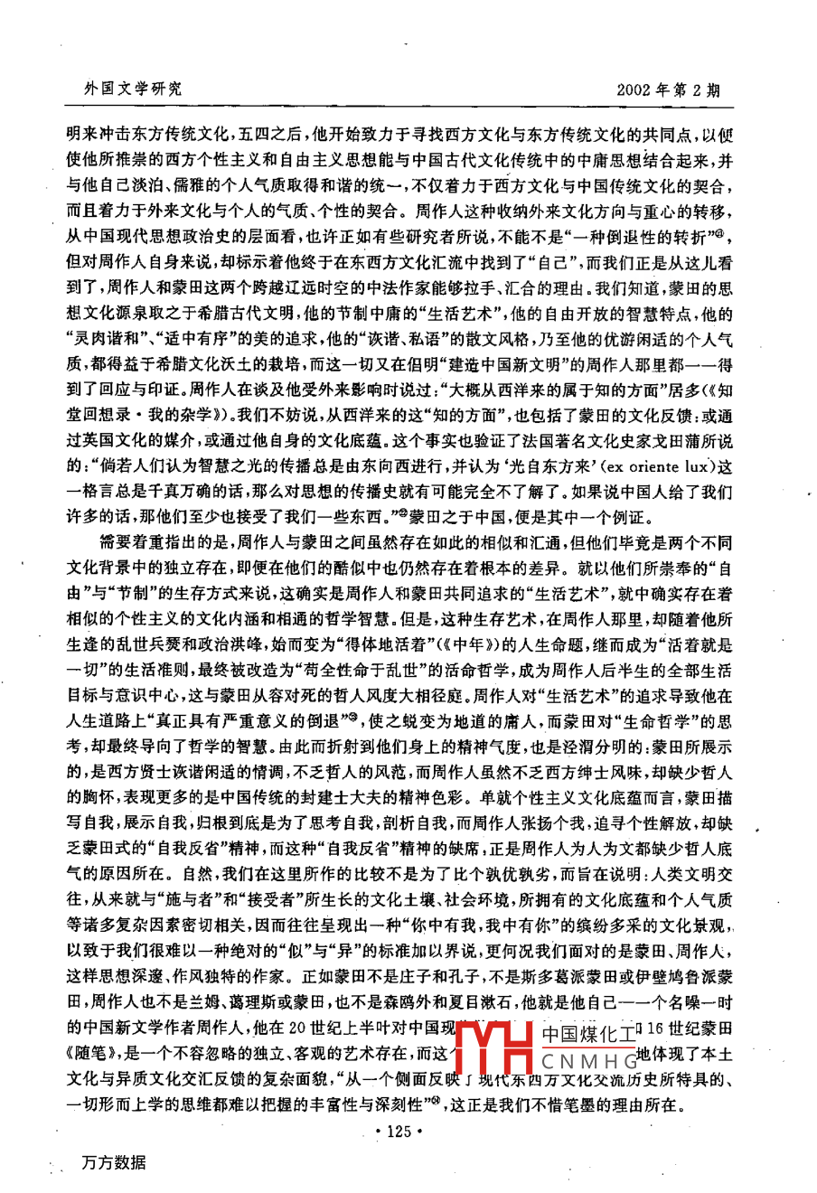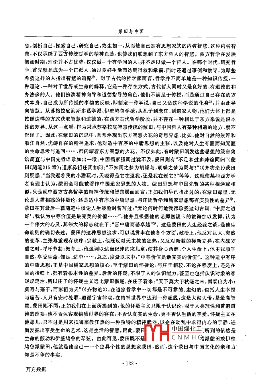 外國文學(xué)研究2002年第2期蒙田與中國錢林森內(nèi)容提要:本文從蒙田思想的智慧特色切入,著眼于中西方古典哲學(xué)的精神傳統(tǒng)和智慧層面的透視,揭示出蒙田之于中國文化,陌生中蘊藏著親和,相異中存在著匯通,指出正是這種內(nèi)在的“親和力”和匯通,使這位法蘭西人文主義“怪才”跨越基督教文化圈而逼近異質(zhì)文化,進入一個全新的文化視野,與陌生的中國文化親近、“結(jié)緣”。文章接著分析了中因新文學(xué)絮語散文作者如何以英倫三島“蒙田式”的隨筆作家為媒介而與蒙田“攜手”、“對話”,并從兩者“自我本位"的層次、審羨底蘊和文化氣度等方面加以審視和比較,從而描述出“你中有我我中有你”的的繽紛多彩的文化反饋的景觀。關(guān)鍵詞:蒙田智慧親和力中國文化文化反饋當(dāng)基督教文化與儒家文化于1600年間開始第一次實質(zhì)性的接觸時,歐洲文藝復(fù)興運動后期人文主義者蒙田( Michel de montaigne,1533-1592)已經(jīng)去世八個年頭,他無緣參與這東西方互不相識的兩個文明的對話,自然對孔夫子和儒家文化一無所知。但是,作為“啟蒙運動以前的位對知識權(quán)威的批評家”,作為“社會人類學(xué)興起以前的一位對其他民族文化進行冷靜研究的學(xué)者,作為法國文學(xué)史上第一位超越基督教文化圈,了望異質(zhì)文化的作家和思想家,他與流長的中國文化卻有著一種內(nèi)在的親和力,因而進人我們的研究視野,成為木文探討的對象。蒙田與中國文化的親和力蒙田所生逢的16世紀(jì)中葉和末葉,正是法國戰(zhàn)亂頻繁風(fēng)云變幻的時代由于深感宗教戰(zhàn)爭的危機,厭倦官場生活和疲于社交事務(wù),這位人文主義的怪才,在37歲(1570年)時,就一改文藝復(fù)興諸子凌厲激奮的生活航向,賣官歸田,退隱到他鄉(xiāng)下的領(lǐng)地維尼,過起一種離群索居的隱居生活。蒙田的退隱既表現(xiàn)了他對所處社會的逃避和悖逆,也反映出文藝復(fù)興運動后期新興資產(chǎn)階級中飽學(xué)之士對優(yōu)游暇生活的向往,有著深刻的西方政治文化背景。然而這種退隱歸田的生活方式,常常使人聯(lián)想到“杜門不復(fù)出,終身與世辭”的莊周、陶淵明這樣一些東方“隱士”的形象,以致使某些西方學(xué)者(如英國歷史學(xué)家博克)敏銳地意識到,蒙田“遲早總要被人們看作是一位中國道家思想的人物。其實,蒙田生前對中國道家思想毫無所知。作為作家兼思想家的蒙田純粹是由西方文化圈打造出來的,他以古希臘哲學(xué)為乳汁,轉(zhuǎn)益多師不宗一派他的思想清新、透徹,是“一種明快的自由思想,與道家思想并沒有什么直接淵源的關(guān)聯(lián)。蒙田對中國文化純?nèi)皇悄吧摹o知的,他在55歲(1588年)上,即辭世四年前,才讀到西班牙來華傳教士門多薩的《中華大帝國史》,接受了中華民族具有古老歷史的想想,并中國煤化工的話:“在中國,在這個很少與我們交往,對我們并不了解的王國里,它CNMHG杰出的領(lǐng)域內(nèi)超越了我們,它的歷史告訴我,世界之大、之豐高是我們時性元和找們?nèi)誱兒法深刻了解的這幾乎是蒙田在《隨筆》中談?wù)撝袊^無僅有的文字,它表現(xiàn)了西方巨子對東方古國的一種陌生·119.·蒙田與中國感及其對中國古老文明的神往之情。蒙田的思想與中國文化不存在直接淵源關(guān)系,那么蒙田何以被西方學(xué)者視為可能的中國道家人物呢?蒙田與中國傳統(tǒng)文化之間究竟存在什么樣的關(guān)聯(lián)呢?這只能從培育蒙田思想的西方文化源頭,從蒙田思想的智慧和視野特色來尋求答案。蒙田隱居鄉(xiāng)下領(lǐng)地,并非如他所言單單“享吾天年”,也非如陶淵明似的“采菊東籬下,悠然見南山”,將自己封閉在綠色的田野里荷鋤吟詠,而是一頭扎進了他那座圓塔三樓的書房里,閉門讀書、寫作、沉思,用美文、用智慧、用其豐富的人生體驗,結(jié)成了《隨筆》這樣一部多卷的“研究人,探索自己”的曠世之作,向整個世界和整個人類敞開了他的思想之窗,以致他的后輩和同鄉(xiāng),18世紀(jì)啟蒙思想家孟德斯鳩讀到《隨筆》時,不僅“讀到了寫書的人”,而且也“看到了思想的人”。他在藏書室的四壁掛滿了西方古哲的語錄其中就有羅馬劇作家泰倫修( Terence,公元前195-159)的一個雋語:“我是人,我認(rèn)為人類的一切都與我血肉相關(guān)?!边@是人文主義者蒙田終身遵從的人生格言和創(chuàng)作主旨,從中顯示出蒙田所特有的自我意識、人類意識和世界意識。蒙田思考的中心主題是人,以人為中心,以“自我”為中心。他在《隨筆》中聲言:“我所從事的研究其主題是人”,我的頭腦最主要、最辛勤的工作,便是研究自己。抑他本人就是“書的素材”,他是“第一個向公眾展示包羅萬象的自我全貌的人。他在自己的思考和作品中,充分地肯定了個人的存在及價值,肯定了人有獲得幸福和享受現(xiàn)世生活的權(quán)利肯定了所有的人在精神、道德和智慧上都是平等的,認(rèn)為“每個人都包含了人之所以為人的完整形態(tài),“人在興趣上和力量上各個不同,應(yīng)該通過不同的道路,根據(jù)個人的情況來謀求幸?!?《隨筆》下卷第12章),“皇帝和鞋匠的靈魂出于個模子”(《隨筆》中卷第12章),這種對個性、人性的尊重和肯定,必然導(dǎo)致對神和神性的否定和取代;這種人類平