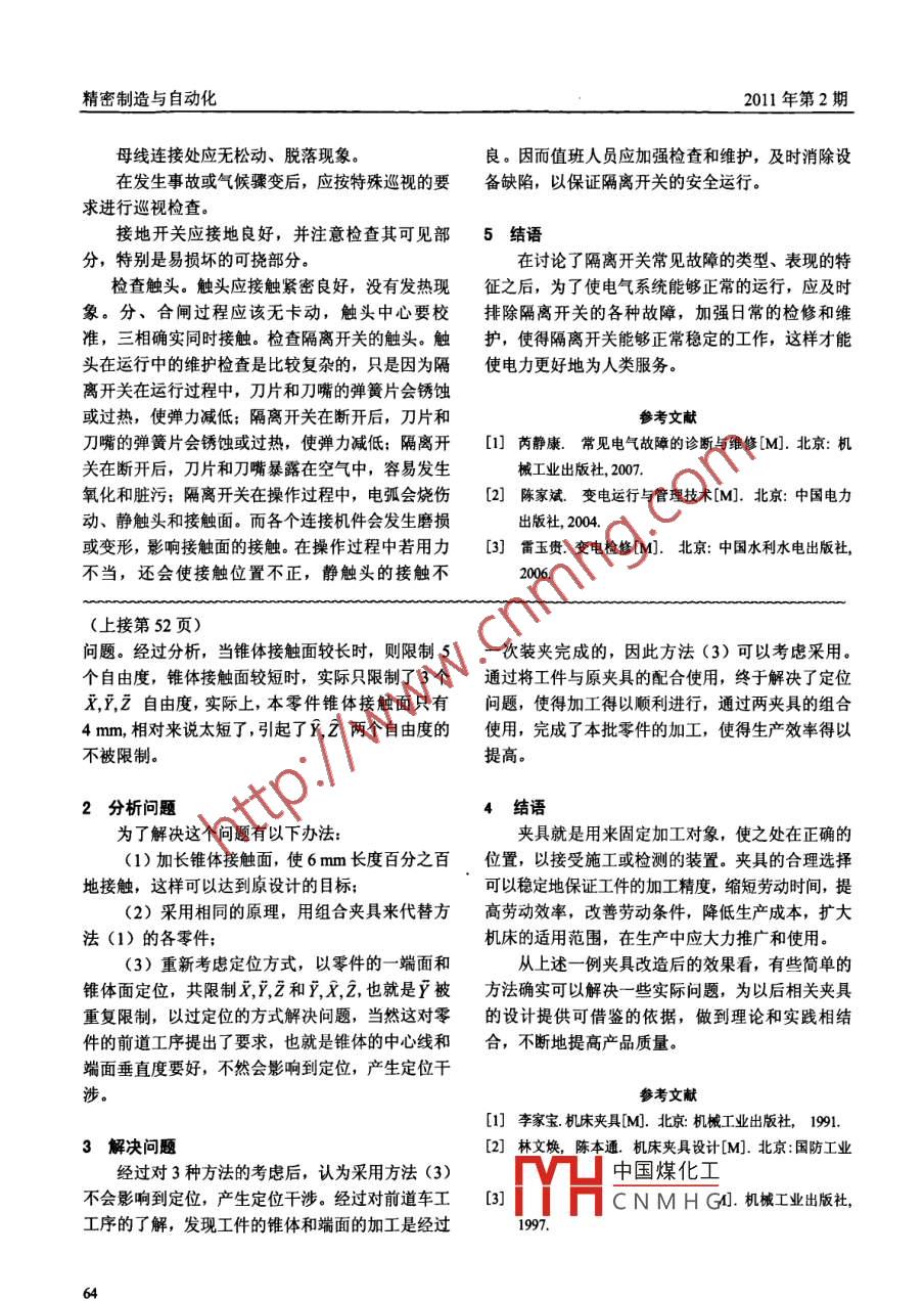 精密制造與自動(dòng)化2011年第2期夾具的改造賀衛(wèi)珍陜西工業(yè)職業(yè)技術(shù)學(xué)院校辦工廠陜西咸陽712000摘要2M120A型多用磨床可以刃磨各種銑刀、鉸刀、擴(kuò)孔鉆、插齒刀等一般刀具以及磨削平面、斜面及分度零件等。針對(duì)所配夾具的合理改造和使用,分析了工件的定位方式,設(shè)計(jì)了簡易鉆模。解決了批量零件的加工問題,穩(wěn)定地保證了工件的加工精度,縮短了勞動(dòng)時(shí)間,提高了勞動(dòng)效率,改善了勞動(dòng)條件,降低了生產(chǎn)成本。同時(shí)為設(shè)計(jì)人員提供一種新思路,為以后相關(guān)夾具的設(shè)計(jì)提供可借鑒的依據(jù)。鍵詞自由度定位鉆模夾具2M9120A型多用磨床是一種有多種用途的為了提高效率,設(shè)計(jì)了簡易鉆模,如圖2所示磨床。它兼有萬能外圓磨床和刃具磨床的特性,可以進(jìn)行廣泛的磨削加工。能磨削圓柱形、圓錐形的內(nèi)外表面,也便于刃磨各種銑刀、鉸刀、擴(kuò)孔鈷、插齒刀等一般刀具,。還可以磨削平面、斜面及分度零件等。如自配附件,還可以擴(kuò)大磨床的使用范圍此磨床小而精,價(jià)格合理,用戶的需求量還是比較大的,因此經(jīng)常出現(xiàn)供不應(yīng)求的局面,受生產(chǎn)條件的限制,一般采用在普通磨床上配上夾具,以滿足零件的定位和夾緊,這樣不僅保證了工件的加工精度,還保證了生產(chǎn)周期。本次要討論的就是此磨床所配夾具的改造。問題的提出被加工的零件,如圖1所示。圖2簡易鉆模圖簡易鉆模起到鉆孔定位的作用,鉆模的定位是以6mm厚的30°外錐體為定位基準(zhǔn)(實(shí)際用于定位的外錐長度為4mm)。所設(shè)計(jì)的鉆模理論上限制了五個(gè)自由度,只剩一個(gè)繞中心軸線的回轉(zhuǎn)的轉(zhuǎn)動(dòng)自由度未被限制,符合本零件的加工定位要求,然后在Z512的鉆床上,選擇d6.8mm的小鉆頭進(jìn)行的小錐孔定位。在車間加工時(shí)發(fā)現(xiàn)零件的五個(gè)自由度并未被限制,有F,z的兩個(gè)轉(zhuǎn)動(dòng)自由度處于未被確定狀態(tài),也就是30°部分不能與夾具完全吻合接圖1被加工零件零件圖觸,當(dāng)操作工把零件放進(jìn)去剛翻個(gè)個(gè),零件的一端就下沉口能面面新翻計(jì)業(yè)安法零件,如此反復(fù)多該零件加工時(shí)的工序?yàn)檐嚒Q→臥銑→發(fā)次,中國煤化工位。面對(duì)緊張的生藍(lán),工序安排為一坯多件(8件),最后在銑工序產(chǎn)CNMH(措施,發(fā)現(xiàn)和解決分開坯件,因此在鉗工工序時(shí)為同時(shí)鉆8個(gè)M8-7H(下轉(zhuǎn)第64頁精密制造與自動(dòng)化2011年第2期母線連接處應(yīng)無松動(dòng)、脫落現(xiàn)象。良。因而值班人員應(yīng)加強(qiáng)檢查和維護(hù),及時(shí)消除設(shè)在發(fā)生事故或氣候驟變后,應(yīng)按特殊巡視的要備缺陷,以保證隔離開關(guān)的安全運(yùn)行。求進(jìn)行巡視檢查。接地開關(guān)應(yīng)接地良好,并注意檢查其可見部5結(jié)語分,特別是易損壞的可撓部分。在討論了隔離開關(guān)常見故障的類型、表現(xiàn)的特檢査觸頭。觸頭應(yīng)接觸緊密良好,沒有發(fā)熱現(xiàn)征之后,為了使電氣系統(tǒng)能夠正常的運(yùn)行,應(yīng)及時(shí)象。分、合閘過程應(yīng)該無卡動(dòng),觸頭中心要校排除隔離開關(guān)的各種故障,加強(qiáng)日常的檢修和維準(zhǔn),三相確實(shí)同時(shí)接觸。檢査隔離開關(guān)的觸頭。觸護(hù),使得隔離開關(guān)能夠正常穩(wěn)定的工作,這樣才能頭在運(yùn)行中的維護(hù)檢查是比較復(fù)雜的,只是因?yàn)楦羰闺娏Ω玫貫槿祟惙?wù)。離開關(guān)在運(yùn)行過程中,刀片和刀嘴的彈簧片會(huì)銹蝕或過熱,使彈力減低;隔離開關(guān)在斷開后,刀片和參考文獻(xiàn)刀嘴的彈簧片會(huì)銹蝕或過熱,使彈力減低;隔離開1]芮靜康.常見電氣故障的診斷與維修[M].北京:機(jī)關(guān)在斷開后,刀片和刀嘴暴露在空氣中,容易發(fā)生械工業(yè)出版社,2007氧化和臟污;隔離開關(guān)在操作過程中,電弧會(huì)燒傷[2]陳家斌.變電運(yùn)行與管理技術(shù)M].北京:中國電力動(dòng)、靜觸頭和接觸面。而各個(gè)連接機(jī)件會(huì)發(fā)生磨損出版社,2004或變形,影響接觸面的接觸。在操作過程中若用力[3]雷玉貴.變電檢修[M].北京:中國水利水電出版社不當(dāng),還會(huì)使接觸位置不正,靜觸頭的接觸不2006(上接第52頁)問題。經(jīng)過分析,當(dāng)錐體接觸面較長時(shí),則限制5一次裝夾完成的,因此方法(3)可以考慮采用。個(gè)自由度,錐體接觸面較短時(shí),實(shí)際只限制了3個(gè)通過將工件與原夾具的配合使用,終于解決了定位,,自由度,實(shí)際上,本零件錐體接觸面只有問題,使得加工得以順利進(jìn)行,通過兩夾具的組合4mm,相對(duì)來說太短了,引起了Y,z兩個(gè)自由度的使用,完成了本批零件的加工,使得生產(chǎn)效率得以不被限制。提高。2分析問題結(jié)語為了解決這個(gè)問題有以下辦法:夾具就是用來固定加工對(duì)象,使之處在正確的(1)加長錐體接觸面,使6mm長度百分之百位置,以接受施工或檢測的裝置。夾具的合理選擇地接觸,這樣可以達(dá)到原設(shè)計(jì)的目標(biāo);可以穩(wěn)定地保證工件的加工精度,縮短勞動(dòng)時(shí)間,提(2)采用相同的原理,用組合夾具來代替方高勞動(dòng)效率,改善勞動(dòng)條件,