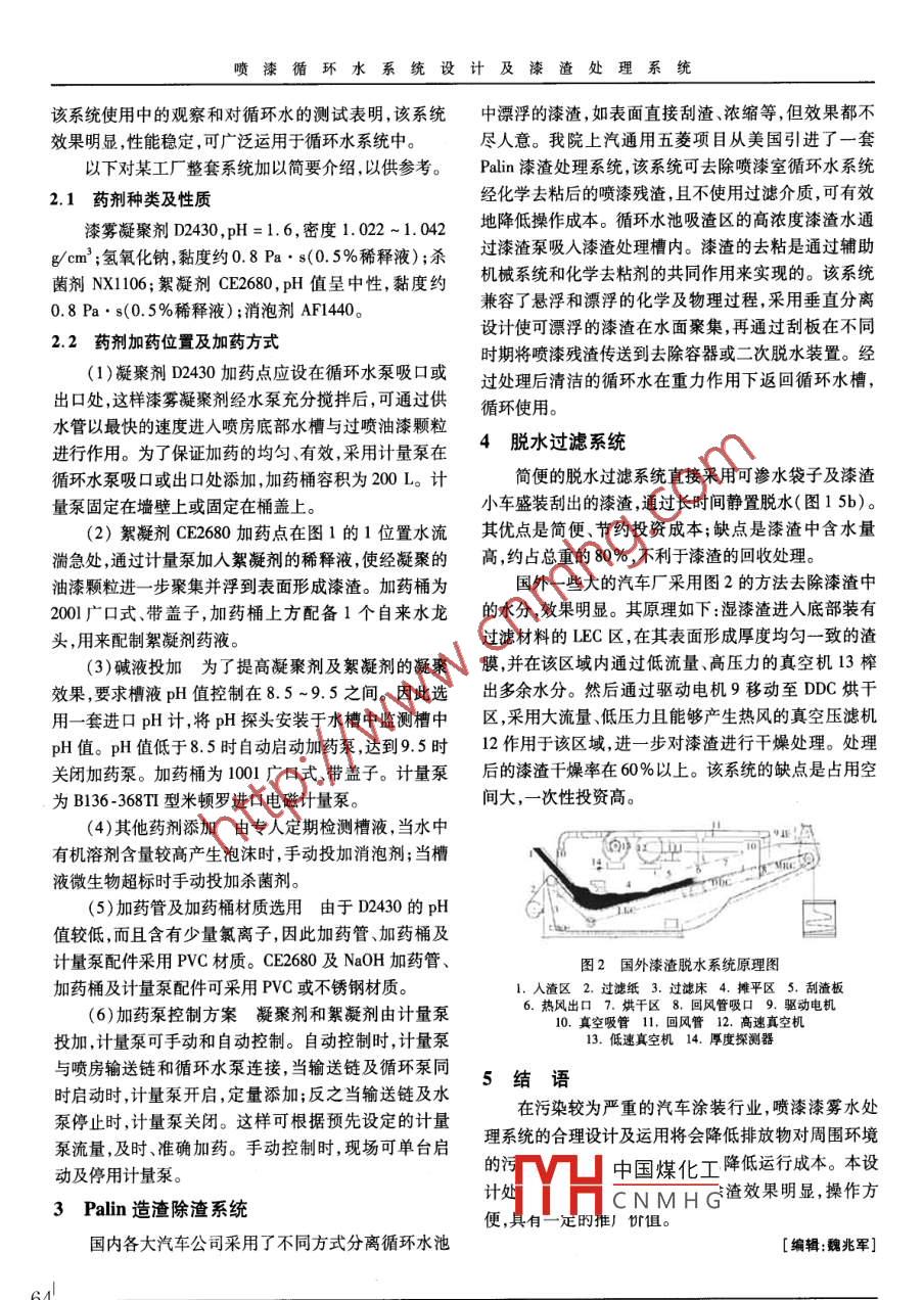 第40卷第4期材料保護(hù)Vol.40 No.42007年4月.Materials ProtectionApr. 2007噴漆循環(huán)水系統(tǒng)設(shè)計(jì)及漆渣處理系統(tǒng)馬力,竇德玉(機(jī)械工業(yè)部第四設(shè)計(jì)研究院,河南洛陽(yáng)471039)[摘要]為方便有效地在涂裝生產(chǎn)中的噴漆循環(huán)水系統(tǒng)實(shí)現(xiàn)漆渣分離,并作進(jìn)一步的干燥處理,介紹了一種新型吸取式漆渣處理及真空壓濾干燥系統(tǒng),并通過(guò)對(duì)水循環(huán)系統(tǒng)設(shè)計(jì)原理及構(gòu)造的闡述,對(duì)該漆渣處理系統(tǒng)的工作原理進(jìn)行了描述。實(shí)際應(yīng)用證明,該系統(tǒng)處理漆渣效果明顯,操作方便。[關(guān)鍵詞] 涂裝;自動(dòng)除渣處理系統(tǒng);噴漆;循環(huán)水系統(tǒng);設(shè)計(jì)[中囝分類號(hào)] TG155.5 [文獻(xiàn)標(biāo)識(shí)碼] B [文章編號(hào)] 1001 - 1560(2007)04 -0063 -020前言回流區(qū)1和2:該區(qū)域位于噴房回水口位置,設(shè)置涂裝噴涂過(guò)程中產(chǎn)生大量的過(guò)噴漆霧及有機(jī)溶有溢流板及過(guò)濾網(wǎng),其作用是消減回流水的沖擊力,通劑,嚴(yán)重影響環(huán)境和操作者的身體健康。據(jù)測(cè)定,噴漆過(guò)高位溢流,降低槽內(nèi)流速,并過(guò)濾掉大塊漆渣。該區(qū)室排放的漆霧和有機(jī)溶劑的濃度為300 ~2 000域循環(huán)水停留時(shí)間要求為0.8 min,槽體截面流速mg/m',為了處理廢氣,必須合理地設(shè)計(jì)捕捉漆霧的水0.050 ~0.075 m/s。系統(tǒng)。本工作根據(jù)現(xiàn)場(chǎng)調(diào)試結(jié)果,借鑒國(guó)內(nèi)外先進(jìn)涂浮渣區(qū)3:為有效地將截留后的漆霧(包括其中的裝線的經(jīng)驗(yàn),設(shè)計(jì)了--整套漆渣處理系統(tǒng),以供同行參樹脂、溶劑等)聚集成塊狀漆渣,并通過(guò)氣浮漂浮于表考。該系統(tǒng)按照功能可分為循環(huán)水系統(tǒng)、加藥系統(tǒng)、漆面,須嚴(yán)格控制槽內(nèi)循環(huán)水的流速及循環(huán)水停留時(shí)間,確保漆渣.上浮到水面時(shí)正好回流到溢渣區(qū)。大量的現(xiàn)渣處理系統(tǒng)脫水過(guò)濾系統(tǒng)。場(chǎng)觀察及試驗(yàn)表明,該區(qū)域循環(huán)水滯留時(shí)間為5.5 ~1循環(huán)水 系統(tǒng)設(shè)計(jì)原理及方法7.0min、槽內(nèi)液體表面濃度為600mg/L,槽體截面流濕式噴漆室的作用是將水霧化,捕捉過(guò)噴漆霧。速為0.05 m/s時(shí)效果較佳。為提高漆霧捕捉效率,必須減少循環(huán)水中已捕捉油漆吸渣及過(guò)濾區(qū)4:該區(qū)域設(shè)置有自動(dòng)溢流堰,可根顆粒的含量,除采用加人化學(xué)藥劑法分離油漆顆粒外,據(jù)液面高度自動(dòng)調(diào)整進(jìn)渣口位置,盡可能多的將上浮對(duì)漆渣處理系統(tǒng)(圖1)設(shè)備構(gòu)造也有特定的要求:的漆渣收集到吸渣口,通過(guò)專用浮渣泵吸人造渣除渣區(qū)6作進(jìn)- -步處理。在吸渣口后設(shè)有過(guò)濾器,其作用為阻擋大塊漆渣進(jìn)入下一區(qū)域,過(guò)濾器采用過(guò)濾網(wǎng),網(wǎng)o孔大小以40 mm x 40 mm為佳,并要求拆卸清洗方便。漆渣整合區(qū)6:該區(qū)域采用垂直分離方式,通過(guò)加人去粘劑,將漆渣從水中分離。2凝聚劑 自動(dòng)添加系統(tǒng)+在以往的水處理系統(tǒng)中,由于對(duì)化學(xué)品添加位置或添加量沒(méi)有明確的規(guī)定,導(dǎo)致設(shè)備使用過(guò)程中隨意添加化學(xué)品,不僅造成浪費(fèi),更重要的是不能及時(shí)從水.圖1漆渣處理系 統(tǒng)原理中分離出過(guò)噴的漆霧,降低了循環(huán)水捕集漆霧的效率,1.2.回流區(qū)3.浮渣區(qū)4.吸渣及過(guò)濾區(qū)既縮[中國(guó)煤化工曾加了污染物排放量。5.脫水過(guò)濾系統(tǒng)6. 漆渣整合區(qū)為THCNMH多條大型涂裝線的調(diào)研以及和藥劑供應(yīng)商的交流,在上海通用東岳項(xiàng)目及[收稿日期] 2006-11 -27上汽通用五菱項(xiàng)目中運(yùn)用了藥劑自動(dòng)添加系統(tǒng)。通過(guò)63噴漆循環(huán)水系統(tǒng)設(shè)計(jì)及漆渣處理系統(tǒng)該系統(tǒng)使用中的觀察和對(duì)循環(huán)水的測(cè)試表明,該系統(tǒng)中漂浮的漆渣,如表面直接刮渣、濃縮等,但效果都不效果明顯,性能穩(wěn)定,可廣泛運(yùn)用于循環(huán)水系統(tǒng)中。盡人意。我院上汽通用五菱項(xiàng)目從美國(guó)引進(jìn)了一套以下對(duì)某工廠整套系統(tǒng)加以簡(jiǎn)要介紹,以供參考。Palin漆渣處理系統(tǒng),該系統(tǒng)可去除噴漆室循環(huán)水系統(tǒng)2.1藥劑種類及性質(zhì)經(jīng)化學(xué)去粘后的噴漆殘?jiān)?且不使用過(guò)濾介質(zhì),可有效漆霧凝聚劑D2430,pH=1.6,密度1. 022 ~1.042地降低操作成本。循環(huán)水池吸渣區(qū)的高濃度漆渣水通g/cm' ;氫氧化鈉,黏度約0. 8 Pa●. s(0. 5%稀釋液);殺過(guò)漆渣泵吸人漆渣處理槽內(nèi)。漆渣的去粘是通過(guò)輔助菌劑NX1106;絮凝劑CE2680,pH 值呈中性,黏度約機(jī)械系統(tǒng)和化學(xué)去粘劑的共同作用來(lái)實(shí)現(xiàn)的。該系統(tǒng)兼容了懸浮和漂浮的化學(xué)及物理過(guò)程,采用垂直分離0.8 Pa. s(0. 5%稀釋液) ;消泡劑AF1440。設(shè)計(jì)使可漂浮的漆渣在水面聚集,再通過(guò)刮板在不同2.2 藥劑加藥位置及加藥方式時(shí)期將噴漆殘?jiān)鼈魉偷饺コ萜骰蚨蚊撍b置。經(jīng)(1)凝聚劑D2430加藥點(diǎn)應(yīng)設(shè)在循環(huán)水泵吸口或過(gu