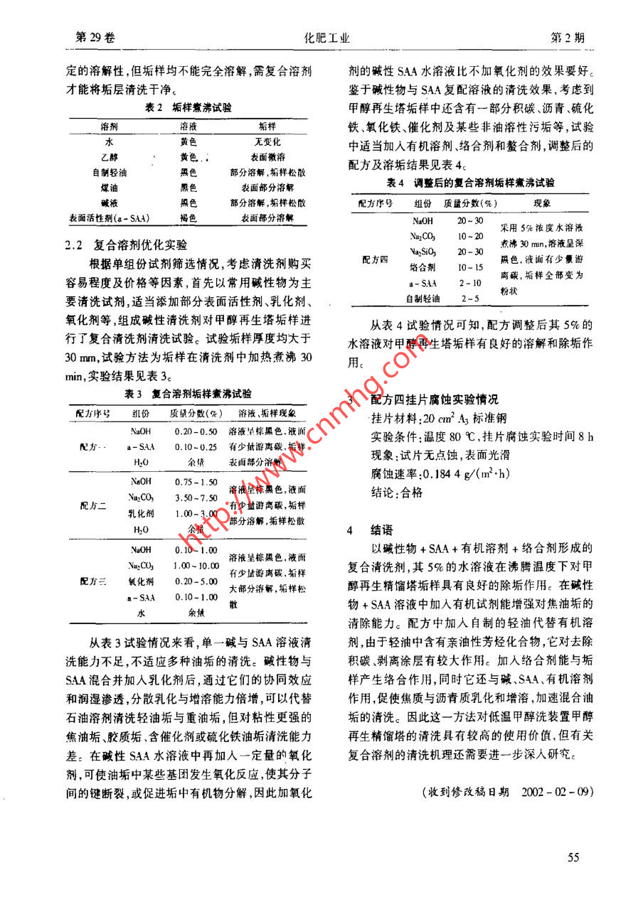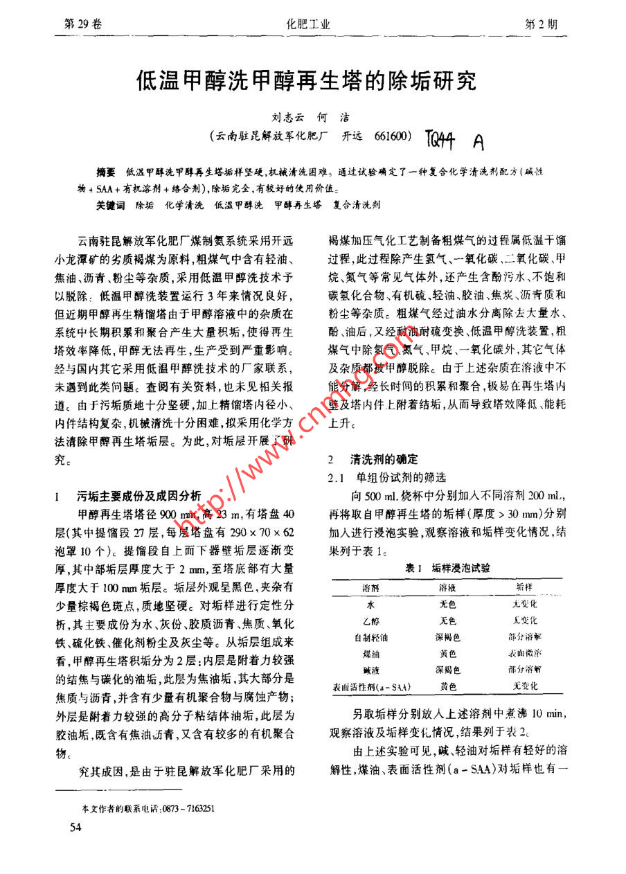第29卷化肥工業(yè)第2期低溫甲醇洗甲醇再生塔的除垢研究劉志云何潔(云南駐昆解放軍化肥廠開遠(yuǎn)6600 TQ44 A摘要低溫甲醇洗甲醇再生塔垢樣堅(jiān)硬 ,機(jī)械清洗困難。通過(guò)試驗(yàn)確定了一種復(fù)合化學(xué)清洗劑配方(堿性物+ SAA+有機(jī)溶劑+絡(luò)合劑),除垢完全,有較好的使用價(jià)值。關(guān)鍵詞除垢化學(xué)清洗 低溫甲醇洗甲酵再生塔 復(fù)合清洗劑云南駐昆解放軍化肥廠煤制氦系統(tǒng)采用開遠(yuǎn).褐煤加壓氣化工藝制備粗煤氣的過(guò)程屬低溫干餾小龍?zhí)兜V的劣質(zhì)褐煤為原料,粗煤氣中含有輕油、過(guò)程,此過(guò)程除產(chǎn)生氫氣、一氧化碳、二氧化碳、甲焦油、瀝青、粉塵等雜質(zhì),采用低溫甲醇洗技術(shù)予烷、氮?dú)獾瘸R姎怏w外,還產(chǎn)生含酚污水、不飽和以脫除,低溫甲醇洗裝置運(yùn)行3年來(lái)情況良好,碳?xì)浠衔?、有機(jī)硫、輕油、膠油、焦炭、瀝青質(zhì)和.但近期甲醇再生精餾塔由于甲醇溶液中的雜質(zhì)在粉塵等雜質(zhì)。粗煤氣經(jīng)過(guò)油水分離除去大量水、系統(tǒng)中長(zhǎng)期積累和聚合產(chǎn)生大量積垢,使得再生酚、油后,又經(jīng)耐油耐硫變換、低溫甲醇洗裝置,粗塔效率降低,甲醇無(wú)法再生,生產(chǎn)受到嚴(yán)重影響。煤氣中除氫氣、氮?dú)?、甲烷、一氧化碳?其它氣體經(jīng)與國(guó)內(nèi)其它采用低溫甲醇洗技術(shù)的廠家聯(lián)系,及雜質(zhì)都被甲醇脫除。由于上述雜質(zhì)在溶液中不未遇到此類問(wèn)題。查閱有關(guān)資料,也未見相關(guān)報(bào)能分解,經(jīng)長(zhǎng)時(shí)間的積累和聚合,極易在再生塔內(nèi)道。由于污垢質(zhì)地十分堅(jiān)硬,加上精餾塔內(nèi)徑小、壁及塔內(nèi)件上附著結(jié)垢,從而導(dǎo)致塔效降低、能耗內(nèi)件結(jié)構(gòu)復(fù)雜,機(jī)槭清洗十分困難,擬采用化學(xué)方上升。法清除甲醇再生塔垢層。為此,對(duì)垢層開展了研究:2清洗劑的確定.2.1單組份試劑的篩選污垢主要成份及成因分析向500 ml.燒杯中分別加入不同溶劑200 mil, .甲醇再生塔塔徑900 mn,高23 m,有塔盤40再將取自甲醇再生塔的垢樣(厚度>30mm)分別層(其中提餾段27層,每層塔盤有290x 70x62加人進(jìn)行浸泡實(shí)驗(yàn),觀察溶液和垢樣變化情況,結(jié)泡罩10個(gè))。提餾段自上而下器壁垢層逐漸變果列于表1.厚,其中部垢層厚度大于2 mm,至塔底部有大量表1垢樣浸泡試驗(yàn)厚度大于100 mm垢層。垢層外觀呈黑色,夾雜有溶劑溶液垢樣少量棕褐色斑點(diǎn),質(zhì)地堅(jiān)硬c對(duì)垢樣進(jìn)行定性分水無(wú)色尤變化析,其主要成份為水、灰份、膠質(zhì)瀝青、焦質(zhì)、氧化乙醇瓦變化鐵、硫化鐵、催化劑粉塵及灰塵等。從垢層組成來(lái)自制輕油深褐色部分溶掣煤油黃色表面微濃看,甲醇再生塔積垢分為2層:內(nèi)層是附著力較強(qiáng)鲅液部分溶解的結(jié)焦與碳化的油垢,此層為焦油垢,其大部分是表面活性劑(a- SAt)無(wú)變化焦質(zhì)與瀝青,并含有少量有機(jī)聚合物與腐蝕產(chǎn)物;外層是附著力較強(qiáng)的高分子粘結(jié)體油垢,此層為另取垢樣分別放人上述溶劑中煮沸I0 min,膠油垢,既含有焦油近青,又含有較多的有機(jī)聚合觀察溶液及垢樣變化情況,結(jié)果列于表2<由上述實(shí)驗(yàn)可見,堿、輕油對(duì)垢樣有輕好的溶究其成因,是由于駐昆解放軍化肥廠采用的解性,煤油、表面活性劑(a-SAA)對(duì)垢樣也有-本文作者的聯(lián)系電話:0873 - 716325154第29卷化肥工業(yè)第2期定的溶解性,但垢樣均不能完全溶解,需復(fù)臺(tái)溶劑劑的堿性SAA水溶液比不加氧化劑的效果要好。才能將垢層清洗干凈。鑒于堿性物與SAA復(fù)配溶液的清洗效果,考慮到表2垢樣煮沸試驗(yàn)甲醇再生塔垢樣中還含有一部分積碳、瀝青、硫化溶劑溶液垢樣鐵氧化鐵、催化劑及某些非油溶性污垢等,試驗(yàn)水黃色無(wú)變化中適當(dāng)加入有機(jī)溶劑、絡(luò)合劑和螯合劑,調(diào)整后的乙1黃色.:表面徽溶配方及溶垢結(jié)果見表4c自制輕油黑色部分溶解,垢樣松散表4調(diào)整后的復(fù)合溶劑垢樣煮沸試驗(yàn)煤油表面部分溶解堿被羆色部分溶解,垢樣松敞配方序號(hào)組份質(zhì)量分?jǐn)?shù)(%}現(xiàn)象表面活性劑(a- SAA)褐色NaOH20-30采用5%依度水溶液NayCO310-202.2復(fù)合溶劑優(yōu)化實(shí)驗(yàn)煮沸30 mn,溶液呈深Na2SiO320- 30根據(jù)單組份試劑篩選情況,考慮清洗劑購(gòu)買配方四絡(luò)合劑10-15黑色,液面有少量游離釅,垢樣全部變?yōu)槿菀壮潭燃皟r(jià)格等因素,首先以常用堿性物為主a- S.AA2-10.要清洗試劑,適當(dāng)添加部分表面活性劑、乳化劑、2-5粉狀氧化劑等,組成堿性清洗劑對(duì)甲醇再生塔垢樣進(jìn)從表4試驗(yàn)情況可知,配方調(diào)整后其5%的行了復(fù)合清洗劑清洗試驗(yàn)。試驗(yàn)垢樣厚度均大于水溶液對(duì)甲醇再生塔垢樣有良好的溶解和除垢作30mm,試驗(yàn)方法為垢樣在清洗劑中加熱煮沸30用min,實(shí)驗(yàn)結(jié)果見表3.表3復(fù)合溶劑垢樣煮沸試驗(yàn)3配方四掛片腐蝕實(shí)驗(yàn)情況紅份質(zhì)損分?jǐn)?shù)(%)溶液 、垢樣現(xiàn)象掛片材料:20cm2A標(biāo)準(zhǔn)鋼.a0H0.20-0.50溶液呈驚黑色. 液面實(shí)驗(yàn)條件:溫度80 C ,掛片腐蝕實(shí)驗(yàn)時(shí)間8h0.10-0.25有少地游離聯(lián)