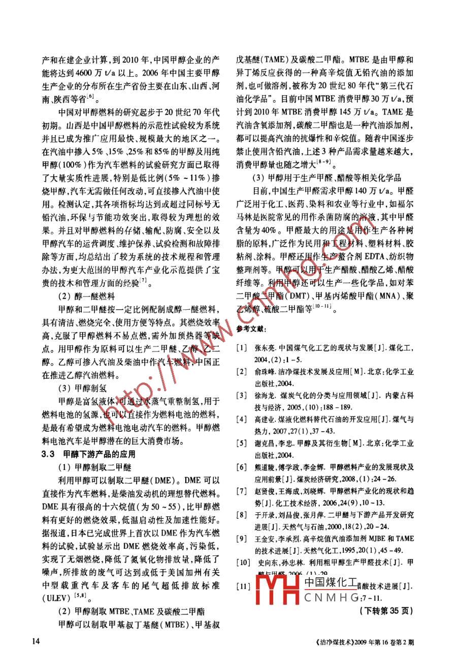 專論與綜述全國中文核心期刊礦業(yè)類核心期刊(CA-CD 規(guī)范)執(zhí)行優(yōu)秀期刊-煤炭深加工技術(shù)及應(yīng)用熊道陵,李金輝,鐘洪鳴(江西理工大學(xué)材料與化學(xué)工程學(xué)院,江西贛州341000)摘要:闡述了煤炭深加工的2種工藝技術(shù)一煤炭氣化技術(shù)和煤炭液化技術(shù), 并且介紹了2種工藝技術(shù)的煤炭深加工產(chǎn)品的具體應(yīng)用。關(guān)鍵詞:煤炭氣化;煤炭液化;應(yīng)用中圈分類號(hào):TQ536文獻(xiàn)標(biāo)識(shí)碼:A文章編號(hào):1006-6772(2009 )02-0011-00過去50年來,石油資源新發(fā)現(xiàn)的速率比累積用是將煤轉(zhuǎn)化成清潔的便于運(yùn)輸和使用的液體燃料或量還要快,但是,這些自然資源有限,如果不能生生化工原料的一-種先進(jìn)的潔凈煤技術(shù),今后是解決中不息,終有耗竭的一天。現(xiàn)在的估計(jì),各項(xiàng)初級(jí)能國石油緊缺的重要途徑之一-。源,石油可用40年,天然氣可用60多年,煤炭可用1煤炭氣化技術(shù)200年,原子能的鈾可用50多年。尋求資源的源源供給,并減少對(duì)環(huán)境的破壞,積極尋求替代燃料及再煤炭氣化是指煤在特定的設(shè)備內(nèi),在- -定溫度生能源是當(dāng)務(wù)之急。所謂替代燃料或替代能源是指及壓力下使煤中有機(jī)質(zhì)與氣化劑(如蒸汽空氣或替代傳統(tǒng)的化石燃料,尤其是替代汽油。包含了天氧氣等)發(fā)生一系列化學(xué)反應(yīng),將固體煤轉(zhuǎn)化為含然氣液化石油氣、甲醇、乙醇生物柴油、氫氣、P-系有CO、H2、CH4等可燃?xì)怏w和CO2、N2等非可燃?xì)饬腥剂?、核能及電力。全世界初?jí)能源比例為:石油.體的過程。煤炭氣化時(shí),必須具備3個(gè)條件,即氣化35% ,天然氣21% ,煤炭22% ,核能7% ,水力3%,爐、氣化劑供給熱量,三者缺一不可。煤炭氣化工其余12%為生物質(zhì)能及其它。藝如圖1所示。隨著石油需求量繼續(xù)增加,各國憂心能源及經(jīng)某|濟(jì)安全。世界石油供給很快達(dá)到頂峰而下降。目前煤氣石油供給大多依賴中東油源,儲(chǔ)藏量有限,且政治不.安定,油價(jià)受制于人。替代燃料及再生能源雖然較干凈,但大部分替代程度小,需要尋求大量的能源供氣灰或空氣給。氫能及燃料電池的來源目前還是依賴傳統(tǒng)能團(tuán)1煤炭氣化工藝流程源。因此煤炭和天然氣是石油之后的主要的能源來源。煤作為一種能源在社會(huì)發(fā)展中的作用不可替氣化過程發(fā)生的反應(yīng)包括煤的熱解、氣化和燃代。當(dāng)今世界對(duì)煤炭的進(jìn)步的加工利用范圍越來燒反應(yīng)。煤的熱解是指煤從固相變?yōu)闅?、固液三相越廣。隨著科技進(jìn)步及世界能源危機(jī)的影響8益加產(chǎn)物的過程。煤的氣化和燃燒反應(yīng)則包括2種反應(yīng)深,煤炭深加工技術(shù)受到廣泛關(guān)注和發(fā)展,煤炭液化類型肌非均相氣一周后應(yīng)和均婦的氣相反應(yīng)。中國煤化工YHCNMHG收稿日期:2009-01 -05基金項(xiàng)目:國家自然科學(xué)基金資助項(xiàng)目( 50864004) ;江西省教育廳科技資助項(xiàng)目(贛教高字[2008]87號(hào))作者簡介:熊道陵(965 -) ,男,江西吉安人,教授,博士,從事能源開發(fā)應(yīng)用與技術(shù)管理工作等。1.不同的氣化工藝對(duì)原料的性質(zhì)要求不同,因此國神華集團(tuán)煤直接液化工業(yè)化大型PSu裝置于在選擇媒'(化工藝時(shí),考慮氣化用煤的特性及其影2004年8月25日正式開工興建,已于2008年底建響極為重要。傳統(tǒng)' (化爐的氣化用煤的性質(zhì)主要包成,經(jīng)試運(yùn)行7d已取得了圓滿成功。煤的直接液化括煤的反應(yīng)性、粘結(jié)性、結(jié)渣性、熱穩(wěn)定性.機(jī)械強(qiáng)工藝流程如圖2所示。度、粒度組成以及水分、灰分和硫分含量等。煤炭氣催化創(chuàng)氣氣體.化L藝可按壓力、氣化劑、氣化過程供熱方式等分煤」煤米胡反網(wǎng)分離上提質(zhì)加二柴油汽油類,常用的是按氣化爐內(nèi)煤料氣化劑的接觸方式備單元戶單元廠 L單元L上單兒二化它區(qū)分,主要有:祝環(huán)溶劑」L_ 殘?jiān)?1)固定床氣化。在氣化過程中,煤由氣化爐團(tuán)2煤直接液化工藝流程示意頂部加入,氣化劑由氣化爐底部加入,煤料與氣化劑逆流接觸,相對(duì)于氣體的上升速度而言,煤料下降速該工藝是把煤先糜成粉,再和自身產(chǎn)生的液化度很慢,甚至叮視為固定不動(dòng),因此稱之為固定床氣重油(循環(huán)溶劑)配成煤漿,在高溫(450C)和高壓化;而實(shí)際上,煤料在氣化過程中是以很慢的速度向(20 ~ 30MPa)下直接加氫將煤轉(zhuǎn)化成汽油、柴油等下移動(dòng)的,比較準(zhǔn)確的稱其為移動(dòng)術(shù)氣化。石油產(chǎn)品,It無水尤厭煤可產(chǎn)500 ~600kg油,加上(2)流化床氣化。它是以粒度為0 ~ 10mm的制氫用煤,約4t原煤產(chǎn)It成品油。小顆粒煤為氣化原料,在氣化爐內(nèi)使其懸浮分散在2.2 煤間接液化乘直上升的氣流中,煤粒在沸騰狀態(tài)進(jìn)行氣化反應(yīng),煤間接液化就是將煤通過氣化爐生成的煤化氣從而使得煤料層內(nèi)溫度均勻,易于控制,提高氣化效轉(zhuǎn)化成合成氣,并以合成氣為基礎(chǔ)原料,采用合成工率。藝路線費(fèi)-托(F -T)法轉(zhuǎn)化為烴類化合物,并通過(3)氣流床氣化。它是一種并流氣化,用氣化精餾生產(chǎn)出液體燃料和各種化學(xué)品,也稱C,化學(xué)產(chǎn)