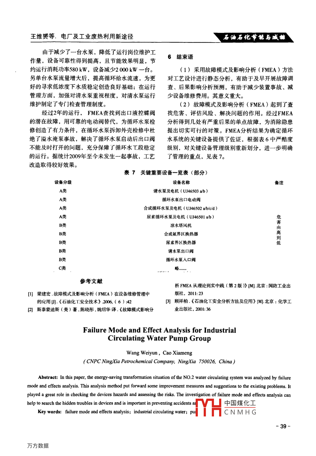 石油石化節(jié)能與減排2011年第1卷第3/4期Energy Conservation and Emission Reduction in Petroleum and Petrochemical Industry工業(yè)循環(huán)水水泵組故障類型及影響分析王維贊,曹夏孟(中國石油寧夏石化公司,寧夏750026)摘要: 用故障類型及影響分析法(FMEA) ,對寧夏石化公司二化肥循環(huán)水系統(tǒng)節(jié)能改造后的現(xiàn)狀進行了調(diào)查分析,針對發(fā)現(xiàn)的問題提出了改進措施和建議。該分析方法有助于提早發(fā)現(xiàn)裝置存在隱患,對預(yù)防事故發(fā)生、減少事故損失有重大意義。關(guān)鍵詞:故障類型及影響分析法( FMEA)工業(yè)循環(huán)水水泵故障1故障模式及影響分析法概述2二化肥循環(huán)水 系統(tǒng)FMEA分析1.1故障模式及影響分析法 (FMEA) 簡介寧夏石化公司二化肥裝置以天然氣為原料,設(shè)FMEA是- -種基本可靠性設(shè)計分析方法,是故計年產(chǎn)450 kt合成氨、780 kt尿素.障分析技術(shù)的基礎(chǔ)。該方法對發(fā)生或可能發(fā)生故障其循環(huán)水工段是為合成氨、尿素、鍋爐裝置輸送的系統(tǒng)及其組成單元進行分析,包括鑒別其故障起合理冷量的循環(huán)水。循環(huán)水水泵將流量為30000 m'h,因、故障模式(即故障機理和發(fā)展過程),評估該壓力為05 MPa的冷卻水送到合成氨、尿素、鍋爐界區(qū)故障模式對系統(tǒng)可能產(chǎn)生的影響及后果分析等。通的換熱器,經(jīng)熱交換后溫度上升至40 C;通過壓力為過故障模式及影響分析,可以迅速發(fā)現(xiàn)較明顯的故0.15 MPa的回水管網(wǎng)送至涼水塔,在涼水塔填料層中障模式并確定單點故障,然后采取相應(yīng)的技改措施與空氣逆流接觸冷卻,循環(huán)水溫度降至32 C后經(jīng)過涼予以消除,從而提高系統(tǒng)的可靠性。水塔塔池連通管進人吸水池;循環(huán)水泵再將吸水池的1.2使用FMEA分析的 目的冷卻水加壓送出。FMEA分析法能夠準(zhǔn)確地分析功能單元或部件故循環(huán)水蒸發(fā)損失、少量飛濺損失、工藝界區(qū)排障對系統(tǒng)工作所產(chǎn)生的后果,為制定設(shè)計方案、工藝放、水系統(tǒng)正常調(diào)節(jié)排污水量的損失,由外部新鮮改進和使用補償措施提供依據(jù)。能夠確定系統(tǒng)設(shè)施的原水補給以維持水量平衡見圖1??煽啃躁P(guān)鍵件(關(guān)鍵裝置)和重要件(重要部位),二化肥自1998年投產(chǎn)已運行12年。循環(huán)水系統(tǒng)而這些關(guān)鍵件、重要件又是進行設(shè)計、工藝技術(shù)改造因設(shè)備存在缺陷,如單臺循環(huán)水泵功率消耗大、流的主要目標(biāo),同樣也是進行可靠性增長試驗、鑒定試量低等問題,影響裝置的安全運行。為了全面地排驗、應(yīng)力分析和保證安全性的主要對象。查影響循環(huán)水系統(tǒng)安全、穩(wěn)定、長周期運行的問題通過FMEA可以達到下述目的:和隱患,結(jié)合裝置實際運行情況,使用FMEA方法(1)幫助工藝系統(tǒng)設(shè)計和運行管理者從各種.分析存在的問題和原因,提出了改進意見。方案中選擇滿足可靠性要求的最佳方案;2.1循環(huán)水系統(tǒng)功能層次劃分(2)有助于在設(shè)計審議中對有關(guān)措施、檢測二化肥工業(yè)循環(huán)水系統(tǒng)(工號名稱:二化肥循設(shè)備等做出客觀的評價;環(huán)水工段)的任務(wù)是:連續(xù)向二化肥裝置的水冷器(3)找出對設(shè)施系統(tǒng)故障有重大影響的部件、功能單元的故障模式并分析其影響程度;收稿日期: 2011-03-27(4)能為進- -步定 量分析提供基礎(chǔ);作者簡介中國煤化工此于撫順石油學(xué)院.(現(xiàn)遼寧現(xiàn)在寧夏石化公(5)能為進-步更改設(shè)施裝置設(shè)計提供資料;司質(zhì)量安fHCN MH G.- 33-石油石化節(jié)能與減排凸2011年第1卷第3/4期白蒸發(fā)水飛散水風(fēng)機.8SS。0循環(huán)熱水熱交換器.回水管網(wǎng)空氣熱交換器|熱交換器填料x工藝介質(zhì)工藝介質(zhì)給水管網(wǎng)循環(huán)冷水系統(tǒng)(保有)水冷卻塔泵排污水.圄1循環(huán)冷卻水系統(tǒng)流程及其它用水設(shè)備提供經(jīng)過水質(zhì)穩(wěn)定處理和冷卻的工機、人口閥。業(yè)用水。二化肥裝置按照裝置、系統(tǒng)、 子系統(tǒng)、設(shè)備、根據(jù)原二化肥循環(huán)水工段情況,參考節(jié)能改組件劃分,劃分層次和內(nèi)容見圖2。循環(huán)水系統(tǒng)由造設(shè)計、生產(chǎn)制造、土建、設(shè)備安裝情況和各參清水泵分系統(tǒng)、合成氨分系統(tǒng)、尿素分系統(tǒng)組成。與單位職責(zé),考慮運行后的維修級別,確定FMEA循環(huán)水子系統(tǒng)劃分各部分:回水管網(wǎng)、涼水塔分析對象的初始約定層次是二化肥裝置,最低約風(fēng)機、涼水塔、塔池、吸水池、循環(huán)水泵、給水管定層次為出口電動閥、止逆閥、水泵、驅(qū)動電網(wǎng)、用戶見圖3。初始約定層裝置約定層次2約定層次1最低約定層零組件.系統(tǒng)分系統(tǒng)次設(shè)備.尿素系統(tǒng)清水系統(tǒng)t[ 合成換熱器][合成氨用戶合成氨系統(tǒng)合成循環(huán)水清水泵組[循環(huán)水泵組1吸水池二套化肥裝置循環(huán)水系統(tǒng)尿素循環(huán)水水泵風(fēng)機蒸汽系統(tǒng)藥劑系統(tǒng)廠涼水塔L出口閥電機加氯系統(tǒng)電氣系統(tǒng)t人口閥監(jiān)測系統(tǒng).■尿素用戶]止逆閥[ 冷卻循環(huán)線]圖2二化肥裝置功能及層次劃分對應(y