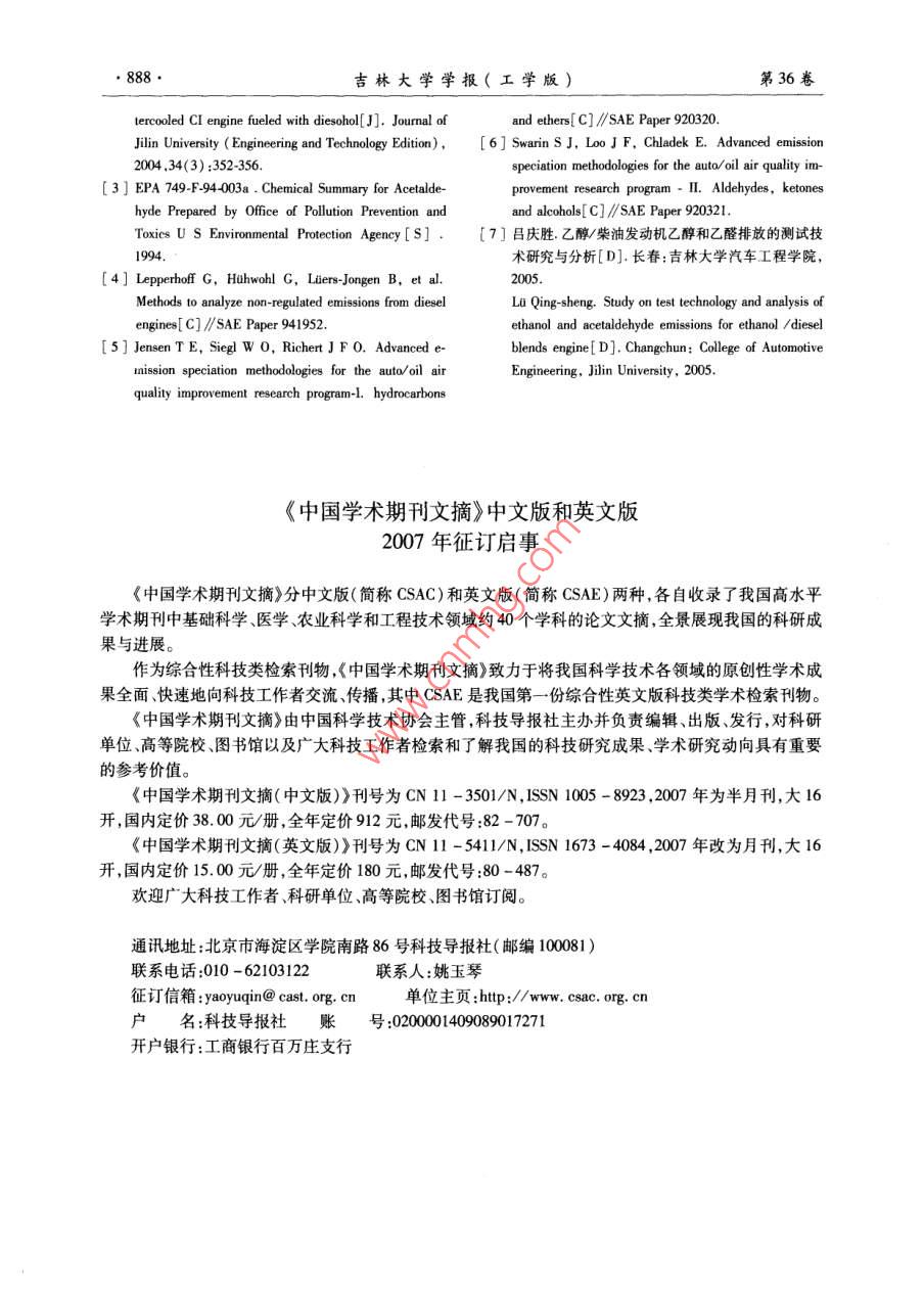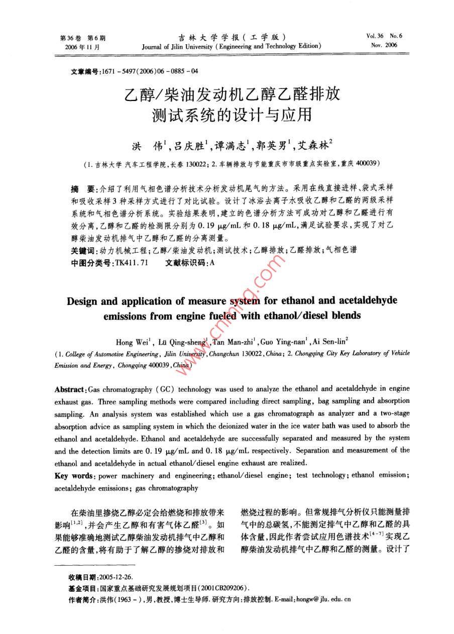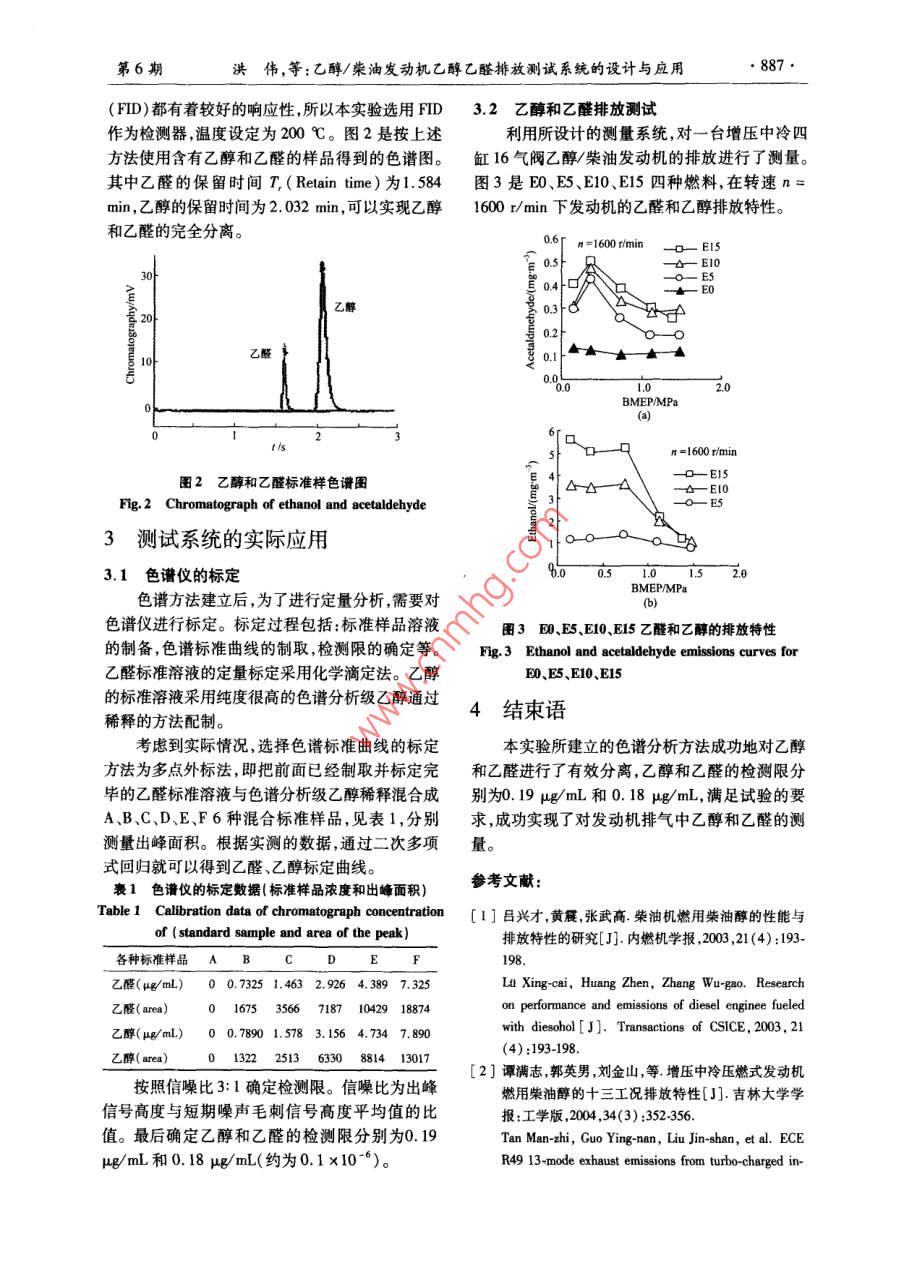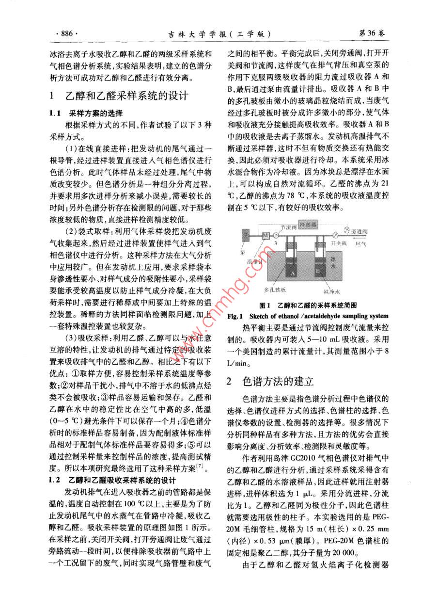第36卷第6期吉林大學(xué)學(xué)報(bào)(工學(xué)版)Vol, 36 No 62006年l月Journal of Jilin University( Engineering and Technology Edition)2006文章編號(hào):1671-5497(2006)06-0885-04乙醇/柴油發(fā)動(dòng)機(jī)乙醇乙醛排放測(cè)試系統(tǒng)的設(shè)計(jì)與應(yīng)用洪偉,呂慶勝,譚滿志,郭英男,艾森林(1.吉林大學(xué)汽車工程學(xué)院,長(zhǎng)春13002:2.車輛排放與節(jié)能重慶市市級(jí)重點(diǎn)實(shí)驗(yàn)室,重慶40009摘要:介紹了利用氣相色譜分析技術(shù)分析發(fā)動(dòng)機(jī)尾氣的方法。采用在線直接進(jìn)樣、袋式采樣和吸收采樣3種采樣方式進(jìn)行了對(duì)比試驗(yàn)。設(shè)計(jì)了冰浴去離子水吸收乙醇和乙醛的兩級(jí)采樣系統(tǒng)和氣相色譜分析系統(tǒng)。實(shí)驗(yàn)結(jié)果表明,建立的色譜分析方法可成功對(duì)乙醇和乙醛進(jìn)行有效分離,乙醇和乙醛的檢測(cè)限分別為0.19g/mL和0.18μg/mL,滿足試驗(yàn)要求,實(shí)現(xiàn)了對(duì)乙醇柴油發(fā)動(dòng)機(jī)排氣中乙醇和乙醛的分離測(cè)量。關(guān)鍵詞:動(dòng)力機(jī)械工程;乙醇/柴油發(fā)動(dòng)機(jī);測(cè)試技術(shù);乙醇排放;乙醛排放;氣相色譜中圖分類號(hào):TK411.71文獻(xiàn)標(biāo)識(shí)碼:ADesign and application of measure system for ethanol and acetaldehydeemissions from engine fueled with ethanol/ diesel blendsHong Wei, Lu Qing-sheng, Tan Man-zhi', Guo Ying-nan, Ai Sen-lin(1. college of automotive Engineering, Jilin University, Changchun 130022, China; 2. Chongging City Key Laboratory of ehicleEmission and Energy, Chongqing 400039, ChinaAbstract: Gas chromatography(GC)technology was used to analyze the ethanol and acetaldehyde in engineexhaust gas. Three sampling methods were compared including direct sampling, bag sampling and absorptionsampling. An analysis system was established which use a gas chromatograph as analyzer and a two-stageabsorption advice as sampling system in which the deionized water in the ice water bath was used to absorb theethanol and acetaldehyde. Ethanol and acetaldehyde are successfully separated and measured by the systemand the detection limits are 0. 19 ug/mL and 0. 18 ug/mL respectively. Separation and measurement of theethanol and acetaldehyde in actual ethanol/diesel engine exhaust are realizedKey words: power machinery and engineering; ethanol/diesel engine; test technology ethanol emission;acetaldehyde emissions; gas chromatography在柴油里摻燒乙醇必定會(huì)給燃燒和排放帶來(lái)燃燒過(guò)程的影響。但常規(guī)排氣分析儀只能測(cè)量排響2),并會(huì)產(chǎn)生乙醇和有害氣體乙醛3。如中的總碳?xì)?不能測(cè)定排氣中乙醇和乙醛的具果能夠準(zhǔn)確地測(cè)試乙醇柴油發(fā)動(dòng)機(jī)排氣中乙醇和體含量,因此作者嘗試應(yīng)用色譜技術(shù)“ˉ實(shí)現(xiàn)乙乙醛的含量,將有助于了解乙醇的摻燒對(duì)排放和醇柴油發(fā)動(dòng)機(jī)排氣中乙醇和乙醛的測(cè)量。設(shè)計(jì)了收稿日期:2005-12-26基金項(xiàng)目:國(guó)家重點(diǎn)基礎(chǔ)研究發(fā)展規(guī)劃項(xiàng)目(2001cB209206)作者簡(jiǎn)介:洪偉(1963-),男,教授博士生導(dǎo)師研究方向:排放控制E-mail:hong@j.edu.cn吉林大學(xué)學(xué)報(bào)(工學(xué)版第36卷冰浴去離子水吸收乙醇和乙醛的兩級(jí)采樣系統(tǒng)和之間的相平衡。平衡完成后,關(guān)閉旁通閥打開(kāi)開(kāi)氣相色譜分析系統(tǒng),實(shí)驗(yàn)結(jié)果表明,建立的色譜分關(guān)閥和節(jié)流閥,這樣廢氣在排氣背壓和真空泵的析方法可成功對(duì)乙醇和乙醛進(jìn)行有效分離。作用下克服兩級(jí)吸收器的阻力流過(guò)吸收器A和1乙醇和乙醛采樣系統(tǒng)的設(shè)計(jì)B,最后通過(guò)泵由流量計(jì)排出。吸收器A和B中的多孔玻板由微小的玻璃晶粒燒結(jié)而成,當(dāng)廢氣1.1采樣方案的選擇經(jīng)過(guò)多孔玻板時(shí)被分成許多微小的部分,使氣體根據(jù)采樣方式的不同,作者試驗(yàn)了以下3種和吸收液充分接觸提高吸收效率。吸收器A和B采樣方式。中的吸收液是去離子蒸餾水。發(fā)動(dòng)機(jī)高溫排氣不(1)在線直接進(jìn)樣把發(fā)動(dòng)機(jī)的尾氣通過(guò)一斷通過(guò)采樣器這時(shí)不但有物質(zhì)交換還有熱能交根導(dǎo)管經(jīng)過(guò)進(jìn)樣裝置直接進(jìn)入氣相色譜儀進(jìn)行換,因此必須對(duì)吸收器進(jìn)行冷卻。本系統(tǒng)采用冰色譜分析。此時(shí)氣體樣品未經(jīng)過(guò)處理,尾氣中物水混合物作為冷卻液。因?yàn)楸鶋K總是漂浮在水面質(zhì)改變較少。但色譜分析是一種組分分離過(guò)程,上,可以構(gòu)成自然對(duì)流循環(huán)。乙醛的沸點(diǎn)為21并要求用多次進(jìn)樣分析來(lái)減小誤差,需要較長(zhǎng)的℃,乙醇的沸點(diǎn)為78℃,本系統(tǒng)的吸收液溫度控時(shí)間;另外色譜分析存在檢測(cè)限的問(wèn)題,對(duì)于那些制在5℃以下,有較好的吸收效率。濃度較低的物質(zhì),直接進(jìn)樣檢測(cè)精度較低。(2)袋式取樣:利用氣體采樣袋把發(fā)動(dòng)機(jī)廢旁通閥氣收集起來(lái),然后經(jīng)過(guò)進(jìn)樣裝置使樣氣進(jìn)入到氣開(kāi)關(guān)閥氣相色譜儀中進(jìn)行分析。這種采樣方法在大氣分析流量計(jì)中應(yīng)用較廣。但在發(fā)動(dòng)機(jī)上應(yīng)用,要求采樣袋本身滲透性要小、對(duì)樣氣成分的吸附性要小,采樣袋要能承受較高溫度以防止樣氣成分冷