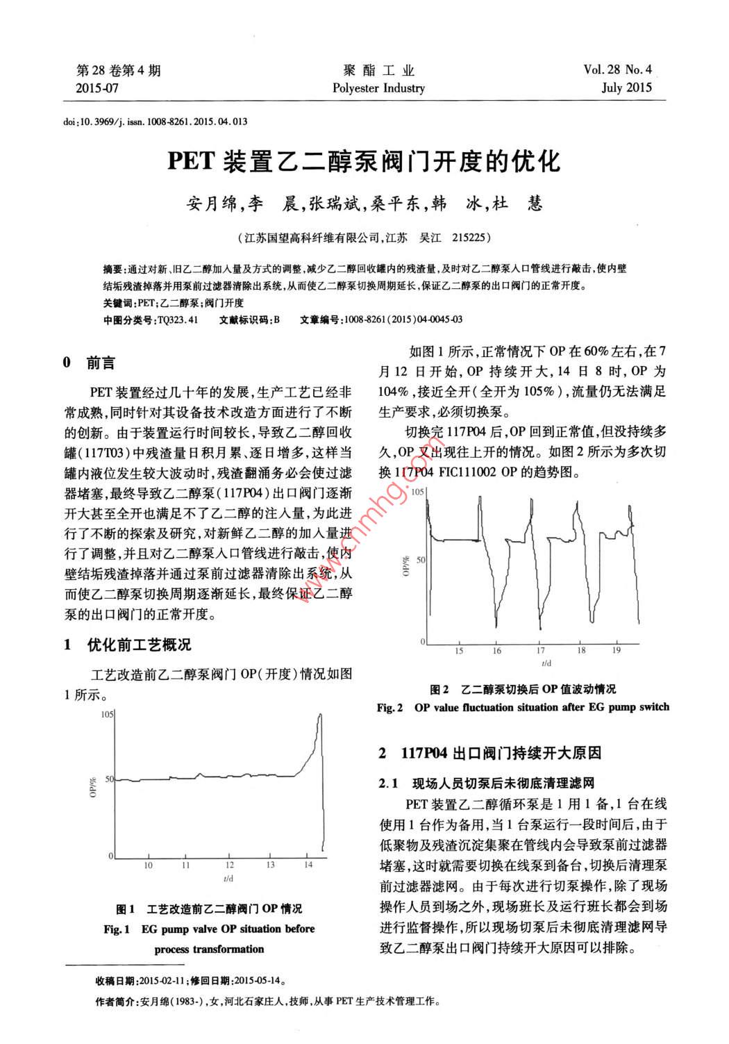 第28卷第4期聚酯工業(yè)Vol 28 No 4201507Polyester IndustryJuly 2015doi:10.3969/ 1. Issn.10088261.2015.04.013PET裝置乙二醇泵閥門開度的優(yōu)化安月綿,李晨,張瑞斌,桑平東,韓冰,杜慧(江蘇國(guó)望高科纖維有限公司,江蘇吳江215225)摘要:通過對(duì)新、舊乙二醇加入量及方式的調(diào)整減少乙二醇回收罐內(nèi)的殘?jiān)?及時(shí)對(duì)乙二醇泵人口管線進(jìn)行敲擊,使內(nèi)壁垢殘?jiān)袈洳⒂帽们斑^濾器清除出系統(tǒng),從而使乙二醇泵切換周期延長(zhǎng)保證乙二醇泵的出口閥門的正常開度。關(guān)鍵詞:;PET;乙二醇泵;閥門開度中圖分類號(hào):TQ323.41文獻(xiàn)標(biāo)識(shí)碼:B文章編號(hào):10088261(2015)040045030前言如圖1所示,正常情況下OP在60%左右,在7月12日開始,OP持續(xù)開大,14日8時(shí),OP為PET裝置經(jīng)過幾十年的發(fā)展,生產(chǎn)工藝已經(jīng)非104%,接近全開(全開為105%),流量仍無法滿足常成熟,同時(shí)針對(duì)其設(shè)備技術(shù)改造方面進(jìn)行了不斷生產(chǎn)要求,必須切換泵的創(chuàng)新。由于裝置運(yùn)行時(shí)間較長(zhǎng),導(dǎo)致乙二醇回收切換完117P04后,OP回到正常值,但沒持續(xù)多罐(117103)中殘?jiān)咳辗e月累、逐日增多,這樣當(dāng)久,OP又出現(xiàn)往上開的情況。如圖2所示為多次切罐內(nèi)液位發(fā)生較大波動(dòng)時(shí),殘?jiān)縿?wù)必會(huì)使過濾換117P4FCl102OP的趨勢(shì)圖。器堵塞,最終導(dǎo)致乙二醇泵(11704)出口閥門逐漸開大甚至全開也滿足不了乙二醇的注入量,為此進(jìn)行了不斷的探索及研究,對(duì)新鮮乙二醇的加入量進(jìn)行了調(diào)整,并且對(duì)乙二醇泵入口管線進(jìn)行敲擊,使內(nèi)壁結(jié)垢殘?jiān)袈洳⑼ㄟ^泵前過濾器清除出系統(tǒng),從而使乙二醇泵切換周期逐漸延長(zhǎng),最終保證乙二醇泵的出口閥門的正常開度。1優(yōu)化前工藝概況工藝改造前乙二醇泵閥門OP(開度)情況如圖1所示。圖2乙二醇泵切換后OP值波動(dòng)情況Fig. 2 OP value fluctuation situation after EG pump switch2117P04出口閥門持續(xù)開大原因2.1現(xiàn)場(chǎng)人員切泵后未徹底清理濾網(wǎng)PET裝置乙二醇循環(huán)泵是1用1備,1臺(tái)在線使用1臺(tái)作為備用,當(dāng)1臺(tái)泵運(yùn)行一段時(shí)間后,由于低聚物及殘?jiān)恋砑墼诠芫€內(nèi)會(huì)導(dǎo)致泵前過濾器堵塞,這時(shí)就需要切換在線泵到備臺(tái),切換后清理泵前過濾器濾網(wǎng)。由于每次進(jìn)行切泵操作,除了現(xiàn)場(chǎng)圖1工藝改造前乙二醇閥門OP情況操作人員到場(chǎng)之外,現(xiàn)場(chǎng)班長(zhǎng)及運(yùn)行班長(zhǎng)都會(huì)到場(chǎng)Fig. 1 EG pump valve OP situation before進(jìn)行監(jiān)督操作,所以現(xiàn)場(chǎng)切泵后未徹底清理濾網(wǎng)導(dǎo)致乙二醇泵出口閥門持續(xù)開大原因可以排除。收稿日期:201502-1;修回日期:20150514。作者簡(jiǎn)介:安月綿(1983-),女,河北石家莊人,技師,從事PET生產(chǎn)技術(shù)管理工作聚酯工業(yè)第28卷2.2管線堵塞導(dǎo)致設(shè)備損壞以致于能力不足現(xiàn),對(duì)于閥門堵塞中控人員進(jìn)行手動(dòng)沖閥,這種操作由于裝置長(zhǎng)時(shí)間運(yùn)行以后,一些低聚物、雜質(zhì)、是重點(diǎn)巡檢的地方,中控每個(gè)人巡檢時(shí)都會(huì)及時(shí)關(guān)殘?jiān)鼤?huì)聚集在管線內(nèi)部,如果不及時(shí)清理,這些大顆注的,所以完全可以排除中控未及時(shí)沖閥導(dǎo)致閥門粒物質(zhì)會(huì)被吸入乙二醇泵內(nèi),這樣會(huì)導(dǎo)致泵損壞,嚴(yán)持續(xù)開大的原因。重影響裝置運(yùn)行,因此制定了一些防范措施,現(xiàn)場(chǎng)人2.4裝置運(yùn)行時(shí)間長(zhǎng)員定期對(duì)這些乙二醇管線進(jìn)行巡檢及敲擊,設(shè)備維由于PET裝置長(zhǎng)時(shí)間運(yùn)行,系統(tǒng)里的殘?jiān)暗妥o(hù)人員對(duì)現(xiàn)場(chǎng)儀表及泵類重要設(shè)備進(jìn)行查看及保聚物會(huì)日積月累、逐日增多,最終會(huì)集聚在乙二醇回養(yǎng),如有異常情況如管線堵塞,現(xiàn)場(chǎng)人員會(huì)及時(shí)通知收罐中。管理人員進(jìn)行管線拆除并清理操作,并且部門還制2.5乙二醇回收罐中的乙二醇較臟堵塞過濾器定一些例行操作,定期的對(duì)一些易堵塞管線進(jìn)行清由于乙二醇回收罐是收集整個(gè)PET裝置所有理,因此管線堵塞導(dǎo)致泵損壞這個(gè)原因也可以排除?;赜玫囊叶家虼朔磻?yīng)過程中產(chǎn)生的低聚物、大顆2.3殘?jiān)氯y門后中控未及時(shí)進(jìn)行手動(dòng)沖閥粒物質(zhì)以及一些殘?jiān)鼊?wù)必會(huì)殘留在乙二醇回收罐中控崗位是PET部門的大腦,也是PET裝置的內(nèi),當(dāng)罐內(nèi)液位發(fā)生較大波動(dòng)時(shí),殘?jiān)窟M(jìn)入到過指揮官,起著至關(guān)重要的作用,因此中控人員的工作濾器內(nèi)導(dǎo)致過濾器堵塞,由于罐內(nèi)殘?jiān)镔|(zhì)較多,現(xiàn)態(tài)度認(rèn)真與否直接決定著裝置的運(yùn)行是否平穩(wěn)對(duì)場(chǎng)人員即便頻繁切泵也滿足不了乙二醇的流量,這此,制定了一些老帶新、傳幫帶等學(xué)習(xí)制度,也就說樣務(wù)必會(huì)使乙二醇泵出口閥門持續(xù)開大直至全開,中控班長(zhǎng)、主操及資歷較老的員工,必須認(rèn)真的教授但還是滿足不了乙二醇流量。和傳輸給新進(jìn)員工一些中控的基本操作,而且中控班