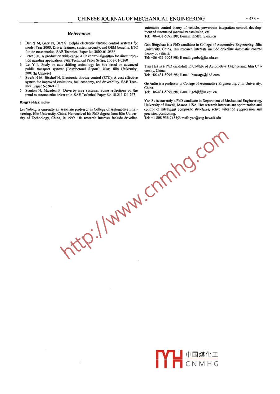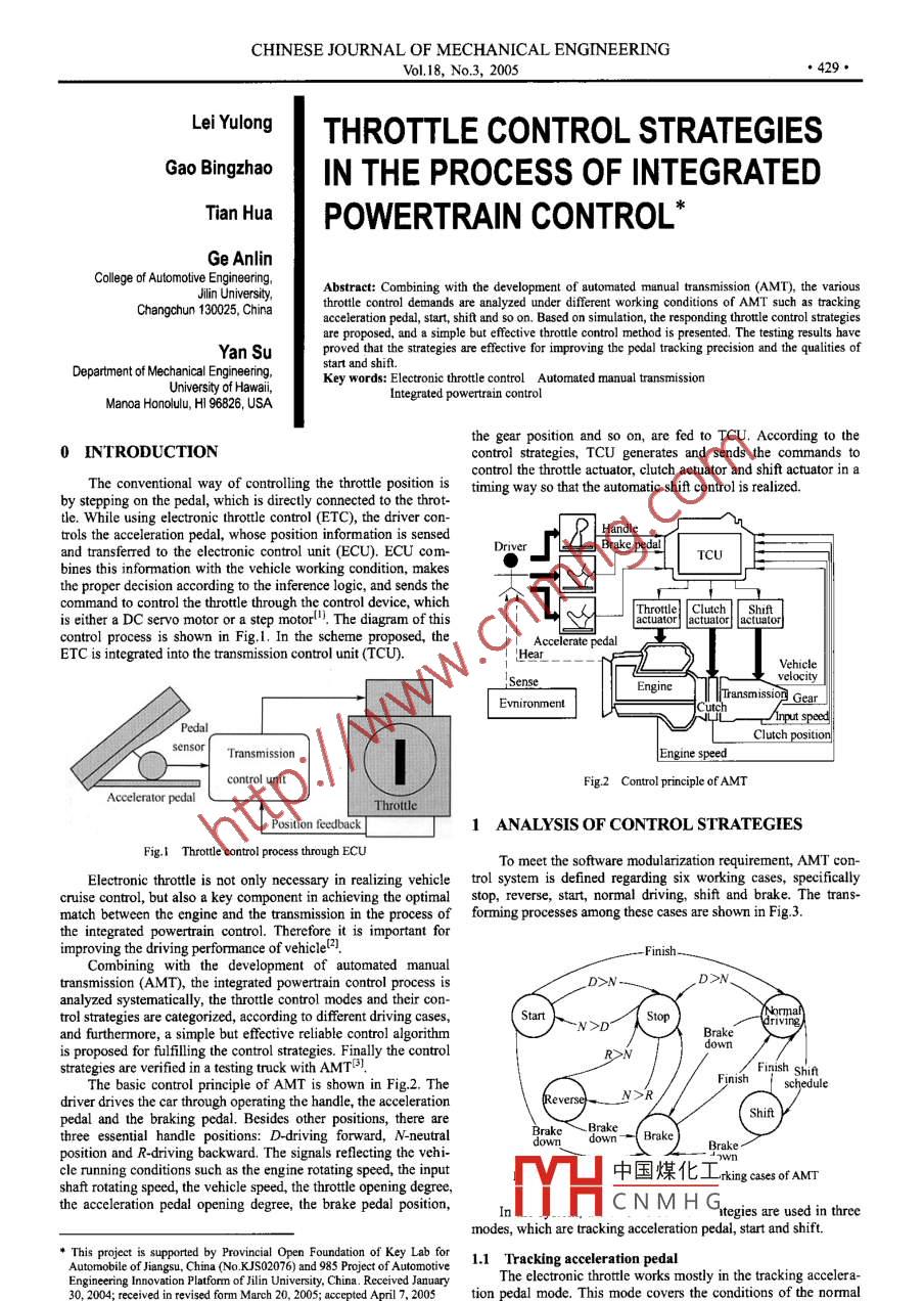 CHINESE JOURNAL OF MECHANICAL ENGINEERINGVol.18, No.3, 2005,429●Lei YulongTHROTTLE CONTROL STRATEGIESGao BingzhaoIN THE PROCESS OF INTEGRATEDTian HuaPOWERTRAIN CONTROL .*Ge AnlinCollege of Automotive Engineering,Abstract: Combining with the development of automated manual transmission (AMT), the variousJilin University,throttle control demands are analyzed under different working conditions of AMT such as trackingChangchun 130025, Chinaacceleration pedal, start, shift and so on. Based on simulation, the responding throttle control strategiesare proposed, and a simple but efective throtle control method is presented. The testing results haveYan Suproved that the strategies are effective for improving the pedal tracking precision and the qualities ofstart and shif.Department of Mechanical Engineering,Key words: Electronic throttle control Automated manual transmissionUniversity of Hawai,Integrated powertrain controlManoa Honolulu, HI 96826, USAthe gear position and so on, are fed to TCU. According to the?INTRODUCTIONcontrol strategies, TCU generates and sends the commands toThe conventional way of controlling the throttle position iscontrol the throttle actuator, clutch actuator and shift actuator in aby stepping on the pedal, which is directly connected to the throt-timing way so that the automatic shift control is realized.tle. While using electronic throttle control (ETC), the driver con-trols the acceleration pedal, whose position information is sensedHandleand transferred to the electronic control unit (ECU). ECU com-DriverBrake pedalTCUbines this information with the vehicle working condition, makesthe proper decision according to the inference logic, and sends thecommand to control the throttle through the control device, whichThrottle Clutch. Shiftis either a DC servo motor or a step motorl"). The diagram of thisYYactuator actuator actuatorcontrol process is shown in Fig.I. In the scheme proposed, theAccelerate pedalETC is integrated into the transmission control unit (TCU).VehicleSenseEngineITransmissiog GearEvnironmentFTL Irput speePedal。Clutch positionsensorTransmissionEngine speedcontrol unitFig.2 Control pinciple of AMTAcelerator pedalThrottlePosition feedback1 ANALYSIS OF CONTROL STRATEGIESig.1 Throttle control process through ECUTo meet the software modularization requirement, AMT con-Electronie trotle is not only necessasry in realizing vehicle trol system is defined regarding. six working cases, specifiallycruise control, but also a key component in achieving the optimal stop, reverse, start, normal driving, shift and brake. The trans-match between the engine and the transmission in the process of forming processes among these cases are shown in Fig.3.the integrated powertrain control. Therefore it is important forimproving the driving performance of vehiclel!- Finish.Combining with the development of automated manualtransmission (AMT), the integrated powertain control process is,D>N-,D>N.analyzed systematically, the thottle control modes and their con-trol strategies are categorized, according to different driving cases,StartStopNormar~ ~N>D'and furthermore, a simple but efective reliable control algorithmBrakedownis proposed for fulling the control strategies. Finally the controlR>Nstrategies are verified in a testing truck with AMTB.FinishFinish ShiftThe basic control principle of AMT is shown in Fig.2. Thescheduledriver drives the car through operating the handle, the acceleration(ReverseShiftpedal and the braking pedal. Besides other positions, there arehree essential handle positions: D-driving forward, N-neutal( Brake_Brakeposition and R-driving backward. The signals reflecting the vehi--7wncle runing conditions such as the engine rotating speed, the input中國煤化工king cses of AMTshaft rotating speed, the vehicle speed, the throttle opening degree,the acceleration pedal opening degree, the brake pedal position,.MHCN M H Gnegies are used in tremodes, which are tracking acceleration pedal, start and shift.' This priee is sppored by Rovinial open Fondation ofKeyLlb for 1.1 Tracking aceleraion pedalAutomobile of Jiangsu, China (No.KJS02076) and 985 Project of AutomotiveThe electronic throttle works mostly in the tracking accelera-Engineering Innovation Platform of Jilin University, China. Rceived January30, 2004; received in revised form March 20, 2005; accepted April 7, 2005 tion pedal mode. This mode covers the conditions of the normal●430●Lei Yulong, et al: Throttle control strategies in the process of integrated powertrain controldriving, stop, brake and so on, where the electronic throtle isHere 0w. is the error between actual engine speed ore and therequired to follow the driver's intention by responding to thetarget speed Wormovement of the acceleration pedal rapidly and accurately. In thismode, the throttle opening is determined by the acceleration pedalS@. =0。-0a .1)positionl".The throttle target position can be assigned according to theHowever, tracking delay is inevitable because of the phaserelationship chart shown in Fig.5.delay of the control system and the mecbanical hysteresis, there-fore the tracking accuracy depends on the responding speed.13 ShiftMoreover, the vehicle vibration due to the road surface uneven-In the shifing process, in order to reduce the impact andness will wobble the driver's foot and therefore generate the un-noise, and elongate the service life of the clutch, it is necessary towanted wobbling noise to the throttle command. To avoid this, weharmonize the actions of the engine, the clutch and the transmis-use an error filter to filter out the wobbling noise, in which a con-sion. This is called the integrated powertrain control process astrol error range is defined providing that the control accuracy isshown in Fig.6.still met. The pedal opening will not change when the pedalopening varies in this scope.Disengag1.2 StartThe sketch map of the starting process is shown in Fig.4.L DisengageTouch points EngageA EngeTime tT