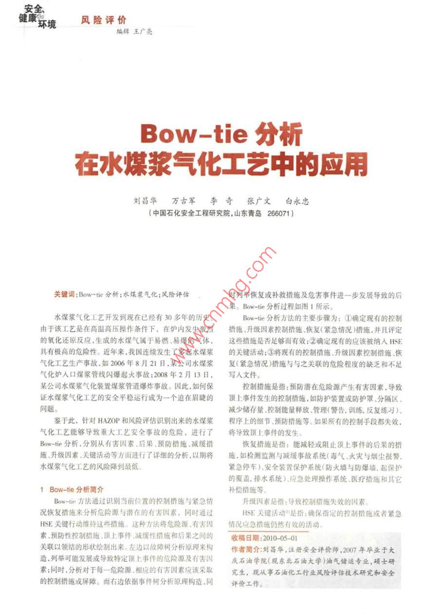 安全環(huán)境風險評價編輯王廣亮Bow-tie分祈在水煤漿氣化工藝中的應用劉昌華萬古軍李奇張廣文白永忠中國石化安全工程研究院,山東青島266071關鍵詞:Bow-ie分析;水煤漿氣化;風險評估時列舉恢復或補救措施及危害事件進一步發(fā)展導致的后果。Bow-tie分析過程如圖1所示。水煤漿氣化工藝開發(fā)到現(xiàn)在已經(jīng)有30多年的歷史。Bow-ie分析方法的主要步驟為:①確定現(xiàn)有的控制由于該工藝是在高溫高壓操作條件下,在爐內發(fā)生激烈措施、升級因素控制措施、恢復(緊急情況)措施,并且評定的氧化還原反應,生成的水煤氣屬于易燃、易爆的氣體,這些措施是否足夠而有效:②確定現(xiàn)有的應該被納入HSE具有極高的危險性。近年來,我國連續(xù)發(fā)生了多起水煤漿的關鍵活動;③將現(xiàn)有的控制措施、升級因素控制措施、恢氣化工藝生產事故,如2006年8月21日,某公司水煤漿復(緊急情況)措施與與之關聯(lián)的危險程度的缺乏和不足氣化爐入口煤漿管線閃爆起火事故:2008年2月13日,寫入文件某公司水煤漿氣化裝置煤漿管道爆炸事故。因此,如何??刂拼胧┦侵?預防潛在危險源產生有害因素,導致證水煤漿氣化工藝的安全平穩(wěn)運行成為一個迫在眉睫的頂上事件發(fā)生的控制措施,如防護裝置或防護罩、分隔區(qū)問題。減少儲存量、控制能量釋放、管理(警告,訓練,反復練習)鑒于此,針對HAOP和風險評估識別出來的水煤漿程序上的細節(jié)、預防措施等。如果所有的控制手段都失效氣化工藝能夠導致重大工藝安全事故的危險,進行了將導致頂上事件的發(fā)生。Bow-ie分析,分別從有害因素、后果、預防措施、減緩措恢復措施是指:能減輕或阻止頂上事件的后果的措施、升級因素、關鍵活動等方面進行了詳細的分析,以期將施,如檢測監(jiān)測與減緩事故系統(tǒng)(毒氣、火災與煙塵報警水煤漿氣化工藝的風險降到最低緊急停車)、安全裝置保護系統(tǒng)(防火墻與防爆墻,起保護的覆蓋,排水系統(tǒng))、應急處理操作系統(tǒng)、醫(yī)療措施和其它1Bow-te分析簡介補償措施等Bow-tie方法通過識別當前位置的控制措施與緊急情升級因素是指:導致控制措施失效的因素況恢復措施來分析危險源與潛在的有害因素,同時通過HSE關鍵活動是指:確保指定的控制措施或者緊急HSE關鍵行動維持這些措施。這種方法將危險源、有害因情況應急措施仍然有效的活動素、預防性控制措施,頂上事件減緩性措施和后果之間的收稿日期:201005-01關聯(lián)以領結的形狀繪制出來:左邊以故障樹分析原理來構作者簡介劉昌華,注冊安全評價師,20年畢業(yè)于大造,列舉可能發(fā)展或導致特定頂上事件的危險源及有害因慶石油學院(現(xiàn)東北石油大學)油氣儲運專業(yè),碩士研素:同時,分析對于每一危險源、相應的有害因素應該采取完生,現(xiàn)從事石油化工行業(yè)風險評估技術研完和安全的控制措施或屏障。而右邊依據(jù)事件樹分析原理構造,同評價工作。劉昌華等.Bw-ti分析在水煤漿氣化工藝中的應用風險評價預防性控制措施減緩性控制措隨頂上事件(事件)圖1Bow-tie分析過程示意2Bow-ie分析在水煤漿氣化工藝中的應用藝氣溫度超過280℃報警:②ESD系統(tǒng);③氣化爐內構件2.1水煤漿氣化工藝流程及重大危險的保持完好。水煤漿氣化工藝流程如下:將煙煤制成水煤漿,與氧針對工藝過程變化的控制措施:①氣化爐控制升壓或氣在高溫高壓下的氣化爐中發(fā)生部分氧化反應,制取原料降壓的速率≤0.2MPa;②熱緊氣,并將富含有效氣的粗原料氣經(jīng)初步洗滌后送到凈化單2.24升級因素及關鍵活動元。氣化爐和碳洗塔排出的炭黑水分別在高壓、中壓、低壓以有害因素(腐蝕、磨蝕)的控制措施—壓力容器或和真空下閃蒸降溫、回收冷凝液、濃縮炭黑漿后送到炭黑壓力管道的檢驗檢測為例,其升級因素為未進行檢測或檢過濾裝置,灰水回用(作為粗煤氣洗滌用水)經(jīng)過 HAZOP測不規(guī)范。對應的關鍵活動:①系統(tǒng)嚴格按照國家壓力容分析和風險評估,識別出的水煤漿氣化工藝的重大危險有器規(guī)范進行檢驗:②新施工的部位按照施工檢驗規(guī)范進行工藝氣泄漏、氣化爐過氧受限空間作業(yè)等檢測;③對設備管線進行定期測厚;④①根據(jù)運行情況對發(fā)22重大工藝危險的Bow-lie分析生過超溫、超壓的設備進行抽檢下面以工藝氣泄漏為例,說明Bw-ie分析的應用22.5減緩性措施22.1頂上事件及后果針對火災、爆炸后果的減緩性措施:①可燃氣體監(jiān)測將工藝氣泄漏作為頂上事件。工藝氣一日泄漏,其中報警:2視頻監(jiān)控;③點火源的控制;④應急預案和響應的可燃氣體,如H2等,會導致火災及爆炸,嚴重損壞設備,⑤消氣防設施。造成人員傷亡。而其中的有毒氣體,如CO,HS等則會導針對人員中毒的減緩性措施:①應急預案和響應;2致人員的中毒有毒氣體監(jiān)測報警:③個體防護裝備22.2有害因素發(fā)生工藝氣泄漏的主要原因:①腐蝕、磨蝕;②超壓:3結語③振動:④超溫:⑤T藝過程的變化。通過Bow-ie分析,針對 HAZOP分析和風險評估識別2.2.3控制措施出的水煤漿氣化工藝重大工藝危險,提出了導致危險的有針對腐蝕磨蝕的控制措施:①按照設計標準進行裝害因素和控制措施。針對導致控制措施失效的升級因素置的設計和施工;②壓力容器或壓力管道的檢驗檢測;③識別出了