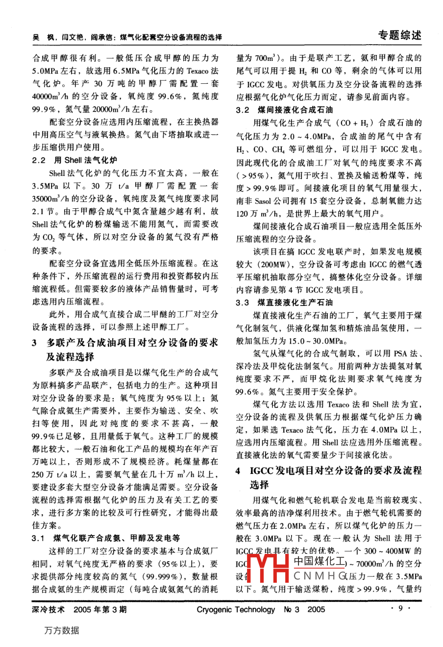 專題綜述文章編號: 1009-9425(200)03-000704煤氣化配套空分設(shè)備流程的選擇吳楓,閆文艷,閻承信(煙臺化工設(shè)計(jì)院,山東煙臺264001)摘要:結(jié)合煤氣化工藝,詳細(xì)分析了化肥工業(yè)、合成甲醇項(xiàng)目、多聯(lián)產(chǎn)及合成油項(xiàng)目和ICCC發(fā)電項(xiàng)目等煤氣化裝置對空分設(shè)備的要求和流程選擇,得出了各個(gè)項(xiàng)目適用的大型空分設(shè)備流程。關(guān)鍵詞:大型空分設(shè)備;流程;煤氣化.中圖分類號: TB657.7文獻(xiàn)標(biāo)識碼: AProcess selection of an air separation unitspecially designed for coal gasification projectWu Feng,Yan Wen-yan,Yan Cheng- xin( Yantai Chemical Designing Institue, Yantai 264001 ,Shandong, P. R. China)Abstract: On the basis of coal gasification industry and technological procedures, the requirements for air separationunits set by coal gasification systems in connection with chemical fertilizer industry, synthetic methanol project, multipleco-production and synthetic oil project and IGCC power generation project etc. and process selection are analyzed indetail. Finally the appropriate process of an air separation unit is worked out for each project.Keywords: Large - scale air separation unit; Process; Coal gasification前言裝置和空分設(shè)備。由于國際上石油價(jià)格的上漲,潔凈煤的利用受近年來,空分設(shè)備流程不斷發(fā)展,一些卓有成.到了普遍的關(guān)注。為提高煤氣化裝置的生產(chǎn)能力,效的新技術(shù)被采用,如高效空氣冷卻塔、常溫分子- - 般都選擇氧氣氣化法。特別是我國為擺脫對進(jìn)口篩凈化空氣、增壓透平膨脹機(jī)、規(guī)整填料精餾塔、石油的依賴,確保能源安全,將建設(shè)一大批大型的膜式冷凝蒸發(fā)器、雙沸騰主冷凝蒸發(fā)器、全精餾制煤炭液化(間接和直接液化)、煤炭化工和ICCC氬等,使全低壓流程空分設(shè)備的制氧能耗已降至發(fā)電等項(xiàng)目,這些項(xiàng)目都需要建設(shè)煤氣化裝置,一0. 4kW.h/m'以下。裝置投資的下降以及運(yùn)行可靠些項(xiàng)目每年氣化煤炭的能力要達(dá)到幾百萬噸,甚至性的提高,使深冷法空分設(shè)備被廣泛應(yīng)用于各領(lǐng)上千萬噸,都要相應(yīng)配套建設(shè)多套超大型的空分設(shè)域,特別是氧氣消耗量較大的場合。變壓吸附法空備。由于各行業(yè)生產(chǎn)工藝不同,對空分設(shè)備流程的分設(shè)備一般應(yīng)用于氧氣需求量低于3000m'/h 和對要求也不一樣。氧、氮純度要求不高的場合。我國的化肥工業(yè)也面臨著原料改造的局面,將我國目前已能夠獨(dú)立設(shè)計(jì)和制造60000m/h等有一大批以渣油和輕油為原料的工廠改為煤炭為原級的全低壓大型空分設(shè)備,已投運(yùn)的有杭氧設(shè)計(jì)制料,一些遠(yuǎn)離無煙煤產(chǎn)區(qū)的中、小化肥廠,有的擬造的遼寧北臺50000m'/h空分設(shè)備。同時(shí),近年來改為煙煤或粉煤為原料,這些企業(yè)都要建設(shè)煤氣化也成中國煤化工備,杭氧已完成設(shè)收稿日期: 2004-12-14YHCNMHG作者簡介:吳楓(1966- ), 女,高級工程師,1985 年畢業(yè)于青島化工學(xué)院,長期從事化工設(shè)計(jì)及管理工作。深冷技術(shù)2005年第3期Cryogenic Technology N3 2005專題綜述吳楓,閆文艷,閻承信:煤氣化配套空分設(shè)備流程的選擇計(jì)制造了湖北枝江和安徽安慶的兩套48000m'/h內(nèi)粉煤氣化技術(shù),氣化壓力0.03MPa以下;③改為無壓縮流程空分設(shè)備。在國外,內(nèi)壓縮流程空分設(shè)備煙煤富氧氣化法,氣化壓力0.03MPa以下。的能耗要高于外壓縮流程,但投資低于外壓縮流- 般中小型氨廠的合成氨產(chǎn)量在20萬t/a以程;在國內(nèi),如大型空壓機(jī)用進(jìn)口設(shè)備,則投資與下,由于工廠的規(guī)模及氣化方法的不同,要求空分能耗均高于外壓縮流程”。雖然如此,由于內(nèi)壓縮設(shè)備的氧產(chǎn)量一般為3000 ~ 20000m2/h,氧氣純度流程有很多優(yōu)點(diǎn),在一定的條件下選用還是具有95%以上;氮?dú)?純度99.999%)的需要量為0~優(yōu)勢。20000m'/h。由于氣化壓力接近常壓,供氧壓力低本文就如何配合煤氣化工藝,選擇空分設(shè)備流于0.1MPa。在這種情況下,宜選用自增壓流程空程談?wù)効捶ā7衷O(shè)備,即利用空分設(shè)備主冷凝蒸發(fā)器的位差產(chǎn)生1化肥工業(yè)對空分設(shè)備的要求及流程選擇壓力為0.05-0.2MPa的氧氣,直接供氣化爐使用。由于石油價(jià)格的飛漲,新建和改擴(kuò)建的合成氨優(yōu)點(diǎn)是省去了氧壓機(jī)(或鼓風(fēng)機(jī)),設(shè)備運(yùn)行的可工廠不再采用輕油或渣油為原料。采用石油焦為原靠性提高,供氧安全。當(dāng)然,自增壓流程空分設(shè)備需設(shè)置一臺一體式空壓機(jī),即在空壓機(jī)的末端增加料的工廠與以煤為原料的工廠的工藝過程基本一--段氣缸,抽取部分空氣,并將其壓縮至0.7MPa;致,對空分設(shè)備的要求也大致相同。主要要求是:然后用這股空氣去膨脹機(jī)制冷及與液氧進(jìn)行換熱,氧純度≥95%,其中,氬含量越低越好;氮純度≥使其蒸發(fā)以得到具有一定壓力(0.05 ~ 0.2MPa)的99 999%;氮產(chǎn)量為氧產(chǎn)量的1.0~1.5倍;液體產(chǎn)氧氣,其綜合能耗與外壓縮流程相差無幾。品產(chǎn)量及氬等稀有氣體產(chǎn)量依據(jù)當(dāng)?shù)厥袌龊弯N售情對于有些工廠選用的氣化壓力為2.0~ 3.0MPa況而定。的氣化爐(如Shell法,Lurgi 法等),與其配套的1.1 大型合成氨廠(