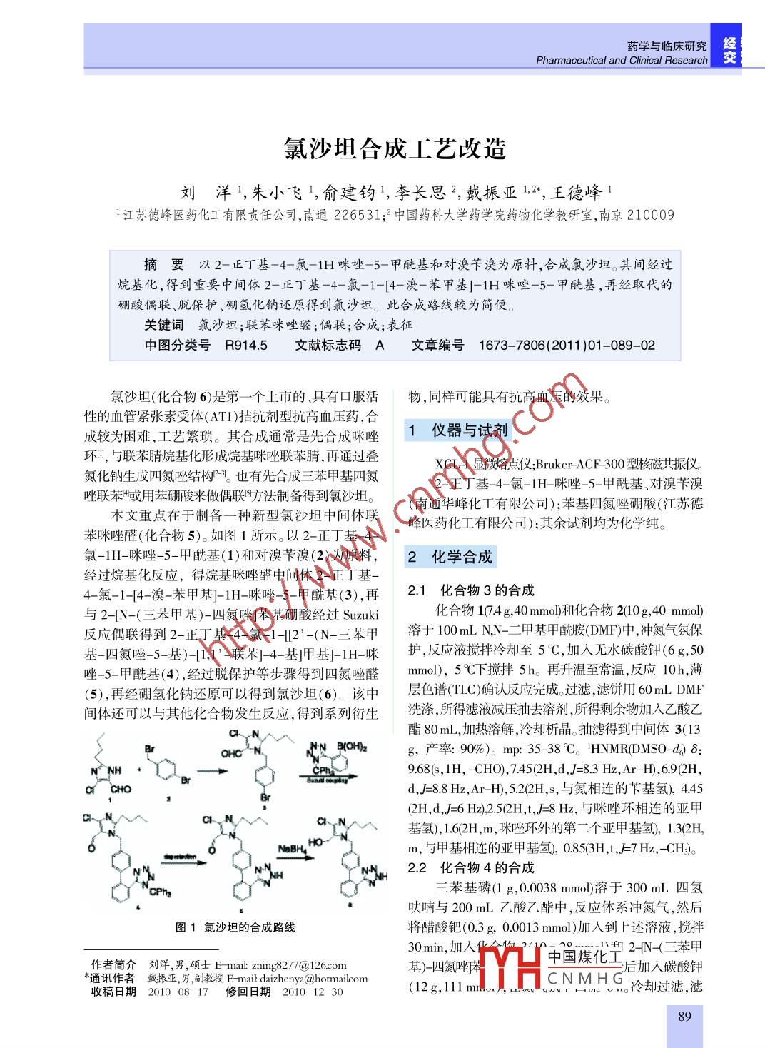 藥學(xué)與臨床研究Pharmaceutical and Clinical Research氯沙坦合成工藝改造劉洋'朱小飛',俞建鈞',李長思,戴振亞l,王徳峰11江蘇德峰醫(yī)藥化工有限責(zé)任公司,南通226531;2中國藥科大學(xué)藥學(xué)院藥物化學(xué)教研室,南京210009摘要以2-正丁基-4-氯-1H咪唑-5-甲?;蛯︿迤S溴為原料,合成氯沙坦。其間經(jīng)過烷基化,得到重要中間體2-正丁基-4-氯-1-[4-溴-苯甲基]-1H咪唑-5-甲?;?再經(jīng)取代的硼酸偶聯(lián)、脫保護、硼氫化鈉還原得到氯沙坦。此合成路線較為簡便。關(guān)鍵詞氯沙坦;聯(lián)苯咪唑醛;偶聯(lián);合成;表征中圖分類號R9145文獻標(biāo)志碼A文章編號1673-7806(2011)01-089-02氯沙坦(化合物6)是第一個上市的、具有口服活物,同樣可能具有抗高血壓的效果。性的血管緊張素受體(AT1)拮抗劑型抗高血壓藥,合成較為困難,工藝繁瑣。其合成通常是先合成咪唑1儀器與試劑環(huán)叫,與聯(lián)苯腈烷基化形成烷基咪唑聯(lián)苯腈,再通過疊XCL-l顯微榕點儀; Bruker-ACH300型核磁共振儀。氮化鈉生成四氮唑結(jié)構(gòu)也有先合成三苯甲基四氮-正丁基-4-氯-1H-咪唑-5-甲酰基、對溴芐溴唑聯(lián)苯或用苯硼酸來做偶聯(lián)方法制備得到氯沙坦(南通華峰化工有限公司);苯基四氮唑硼酸(江蘇德本文重點在于制備一種新型氯沙坦中間體聯(lián)峰醫(yī)藥化工有限公司);其余試劑均為化學(xué)純。苯咪唑醛(化合物5)。如圖1所示。以2-正丁基-4氯1H咪唑5-甲酰基(1)和對溴芐溴(2)為原料,2化學(xué)合成經(jīng)過烷基化反應(yīng),得烷基咪唑醛中間體2-正丁基4-氯-1-{4-溴-苯甲基}-1H-咪唑-5-甲?;?3),再化合物3的合成與2-N-(三苯甲基)-四氮唑苯基硼酸經(jīng)過 Suzuki化合物1074g,40mmo和化合物210g,40mmo反應(yīng)偶聯(lián)得到2-正丁基4氯-12(N-三苯甲溶于100NN二甲基甲酰胺(DMF中,沖氮氣氛?;牡?5-基)1-聯(lián)苯}4基甲基1H-咪米護,反應(yīng)液攪拌冷卻至5℃,加入無水碳酸鉀(6g50唑-5-甲酰基(4,經(jīng)過脫保護等步驟得到四氮唑醛mm,5℃下攪拌5h再升溫至常溫,反應(yīng)10h,薄5),再經(jīng)硼氫化鈉還原可以得到氯沙坦(6)。該中層色譜(TC)確認反應(yīng)完成過濾濾餅用60 ML DMF間體還可以與其他化合物發(fā)生反應(yīng),得到系列衍生洗滌,所得濾液減壓抽去溶劑,所得剩余物加入乙酸乙.N心則m,產(chǎn)率91m35381NmNH+9.68(s,1H,CHO,745(2H,d,J=8.3Hz,Ar-H),69(2HC CHOd,=8.8Hz,Ar-H),5.2(2H,s,與氮相連的芐基氫,445(2H,d,6Hz)2.5(2H,J=8Hz,與咪唑環(huán)相連的亞甲c、N基氫,62H,m,咪唑環(huán)外的第二個亞甲基氫,1.3(2H,NaBHm,與甲基相連的亞甲基氫,0.853H,t,=7Hz,CHN22化合物4的合成CPha苯基磷(1g,0.0038mmo溶于300m四氫呋喃與200mL乙酸乙酯中,反應(yīng)體系沖氮氣,然后圖1氯沙坦的合成路線將醋酸鈀(0.3g.0.0013mmol)加入到上述溶液,攪拌30min,加入中國煤化工2N-(三苯甲作者簡介劉洋,男,碩士 E-mail: ning827@126com基)-四氮唑后加人碳酸鉀通訊作者戴振亞,男副教授 E- mait daizhenya@ hotmailcon(12g,11lmYHCNMHG收稿日期2010-08-17日期2010-12-30冷卻過濾,濾2011eb;19(1)氯沙坦合成工藝改造液反復(fù)用去離子水洗滌。將有機相減壓濃縮,析出固4.342H,,與羥基相連的亞甲基氫),248(2H,t,J=7體。得化合物4(167g,產(chǎn)率:90%)。HNMR(DM與咪唑環(huán)相連的亞甲基氫,148(2H,m,咪唑環(huán)s0)6973(1H,醛基氫),751-681(23H,m,Ar-外的第二個亞甲基氫27(2H,m,與甲基相連的亞H,545(2H,s,與氮相連的芐基氫,2492H,7H,甲基氫,0.81(3H,=7H,CH)與咪唑環(huán)相連的亞甲基氫),1642H,m,咪唑環(huán)外的第個亞甲基氫,1282H,m,與甲基相連的亞甲基氫),3討論0.86(3H,t,}=7Hz,=CH3)。在聯(lián)苯的合成中,報道較多的是通過格式試劑方23化合物5的合成法。由于格式試劑條件較為苛刻,難以控制。本文選擇加人化合物41218mmHF6Oom)及通過Smki偶聯(lián)反應(yīng)來進行聯(lián)苯的形成,在反應(yīng)過程鹽酸(37%,70mL),攪拌溶解,有白色固體析出,加中單一溶劑無法取得很好的收率本次試驗選用的是熱至60℃左右,反應(yīng)05h冷卻至室溫,用氫氧化兩種溶劑,按-定比例混配來達到反應(yīng)效果:在反應(yīng)過鈉溶液調(diào)節(jié)pH69-70,減壓濃縮。殘余溶液用2程中醛基的存在并未影響到反應(yīng)的進行,從而避免了moL鹽酸調(diào)節(jié)pH2-3,析出固體。過濾,固體醛基的保護和脫保護過程降低了成本。用水洗滌,真空干燥,得化合物5(6g,產(chǎn)率:90%)。鈀催化劑選用的是三苯基磷與醋酸鈀現(xiàn)場生HNMR ( DMSO-A08968(H,CHO)70-750成的催化劑,活性更高穩(wěn)定性更好對反應(yīng)條件要4H,m,與四氮唑基相連的Ar1,07(2H,d,J9求低;在處理過程中通過過濾還可以回收鈀黑,從Hz,與咪唑基相連的Ar-H,705(21,d,J=85H,與而可以實現(xiàn)催化劑的回收利用,價格也便宜很多,咪唑基相連的Ar1HD582H,…,與氮相連的芐基也更適用于工業(yè)化生產(chǎn)。此外,與傳統(tǒng)工藝相比,本氫),2,63(2H,t,J=7Hz,與咪唑環(huán)相連的亞甲基氫路線避免了在最后一步使用錫試劑生成四氮唑基1512Hmx外的第二個亞甲基氫,1202H,團,從而降低了對環(huán)境的污染。m,與甲基相連的亞甲基氫),0.81(3H,t,J=7Hz,-CH3)。參考文獻24化合物6的合成[11 Griffiths GJ, Hauck MB, Imwinlelried R. Novel將化合物5(6g,1425mmo溶于100mL的無水of 2-butyl-5-chloro-3H-imidazole-4-carboxyaldehyde: a甲醇中。將溶液冷卻至0℃,攪拌下在1h內(nèi)分批緩key intermediate for the synthesis of the angiotensin Il慢加入硼氫化鈉(1g,29mmol),TC確認反應(yīng)完ntagonist losartan[J]. J Or