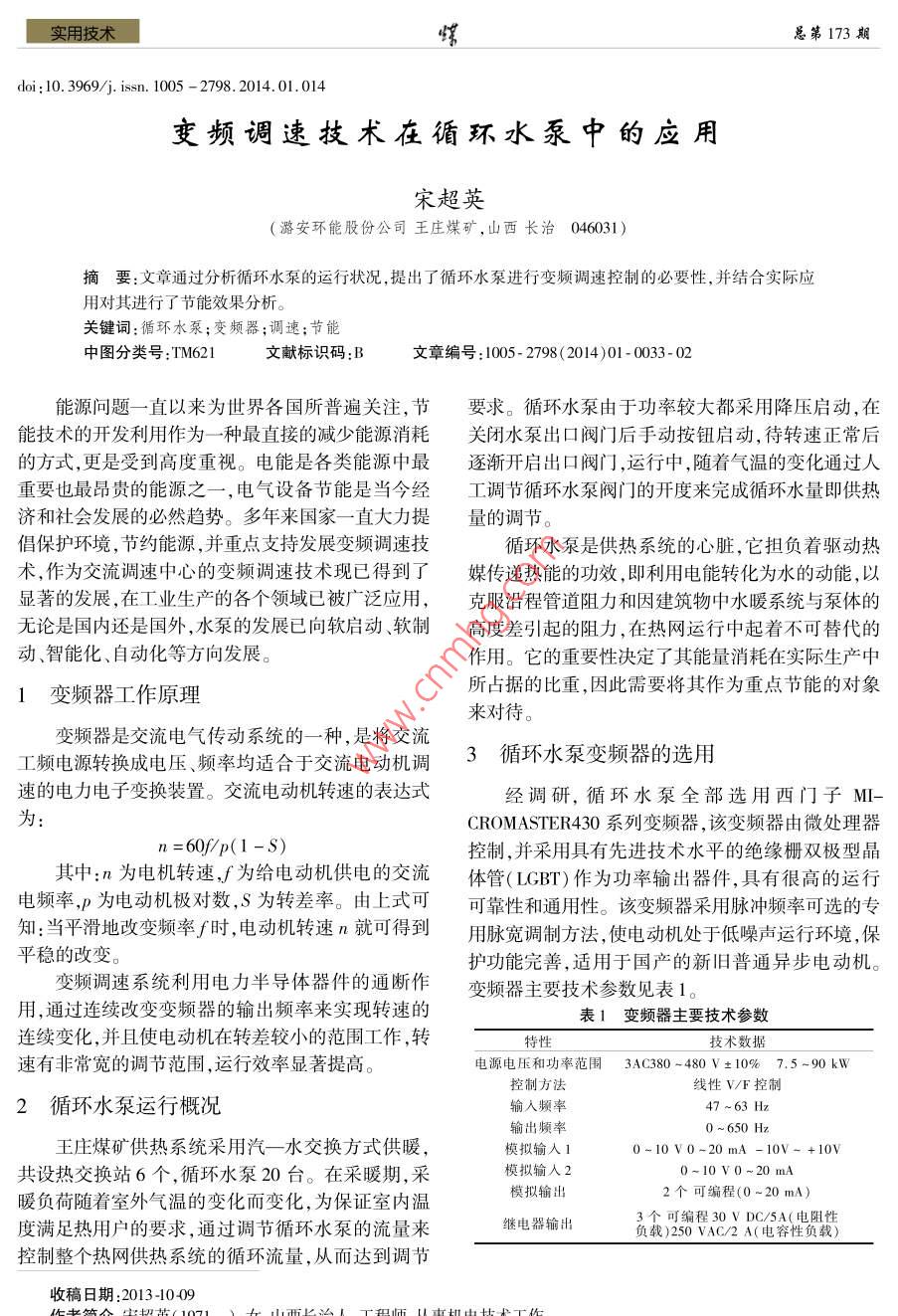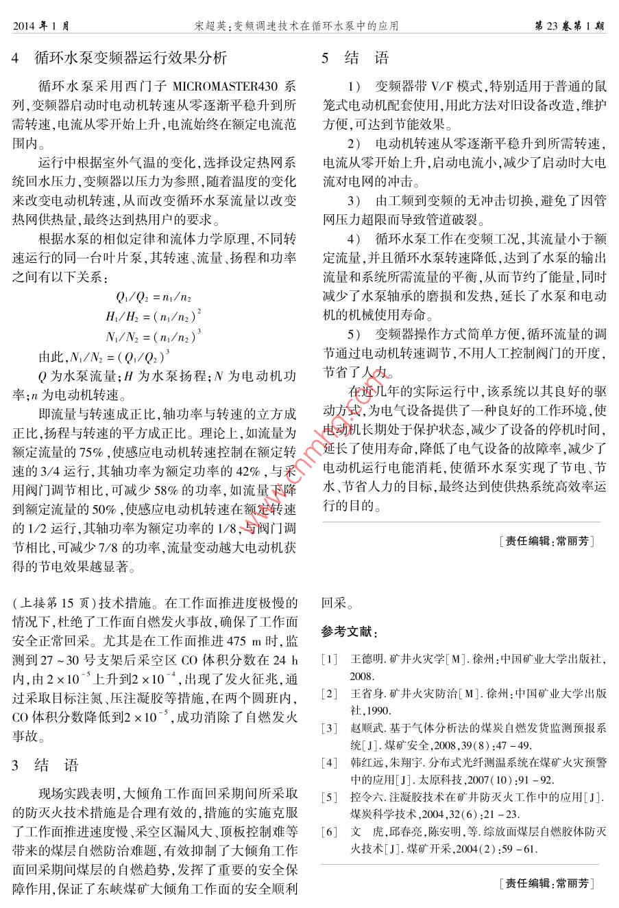 實用技術(shù)總第173期loi:10.3969j.issn.1005-2798.2014.01.014變頻調(diào)速技術(shù)在循環(huán)水泵中的應(yīng)用宋超英(潞安環(huán)能股份公司王莊煤礦,山西長治046031)摘要:文章通過分析循環(huán)水泵的運行狀況,提出了循環(huán)水泵進行變頻調(diào)速控制的必要性,并結(jié)合實際應(yīng)用對其進行了節(jié)能效果分析。關(guān)鍵詞:循環(huán)水泵;變頻器;調(diào)速;節(jié)能中圖分類號:TM621文獻標識碼:B文章編號:1005-2798(2014)01-0033-02能源問題一直以來為世界各國所普遍關(guān)注,節(jié)要求。循環(huán)水泵由于功率較大都采用降壓啟動,在能技術(shù)的開發(fā)利用作為一種最直接的減少能源消耗關(guān)閉水泵出口閥門后手動按鈕啟動,待轉(zhuǎn)速正常后的方式,更是受到高度重視。電能是各類能源中最逐漸開啟出口閥門,運行中,隨著氣溫的變化通過人重要也最昂貴的能源之一,電氣設(shè)備節(jié)能是當今經(jīng)工調(diào)節(jié)循環(huán)水泵閥門的開度來完成循環(huán)水量即供熱濟和社會發(fā)展的必然趨勢。多年來國家一直大力提量的調(diào)節(jié)。倡保護環(huán)境,節(jié)約能源,并重點支持發(fā)展變頻調(diào)速技循環(huán)水泵是供熱系統(tǒng)的心臟,它擔負著驅(qū)動熱術(shù),作為交流調(diào)速中心的變頻調(diào)速技術(shù)現(xiàn)已得到了媒傳遞熱能的功效,即利用電能轉(zhuǎn)化為水的動能,以顯著的發(fā)展,在工業(yè)生產(chǎn)的各個領(lǐng)域已被廣泛應(yīng)用,克服沿程管道阻力和因建筑物中水暖系統(tǒng)與泵體的無論是國內(nèi)還是國外,水泵的發(fā)展已向軟啟動、軟制高度差引起的阻力,在熱網(wǎng)運行中起著不可替代的動、智能化、自動化等方向發(fā)展。作用。它的重要性決定了其能量消耗在實際生產(chǎn)中1變頻器工作原理所占據(jù)的比重,因此需要將其作為重點節(jié)能的對象來對待。變頻器是交流電氣傳動系統(tǒng)的一種,是將交流工頻電源轉(zhuǎn)換成電壓、頻率均適合于交流電動機調(diào)3循環(huán)水泵變頻器的選用速的電力電子變換裝置。交流電動機轉(zhuǎn)速的表達式經(jīng)調(diào)研,循環(huán)水泵全部選用西門子MI-為:CROMASTER430系列變頻器,該變頻器由微處理器n=60p(1-S)控制,并采用具有先進技術(shù)水平的絕緣柵雙極型晶其中:n為電機轉(zhuǎn)速f為給電動機供電的交流體管(LGBT)作為功率輸出器件,具有很高的運行電頻率,P為電動機極對數(shù),S為轉(zhuǎn)差率。由上式可可靠性和通用性。該變頻器采用脈沖頻率可選的專知:當平滑地改變頻率∫時,電動機轉(zhuǎn)速n就可得到用脈寬調(diào)制方法,使電動機處于低噪聲運行環(huán)境保平穩(wěn)的改變。護功能完善,適用于國產(chǎn)的新舊普通異步電動機。變頻調(diào)速系統(tǒng)利用電力半導體器件的通斷作變頻器主要技術(shù)參數(shù)見表1用,通過連續(xù)改變變頻器的輸出頻率來實現(xiàn)轉(zhuǎn)速的表1變頻器主要技術(shù)參數(shù)連續(xù)變化,并且使電動機在轉(zhuǎn)差較小的范圍工作,轉(zhuǎn)技術(shù)數(shù)據(jù)速有非常寬的調(diào)節(jié)范圍,運行效率顯著提高電源電壓和功率范圍3AC380-480V±10%7.5-90kW控制方法線性Ⅴ/F控制2循環(huán)水泵運行概況輸入率47~63Hz輸出頻率王莊煤礦供熱系統(tǒng)采用汽一水交換方式供暖,模擬輸入10-10V0-20mA-10V-+10V共設(shè)熱交換站6個,循環(huán)水泵20臺。在采暖期,采模擬輸入20-10V0~20mA暖負荷隨著室外氣溫的變化而變化,為保證室內(nèi)溫模擬輸出2個可編程(0度滿足熱用戶的要求,通過調(diào)節(jié)循環(huán)水泵的流量來繼電器輸出3個可編程30VDC/5A(電阻性負載)250VAC/2A(電容性負載控制整個熱網(wǎng)供熱系統(tǒng)的循環(huán)流量,從而達到調(diào)節(jié)收稿日期:2013-10092014年1月宋超英:變頻調(diào)速技術(shù)在循環(huán)水泵中的應(yīng)用第23卷第1期循環(huán)水泵變頻器運行效果分析5結(jié)語循環(huán)水泵采用西門子 MICROMASTER430系1)變頻器帶VF模式,特別適用于普通的鼠列,變頻器啟動時電動機轉(zhuǎn)速從零逐漸平穩(wěn)升到所籠式電動機配套使用,用此方法對舊設(shè)備改造,維護需轉(zhuǎn)速,電流從零開始上升,電流始終在額定電流范方便,可達到節(jié)能效果。圍內(nèi)。2)電動機轉(zhuǎn)速從零逐漸平穩(wěn)升到所需轉(zhuǎn)速,運行中根據(jù)室外氣溫的變化,選擇設(shè)定熱網(wǎng)系電流從零開始上升,啟動電流小,減少了啟動時大電統(tǒng)回水壓力,變頻器以壓力為參照,隨著溫度的變化流對電網(wǎng)的沖擊。來改變電動機轉(zhuǎn)速,從而改變循環(huán)水泵流量以改變3)由工頻到變頻的無沖擊切換,避免了因管熱網(wǎng)供熱量,最終達到熱用戶的要求。網(wǎng)壓力超限而導致管道破裂。根據(jù)水泵的相似定律和流體力學原理,不同轉(zhuǎn)4)循環(huán)水泵工作在變頻工況,其流量小于額速運行的同一臺葉片泵,其轉(zhuǎn)速、流量、揚程和功率定流量,并且循環(huán)水泵轉(zhuǎn)速降低,達到了水泵的輸出之間有以下關(guān)系流量和系統(tǒng)所需流量的平衡,從而節(jié)約了能量,同時Q1/Q2=n1/n2減少了水泵軸承的磨損和發(fā)熱,延長了水泵和電動H1/H2=(n1/n2)機的機械使用壽命。N1/N2=(n1/m2)25)變頻器操作方式簡單方便,循環(huán)流量的調(diào)由此,N/N2=(Q1/Q2)節(jié)通過電