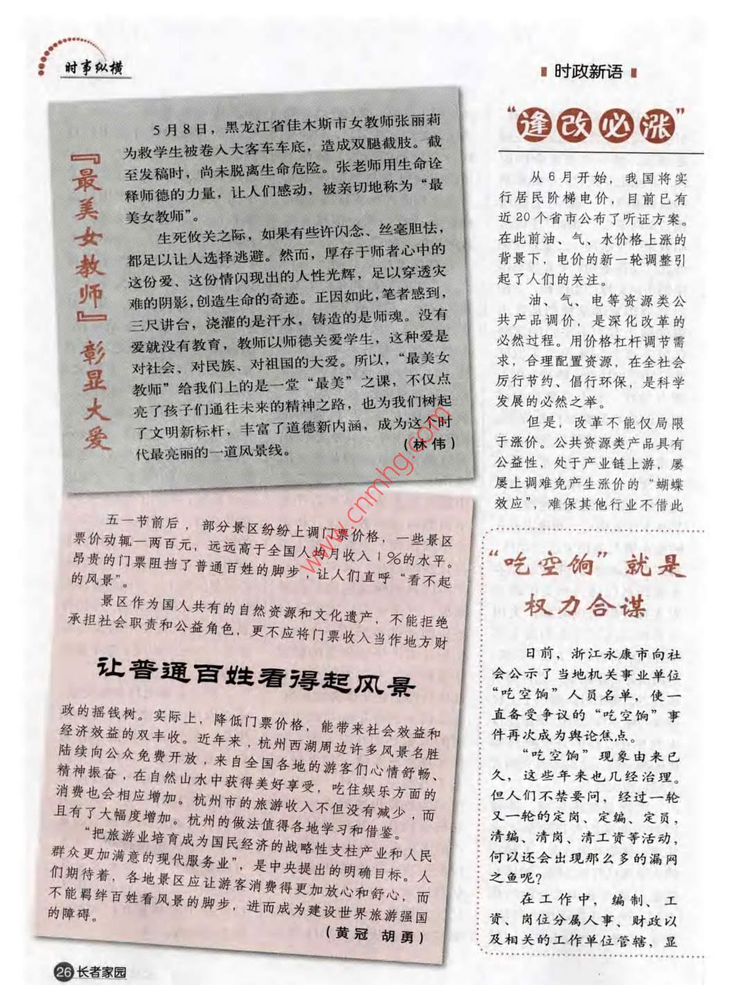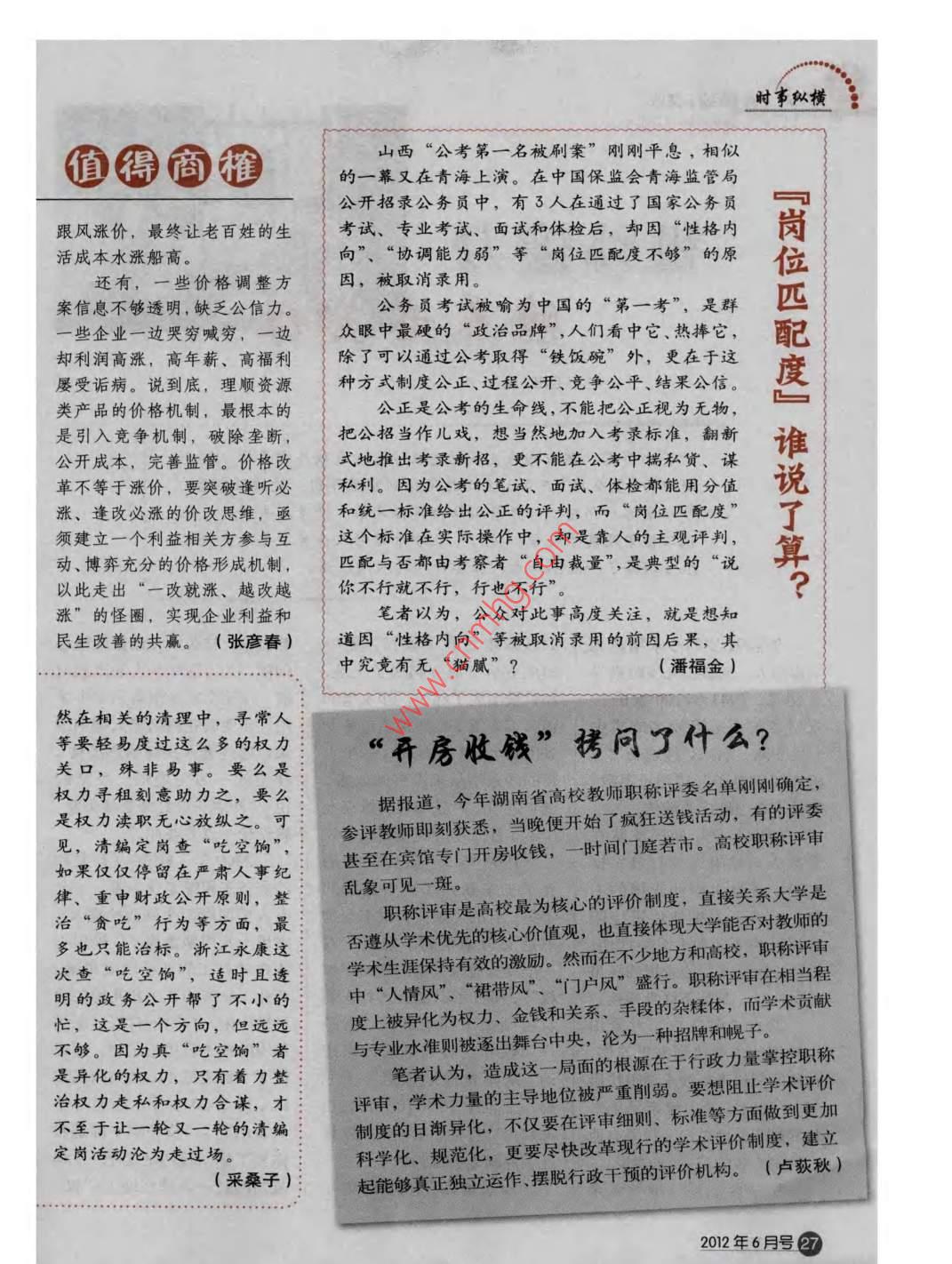 時事縱橫■時政新語5月8日,黑龍江省佳木斯市女教師張麗莉為救學生被卷入大客車車底,造成雙腿截肢截的必至發(fā)稿時,尚未脫離生命危險。張老師用生命詮釋師德的力量,讓人們感動,被親切地稱為“最從6月開始,我國將實最美女教師彰行居民階梯電價,目前已有美女教師”。生死攸關之際,如果有些許閃念、絲毫膽怯,近20個省市公布了聽證方案。在此前油、氣、水價格上漲的都足以讓人選擇逃避。然而,厚存于師者心中的背景下,電價的新一輪調整引這份愛、這份情閃現(xiàn)出的人性光輝,足以穿透災起了人們的關注。-難的陰影,創(chuàng)造生命的奇跡。正因如此,筆者感到,油、氣、電等資源類公三尺講臺,澆灌的是汗水,鑄造的是師魂。沒有共產(chǎn)品調價,是深化改革的愛就沒有教育,教師以師德關愛學生,這種愛是必然過程。用價格杠桿調節(jié)需對社會、對民族、對祖國的大愛。所以,“最美女求,合理配置資源,在全社會顯教師”給我們上的是一堂“最美”之課,不僅點厲行節(jié)約、倡行環(huán)保,是科學大亮了孩子們通往未來的精神之路,也為我們樹起發(fā)展的必然之舉。愛了文明新標桿,豐富了道德新內涵,成為這個時但是,改革不能僅局限代最亮麗的一道風景線。(林偉)于漲價。公共資源類產(chǎn)品具有公益性,處于產(chǎn)業(yè)鏈上游,屢屢上調難免產(chǎn)生漲價的“蝴蝶效應”,難保其他行業(yè)不借此五一節(jié)前后,部分景區(qū)紛紛上調門票價格,一些景區(qū)··+票價動輒一兩百元,遠遠高于全國人均月收入1%的水平昂貴的門票阻擋了普通百姓的腳步,讓人們直呼“看不起吃空餉”就是的風景”。景區(qū)作為國人共有的自然資源和文化遺產(chǎn),不能拒絕權力合諜承擔社會職責和公益角色,更不應將門票收入當作地方財讓營通百姓看得起風景日前,浙江永康市向社會公示了當?shù)貦C關事業(yè)單位吃空餉”人員名單,使政的搖錢樹。實際上,降低門票價格,能帶來社會效益和直備受爭議的“吃空餉”事經(jīng)濟效益的雙豐收。近年來,杭州西湖周邊許多風景名勝:件再次成為與論焦點陸續(xù)向公眾免費開放,來自全國各地的游客們心情舒暢、“吃空餉”現(xiàn)象由來已精神振奮,在自然山水中獲得美好享受,吃住娛樂方面的但人們不禁要問,經(jīng)過一輪久,這些年來也幾經(jīng)治理消費也會相應增加,杭州市的旅游收入不但沒有城少,而又一輪的定崗、定編、定頁且有了大幅度增加。杭州的做法值得各地學習和借鑒。“把旅游業(yè)培育成為國民經(jīng)濟的戰(zhàn)略性支柱產(chǎn)業(yè)和人民何以還會出現(xiàn)那么多的漏網(wǎng)清編、清崗、清工資等活動,群眾更加滿意的現(xiàn)代服務業(yè)”,是中央提出的明確目標。人們期待著,各地景區(qū)應讓游客消費得更加放心和舒心,而:之魚呢?不能羈絆百姓看風景的腳步,進而成為建設世界旅游強國在工作中,編制、工的障礙。資、崗位分屬人事、財政以(黃冠胡勇)及相關的工作單位管轄,顯長者家園時事縱橫逍得的通山西“公考第一名被刷案”剛剛平息,相似的一幕又在青海上演。在中國保監(jiān)會青海監(jiān)管局公開招錄公務員中,有3人在通過了國家公務員跟風漲價,最終讓老百姓的生考試、專業(yè)考試、面試和體檢后,卻因“性格內活成本水漲船高。向”、“協(xié)調能力弱”等“崗位匹配度不夠”的原還有,一些價格調整方因,被取消錄用案信息不夠透明,缺乏公信力公務員考試被喻為中國的“第一考”,是群些企業(yè)一邊哭窮喊窮,一邊眾眼中最硬的“政治品牌”,人們看中它、熱捧它,卻利潤高漲,高年薪、高福利除了可以通過公考取得“鐵飯碗”外,更在于這崗位匹配度屢受詬病。說到底,理順資源種方式制度公正、過程公開、竟爭公平、結果公信。類產(chǎn)品的價格機制,最根本的公正是公考的生命線,不能把公正視為無物,是引入竟爭機制,破除壟斷,把公招當作兒戲,想當然地加入考錄標準,翻新公開成本,完善監(jiān)管。價格改式地推出考錄新招,更不能在公考中揣私貨、謀革不等于漲價,要突破逄聽必{私利。因為公考的筆試、面試、體檢都能用分值漲、逢改必漲的價改思維,亟和統(tǒng)一標準給出公正的評判,而“崗位匹配度了須建立一個利益相關方參與互這個標準在實際操作中,卻是靠人的主觀評判動、博弈充分的價格形成機制,{匹配與否都由考察者“自由裁量”,是典型的“說算以此走出“一改就漲、越改越你不行就不行,行也不行漲”的怪圈,實現(xiàn)企業(yè)利益和筆者以為,公眾對此事高度關注,就是想知民生改善的共贏。(張彥春){道因“性格內向”等被取消錄用的前因后果,其中究竟有無“貓膩”?(潘福金然在相關的清理中,尋常人等要輕易度過這么多的權力了什么?關口,殊非易事。要么是“開房收錢”拷問權力尋租刻意助力之據(jù)報道,今年湖南省高校教師職稱評委名單剛剛確定,見,清媽定崗查“吃空的,參評教師即刻獲悉,當晚便開始了瘋狂送錢話動,有的評委是權力瀆職無心放縱之??扇绻麅H僅停留在嚴肅人事紀甚至在賓館專門開房收錢,一時間門庭若市。高校職稱評審律、重申財政公開原則,整亂象可見一斑。治“貪吃”行為等方面,最職稱評審是高校最為核心的評價制度,直接關系大學是多也只能治標。浙江永康這否遵從學術優(yōu)先