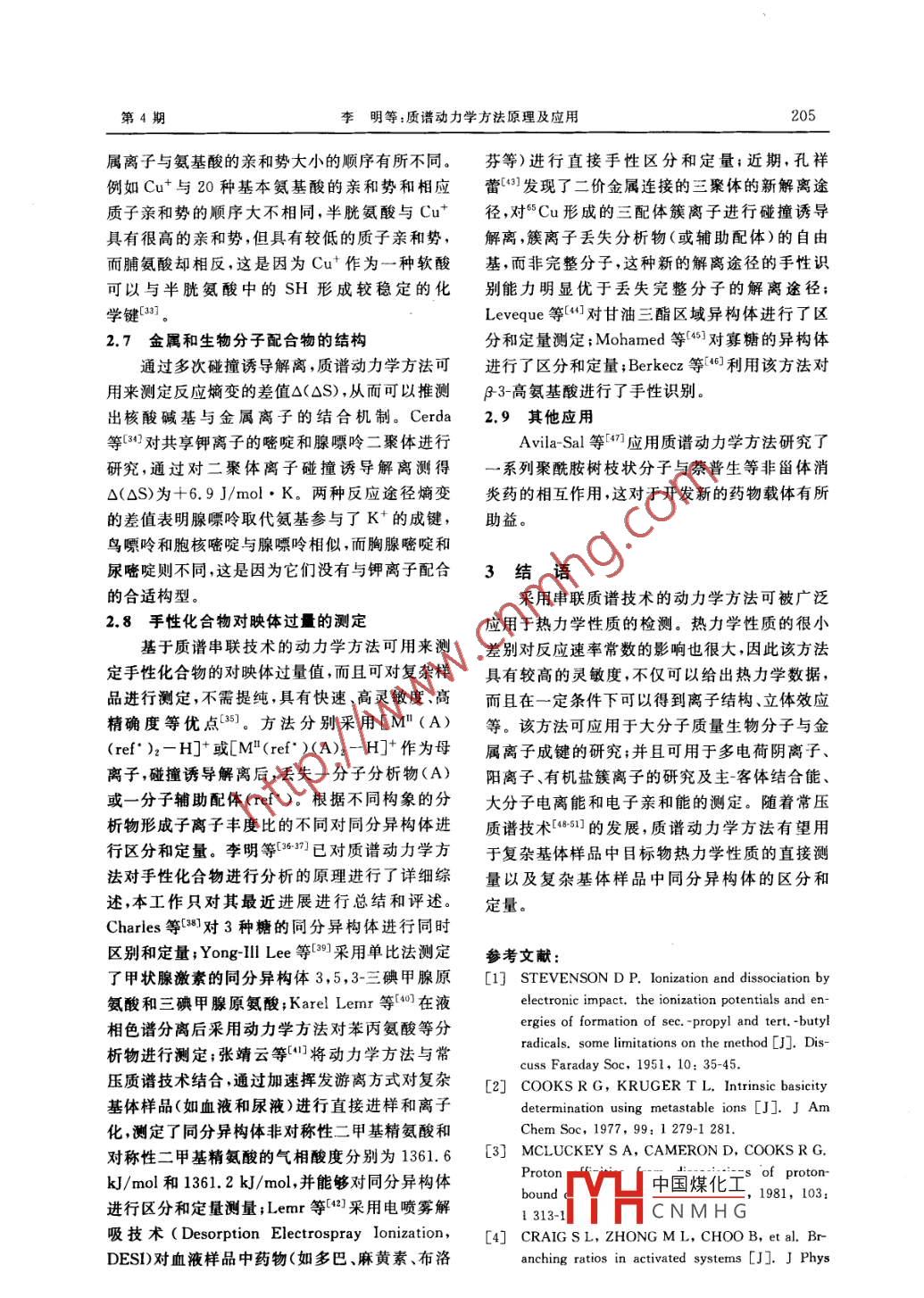 第33卷第4期質(zhì)譜學(xué)報Vol 33 No 42012年7月Journal of Chinese Mass Spectrometry SocietyJul.2012質(zhì)譜動力學(xué)方法原理及應(yīng)用李明,李紅梅,熊行創(chuàng),江游,黃澤建,方向(中國計量科學(xué)研究院,北京100013)摘要:質(zhì)譜動力學(xué)方法( Kinetic Method,簡稱KM法)是種基于經(jīng)質(zhì)量選擇的簇離子竟?fàn)幗怆x反應(yīng)速率的不同對熱力學(xué)數(shù)據(jù)進行測定的方法,由于采用串聯(lián)質(zhì)譜技術(shù),分析樣品無需純化,具有簡便、快速、靈敏等優(yōu)點。目前該方法已應(yīng)用于氣相酸堿度和質(zhì)子親合勢的測定、電子親和能的測定、電離能的測定、多電荷生物分子氣相堿度的測定、金屬離子與生物分子親和力的測定異裂離解能的測定離子結(jié)構(gòu)的檢測及對手性化合物對映體過量的測定等。本工作在介紹質(zhì)譜動力學(xué)方法原理的同時,列舉了其應(yīng)用實例,詳細(xì)地對質(zhì)譜動力學(xué)方法進行了綜合述評關(guān)鍵詞:動力學(xué)方法;簇離子;串聯(lián)質(zhì)譜;熱力學(xué)中圖分類號:O657.63文獻標(biāo)識碼:A文章編號:1004-2997(2012)04-0202-0Theory and Application of Mass Spectrometric Kinetic MethodLI Ming, LI Hong-mei, XIONG Xing-chuang, JIANG You, HUANG Ze- jian, FANG XiangNational Institute of Metrology, Beijing 100013, China)Abstract: The mass spectrometric kinetic method based on the competitive dissociations ofmass-selected cluster ions has been increasingly applied to thermochemical determinationmainly due to its simplicity, speediness and sensitivity. Because the kinetic method employstandem mass spectrometry, the compounds of interest need not be available in pure formThe kinetic method has been used to estimate gas-phase acidity and basicity and proton affinity, electron affinity, ionization energy, gas-phase basicities of multiply-charged biomolecules, metal ion affinities, heterolytic bond dissociation energies, chiral recognition andquantification. In this paper the theory of kinetic method is introduced in detail and its ap-lications are enumeratedKey words: kinetic method; cluster ion; tandem mass spectrometry thermochemistry1質(zhì)譜動力學(xué)方法的原理及發(fā)展從同一復(fù)合物碎裂得到兩個碎片的過程中,基于在質(zhì)譜學(xué)中,很早就發(fā)現(xiàn)在熱力學(xué)控制下活電離能的不同,碎裂時兩個碎片會爭奪電荷1化離子有競爭碎裂行為, Stevenson規(guī)則認(rèn)為Cooks等進行質(zhì)量分析離子動能譜( Mass ana收稿日期:201204-18;修回日期:2012-06-04基金項目:科技部儀器專項(2011YQ09000507)、中國計量科學(xué)研究院業(yè)務(wù)費(21-JB1251)資助作者簡介:李明(1979~),男(漢),吉林人,博土,從事質(zhì)譜學(xué)研究。 E-mail:中國煤化工通信作者:方向(1963~),男(漢),研究員,主要從事質(zhì)譜儀器研發(fā)工作。EmaCNMHG第4期李明等:質(zhì)譜動力學(xué)方法原理及應(yīng)用203lyzed Ion Kinetic Energy Spectrum, MIKE)Ag方程4兩邊同除以T得到方程5:研究中發(fā)現(xiàn),共享質(zhì)子的氨基酸二聚體經(jīng)質(zhì)量選△G/T=△ Hunk/Tm-△(△s)(5)擇后進行亞穩(wěn)離子解離,產(chǎn)物離子的豐度比與單以ln( k unknown/k)對△Ha作圖,曲線斜率為體的性質(zhì)有關(guān)2。在這一實驗結(jié)果的推動下,發(fā)1/(RTm)。采用不同的能量進行碰撞誘導(dǎo)解展了可獲得相對熱力學(xué)信息的定量方法一質(zhì)離,可得到不同的T,同時△G2可通過方程譜動力學(xué)方法。該方法研究的是簇離子的兩個(3)的曲線在橫軸上的截距求得。通過△G1競爭解離反應(yīng):T對1/T的作圖得到方程(5)所對應(yīng)的曲線斜率為待測物解離的焓變,在y軸上的截距為kB H +B競爭解離反應(yīng)熵變的差值。B1--H-B2BH+B2動力學(xué)方法的應(yīng)用其中k1、k2分別為兩種反應(yīng)途徑的反應(yīng)速KM法最大的優(yōu)點是具有很高的靈敏度,甚率常數(shù),忽略碎裂過程的嫡變,簇離子碎裂反應(yīng)至可以檢測到由同位素取代引起的熱力學(xué)性質(zhì)的速率與兩種反應(yīng)途徑的焓變的差值相關(guān),產(chǎn)物的細(xì)微變化。 Cooks等利用KM法對氘代乙腈豐度比的自然對數(shù)與相關(guān)熱力學(xué)值的差值成線的質(zhì)子親和勢測量結(jié)果為(18.3±1.2)kcal/性關(guān)系:mol,而乙腈的質(zhì)子親和勢為(188.2±1.2)kcal/n(k1/k2)=ln([B1H]+/[B2H]+)≈moln;另外,由于采用了串聯(lián)質(zhì)譜技術(shù),待測物ln(Q:‘/Q2)+△eoRT無需純化,同時具有快速、操作簡單等優(yōu)點,因此≈△(△G)/RT≈△(△H)/RT(2)被廣泛應(yīng)用于熱力學(xué)參數(shù)和化合物結(jié)構(gòu)的測定,這里,Q和Q2指兩種解離途徑不同過渡并且越來越多地應(yīng)用于生物分子熱力學(xué)性質(zhì)的態(tài)的配分函數(shù),△e為反應(yīng)活化能的差值,R為研究理想氣體常數(shù),Tm為有效溫度(在KM法中與2,1氣相酸堿度和質(zhì)子親和勢的測定簇離子平均內(nèi)能相關(guān)的一個參數(shù),活化簇離子的分子的氣相堿度和質(zhì)子親和勢是氣相離子內(nèi)能隨碰撞能量或碰撞氣體的壓力改變,T也化學(xué)反應(yīng)中的兩個重要參數(shù),它們直接給出分子隨之改變)Brostead酸堿性,還能提供其結(jié)構(gòu)以及活性的信質(zhì)譜動力學(xué)方法最初采用近似的形式,尤息;另外,分子氣相堿度是分子本身固有的堿度,其是關(guān)于內(nèi)能的分布(波爾茲曼分布)和忽略熵可用來闡明液相堿度順序的起因。因此研究分變的假定。方程(2)的