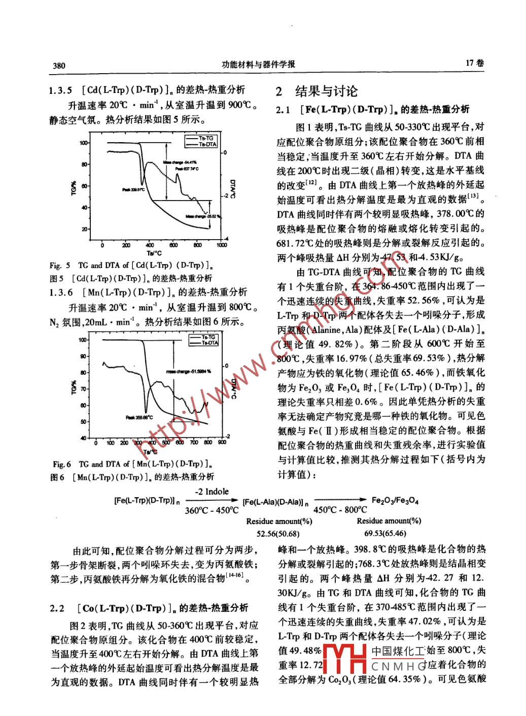 第17卷第4期功能材料與器件學(xué)報(bào)Vol. 17. No 42011年8月JOURNAL OF FUNCTIONAL MATERIALS AND DEVICESAug.,2011文章編號(hào):1007-4252(2011)04-0377-08色氨酸配位聚合物的熱重和差熱分析王建!,馬衛(wèi)興,劉瑋煒,唐麗娟2,陳龍1,李超1.淮海工學(xué)院化工學(xué)院,江蘇連云港22005;2.中國(guó)礦業(yè)大學(xué)化工學(xué)院,江蘇徐州2215)摘要:氨基酸類聚合物材料具有良好的生物相容性,可通過(guò)生物降解來(lái)調(diào)控藥物釋放。研究其性質(zhì)可為色氨酸配位聚合物材料的制備和應(yīng)用提供重要參考。對(duì)L色氨酸和鐵(Ⅱ)、鈷(Ⅱ)、鎳(Ⅱ)、鋅(Ⅱ)、鎘(Ⅱ)、錳(Ⅱ)等過(guò)渡金屬離子制備的6種M(Ⅱ)-DLTp混配型色氨酸配位聚合物進(jìn)行了熱穩(wěn)定性研究。其熱穩(wěn)定性次序符合埃文-威廉斯( Irving- Williams)規(guī)律,且這些配位聚合物中二價(jià)金屬離子半徑均≥0.6。關(guān)鍵詞:色氨酸;過(guò)渡金屬;配位聚合物;熱重分析;差熱分析中圖分類號(hào):063;TQ31;TQ46文獻(xiàn)標(biāo)識(shí)碼:ATG and dta Analysis of Tryptophan Coordination PolymersWANG Jian, MA Wei-xing, LIU Wei-wei, TANG Li-juan, CHEN Long,LI Chao(1. School of Chemical Engineering, Huaihai Institute of Technology, Lianyungang 222005, China;2. School of Chemical Engineering, China University Of Mining And Technology, Xuzhou 221116, China)Abstract: On the basis of L- Trp ligand, a series of Fe(Ⅱ),Co(Ⅱ),Ni(Ⅱ),zn(Ⅱ),Cd(Ⅱ)andMn(I)M(I)-( DL-Trp) coordination polymers were synthesized by a hydrothermal or solvent-ther-mal or mixed solvent-thermal method. The thermal stability of these coordination polymers was investigated by the thermogravimetric and differential thermal analysis. The results show that the thermal stabilityof these polymers accords with Irving-Williams law. The radiuses of these divalent metal ions in polymersare less than 0.6Key words: tryptophan; transition metals; coordination polymer; thermogravimetric analysis; differential0引言吸收醫(yī)用高分子材料為例,目前歐美國(guó)家在該領(lǐng)域?yàn)榱私鉀Q傳統(tǒng)高分子材料造成的“白色污染增長(zhǎng)迅速,年產(chǎn)值已突破500億美元。近年來(lái)基因問(wèn)題人們研制了各種可降解材料。以體內(nèi)可降解組學(xué)和蛋白組學(xué)的發(fā)展大量的蛋白、多肽類藥物相收稿日期:2010-09-20;修訂日期:2011-02-18基金項(xiàng)目:基金項(xiàng)目:江蘇省教育廳自然科學(xué)基金資助項(xiàng)目(08KJB15000);江蘇省“六大人才高峰項(xiàng)目(07-A04);江蘇省海洋生物技術(shù)重點(diǎn)建設(shè)實(shí)驗(yàn)室開(kāi)放基金項(xiàng)目(2010HS07);江蘇省海洋資源開(kāi)發(fā)中國(guó)煤化工 SIMRIOE2);淮海工學(xué)院博士科研啟動(dòng)項(xiàng)目(KQ09006)和自然科學(xué)課題(22009018)CNMHG作者簡(jiǎn)介:王建(1962),男,江蘇準(zhǔn)安人,教授博土,從事功能材料和表界面電分祈研究,Ema:wjsxhwhp@yaho.cn378功能材料與器件學(xué)報(bào)l7卷繼推向市場(chǎng)。但由于存在易受胃酸環(huán)境的破壞、胃益恒實(shí)驗(yàn)儀器有限公司。L色氨酸為生化試劑,摩腸道消化酶的降解和胃腸黏膜對(duì)大分子藥物透過(guò)吸爾鹽(NH4)2SO4·FeSO4·6H2O)和醋酸鈷(CoAc2收性難等問(wèn)題,成為該類生物技術(shù)藥物臨床應(yīng)用的4H2O)為分析純硫酸鎳(NSO4·7H2O)、ZnO和瓶頸。為此需要研制具有pH響應(yīng)性或電場(chǎng)響應(yīng)碳酸錳(MnCO3)為化學(xué)純。性的智能藥物載體。當(dāng)前采用可生物降解和生物相容性好的聚合物材料制備生物微膠囊是水凝膠藥物1:2配位聚合物[M(Ltrp)(Dtp)]的制備釋放體系的研究熱點(diǎn)之一,聚合氨基酸系列產(chǎn)品的1.2.1配位聚合物[Mn(L)(Dp)]。合成開(kāi)發(fā)也由此嶄露頭角。氨基酸中含有親水性的羧基和氨基,經(jīng)過(guò)聚合、交聯(lián)可得到具有良好的可生物降(1)Mn(ClO4)2·6H2O的制備解性高吸水材料。氨基酸類聚合物材料具有良好生以10.02g碳酸錳為原料,加少量去離子水調(diào)成物相容性,可通過(guò)生物降解來(lái)調(diào)控藥物釋放1,其糊狀。在通風(fēng)柜內(nèi)滴入70%高氯酸(約26g),同時(shí)自行降解產(chǎn)物氨基酸為人體必須,經(jīng)代謝被機(jī)體吸攪拌,直至無(wú)CO2放出,碳酸錳全部溶解為止。將收和排泄,具有許多傳統(tǒng)材料無(wú)法比擬的優(yōu)異性能。溶液置于80℃水浴中恒溫蒸發(fā)2~3天,待液面出按照自然界生物大分子模式,利用20個(gè)L型氨基酸現(xiàn)淺紅色晶體時(shí)停止加熱。室溫下放置,有大量粉來(lái)設(shè)計(jì)、合成可降解的材料,可能給研究工作帶來(lái)事紅色針狀晶體析出。抽濾,將晶體置于干燥器內(nèi)備半功倍的效果。目前,已知的成膜性好且可生物降解性高吸水材料的聚氨基酸類主要有:聚γ谷氨酸(2)[Mn(LTp)(D-T)],的合成類、聚賴氨酸類、聚天冬氨酸類4、聚精氨酸和聚稱取10mmol(0.2049g)LTrp,加入KOH(1組氨酸等。聚氨基酸材料在控釋藥物中的應(yīng)用0mmol)水溶液攪拌使之溶解,形成透明溶液。將的研究現(xiàn)已比較深人,但真正用于臨床的還較少究0.5mmol(0.1833)Mn(Cl04)2水溶液滴入上述其原因有聚合物的生產(chǎn)規(guī)模較小,品種規(guī)格不全價(jià)溶液中攪均。用稀KOH和稀高氯酸水溶液調(diào)節(jié)溶格昂貴。隨著組合化學(xué)新方法應(yīng)用于生物可降解高液酸度達(dá)到一定pH值,形成淺紅色濁液,轉(zhuǎn)入分子材料的合成設(shè)計(jì),以及適應(yīng)臨床醫(yī)學(xué)等