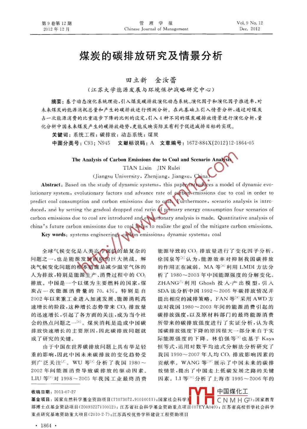 第9卷第12期管理學(xué)報(bào)Vol.9 No. 122012年12月Chinese Journal of ManagementDec. 2012煤炭的碳排放研究及情景分析田立新金汝蕾(江蘇大學(xué)能源發(fā)展與環(huán)境保護(hù)戰(zhàn)略研究中心)摘要:基于動(dòng)態(tài)演化系統(tǒng)理論,引入煤炭碳排放演化動(dòng)態(tài)系統(tǒng)、演化因子和演化因子推進(jìn)率,對(duì)未來煤炭的能源消耗總量和產(chǎn)生的碳排放進(jìn)行預(yù)測(cè)分析。在此基礎(chǔ)上引入情景分析,通過對(duì)煤炭占一次能源消費(fèi)的比重逐步下降的比例的設(shè)定,引入4種不同的煤炭碳排放情景進(jìn)行演化分析,量化分析中國未來煤炭產(chǎn)生的碳排放趨勢(shì),更能反映實(shí)際且有利于促進(jìn)減排目標(biāo)的實(shí)現(xiàn)。關(guān)鍵詞:系統(tǒng)工程;碳排放;動(dòng)態(tài)系統(tǒng);煤炭中圖分類號(hào): C93; N945文獻(xiàn)標(biāo)識(shí)碼: A文章編號(hào): 1672-884X(2012)12- 1864-05The Analysis of Carbon Emissions due to Coal and Scenario AnalysisTIAN Lixin JiN Rulei(Jiangsu University, Zhenjiang, Jiangsu, China)Abstract: Based on the study of dynamic systems, this paper introduces a model of dynamic evo-lutionary system, evolutionary factors and advance rate of carbon emissions due to coal in order topredict coal consumption and carbon emissions due to coal. Furthermore, scenario analysis is intro-duced, and by setting the gradual dropped coal ratio of primary energy consumption four scenarios ofcarbon emissions due to coal are introduced and evolutionary analysis is made. Quantitative analysis ofchina's future carbon emissions due to coal helps to realize the goal of the mitigate carbon emissions.Key words: systems engineering; carbon emissions; dynamic systems; coal全球氣候變化是人類迄今面臨的最復(fù)雜的能源導(dǎo)致的CO2排放量進(jìn)行了變化因子分析。問題之--,也是能源發(fā)展面臨的巨大挑戰(zhàn)。解徐國泉等”認(rèn)為,能源效率對(duì)抑制我國碳排放決氣候變化問題的根本措施是減少溫室氣體的的作用正在減弱。MA等[6]利用LMDI方法分人為排放,特別是能源生產(chǎn)、消費(fèi)過程中的CO2析了1980~2003年中國能源強(qiáng)度的分解變化。排放。中國是一個(gè)以煤為主要燃料的國家,煤ZHANG'利用Ghosh投人產(chǎn)出模型,引人炭占一次能源消費(fèi)量的70. 4%。特別是自SDA法分析中國1992~2005年碳排放情況并2002年以來重工業(yè)進(jìn)入加速發(fā)展、能源消耗高提出相應(yīng)的減排策略。FaN等”采用AWD方速增長的階段,這種增長態(tài)勢(shì)帶來CO2排放量法對(duì)我國1980~2003年間的能源消費(fèi)引起的的迅速增長,引起了各方面的關(guān)注,成為當(dāng)今社碳排放強(qiáng)度,以及原材料部門的最終能源消費(fèi)會(huì)的熱點(diǎn)問題之--.出。煤炭消耗是造成中國碳所帶來的碳排放強(qiáng)度進(jìn)行了實(shí)證分析,認(rèn)為我排放快速增長的主要原因,因此碳排放問題就國碳排放強(qiáng)度下降的原因很大- -部分來自于實(shí)成了研究的關(guān)鍵。際能源強(qiáng)度的下降。林伯強(qiáng)等9也基于Kaya由于中國在世界碳排放問題上具有舉足輕恒等式,運(yùn)用對(duì)數(shù)平均迪式分解法分析研究了重的影響,因此中國未來碳排放的變化趨勢(shì)受我國1990~2007年人均CO,排放影響因素的到廣泛關(guān)注生。WU等[以分析了我國1980~貢獻(xiàn)率。WANG等0展示了中國未來的碳排.2002年間能源消費(fèi)導(dǎo)致碳排放的驅(qū)動(dòng)因素。放情景.提出了中國走上低碳發(fā)展之路的關(guān)鍵LIU等[“對(duì)1998~2005 年我國工業(yè)最終消費(fèi)因素。L.1 等分析了,上海市1995~ 2006年的收稿日期: 2011-07-27中國煤化工基金項(xiàng)目:國家自然科學(xué)基金資助項(xiàng)目(71073072,91010011);國家社會(huì)科學(xué)MYHC N M H G2);國家教育部博士點(diǎn)基金資助項(xiàng)目(20093227110012);江蘇省社會(huì)科學(xué)基金資助重點(diǎn)項(xiàng)目(07EYA040);江蘇省高校哲學(xué)社會(huì)科學(xué)重點(diǎn)研究基地資助重大項(xiàng)目(2010-2-7);江蘇高校優(yōu)勢(shì)學(xué)科建設(shè)工程資助項(xiàng)目●1864●煤炭的碳排放研究及情景分析一田立新金 汝蕾碳排放情況,以此來預(yù)測(cè)上海市在2020年之前T*時(shí)期內(nèi),煤炭產(chǎn)生的碳排放演化因子隨時(shí)間的能源需求量,并對(duì)未來能源消費(fèi)和CO2排放l的變化率M(t)(即煤炭的碳排放動(dòng)態(tài)演化因進(jìn)行情景分析。以上研究都只從總體方面研究子)與M(t)成正比;與碳排放增長潛力的份額碳排放的影響因素的重要性,而未從某--個(gè)或1- MC成正比,這里的煤炭產(chǎn)生的碳排放增某一些重要的影響因素出發(fā)有針對(duì)性地研究碳長潛力受科技進(jìn)步、減排技術(shù)、碳源碳匯變化的cKM排放。盡管近年來已經(jīng)有一些學(xué)者開始嘗試專.門研究煤炭與碳排放之間的關(guān)系,例如邵帥影響;同時(shí)還與影響碳排放的政策調(diào)控、系統(tǒng)外等:田基于STIRPAT模型的上海分行業(yè)動(dòng)態(tài)面部因素、調(diào)控行為的調(diào)控函數(shù)f(t)相關(guān)。此時(shí)板數(shù)據(jù)得出煤炭消費(fèi)比重對(duì)碳排放規(guī)模和強(qiáng)度T" ={1996, 1999,2009},設(shè)Ti = 1996,Ti =均具有顯著的促進(jìn)作用。趙奧等采用EG協(xié)2009 ,調(diào)控函數(shù)f(t)為(54. 197 9t-1. 036 3X10° +r(3.948 1X10-34-整檢驗(yàn)證明碳排放強(qiá
