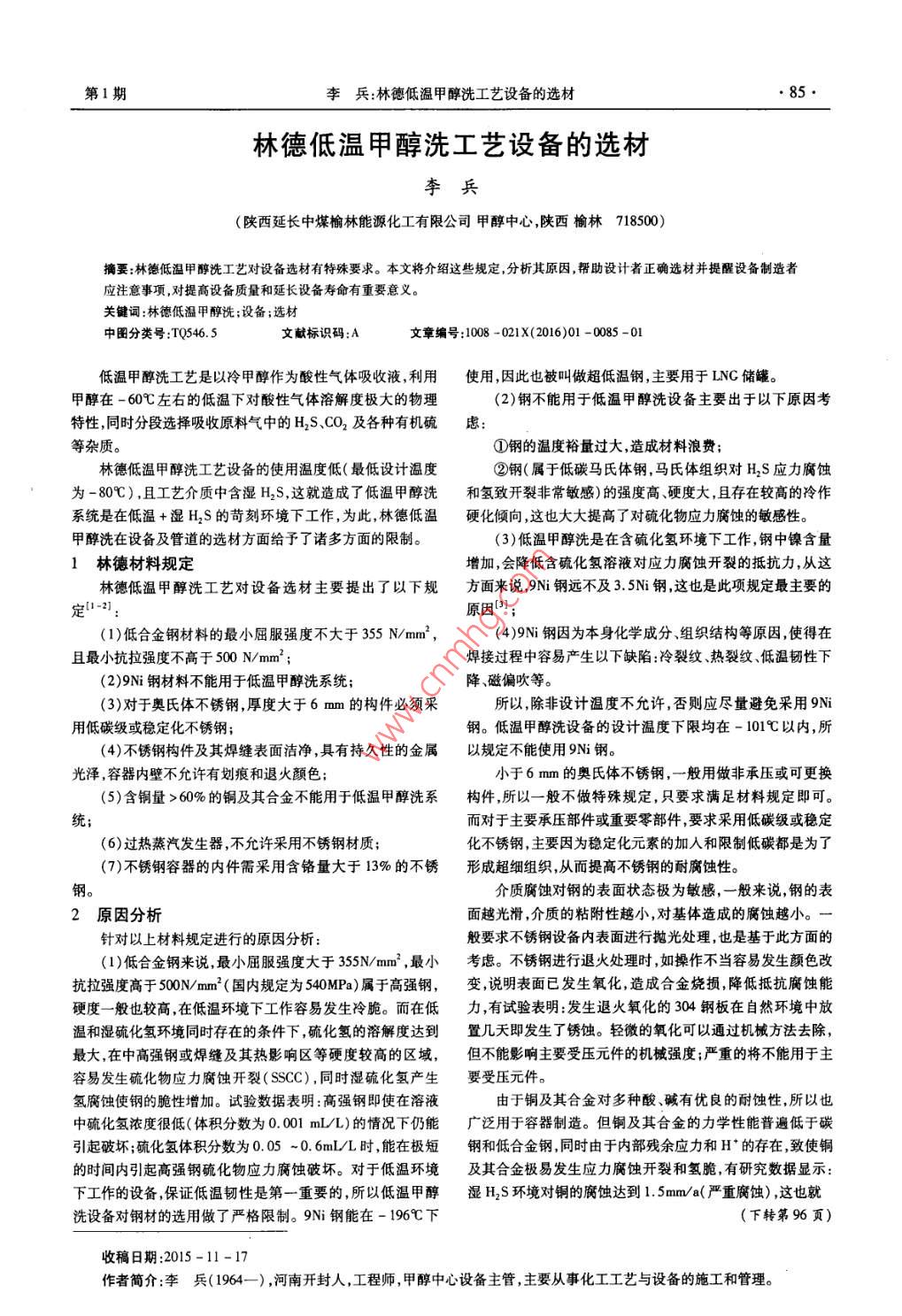 林德低溫甲醇洗工藝設(shè)備的選材
