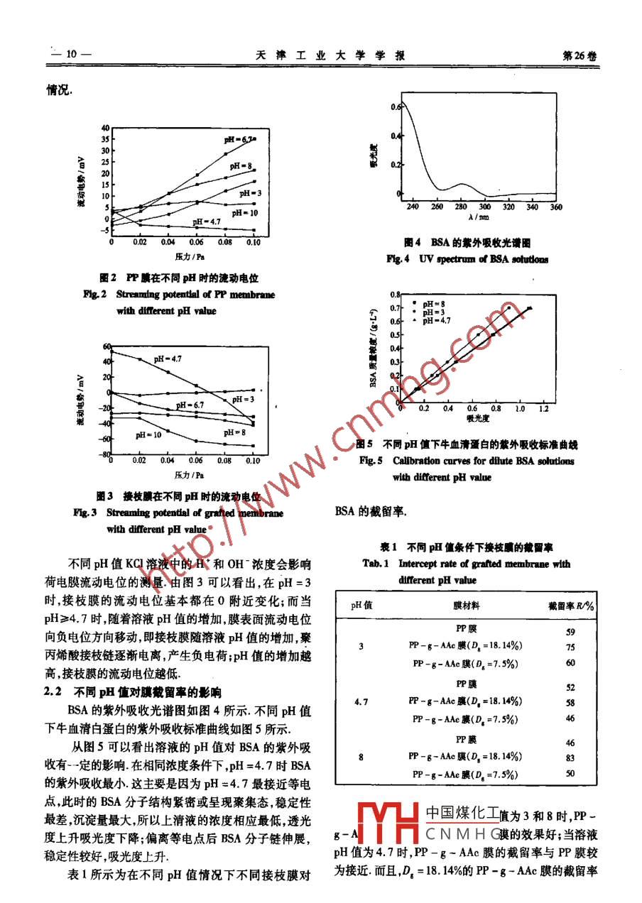 第26卷第4期天津工業(yè)大學(xué)學(xué)報(bào)Vol 26 No 42007年8月JOURNAL OF TIANJIN POLYTECHNIC UNTVERSITYAugust 2007聚丙烯接枝聚丙烯酸荷電膜的性能研究楊佳,鄭幗2,劉燕軍2(1.天津工業(yè)大學(xué)材料科學(xué)與化學(xué)工程學(xué)院,天津300160;2.天津工業(yè)大學(xué)高新技術(shù)實(shí)業(yè)公司,天津300160)摘:制備聚丙烯(PP)接枝聚丙烯酸中空纖維荷電膜,對(duì)膜表面的流動(dòng)電位進(jìn)行了分析,并用這種接枝膜對(duì)牛血清白蛋白(BSA)的吸附性能進(jìn)行了研究結(jié)果表明:接枝膜對(duì)BSA的截留率相對(duì)未改性前有明顯提高;PP膜表面呈現(xiàn)正電位,而接枝膜隨接枝率的增加,負(fù)電性逐漸增加;由于接枝膜表面接枝與BSA分子的相互作用,使BSA對(duì)接杖膜的吸附有如下規(guī)律:;pH=3>pH=4.7>pH=8.關(guān)詞:聚丙嬸中空纖膜;荷電膜;牛血清白蛋白;流動(dòng)電位中圖分類(lèi)號(hào):TS102.528.1;TQ28.8文獻(xiàn)標(biāo)識(shí)碼:A文章編號(hào):1671-024X(2007)04-0008-04Properties of polypropylene charged membranes by Ultraviolet IrradiationInduced graft copolymerizationYANG Jia, ZHENG Guo, LIU Yan-jun21. School of Material Science and Chemical Engineering, Tianjin Polytechnic University, Tianjin 300160, China; 2. HighTechnology Company, Tianjin Polytechnic University, Tianjin 300160, Chinact: The polypropylene(PP)hollow fiber charged membrane grafted by acrylic acid(AAc) is prepared to analthe streaming potential on the surface of membrane, and its intercept rate for BSA is researched. The resultshow that compared with the non- modifed one, the intercept rate of grafted membrane for BSA increases in evi-dence. PP membrane's surface is positive electricity but on the grafted membrane's surface the negative elec-tricity increases gradually with the grafted ratio increasing. By interaction of membranegrafted chain and BSAolecular, the result adsorption of BSA to grated membrane as follow, pH =3>pH=4. 7>pH=8Key words: polypropylene hollow fiber membrane; charged membrane; BSA; streaming potential膜技術(shù)目前的主要發(fā)展方向之一就是進(jìn)步開(kāi)發(fā)這類(lèi)膜流動(dòng)電位的研究揭示荷電膜操作過(guò)程中存在新型膜材料提高膜的分離性能和抗污染性能在此研的動(dòng)電現(xiàn)象分析溶質(zhì)及環(huán)境化學(xué)性質(zhì)對(duì)荷電膜分離究過(guò)程中,人們通過(guò)在膜表面引入電荷開(kāi)發(fā)出一類(lèi)新透過(guò)行為的影響,從而為荷電膜的工藝控制應(yīng)用前景型的分離膜—荷電膜由于荷正電膜的荷電特性,它提供參考可用于吸附分離廣泛存在于各種水源中的帶負(fù)電的膠體微粒細(xì)菌內(nèi)毒素等.另一方面由于它對(duì)相同電1實(shí)驗(yàn)部分性粒子有排斥作用因此可用于荷正電的氨基酸蛋白質(zhì)的分離和陰極電泳漆涂裝過(guò)程的清潔化生產(chǎn)制備1.1實(shí)驗(yàn)材料及設(shè)備荷電膜般有兩種辦法,是對(duì)現(xiàn)有的成膜進(jìn)行表面實(shí)驗(yàn)所用材料有:二苯甲酮(BP),化學(xué)純,上海天改性如化學(xué)接枝紫外線輻照接枝、y射線輻照接枝蓮精細(xì)化工有限公司產(chǎn)品;丙酮分析純天津市北方等從而在膜表面引入荷電基團(tuán);二是在成膜材料中加化玻購(gòu)銷(xiāo)中心產(chǎn)品;95%乙醇分析純天津市北方天入荷電成分然后成膜(2.本文采用紫外光接枝法對(duì)醫(yī)化學(xué)試劑廠產(chǎn)品;丙烯酸(Ac),分析純天津市佳聚丙烯中空纖維膜(PP)進(jìn)行表面接枝改性,以研究興化聚丙烯接枝聚丙稀酸微濾膜的分離特性同時(shí)通過(guò)對(duì)(BSYH中國(guó)煤化工“品;牛血清臼蛋白CNMH永純天津市血液研收稿日期:2006-10-30作者簡(jiǎn)介:楊佳(1982-)女碩士研究生;鄭幗(1957-),女教授導(dǎo)師Emil:zhengguo@ipu,cdm.cn第4期楊佳,等聚丙烯接枝秦丙烯酸荷電膜的性能研究9究所產(chǎn)品;實(shí)驗(yàn)用水,經(jīng)過(guò)二次RO膜處理用水;聚丙調(diào)節(jié)閥改變膜兩側(cè)壓差保持流量不變,待流量、電位烯中空纖維膜(PP膜),孔徑為0.2~0.4μm,孔隙率等穩(wěn)定后分別記下體相溶液電導(dǎo)率、壓力表和電位讀50%~60%,天津市海水淡化研究所產(chǎn)品數(shù);重復(fù)上述步驟,一般測(cè)6~7個(gè)值以低壓向高壓逐實(shí)驗(yàn)所用設(shè)備有:D9205型數(shù)字萬(wàn)用表,深圳福漸升壓的測(cè)定順序分別測(cè)定不同壓力下膜的流動(dòng)電克儀器有限公司產(chǎn)品;D-100型分析天平,北京光學(xué)位測(cè)定完畢后用常溫純水沖洗整套流程,關(guān)閉閥儀器廠產(chǎn)品;pH-25型pH計(jì),上海雷磁儀器廠產(chǎn)品;測(cè)定液為0.1mmo/L氯化鉀電解質(zhì)溶液測(cè)試溫756MC型紫外可見(jiàn)光分光光度計(jì),上海第三分析儀器度為(25±2)℃,錯(cuò)流速度為200Lh廠產(chǎn)品;膜性能測(cè)試儀,自制1.3.2不同pH值下截留率的測(cè)定12材料制備配置濃度為0.8g/L的牛血清白蛋白(BsA)水溶(1)荷電膜制備將聚丙烯中空纖維膜用丙酮溶液,將澆注好的膜組件事先在乙醇一水溶液中浸泡液處理,干燥后置于質(zhì)量分?jǐn)?shù)為6%~8%的二苯甲酮30min左右取出,用蒸餾水反復(fù)洗滌浸泡備用測(cè)試前(BP)丙酮溶液中浸泡12h“,然后取出自然干燥將用蒸餾水反復(fù)循環(huán)沖洗膜性能測(cè)試儀待沖洗干凈后涂有光敏劑(BP)的P膜與一定濃度的AAc、乙醇一放入BSA水溶液中預(yù)過(guò)濾20mn,然后開(kāi)始計(jì)時(shí)過(guò)水溶液放人石英盤(pán)內(nèi),置于功率為1000W