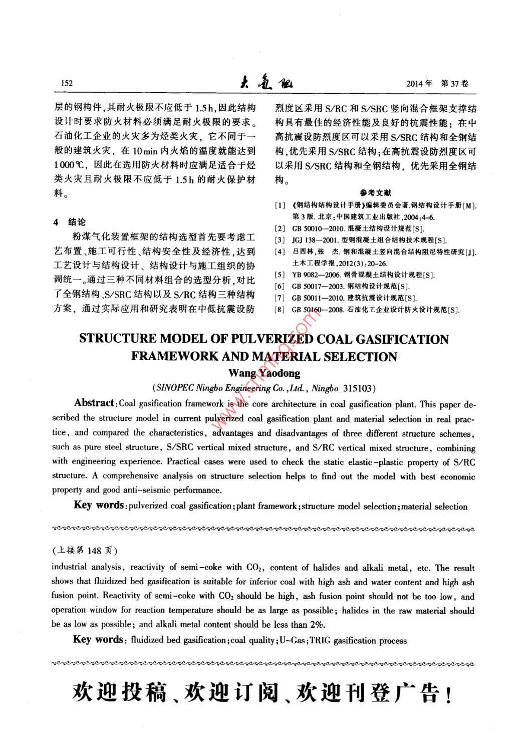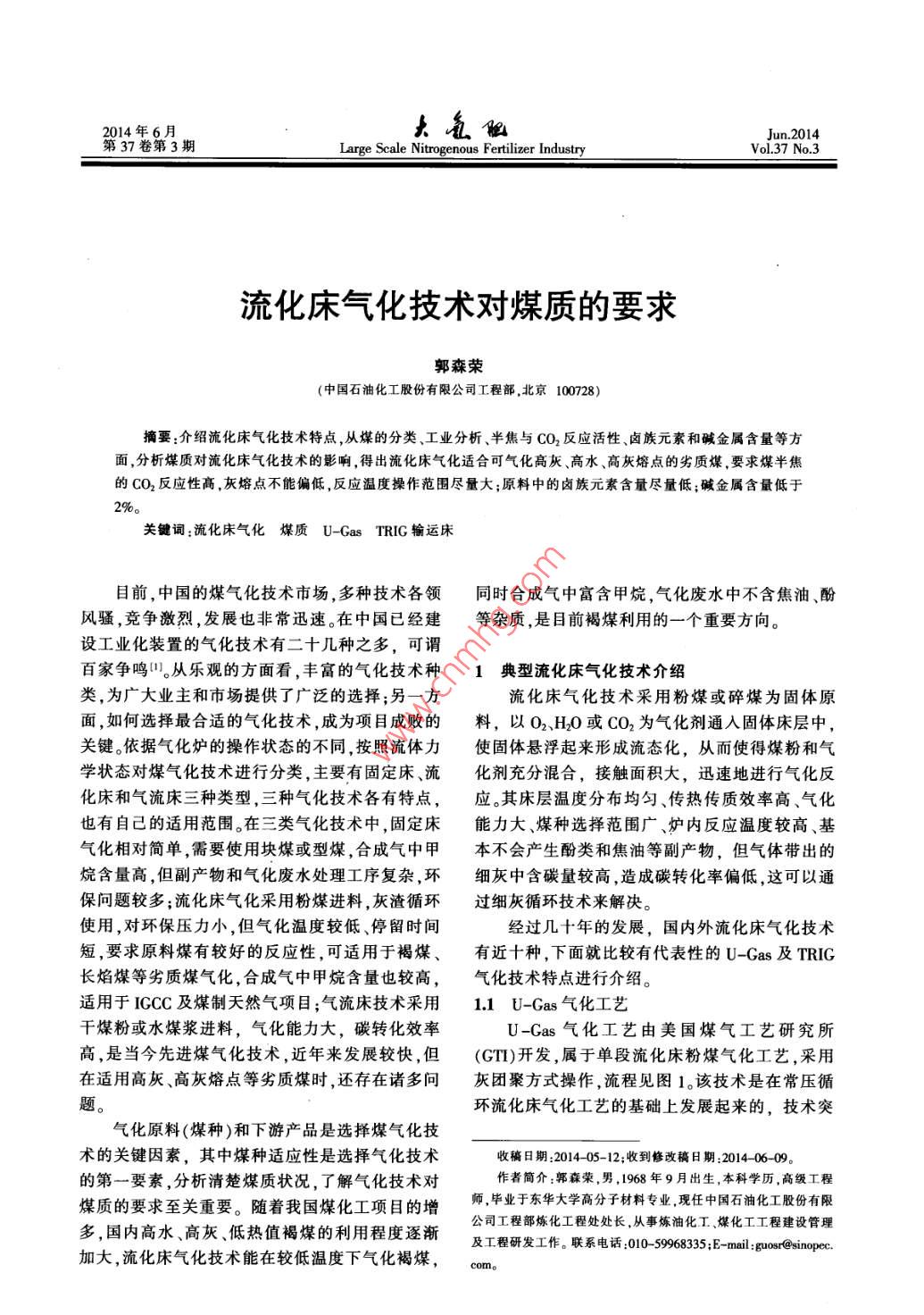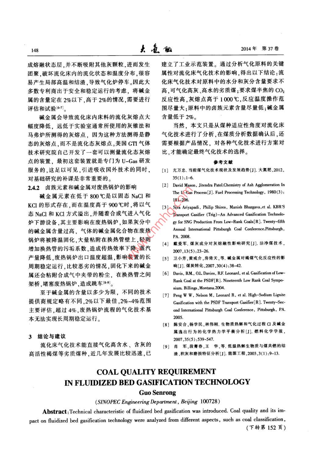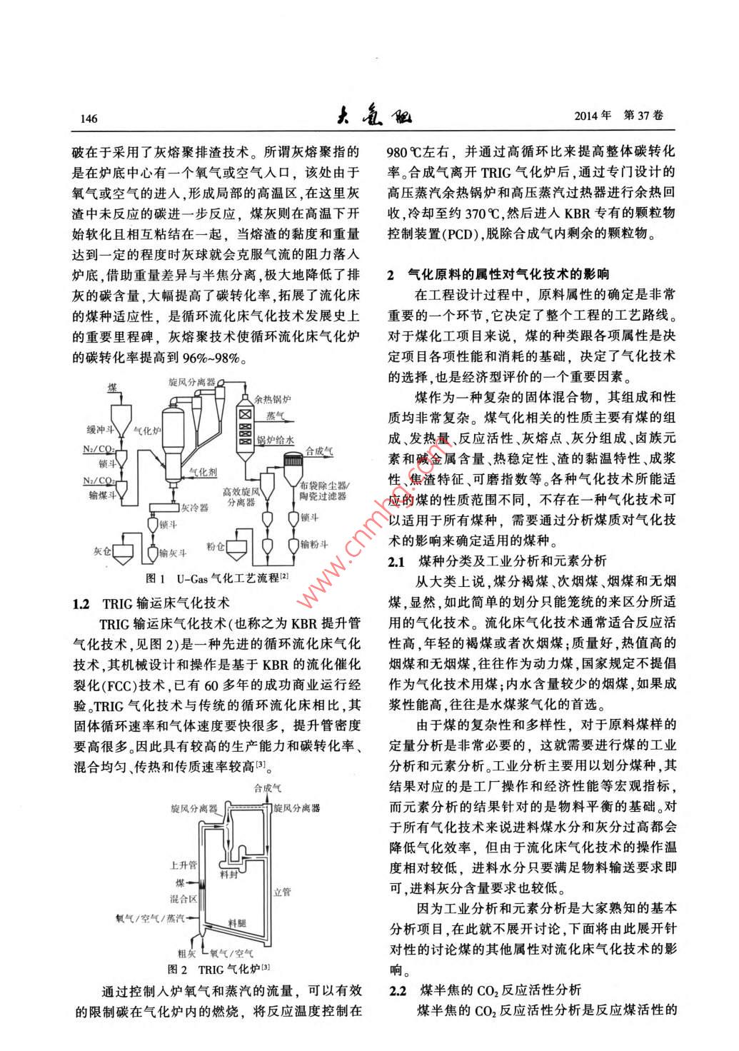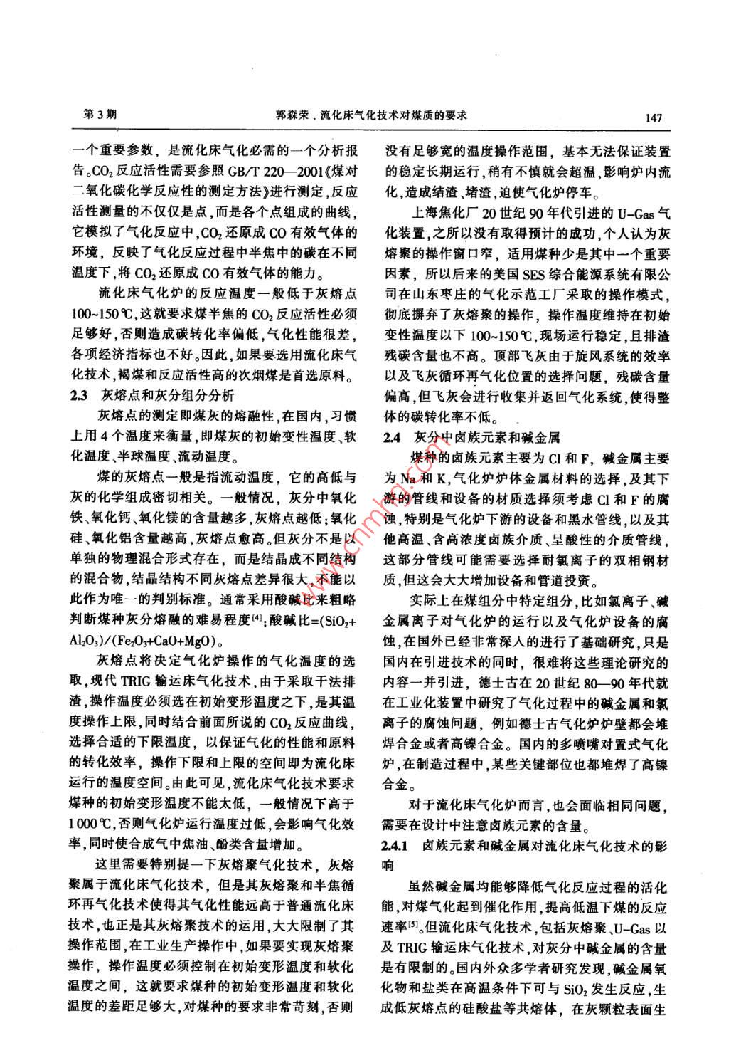 1462014年第37卷破在于采用了灰熔聚排渣技術(shù)。所謂灰熔聚指的980%左右,并通過高循環(huán)比來提高整體碳轉(zhuǎn)化是在爐底中心有一個氧氣或空氣人口,該處由于率。合成氣離開TRIG氣化爐后,通過專門設(shè)計的氧氣或空氣的進(jìn)入,形成局部的高溫區(qū),在這里灰高壓蒸汽余熱鍋爐和高壓蒸汽過熱器進(jìn)行余熱回渣中未反應(yīng)的碳進(jìn)一步反應(yīng), 煤灰則在高溫下開收 ,冷卻至約370C,然后進(jìn)人KBR專有的顆粒物始軟化且相互粘結(jié)在一起,當(dāng)熔渣的黏度和重量控制裝置(PCD),脫除合成氣內(nèi)剩余的顆粒物。達(dá)到一.定的程度時灰球就會克服氣流的阻力落人爐底,借助重量差異與半焦分離,極大地降低了排2氣化原料的屬 性對氣化技術(shù)的影響灰的碳含量,大幅提高了碳轉(zhuǎn)化率,拓展了流化床在工程設(shè)計過程中,原料屬性的確定是非常的煤種適應(yīng)性,是循環(huán)流化床氣化技術(shù)發(fā)展史上重要的-一個環(huán)節(jié),它決定了整個工程的工藝路線。的重要里程碑,灰熔聚技術(shù)使循環(huán)流化床氣化爐對于煤化工項(xiàng)目來說,煤的種類跟各項(xiàng)屬性是決的碳轉(zhuǎn)化率提高到96%~98%。定項(xiàng)目各項(xiàng)性能和消耗的基礎(chǔ),決定了氣化技術(shù)的選擇,也是經(jīng)濟(jì)型評價的一一個重要因素。旋風(fēng)分當(dāng)8- ]A余熱鍋爐煤作為一種復(fù)雜的固體混合物,其組成和性圖氣質(zhì)均非常復(fù)雜。煤氣化相關(guān)的性質(zhì)主要有煤的組緩沖斗氣化爐鍋爐給水成、發(fā)熱量、反應(yīng)活性、灰熔點(diǎn)、灰分組成、鹵族元N:/CO2-t合成氣:鎖斗↓素和堿金屬含量、熱穩(wěn)定性、渣的黏溫特性、成漿氣化劑N:/CO-高效旋風(fēng)布袋除塵器/性、焦渣特征、可磨指數(shù)等。各種氣化技術(shù)所能適輸煤斗Y .陶瓷過濾器應(yīng)的煤的性質(zhì)范圍不同,不存在一種氣化技術(shù)可門實(shí)冷器 分離器領(lǐng)斗Q鎖斗以適用于所有煤種,需要通過分析煤質(zhì)對氣化技術(shù)的影響來確定適用的煤種?;覀}口凸|輸領(lǐng)斗.輪安只館粉斗2.1煤種分類及工業(yè)分析和元素分析圖1 U-Gas氣化工藝流程21從大類上說,煤分褐煤、次煙煤、煙煤和無煙1.2 TRIG輸運(yùn)床氣化技術(shù)煤,顯然,如此簡單的劃分只能籠統(tǒng)的來區(qū)分所適TRIG輸運(yùn)床氣化技術(shù)(也稱之為KBR提升管用的氣化技術(shù)。流化床氣化技術(shù)通常適合反應(yīng)活氣化技術(shù),見圖2)是一種先進(jìn)的循環(huán)流化床氣化性高,年輕的褐煤或者次煙煤;質(zhì)量好,熱值高的技術(shù),其機(jī)械設(shè)計和操作是基于KBR的流化催化煙煤和無煙煤,往往作為動力煤,國家規(guī)定不提倡裂化(FCC)技術(shù),已有60多年的成功商業(yè)運(yùn)行經(jīng)作為氣化技術(shù)用煤;內(nèi)水含量較少的煙煤,如果成驗(yàn).TRIC氣化技術(shù)與傳統(tǒng)的循環(huán)流化床相比,其漿性能高,往往是水煤漿氣化的首選。固體循環(huán)速率和氣體速度要快很多,提升管密度由于煤的復(fù)雜性和多樣性,對于原料煤樣的要高很多。因此具有較高的生產(chǎn)能力和碳轉(zhuǎn)化率、定量分析是非常必要的,這就需要進(jìn)行煤的工業(yè)混合均勻、傳熱和傳質(zhì)速率較高3。分析和元素分析。工業(yè)分析主要用以劃分煤種,其合成氣結(jié)果對應(yīng)的是工廠操作和經(jīng)濟(jì)性能等宏觀指標(biāo),旋風(fēng)分離器力旋風(fēng)分離器而元素分析的結(jié)果針對的是物料平衡的基礎(chǔ)。對于所有氣化技術(shù)來說進(jìn)料煤水分和灰分過高都會降低氣化效率,但由于流化床氣化技術(shù)的操作溫上升管度相對較低,進(jìn)料水分只要滿足物料輸送要求即煤一料封立管可,進(jìn)料灰分含量要求也較低?;旌蠀^(qū)因?yàn)楣I(yè)分析和元素分析是大家熟知的基本氧氣/空氣/燕汽一料腿分析項(xiàng)目,在此就不展開討論,下面將由此展開針粗灰L氧氣/空氣對性的討論煤的其他屬性對流化床氣化技術(shù)的影圖2 TRIC 氣化爐3]響。通過控制人爐氧氣和蒸汽的流量,可以有效2.2 煤半焦的CO2反應(yīng)活性分析的限制碳在氣化爐內(nèi)的燃燒,將反應(yīng)溫度控制在煤半焦的CO2反應(yīng)活性分析是反應(yīng)煤活性的第3期郭森榮.流化床氣化技術(shù)對煤質(zhì)的要求147- -個重要參數(shù),是流化床氣化必需的一個分析報沒有足夠?qū)挼臏囟炔僮鞣秶緹o法保證裝置告.CO2反應(yīng)活性需要參照CB/T 220- 2001《煤對的穩(wěn)定長期運(yùn)行,稍有不慎就會超溫,影響爐內(nèi)流二氧化碳化學(xué)反應(yīng)性的測定方法》進(jìn)行測定,反應(yīng)化,造成結(jié)渣、堵渣,迫使氣化爐停車?;钚詼y量的不僅僅是點(diǎn),而是各個點(diǎn)組成的曲線,上海焦化廠20世紀(jì)90年代引進(jìn)的U_ -Gas氣它模擬了氣化反應(yīng)中,CO2還原成co有效氣體的化裝置,之所以沒有取得預(yù)計的成功,個人認(rèn)為灰環(huán)境,反映了氣化反應(yīng)過程中半焦中的碳在不同熔聚的操作窗口窄,適用煤種少是其中一個重要溫度下,將CO2還原成CO有效氣體的能力。因素,所以后來的美國SES綜合能源系統(tǒng)有限公流化床氣化爐的反應(yīng)溫度一般低于灰熔點(diǎn)司在山東棗莊的氣化示范工廠^采取的操作模式,100~150C,這就要求煤半焦的CO2反應(yīng)活性必須徹