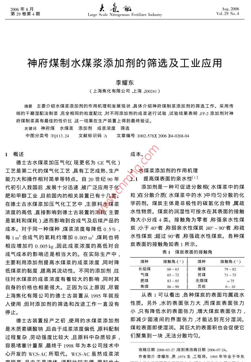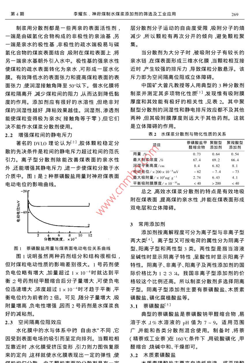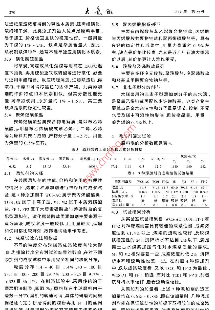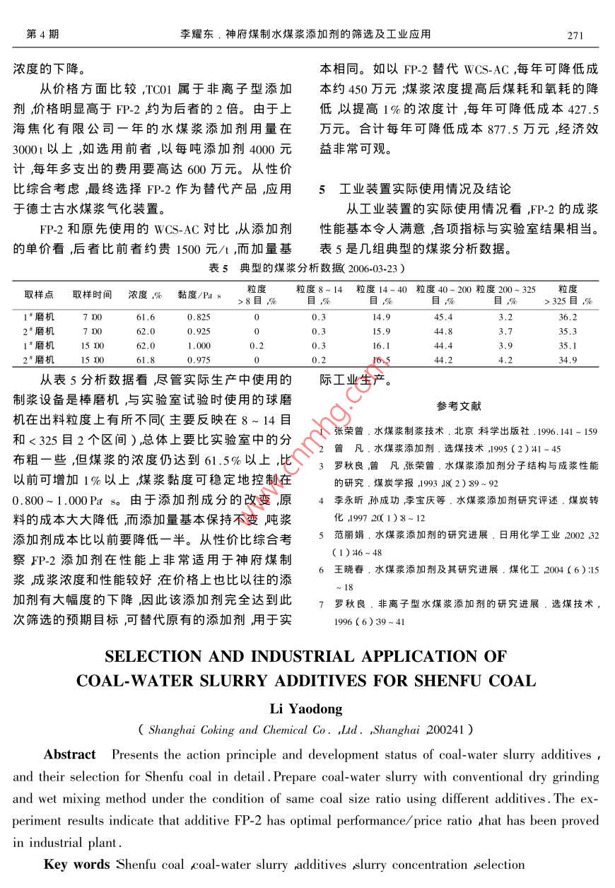 2006年8月Aug.2006第29卷第4期arge Scale Nitrogenous Fertilizer IndustryVol, 29 No, 4神府煤制水煤漿添加劑的篩選及工業(yè)應(yīng)用李耀東上海焦化有限公司,上海200241)擴(kuò)要主要介紹水煤漿添加劑的作用機(jī)理和發(fā)展現(xiàn)狀具體介紹神府煤制漿添加劑的篩選工作。采用傳統(tǒng)的干磨濕配法制漿完全相同的粒度配比對(duì)不同添加劑的成漿進(jìn)行試驗(yàn)試驗(yàn)結(jié)果表明,FP-2添加劑對(duì)神府煤制漿具有最佳的性價(jià)比這一結(jié)果在生產(chǎn)裝置上得到最終驗(yàn)證。關(guān)鍵詞神府煤水煤漿添加劑成漿濃度篩選中圖分類號(hào):Q113.24文獻(xiàn)標(biāo)識(shí)碼:A文章編號(hào)1002-5782006)40268-04概述成本德士古水煤漿加壓氣化(現(xiàn)更名為CE氣化)工藝是第二代的煤氣化工藝具有工藝成熟、生產(chǎn)2水煤漿添加劑的作用機(jī)理能力大和操作相對(duì)簡(jiǎn)單等特點(diǎn)。自20世紀(jì)90年2.1提高煤表面的親水性1代初引入我國(guó)后發(fā)展十分迅速被廣泛應(yīng)用于化添加劑是一種可促進(jìn)分散相(水煤漿中的煤肥和甲醇工業(yè)目前國(guó)內(nèi)的相關(guān)裝置已有十幾套。粒在分散介質(zhì)(水煤漿中的水)中均勻分散的化在德土古水煤漿加壓氣化工藝中,主原料水煤漿學(xué)藥劑。煤炭主體是非極性的碳?xì)浠衔?屬疏濃度的高低直接影響到德士古裝置的消耗主要水性物質(zhì)。煤炭的潤(rùn)濕性可按水在其表面的接觸是氧耗和煤耗)進(jìn)而影響到合成氣及后續(xù)產(chǎn)品的角大小分成4類。接觸角為零者稱強(qiáng)親水性煤某成本。對(duì)于同一種煤種煤漿濃度每降低0.5%,炭小于40者稱弱親水性煤炭A0°~90者稱疏每1m合成氣的氧耗約增加o.005m3煤耗也將水性煤炭超過(guò)90者稱強(qiáng)疏水性煤炭。各種煤相應(yīng)增加約0.00kg因此成漿濃度的高低對(duì)合炭表面的接觸角如表1所示。成氣成本的影響還是相當(dāng)大的。在實(shí)際生產(chǎn)中表1煤炭表面的接觸角主要利用添加劑提高水煤漿的成漿濃度同時(shí)降煤種接觸角(°)煤種接觸角(°)低煤漿的黏度提高其流動(dòng)性。不同的添加劑往長(zhǎng)焰煤瘦煤貧煤往對(duì)水煤漿的成漿濃度有著較大的影響同時(shí)其肥煤無(wú)煙煤自身的價(jià)格也相差很大。正因?yàn)橐陨显虮M管86~90上海焦化有限公司的德士古裝置從1995年就投從表1可以看出,各種煤炭的表面均屬疏水入使用但對(duì)添加劑的篩選和改進(jìn)工作一直沒(méi)有性質(zhì)。另外,水的表面張力大,而煤炭表面張力停止。小,只有降低水的表面張力增大煤炭表面張力德士古裝置投產(chǎn)之初使用的水煤漿添加劑即減少固液間的界面張力,才能達(dá)到充分濕潤(rùn)是木質(zhì)素磺酸鈉后由于成漿濃度偏低原料配制煤某粒表面即使?jié)駶?rùn)。其巨大的表面積也會(huì)促使它過(guò)程復(fù)雜勞動(dòng)強(qiáng)度比較大且原料中雜質(zhì)較多,們聚集到一塊無(wú)法分散均勻容易堵塞計(jì)量泵最終于1998年為本公司技術(shù)中心開(kāi)發(fā)的WCS-AC所取代。WCS-AC雖然成漿濃收稿日期2006-03-27到修改稿日期2006-07-24。作者簡(jiǎn)介李耀東男,1974生工程師。1995年畢業(yè)于華東第4期李耀東,神府煤制水煤漿添加劑的篩選及工業(yè)應(yīng)用269制漿用分散劑都是一些兩親的表面活性劑,層分散劑分子運(yùn)動(dòng)的自由度受限吸附分子的熵端是由碳?xì)浠衔飿?gòu)成的非極性的親油基,另減少,所以顆粒有再次分開(kāi)的傾向避免顆粒聚端是親水的極性基,非極性的疏水端極易與碳集。氫化合物的煤炭表面結(jié)合吸附在煤粒表面上將當(dāng)分散劑為大分子時(shí)被吸附分子有較長(zhǎng)的另一端親水基朝外引入水中。極性基的強(qiáng)親水性親水鏈在煤表面形成三維水化膜當(dāng)顆粒相互接使煤粒的疏水表面轉(zhuǎn)化為親水,可形成一層水化近時(shí)產(chǎn)生較強(qiáng)的排斥力導(dǎo)致煤粒分散懸浮。該膜。有效降低水的表面張力和提高煤粒表面的表斥力即為空間隔離位阻或立體障礙。面張力使?jié)櫇窠佑|角降至50以下。借水化膜將中國(guó)礦大曾凡教授等人用典型的3種分散劑煤粒隔離開(kāi)減少煤粒間的阻力從而達(dá)到降低黏制漿并測(cè)定其多項(xiàng)物化性質(zhì)31發(fā)現(xiàn)惟有吸附膜度的作用。添加劑應(yīng)有很好的水溶性但絕非對(duì)厚度和其效能有極好的相關(guān)性,見(jiàn)表2。其中聚煤的潤(rùn)濕性越好降粘效果越佳。潤(rùn)濕劑、滲透劑醚型分散劑的潤(rùn)濕性和靜電排斥效應(yīng)都不及其他能使煤粒變得極為親水(接觸角等于零),但它們兩種但其吸附膜厚度則遠(yuǎn)大于其他藥劑。這就決不能作水煤漿分散劑使用。是立體障礙的作用2.2增強(qiáng)煤粒間的靜電斥力表2水煤漿分散劑與物化性質(zhì)的關(guān)系著名的DVLO理論認(rèn)為21,膠體顆粒穩(wěn)定分項(xiàng)目萘磺酸鹽甲聚醚型聚羧酸型醛縮合物添加劑添加劑散的先決條件是粒間的靜電斥力超過(guò)粒間的范氏用量,%64引力。離子型分散劑除能改善煤表面的親水性最大制漿濃度,%67.4外還能增強(qiáng)其靜電斥力進(jìn)一步使煤粒分散于水潤(rùn)濕平衡高度/cm電動(dòng)電位/×200×10-6mV介質(zhì)中。圖1是2種萘磺酸鹽用量對(duì)神府煤表面最大吸附量/×10mgg-16,43電動(dòng)電位的影響曲線平