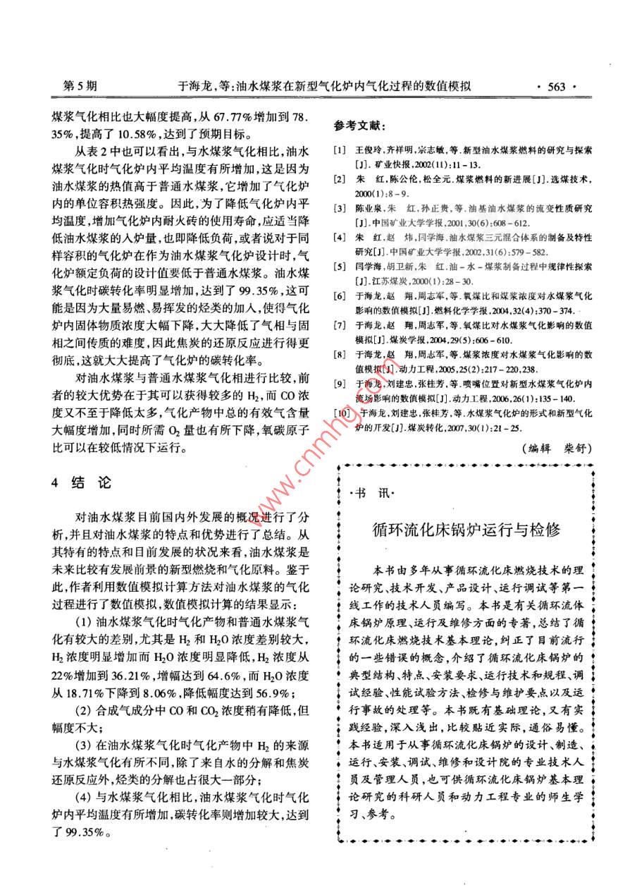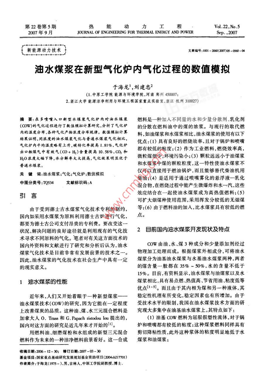 第22卷第5期熱能動(dòng)力工程Vol.22,No.52007年9月JOURNAL OF ENGINEERING FOR THERMAL ENERCY AND POWERSep. ,2007新能源動(dòng)力技術(shù) 子文章編號(hào):1001 - 20200)050 -0560-04油水煤漿在新型氣化爐內(nèi)氣化過程的數(shù)值模擬于海龍' ,劉建忠2(1.中原工學(xué)院能源與環(huán)境學(xué)院,河南鄭州450007;2.浙江大學(xué)能源潔凈利用與環(huán)境工程國(guó)家重點(diǎn)實(shí)驗(yàn)室,浙江杭州310027)摘要:在多噴嘴入口新型水煤漿氣化爐內(nèi)對(duì)油水煤漿燃料是一種加入不同量的水和少量分散劑、乳化劑(COW)的氣化過程進(jìn)行了數(shù)值模擬計(jì)算研究,分析了氣化爐的分散在燃料油中的煤的濃漿。與現(xiàn)行的取代燃內(nèi)的溫度分布、各種氣化產(chǎn)物濃度分布規(guī)律。數(shù)值模擬計(jì)算料,如油煤漿和水煤漿相比,油水煤漿的使用有以下結(jié)果證明,同濃度的油水謀漿氣化與普通水煤漿氣化相比,優(yōu)點(diǎn):(1)具有良好的燃燒效率,且對(duì)于鍋爐和噴嘴氣化爐內(nèi)平均溫度略有上升,碳轉(zhuǎn)化率提高1.81%.氣化爐都有較低的粘度;(2)作為工業(yè)燃料,燃燒效率高,出口粗煤氣中有效氣(C0+ H)含量提高10. 58%,CO2和微粒煤煙少,環(huán)境污染小;(3)顆粒遠(yuǎn)遠(yuǎn)小于油煤漿H20濃度大幅下降,水分解率大大提高,氣化效果明顯優(yōu)于和水煤漿中煤的顆粒粒度,這--特性使油水煤漿不普通水煤漿。僅可以直接用于燃油鍋爐,而且能夠替代柴油機(jī)用關(guān)鍵詞:油水煤漿;氣化;氣化爐;數(shù)值模擬柴油;(4)是適用于通過噴嘴霧化的懸浮液一乳化中圖分類號(hào):TQ534文獻(xiàn)標(biāo)識(shí)碼:A混合物,在燃燒過程中能產(chǎn)生微爆炸和水-汽,這些效應(yīng)結(jié)合在一起使油水煤漿成為高熱值燃料;(5)引言可擴(kuò)大煙煤種使用范圍,采用揮發(fā)分較低的無煙煤由于受到德士古水煤漿氣化技術(shù)專利的制約,等;(6)由于燃料油的加入,比水煤漿具有較低的燃國(guó)內(nèi)如采用水煤漿為原料利用德士古爐進(jìn)行氣化,點(diǎn)。都要為德士古公司支付昂貴的專利費(fèi)。要改變這一狀況,解決問題的良好途徑就是利用現(xiàn)有的氣化技2目前國(guó)內(nèi)油水煤漿開發(fā) 現(xiàn)狀及特點(diǎn)術(shù)尋求不同原料的氣化。筆者對(duì)有關(guān)這方面技術(shù)的國(guó)內(nèi)外資料和文獻(xiàn)進(jìn)行了研究和分析后認(rèn)為,油水CoW由油、水、煤3種成分和少量添加劑經(jīng)過煤漿氣化技術(shù)是目前非常有發(fā)展前景的技術(shù)之一。物理加工處理而成。根據(jù)煤漿外相成分,可將油水因此,油水煤漿的氣化技術(shù)在社會(huì)生產(chǎn)中具有一定煤漿分為油基油水煤漿與水基油水煤漿兩種,兩者的現(xiàn)實(shí)意義。的煤含量一般都在35% ~ 50%,水的含量不低于15%。目前,有資料顯示,油水煤漿與油煤漿以及水1油水煤漿的性能煤漿相比,具有易點(diǎn)燃、熱值高、節(jié)省用油、粘度低等優(yōu)點(diǎn)[1-5]。而且由于其內(nèi)相為煤和另-一種液體,其近年來,人們又開始著眼于一種新型煤漿一穩(wěn)定性機(jī)理有所變化,穩(wěn)定因素也有所增加。由于油水煤漿技術(shù)(COW)的研究,因?yàn)樗茉? -定程度受技術(shù)水平的限制,我國(guó)在油水煤漿技術(shù)方面的研上改善煤炭的品質(zhì)。這種油、煤、水三元混合燃料是究現(xiàn)大多集中在油基油水煤漿上,其特點(diǎn)如下:加拿大人0. Trass 和G. Papach ristodou lou提出的,(1)油基CoW燃料為屈服假塑性流體,對(duì)于鍋國(guó)內(nèi)對(duì)這方面的研究是近幾年來才開始的"。爐和噴嘴都有較低的粘度;這種煤漿燃料同樣具有用燃料油、細(xì)磨煤粉和水組成的新型三元混合剪切降粘性質(zhì),此外這種漿體的粘度明顯地低于水燃料作為未來的一種潔凈燃料前景看好。這合成煤漿和油煤漿;收稿日期:2006-12-30;修訂日期:2007-03-30基金項(xiàng)目:國(guó)家重點(diǎn)基礎(chǔ)研究發(fā)展規(guī)劃基金資助項(xiàng)目20021770)作者簡(jiǎn)介:于海龍(1975- ),男,吉林人,中原工學(xué)院副教授,博士.第5期于海龍,等:油水煤漿在新型氣化爐內(nèi)氣化過程的數(shù)值模擬●561●(2)油基油水煤漿的燃點(diǎn)較水煤漿低,實(shí)驗(yàn)所煤漿氣化爐爐內(nèi)三維空間。氣化爐內(nèi)徑為0.5 m, .得的漿體稍經(jīng)加熱即能直接點(diǎn)燃,且其燃燒熱值也凈高1.5 m,高徑比為3,氣化爐爐頂設(shè)置有一個(gè)水較高,一般均能接近甚至超過動(dòng)力用煤熱值標(biāo)準(zhǔn),水煤漿噴口,在氣化爐側(cè)距氣化爐頂部0.9 m處有4煤漿則達(dá)不到這樣的熱值標(biāo)準(zhǔn)。個(gè)對(duì)稱布置的傾角為459的噴嘴,其具體模型如圖1(3)油水煤漿的煤種適應(yīng)性較廣。本文所述實(shí)所示;計(jì)算用數(shù)學(xué)模型見文獻(xiàn)[6~9]。制油水煤漿驗(yàn)中已經(jīng)成功地利用無煙煤、煙煤、褐煤等多種煤種用油可以為渣油、重油、原油,也可以是輕質(zhì)柴油或制得了油基油水煤漿,其各種性能較好。汽油;計(jì)算采用的油水煤漿中油含量35%,采用渣(4)油基油水煤漿在流變性質(zhì)上,完全不同于油,煤含量45%,水含量20%;制漿用原煤成分分析水煤漿,這表明其內(nèi)部結(jié)構(gòu)與水煤漿也有較大的差結(jié)果如表1所示。在進(jìn)行數(shù)值模擬計(jì)算時(shí)氣化爐的異。實(shí)驗(yàn)證明,這種