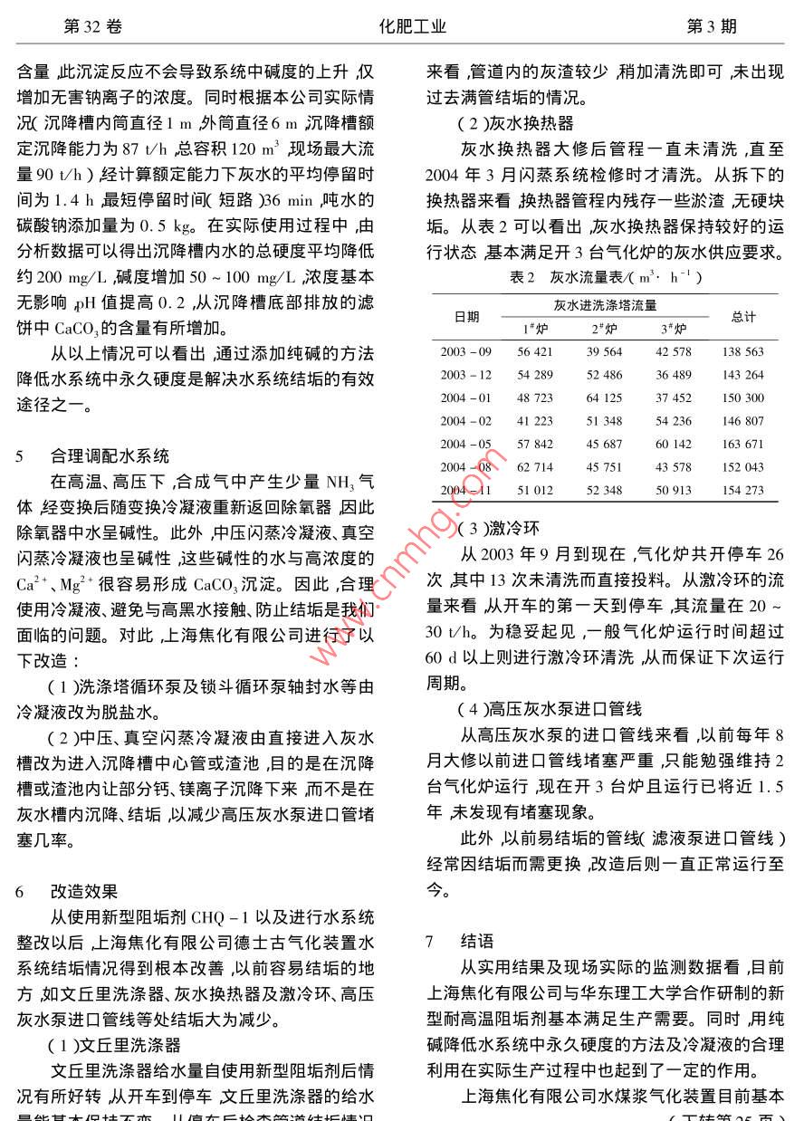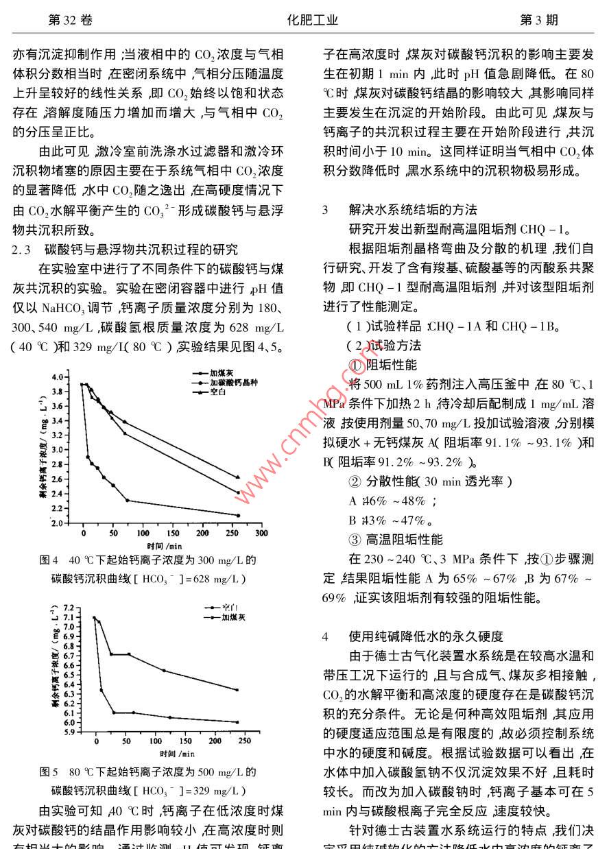 第32卷化肥工業(yè)第3期水煤漿氣化裝置水系統(tǒng)的研究顧勁飚(上海焦化有限公司200241)摘要通過對水系統(tǒng)結(jié)垢機理的研究明確了結(jié)垢旳原因。通過使用新型耐髙溫阻垢劑冋時添加純堿降低水系統(tǒng)中永久硬度的方法及冷凝液的合理利用使水系統(tǒng)結(jié)垢問題得到有效緩解關鍵詞水系統(tǒng)結(jié)垢機理德士古Study of Water System in Coal-Water Slurry GasifierGu jingbiaoAbstract Through the study of the scaling mechanism of the water system the causes for scaleformation are made clear. By employing a new type of high temperature resistant scale inhibitor, alsoadding soda ash to reduce permanent hardness in the water system, as well as utilizing rationally theKeywords water system scaling mechanism Texaco上海焦化有限公司德士古水煤漿加壓氣化裝2水系統(tǒng)結(jié)垢原因及機理置的運行已日趨穩(wěn)定。但隨著氣化爐3開1備及2.1分析數(shù)據(jù)的統(tǒng)計分析負荷的提高尤其是環(huán)保要求的日益嚴格,該裝置經(jīng)過1個多月的水質(zhì)分析數(shù)據(jù)的收集、分析水系統(tǒng)結(jié)垢的問題日漸突出,已逐漸影響到氣化認為除原煤本身因素對水質(zhì)影響外還與水和合爐的穩(wěn)定運行主要表現(xiàn)在高壓灰水泵進口管線成氣及爐渣的接觸時間有較大的關系。同時發(fā)現(xiàn)堵塞、激冷環(huán)結(jié)垢、黑水管線結(jié)垢等。在要求2年運行2臺氣化爐時水中鈣、鎂離子含量明顯小于大修的情況下,公司與華東理工大學合作共同開3臺氣化爐時的監(jiān)測值分析數(shù)據(jù)見表1)因研究開發(fā)了新型阻垢劑并通過添加純堿以降低表1水系統(tǒng)水質(zhì)分析數(shù)據(jù)水的硬度等方法較好地解決了系統(tǒng)結(jié)垢問題滿Cl/總硬度/懸浮物足了生產(chǎn)需要。時間(mg mg水系統(tǒng)工藝流程2003-09-04T15:008.65156.23932.1496開2水系統(tǒng)工藝流程見圖1。甲醇系統(tǒng)返回的變200307T8:008.76176.241013.5493臺氣換冷凝液和脫鹽水經(jīng)除氧器除氧后作為洗滌水北為2003-09-1016:309.01184.65953.47和補充水進入洗滌塔。洗滌塔內(nèi)工藝水經(jīng)洗滌塔(5d)2003-09-1315:308.84203.458563295循環(huán)泵打至氣化爐激冷環(huán),以保持激冷室液位2003-09-16T08:008.92152.24904.05972003-11-16T08:008.76203.121432.08102氣化爐洗滌塔產(chǎn)生的黑水經(jīng)二級閃蒸后進入沉開32003-11-19T8:009.23185.041389.1294降槽內(nèi)絮凝沉降后上部清液溢流至灰水槽部分2003-11-22108:008.76167灰水經(jīng)高壓灰水泵返回洗滌塔其余經(jīng)低壓灰水(15d)003-11-25108:008.91194.211500.7496泵送至界區(qū)外進行廢水處理2003-11-28T08:008.95164.371354.1798第32卷化肥工業(yè)第3期冷凝液脫鹽水低壓蒸汽合成氣去甲醇冷卻水洗滌塔蒸水g真空閃燕分洗滌塔循環(huán)泵水累凝劑加阻垢劑處去界外去壓濾機低壓灰水泵高壓灰水泵圖1水系統(tǒng)工藝流程圖此認定水中硬度的變化取決于水的循環(huán)量與系統(tǒng)定結(jié)果見圖2、圖3。保留容積即接觸時間、停留時間)之比。2.2合成氣中CO2的高溫水溶液熱力學平衡數(shù)NaC]2.7%據(jù)的測試NaCl=0%000284062壓力/Pa圖3不同壓力下CO,在含鹽和度/°C甲烷氣體的水中溶解度圖2常壓下CO2氣體在水中的溶解度相平衡數(shù)據(jù)表明在氣相中CO2的體積分數(shù)在高壓相平衡裝置中對合成氣中CO2與水大于4%時碳酸鈣一般不會形成鈣離子呈溶解第32卷化肥工業(yè)第3期亦有沉淀抑制作用;當液相中的CO,濃度與氣相子在高濃度時煤灰對碳酸鈣沉積的影響主要發(fā)體積分數(shù)相當時在密閉系統(tǒng)中,氣相分壓隨溫度生在初期1min內(nèi)此時pH值急劇降低。在80上升呈較好的線性關系即CO2始終以飽和狀態(tài)℃時煤灰對碳酸鈣結(jié)晶的影響較大其影響同樣存在溶解度隨壓力增加而增大,與氣相中CO2主要發(fā)生在沉淀的開始階段。由此可見煤灰與的分壓呈正比鈣離子的共沉積過程主要在開始階段進行共沉由此可見激冷室前洗滌水過濾器和激冷環(huán)積時間小于10min。這同樣證明當氣相中CO體沉積物堵塞的原因主要在于系統(tǒng)氣相中CO濃度積分數(shù)降低時黑水系統(tǒng)中的沉積物極易形成。的顯著降低水中CO2隨之逸出在高硬度情況下由CO2水解平衡產(chǎn)生的CO32形成碳酸鈣與懸浮3解決水系統(tǒng)結(jié)垢的方法物共沉積所致研究開發(fā)出新型耐高溫阻垢劑CHQ-1。2.3碳酸鈣與懸浮物共沉積過程的研究根據(jù)阻垢劑晶格彎曲及分散的機理我們自在實驗室中進行了不同條件下的碳酸鈣與煤行研究、開發(fā)了含有羧基、硫酸基等的丙酸系共聚灰共沉積的實驗。實驗在密閉容器中進行值物即CHQ-1型耐高溫阻垢劑并對該型阻垢劑僅以 Nahco3調(diào)節(jié),鈣離子質(zhì)量濃度分別為180、進行了性能測定。300、540mg/L,碳酸氫根質(zhì)量濃度為628mg/L(1)試驗樣品cHQ-1A和CHQ-1B(40℃廂和329mg/(80℃)實驗結(jié)果見圖4、5(2)試驗方法①阻垢性能加碳酸鈣晶種將500mL1%藥劑注入高壓釜中在80℃、1MPa條件下加熱2h待冷卻后配制成1mg/mL溶液按使用劑量50、70mg/L投加試驗溶液分別模擬硬水+無鈣煤灰A(阻垢率91.1%~93.1%)和Ⅸ阻垢率91.2%~93.2%)②分散性能(30min透光率)A:6%~48%B#3%~47%。時間/in③高溫阻垢性能圖440℃下起始鈣離子濃度為300mg/L的在230~240℃、3MPa條件下按①步驟測碳酸鈣沉積曲線([HCO3]=628mg/L.)定結(jié)果阻垢性能A為65%~67%B為67%69%證實該阻垢劑有較強