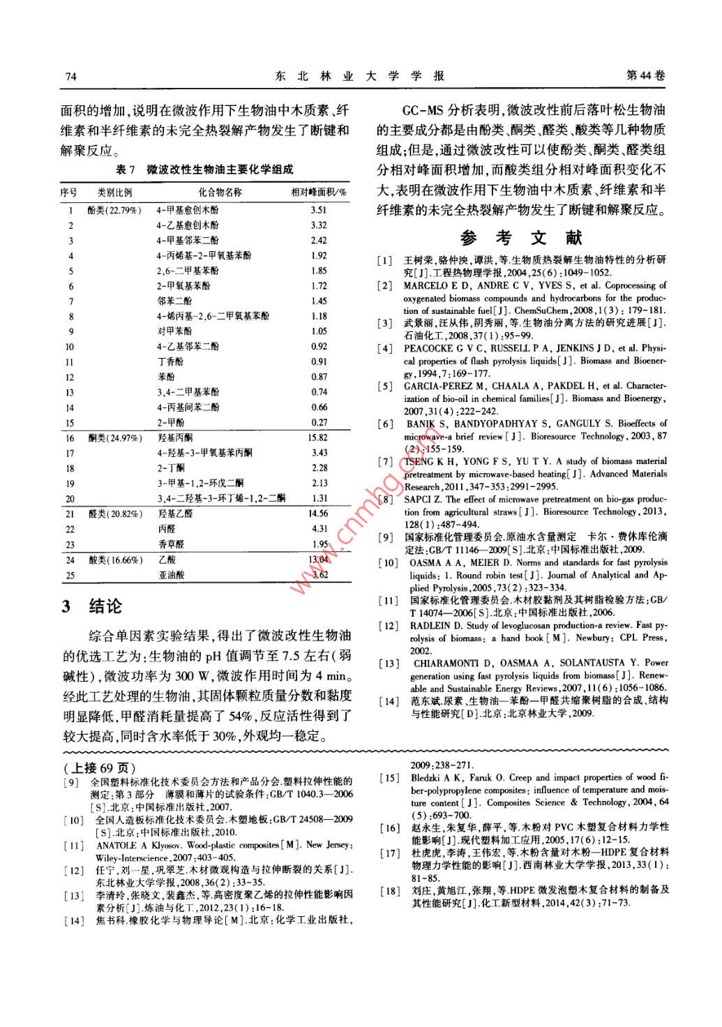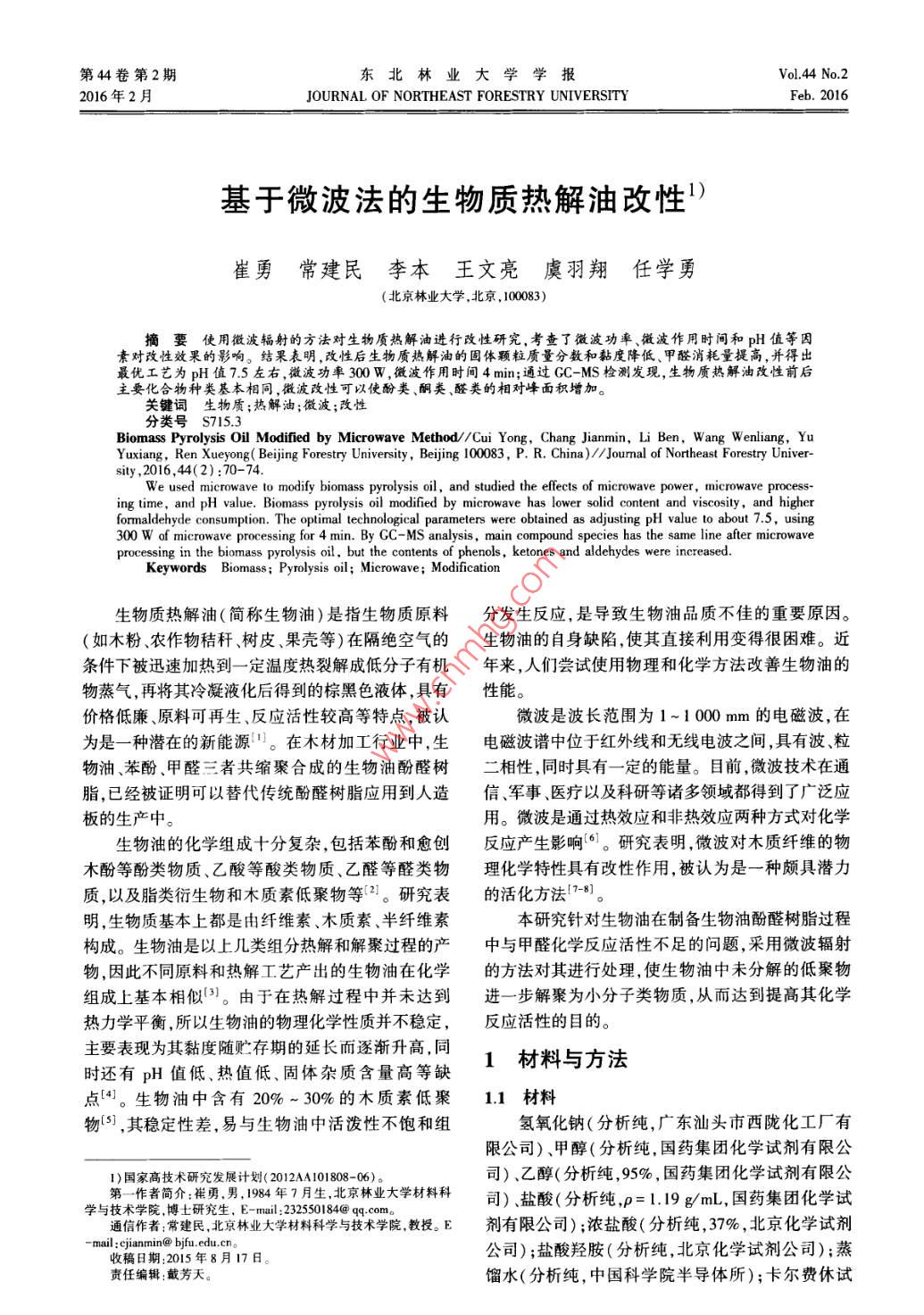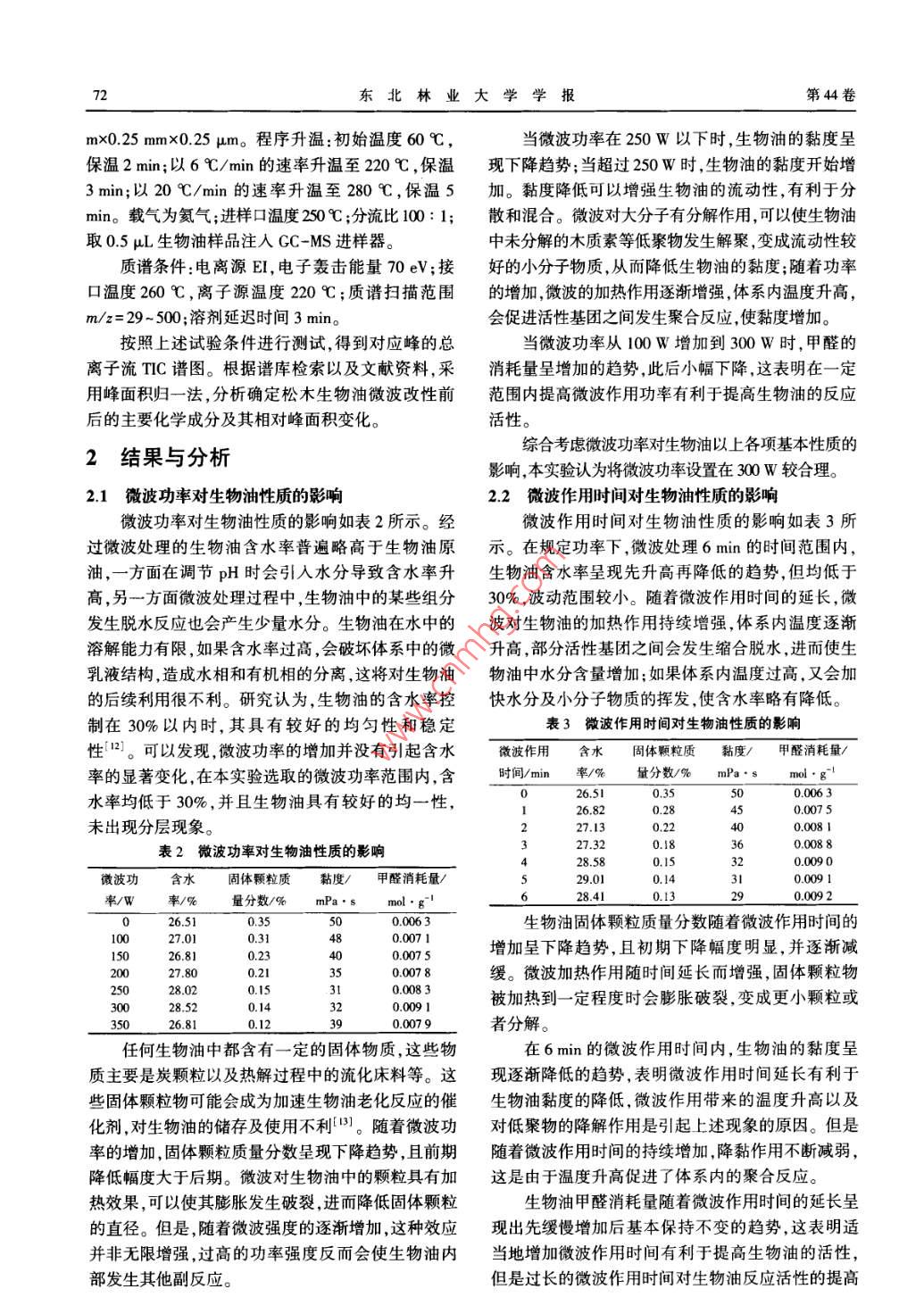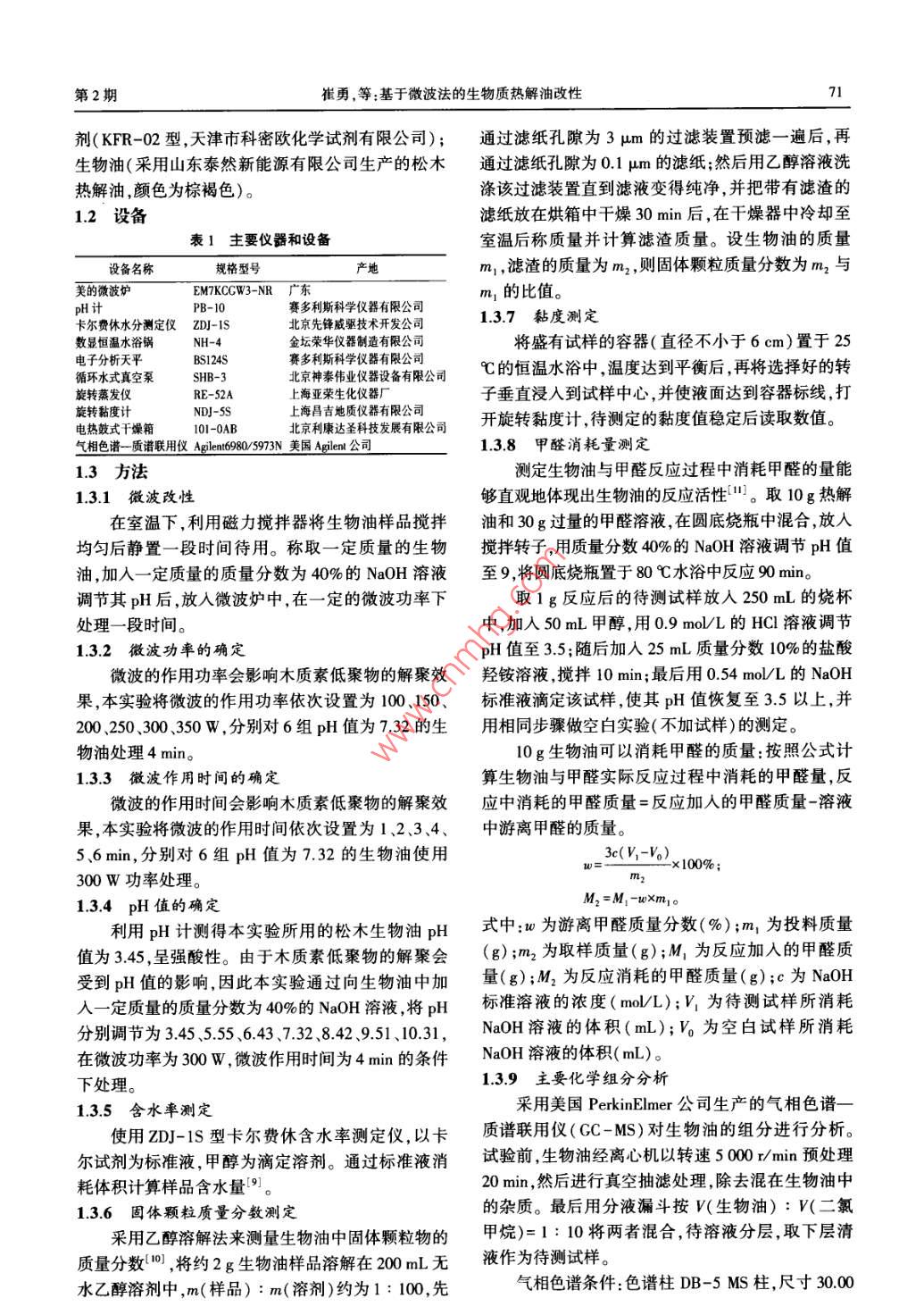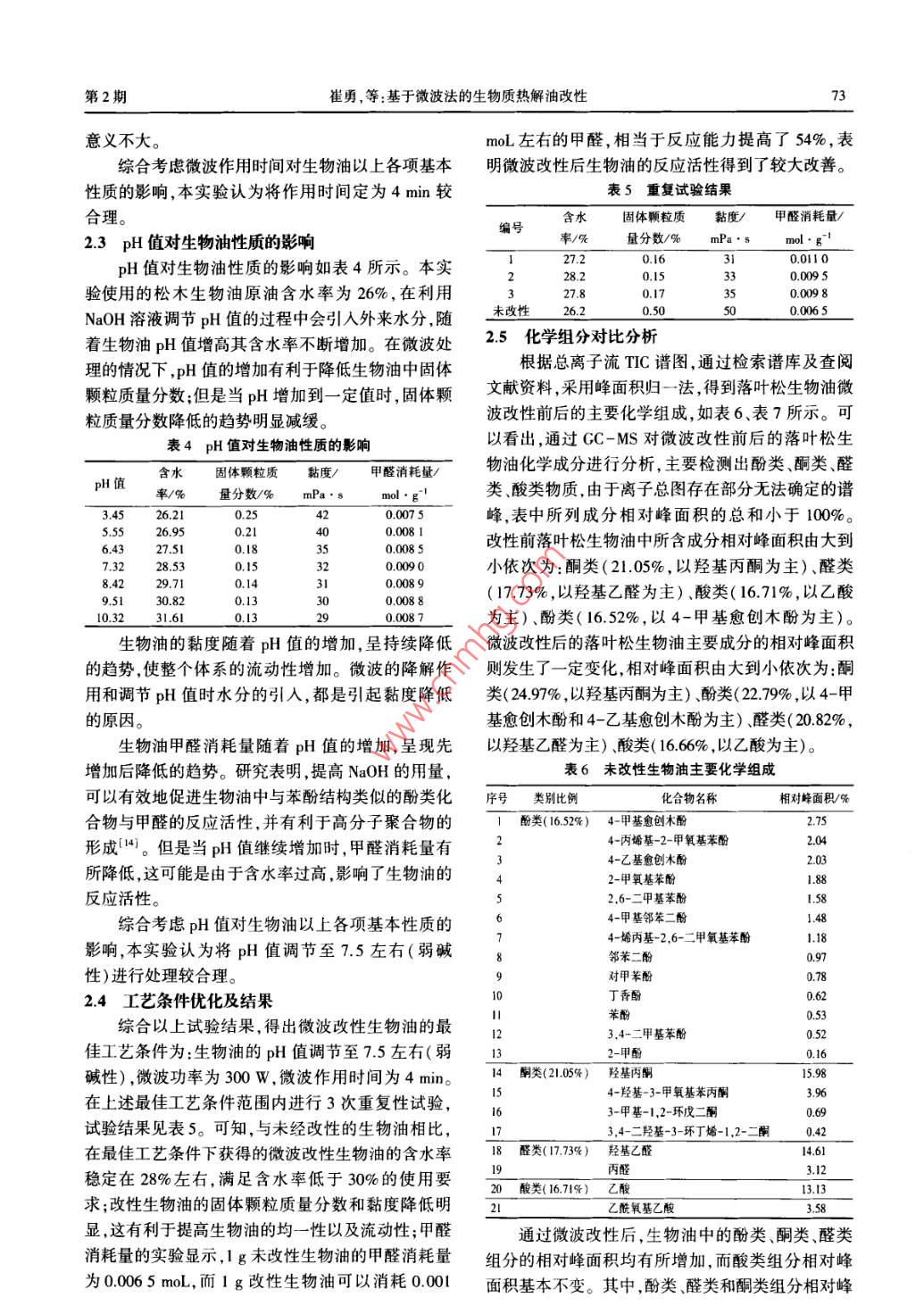 第44卷第2期東北林業(yè)大學學報Vol.44 No.22016年2月JOURNAL OF NORTHEAST FORESTRY UNIVERSITYFeb. 2016基于微波法的生物質(zhì)熱解油改性’)崔勇常建民李本王文亮虞羽翔任學勇(北京林業(yè)大學.北京,10083)摘要使用微波輻射的方法對生物質(zhì)熱解油進行改性研究,考查了微波功率、微波作用時間和pH值等因素對改性效果的影響。結果表明,改性后生物質(zhì)熱解油的固體顆粒質(zhì)量分數(shù)和黏度降低、甲醛消耗量提高,并得出最優(yōu)工藝為pH值7.5左右左右,微波功率300 w,微波作用時間4 min;通過GC-MS檢測發(fā)現(xiàn),生物質(zhì)熱解油改性前后主要化合物種類基本相同,微波改性可以使酚類、酮類、醛類的相對峰面積增加。關鍵詞生物質(zhì);熱解油;微波;改性Biomass Pyrolysis Oil Modified by Microwave Method//Cui Yong, Chang Jianmin, Li Ben, Wang Wenliang, YuYuxiang, Ren Xueyong( Beijing Forestry University, Bejjing 100083,P. R. China)//Jourmal of Northeast Forestry Univer-sity ,2016,44(2):70-74.We used microwave to modily biomass pyrolysis oil, and studied the effects of microwave power, microwave process-ing time, and pH value. Biomass pyrolysis oil modifed by microwave has lower solid content and viscosity, and higherformaldehyde consumption. The optimal technological parameters were obtained as adjusting pH value to about 7.5, using300 W of microwave processing for 4 min. By GC - MS analysis, main compound species has the same line after microwaveprocessing in the biomass pyrolysis oil, but the contents of phenols, ketones and aldehydes were increased.Keywords Biomass; Pyrolysis oil; Microwave ; Modification生物質(zhì)熱解油(簡稱生物油)是指生物質(zhì)原料分發(fā)生反應,是導致生物油品質(zhì)不佳的重要原因。(如木粉、農(nóng)作物秸稈樹皮、果殼等)在隔絕空氣的生物油的自身缺陷,使其直接利用變得很困難。近條件下被迅速加熱到一定溫度熱裂解成低分子有機年來,人們嘗試使用物理和化學方法改善生物油的物蒸氣,再將其冷凝液化后得到的棕黑色液體,具有性能。價格低廉、原料可再生、反應活性較高等特點,被認微波是波長范圍為1~1 000 mm的電磁波,在為是一- 種潛在的新能源!。在木材加工行業(yè)中,生電磁波譜中位于紅外線和無線電波之間,具有波、粒物油苯酚、甲醛三者共縮聚合成的生物油酚醛樹二相性,同時具有一-定的能量。目前,微波技術在通脂,已經(jīng)被證明可以替代傳統(tǒng)酚醛樹脂應用到人造信、軍事、醫(yī)療以及科研等諸多領域都得到了廣泛應板的生產(chǎn)中。用。微波是通過熱效應和非熱效應兩種方式對化學生物油的化學組成十分復雜,包括苯酚和愈創(chuàng)反應產(chǎn)生影響[。1。研究表明,微波對木質(zhì)纖維的物木酚等酚類物質(zhì)、乙酸等酸類物質(zhì)、乙醛等醛類物理化學特性具有改性作用,被認為是一種頗具潛力質(zhì),以及脂類衍生物和木質(zhì)素低聚物等(2。研究表的活化方法[7-8]。明,生物質(zhì)基本上都是由纖維素、木質(zhì)素、半纖維索本研究針對生物油在制備生物油酚醛樹脂過程構成。生物油是以上幾類組分熱解和解聚過程的產(chǎn)中與甲醛化學反應活性不足的問題,采用微波輻射物,因此不同原料和熱解工藝產(chǎn)出的生物油在化學的方法對其進行處理,使生物油中未分解的低聚物組成上基本相似”。由于在熱解過程中并未達到進一步解聚為小分子類物質(zhì),從而達到提高其化學熱力學平衡,所以生物油的物理化學性質(zhì)并不穩(wěn)定,反應活性的目的。.主要表現(xiàn)為其黏度隨貯存期的延長而逐漸升高,同1材料與方法時還有pH值低、熱值低、固體雜質(zhì)含量高等缺點[4。生物油中含有20%~ 30%的木質(zhì)素低聚1.1材料物[5],其穩(wěn)定性差,易與生物油中活潑性不飽和組氫氧化鈉(分析純,廣東汕頭市西隴化工廠有限公司)、甲醇(分析純,國藥集團化學試劑有限公1)國家高技術研究發(fā)展計劃( 2012AA101808-06)司).乙醇(分析純,95%,國藥集團化學試劑有限公第- -作者簡介:崔勇.男, 1984年7月生,北京林業(yè)大學材料科司)、鹽酸(分析純ρ=1.19g/mL,國藥集團化學試.與技術學院,博士研究生, E-mail :232550184@ qq.com。通信作者:常建民,北京林業(yè)大學材料科學與技術學院教授。E劑有限公司) ;濃鹽酸(分析純,37% ,北京化學試劑收稿日期:2015年8月17日。公司);鹽酸羥胺(分析純,北京化學試劑公司);蒸責任編輯:戴芳天。餾水(分析純,中國科學院半導體所);卡爾費休試第2期崔勇,等;基于微波法的生物質(zhì)熱解油改性71劑( KFR-02型,天津市科密歐化學試劑有限公司);通過濾紙孔隙為3 μm的過濾裝置預濾一遍后,再生物油(采用山東泰然新能源有限公司生產(chǎn)的松木通過濾紙孔隙為0.1 μm的濾紙;然后用乙醇溶液洗熱解油,顏色為棕褐色)。滌該過濾裝置直到濾液變得純凈,并把帶有濾渣的1.2 設備濾紙放在烘箱中干燥30 min后,在干燥器中冷卻至表1主要儀器和設備室溫后稱質(zhì)量并計算濾渣質(zhì)量。設生物油的質(zhì)量設備名稱規(guī)格型號產(chǎn)地m,濾渣的質(zhì)量為m2 ,則固體顆粒質(zhì)量分數(shù)為m2與美的微波爐EM7KCCW3-NR廣東m;的比值。PB-10賽多利斯科學儀器有限公司卡爾費休水分測定儀ZDJ-IS北京先鋒威驅(qū)技術開發(fā)公司1.3.7黏度測定數(shù)顯恒溫水浴鍋NH-4金壇榮華儀器制造有限公司將盛有試樣的容器(直徑不小于6 cm)置于25電子分析天平BS124SC的恒溫水浴中,溫度達到平衡后,再