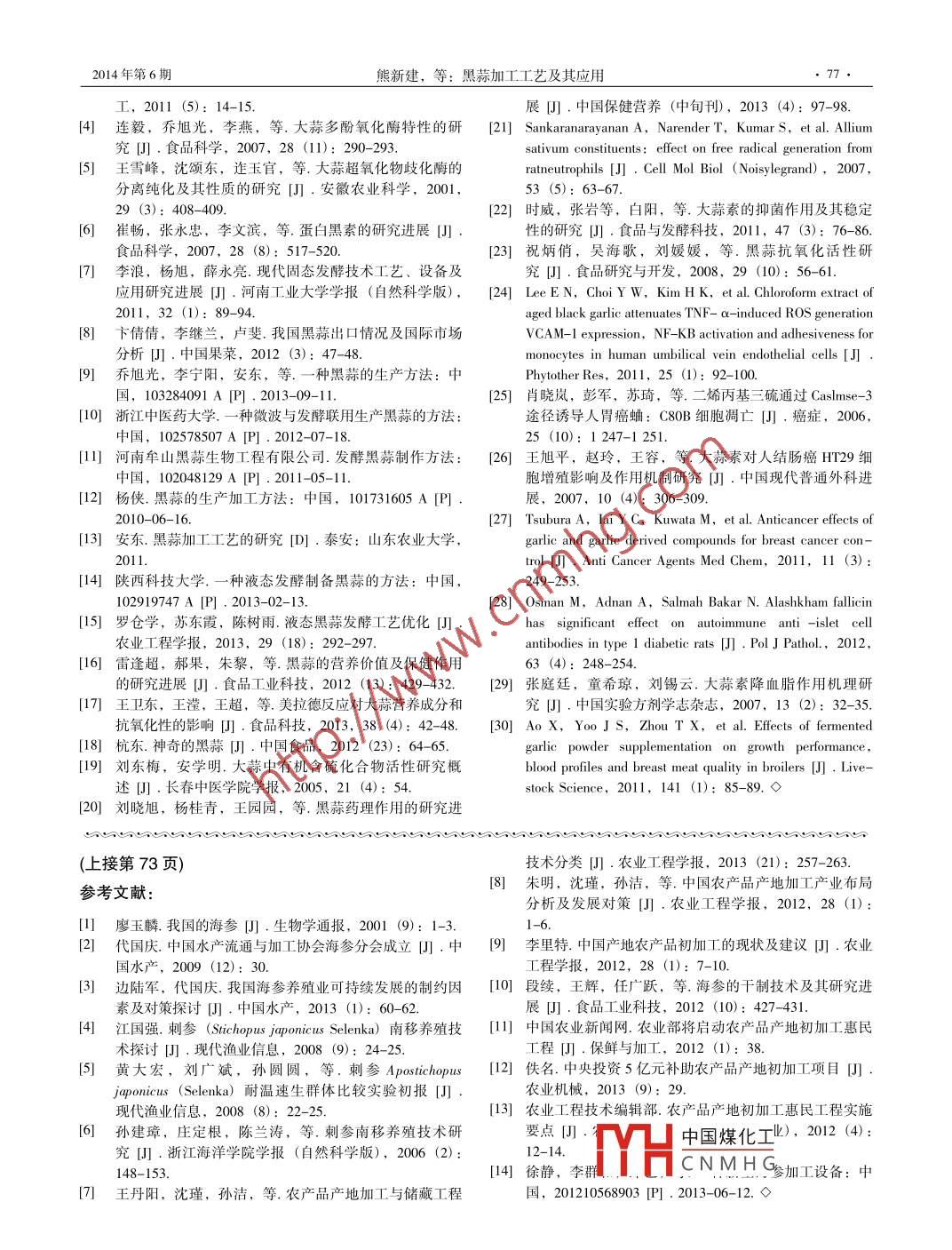 第6期(總第355期)農(nóng)產(chǎn)品加工(學(xué)刊)No 62014年6月Academic periodical of Farm Products Processin文章編號:1671-9646(2014)06a-0074-04黑蒜加工工藝及其應(yīng)用熊新建',盧建新’,李丹,陳媛媛3,張仲欣2,任廣躍2(1.河南科技大學(xué)后勤集團飲食公司,河南洛陽471023;2.河南科技大學(xué)食品與生物工程學(xué)院,河南洛陽471023)摘要:黑蒜作為一種發(fā)酵制品,是以新鮮大蒜為原料,經(jīng)過高溫、高濕條件的發(fā)酵而成。隨著人們生活水平的提高黑蒜正以它極高的營養(yǎng)價值和保健價值博得消費者的青睞。以黑蒜生產(chǎn)工藝及近年來的研究進展和應(yīng)用情況為切人點,對黑蒜的發(fā)酵過程、發(fā)酵形態(tài)、食用價值和保健價值以及未來黑蒜的發(fā)展前景和方向進行全面的闡述。目前國內(nèi)大蒜消費主要以其原料和初級加工產(chǎn)品為主,其附加值不高,故黑蒜加工工藝及其應(yīng)用的研究為大蒜產(chǎn)業(yè)及其深加工的開發(fā)利用開辟了新的領(lǐng)域關(guān)鍵詞:黑蒜;工藝;應(yīng)用;固態(tài)發(fā)酵;液態(tài)發(fā)酵中圖分類號:S26.6文獻標(biāo)志碼:Adoi:10.3969jisn.1671-9646(X)2014.06022Application and Processing Technology of Black GarlicXIONG Xin-jian', LU Jian-xin2, LI Dan2, CHEN Yuan-yuan, ZHANG Zhong-xin, REN Guang-yue2(1. Logistics Group Catering Company, He'nan University of Science and Technology, Luoyang, He'nan 471023,China;2. College of Food bioengineering He'nan University of Science and Technology Luoyang. He'nan 471023. ChinaAbstract: As a fermentation product, black garlic is made from the fresh garlic, a kind of products after fermentationtemperature, high humidity conditions and prepared. With the improvement of people's living level, black garlic is winpeople's favor with its high nutritional value and health care value. In this paper, black garlic production technologyapplication in the progress and development of the research in recent years, development prospects and direction ofgarlic fermentation process, fermentation pattern, edible value and health value and future black garlic are described inAt present the domestic garlic consumption mainly in the raw materials and primary processing products, its added valuehigh, opens up a new field of study on the development and utilization of black garlic processing technology and its applicationstry and its deep processKey words: black garlic; technology; application; solid-state fermentation; liquid fermentation大蒜是蔥科蔥屬植物蒜( A iLium sα trium I.)的又名黑大蒜、發(fā)酵黑蒜,是用新鮮的大蒜發(fā)酵后制成鱗莖叫,我國大蒜栽培歷史悠久,栽培面積大,產(chǎn)量的產(chǎn)品。它不僅保留了大蒜原有的成分、功能,而且高,大蒜已經(jīng)成為我國特色的功能性食物資源。大柔軟富有彈性,人口之后,軟爛香甜,且無大蒜的辛蒜以其豐富的營養(yǎng)成分、低廉的價格、優(yōu)良的保健辣味和刺激性臭味;在抗氧化性及生理活性方面,與作用、巨大的市場需求,引起了消費者的廣泛關(guān)注。鮮蒜相比,多酚類物質(zhì)含量高出5倍以上,其超氧目前,國內(nèi)消費主要以大蒜原料和初級加工產(chǎn)品為化物歧化酶(SOD)活性要高出10倍以上。國內(nèi)的主,但初加工技術(shù)很難使大蒜的附加值得到提升,黑蒜加工技術(shù)主要是從日本和韓國引進的,這樣在也影響了國內(nèi)大蒜產(chǎn)業(yè)的發(fā)展。特別是新鮮大蒜本技術(shù)層面上不具有專利使用權(quán),同時由于國內(nèi)大蒜身所存在的蒜臭味(刺激性氣味和辛辣味),以及過品種及加工方式的差異,致使黑蒜產(chǎn)業(yè)經(jīng)濟效益不度食用會對人胃腸黏膜細胞造成一定程度的損傷,高。本文將對黑蒜加工工及其應(yīng)用進行詳細地表征,使之成為大蒜產(chǎn)業(yè)發(fā)展的瓶頸2旨在為國內(nèi)大蒜資源開發(fā)利用開辟新的領(lǐng)域。然而,在國外高品質(zhì)、高價值的大蒜系列深加工產(chǎn)品發(fā)展迅速,并受到消費者的認可。例如,日1黑蒜加工工藝本研究人員研制開發(fā)的黑蒜系列深加工產(chǎn)品。黑蒜黑蒜的發(fā)酵過程不是利用微生物發(fā)酵而成,而收稿日期:2014-03-14中國煤化工基金項目:國家級大學(xué)生創(chuàng)新創(chuàng)業(yè)訓(xùn)練計劃項目(201210464014)。CNMHG作者簡介:熊新建(1960—),男,中式烹調(diào)技師,研究方向為食品加工技術(shù)訊作者:任廣躍(1971—),男,博士,教授,研究方向為農(nóng)產(chǎn)品干燥技術(shù)2014年第6期熊新建,等:黑蒜加工工藝及其應(yīng)用75是指在高溫高濕條件下,自身組織遭到破壞后自身液態(tài)發(fā)酵的工藝流程為:物質(zhì)所發(fā)生的理化反應(yīng),其中黑蒜在黑變過程中主選取新鮮大蒜→蒜瓣去皮→清水清洗→蒜瓣破碎→裝袋要發(fā)生的是 Maillard反應(yīng),其黑色來源主要為真空密封→發(fā)酵箱中發(fā)酵→去袋、干燥→包裝→成品。Maillard反應(yīng)最終產(chǎn)物——蛋白黑素,發(fā)酵后期伴有黑蒜現(xiàn)有的生產(chǎn)工藝多以整瓣大蒜進行發(fā)酵,部分酶促褐變閥。目前,黑蒜加工通常分為固態(tài)發(fā)酵其液態(tài)發(fā)酵工藝鮮有報道。和液態(tài)發(fā)酵2類。黑蒜的液態(tài)發(fā)酵工藝中多借用耐高溫食品袋作1.1固態(tài)發(fā)酵工藝為蒜泥或者蒜粒的密封容器,密封的耐高溫食品袋黑蒜的固態(tài)發(fā)酵是指大蒜本身作為沒有水或者基使得黑蒜在發(fā)酵過程中無硫化物等臭味散出,極大本上沒有游離水的固態