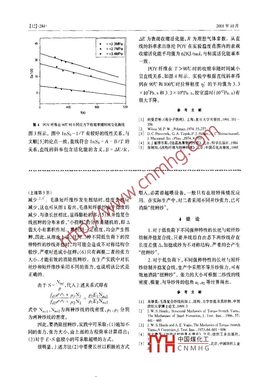 【10200年10月滌綸POY收縮動(dòng)力學(xué)研究汪進(jìn)玉王華平張玉梅王學(xué)利(儀征化纖股份公司產(chǎn)品技術(shù)開(kāi)發(fā)中心胥浦,211900)(東華大學(xué)(中國(guó)石油遼陽(yáng)石化分公司)摘要:采用線性粘彈模型屮的四元件模型對(duì)滌綸預(yù)取向纖維(POY)的等溫收縮過(guò)程動(dòng)力學(xué)進(jìn)行了研究。試驗(yàn)結(jié)果友明其收縮可用此模型進(jìn)行很好地述。得到POY纖維的特征弛豫時(shí)間r1、r2,特征平衡收S、S,收縮活化能拉伸粘度等特征參數(shù)關(guān)鍵詞:聚酯纖維預(yù)取向絲收縮動(dòng)力學(xué)研究中圖法分類(lèi)號(hào):TS102.52預(yù)取向絲(POY)是滌綸纖維中一個(gè)十分重要的其簡(jiǎn)化模型如圖1-b所示。對(duì)于實(shí)驗(yàn)條件中的恒定產(chǎn)品,采用收縮動(dòng)力學(xué)力法研究PY纖維的收縮隨應(yīng)力下的收縮行為,根據(jù)線性粘彈型可推導(dǎo)出其形時(shí)間的變化關(guān)系,可以獲得滌綸POY熱收縮的一系變方程如下所示具有一定物理意義的動(dòng)力學(xué)參數(shù)。對(duì)差別化纖維[1-e/r2]+E2ne的開(kāi)發(fā)和POY纖維的后加工、染幣等T藝條件的選擇具有重要的意義。(1)纖維的收縮(t)認(rèn)為是某時(shí)刻t的形變與初始形變E(t=0)時(shí)的負(fù)差,即1.1實(shí)驗(yàn)樣品△e(t)=-[e(t)-c(0)]滌綸POY纖維,儀征化纖公司滌綸五廠樣品=-m+(em-(a/上2)[1-e"](2)規(guī)格:170dtex/48f;物理指標(biāo):斷裂強(qiáng)度2.56cNdex,斷裂伸長(zhǎng)128%對(duì)于特定條件下的收縮,由于(20-a/E2)項(xiàng)為常1.2等溫收縮曲線測(cè)試數(shù)項(xiàng),方程(2)可以簡(jiǎn)化為采用SSI型收縮一聲速聯(lián)合測(cè)試儀,測(cè)試△st)=-m+Aet+B(B為常數(shù))(3)FOY纖維在不同恒定溫度、不同外應(yīng)力、各時(shí)刻纖維的收縮率。加熱器長(zhǎng)度35cm,加熱器溫度控制精對(duì)于實(shí)際的纖維收縮過(guò)程中包括多個(gè)不同的收度0℃,長(zhǎng)度測(cè)試精度1.Omm纖維的收縮率按縮單元的粘彈松弛過(guò)程纖維的收縮動(dòng)力學(xué)方程可下式計(jì)算以用方程(4)進(jìn)行描述△e(t)=-t+A1e"1+A2e"+…式中:L為纖維收縮前原長(zhǎng)度(加熱器中纖維長(zhǎng)度)(cm);△L為溫度T時(shí)纖維長(zhǎng)度變化值(cm)+A, n+B式中:A1、A2、…;An為各組成單元對(duì)總收縮的貢2滌綸纖維的收縮動(dòng)力學(xué)理論基礎(chǔ)獻(xiàn);r1、z2…;rn為各組成單元的特征弛豫時(shí)間。2.1滌綸纖維2.2滌綸等溫收縮動(dòng)力學(xué)處理的收縮動(dòng)力學(xué)方將不同等溫收縮條件(不同的溫度和外加張應(yīng)力)下的纖維收縮后剩余相對(duì)長(zhǎng)度,即(1-S)對(duì)相利用線性粘應(yīng)的收縮時(shí)間作圖,實(shí)驗(yàn)結(jié)果所得到的數(shù)據(jù)可以用彈模型可以對(duì)纖E2E2n2雙指數(shù)函數(shù)很好地進(jìn)行擬合,其結(jié)果如圖2所示。維的熱收縮行為其擬合方程為:作出比較好的描[1-S(t)]=(1-S0)+Sa,e"1+Se述,線性粘彈模(5)型由若干粘彈元En式中:S(t)為t時(shí)刻的收縮率;1-S(t)為t時(shí)刻的件( Kelvin剩余中國(guó)煤化工s);So、S、SViogt)組成1T1、r2H出NAA凵意義:Sn為t→如圖1a所示,圖1線性粘彈模型示意圖時(shí)的50以理解為纖維的最紡織學(xué)報(bào)第十二卷第五期283【1終剩余相對(duì)長(zhǎng)度;Sa、S為相應(yīng)的收縮過(guò)程對(duì)總收成。文獻(xiàn)[2]中表明非晶區(qū)分子鏈的解取向過(guò)程是縮率的貢獻(xiàn)值,x1、r2為相應(yīng)收縮過(guò)程的特征弛豫個(gè)快速過(guò)程,是纖維收縮的主要原因。據(jù)Preorse等提出的三相結(jié)構(gòu)模型,在纖維中除無(wú)定型相和晶相外,還存在一個(gè)介于晶相和非晶相之間的0=1.3MPa0=1.7MPa中間相結(jié)構(gòu),POY纖維在該溫度下晶相和中間相的變化緩慢4是產(chǎn)生慢速收縮的原因。比較不同實(shí)0=2.3MPa0=2.7MPa驗(yàn)條件下的SSn的值可以發(fā)現(xiàn)除了溫度較低(T0=3.4MPa=78℃)和張力較大(a=2.4MPa)時(shí),S/S的值都小于1,這表明纖維總的收縮中主要是快速收縮部分的貢獻(xiàn),但是低收縮溫度和高外應(yīng)力情況下,慢速收縮的貢獻(xiàn)大約為快速收縮的15-2倍,這可能與纖維在低溫時(shí)分子鏈段熱運(yùn)動(dòng)困難,不易發(fā)生解取向作用及在較高張應(yīng)力時(shí)發(fā)生的誘導(dǎo)結(jié)晶有關(guān)。隨著收縮溫度的提高,S0、S2值增加,表明隨著收縮溫度的提髙,纖維的大分子鏈段的活動(dòng)能力增圖2不同外應(yīng)力下等溫收縮雙指數(shù)擬合曲線(T=87℃)強(qiáng),原來(lái)在較低的溫度下不能發(fā)生熱運(yùn)動(dòng)而解取向根據(jù)收縮動(dòng)力學(xué)原理其最終的收縮結(jié)果是各個(gè)的結(jié)構(gòu)單元也開(kāi)始活動(dòng)發(fā)生解取向,導(dǎo)致收縮率的結(jié)構(gòu)單元的收縮結(jié)果和纖維在外加應(yīng)力作用下的負(fù)進(jìn)一步增加。溫度的升高對(duì)晶區(qū)的作用較復(fù)雜,可的收縮(伸長(zhǎng))共同作用的結(jié)果當(dāng)纖維在較低的溫度能隨著溫度的升高纖維中大分子鏈的有序程序降或外應(yīng)力較小時(shí)發(fā)生收縮,粘性拉伸對(duì)總的收縮影響低相對(duì)有序的折疊鏈的含量減少,不利于新的晶粒較小,所以在方程(4)中可以忽略(-a/v)t項(xiàng);在的形成和晶片的增厚及結(jié)晶的完整程度增加,導(dǎo)致實(shí)驗(yàn)中溫度小于90℃時(shí)