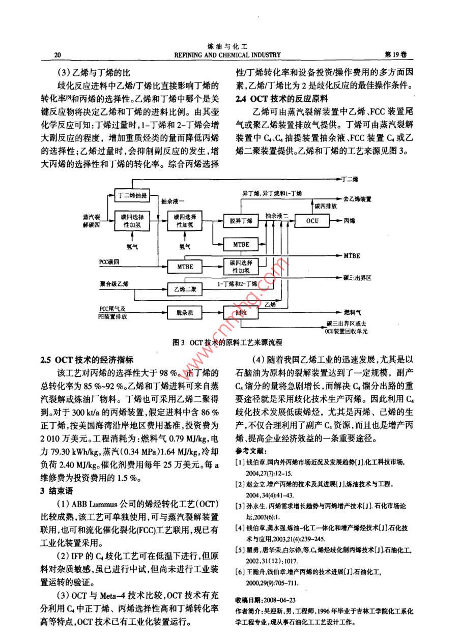 煉油與化工18REFINING AND CHEMICAL INDUSTRY第19卷增產(chǎn)丙烯的烯烴轉(zhuǎn)化技術(shù)進(jìn)展吳迎新(大慶石化工程有限公司,黑龍江大慶163714)摘要:文中闡述了增產(chǎn)丙烯的烯烴轉(zhuǎn)化技術(shù),并對其中的2種技術(shù)進(jìn)行了對比。針對已有工業(yè)化應(yīng)用經(jīng)驗(yàn)的OCT技術(shù),說明了其反應(yīng)原理.催化劑、反應(yīng)操作條件和反應(yīng)原料。烯烴轉(zhuǎn)化技術(shù)與蒸汽裂解、催化裂化技術(shù)結(jié)合可增加丙烯的產(chǎn)量。關(guān)鍵詞:烯烴轉(zhuǎn)化;丙烯;乙烯; OCT中團(tuán)分類號:TQ221.21文獻(xiàn)標(biāo)識(shí)碼:B文章編號:1671- 4962008)020018-03近年來,由于丙烯下游產(chǎn)品鏈的快速發(fā)展和返回反應(yīng)器循環(huán)使用,丙烯可以在丙烯塔內(nèi)分離丙烯供應(yīng)量的不足,國外公司熱衷于開發(fā)新的增得到,因在反應(yīng)中無丙烷生成,無須進(jìn)-步提純即產(chǎn)丙烯技術(shù)",以提高蒸汽裂解和催化裂化工藝的可得到聚合級丙烯.OCT技術(shù)工藝流程見圖1。丙烯收率。20世紀(jì)80年代末,我國研制開發(fā)了乙烯進(jìn)料循環(huán)乙烯輕組分排放ARGG .DCC- I ,DCC-I、CPP和HCC等催化裂化聚合級丙烯技術(shù),多數(shù)工藝已實(shí)現(xiàn)工業(yè)化。催化裂化技術(shù)同國外先進(jìn)的烯烴轉(zhuǎn)化技術(shù)結(jié)合,采用烯烴轉(zhuǎn)化技術(shù)利用催化裂化產(chǎn)物中乙烯和丁烯生產(chǎn)丙烯,為我090.國增產(chǎn)丙烯開辟了- -條新的途徑。| 丙烯塔1烯烴轉(zhuǎn)化技術(shù)岐化反應(yīng)岐化反應(yīng)器碳四及更烯烴轉(zhuǎn)化技術(shù)屬于烴類轉(zhuǎn)化技術(shù)。目前,全世碳四進(jìn)料器保護(hù)床循環(huán)碳四重組分界已經(jīng)有9套烯烴歧化裝置投產(chǎn),這些烯烴歧化圖1 OCT 技術(shù)工藝流程裝置或與蒸汽裂解裝置聯(lián)合,或與煉油廠回收丙1.2IFP的Meta4技術(shù)烯裝置聯(lián)合。與蒸汽裂解裝置結(jié)合可將丙烯/乙烯與OCT技術(shù)相比, Meta -4技術(shù)利用錸基催化比提高到1~1.25,丙烯產(chǎn)量比僅用液體原料的蒸劑在液相低溫下進(jìn)行操作,在35 C時(shí)單程平衡轉(zhuǎn)汽裂解裝置提高1倍以上;該技術(shù)與最大限度生化率可達(dá)63 %。該技術(shù)對丙烯的選擇性大于98 %,產(chǎn)丙烯的催化裂化裝置聯(lián)用,可使丙烯產(chǎn)率比最2-丁烯轉(zhuǎn)化率90%,產(chǎn)物中乙烯的質(zhì)量分?jǐn)?shù)可達(dá)大生產(chǎn)汽油模式技術(shù)高出3倍。31.2 %,丙烯的質(zhì)量分?jǐn)?shù)可達(dá)22.4%,C3與C2質(zhì)量1.1 ABB Lummus公司的OCT技術(shù)比可達(dá)0.72oMeta- 4技術(shù)工藝流程見圖2。ABBLummus公司的OCT技術(shù)將乙烯轉(zhuǎn)化為碳二丙烯B-3的選擇性近100 % ,將丁烯轉(zhuǎn)化為丙烯的選聚合級丙爝擇性為97 %,丁烯總轉(zhuǎn)化率為85 %~92 %(丁烯進(jìn)料中正丁烯質(zhì)量分?jǐn)?shù)為50%~95 %)。進(jìn)料中的乙烯和丁烯可來自蒸汽裂解裝置和各種煉油廠的生產(chǎn)過程,濃度也可不相同,丁烯也可來自乙烯二聚裝置。碳二塔再生器OCT技術(shù)采用固定床反應(yīng)器,催化劑是載于碳四進(jìn)料硅藻土上的WO,和Mg0。催化劑可連續(xù)再生,催化反應(yīng)器堿四塔+殘液劑結(jié)焦采用氮?dú)饧涌諝馇褰?。原料中?-丁烯在圖2 Meta- 4技術(shù)工藝流程Mg0作用下異構(gòu)化為2-丁烯,然后與乙烯由WO3Meta- 4技術(shù)包括反應(yīng)區(qū)和再生區(qū)。反應(yīng)器可歧化生成丙烯。在乙烯塔內(nèi)分離出未反應(yīng)的乙烯以使用固定床反應(yīng)器也可以采用移動(dòng)床反應(yīng)器。2008年第2期吳迎新增產(chǎn)丙烯的烯烴轉(zhuǎn)化技術(shù)進(jìn)展19催化劑全部或部分失活后,除去附著在表面上的有2 0CT技術(shù)詳述機(jī)物,送人再生器再生,可循環(huán)操作。反應(yīng)器頂部的2.1 OCT技術(shù)反應(yīng)機(jī)理液體送到蒸餾段,在碳二塔內(nèi)回收乙烯再返回反應(yīng)OCT技術(shù)中的歧化反應(yīng)P為乙烯和丁烯催化器使用。丙烯在C4塔內(nèi)分離得到聚合級丙烯。反應(yīng)生成丙烯,該反應(yīng)為平衡反應(yīng)。因此,0CT技13 Sasol公司的技術(shù)術(shù)既可以利用該反應(yīng)由乙烯和丁烯生產(chǎn)丙烯,又南非Sasol公司開發(fā)了一種由丁烯制丙烯的可以由丙烯生產(chǎn)乙烯和丁烯。反應(yīng)式為:技術(shù)。原料為1-丁烯.2-丁烯或其混合物,催化劑CH4+ CAHs= =2 CH6+ C;*為Cs-P-WO3 /SiO2, 反應(yīng)溫度550 C,壓力OCT技術(shù)中化學(xué)反應(yīng)主要為歧化反應(yīng)和異構(gòu)0.1MPa,可生產(chǎn)丙烯與乙烯摩爾比高達(dá)3:1的產(chǎn)化反應(yīng)。歧化反應(yīng)器中發(fā)生的主要反應(yīng)有2個(gè)反物。催化劑可含有提高丙烯選擇性的磷酸鹽、硼酸應(yīng):鹽或氧化鎂等助劑,也可含有降低丙烯選擇性、改CH=CH2 + CH- CH=CH _CHz=2 CH2=CH -CHs善乙烯和己烯選擇性的堿金屬。CH=CH-CH-CH3 =CH3 -CH=CH-CH3該技術(shù)的最大優(yōu)點(diǎn)在于它的原料來源廣泛,異丁烯存在時(shí),發(fā)生的副反應(yīng)將生成Cs以上如可以是純丁烯,也可以源于F-T反應(yīng)產(chǎn)物(包括的重質(zhì)烴類,重質(zhì)烴類在催化劑上結(jié)焦,降低催化1-丁烯、2-丁烯以及其他如乙烯、丙烯、戊烯、己烯劑的再生周期。原料中異丁烯含量在1 %時(shí),催化等),還可源于石腦油裂解工藝及氣體裂解工藝的劑再生周期為30d