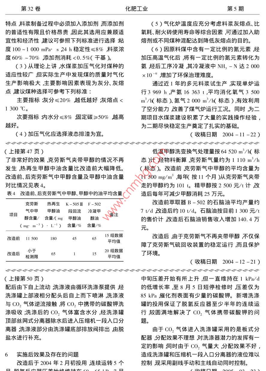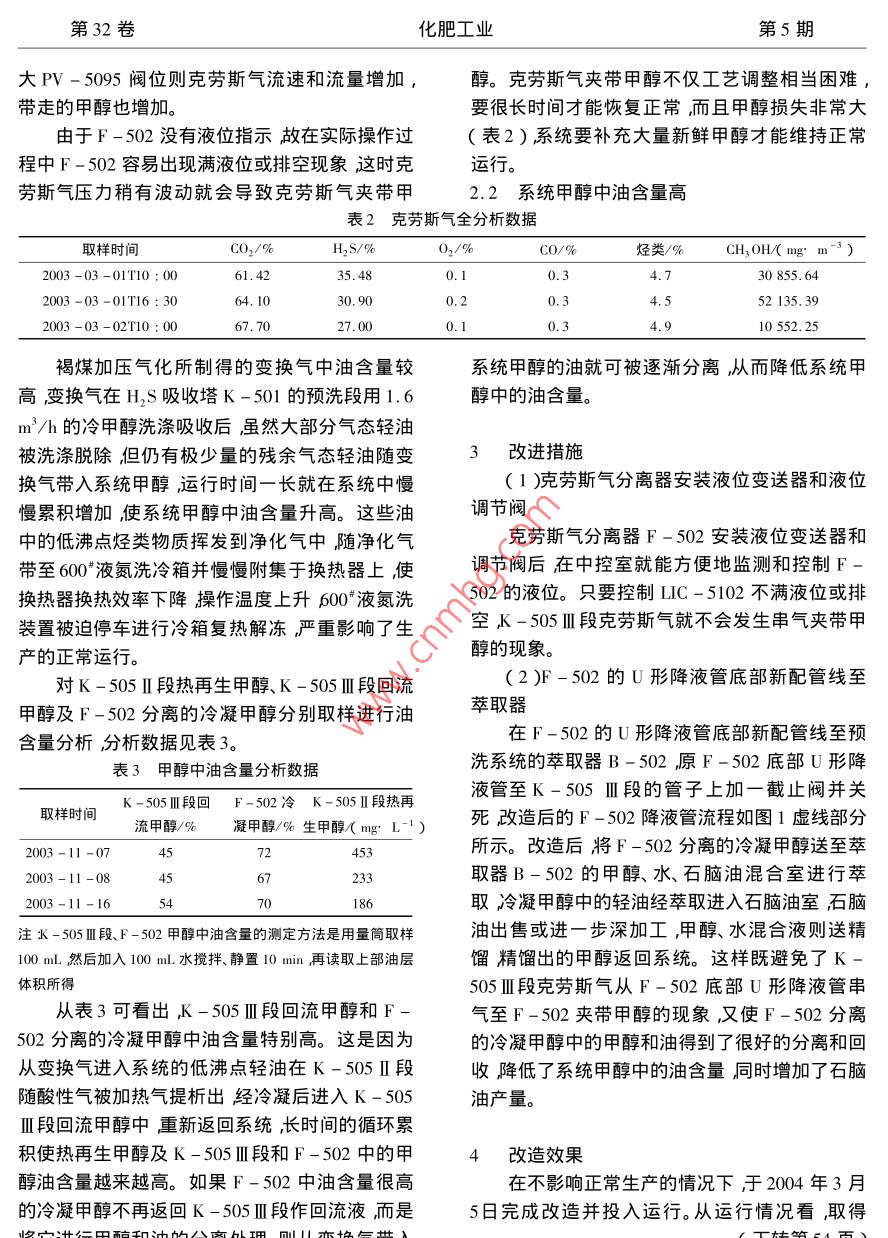 第32卷化肥工業(yè)第5期低溫甲醇洗熱再生系統(tǒng)存在的問題及改進措施丁武松寧平〔昆明理工大學環(huán)境科學與工程學院650093)摘要針對低溫甲醇洗裝置克勞斯氣夾帶甲醇及系統(tǒng)甲醇中油含量髙的問題分析其原因并提岀改進措施。對克勞斯氣分離器降液管改造后消除了克艻斯氣夾帶甲醇的現(xiàn)象降低了系統(tǒng)甲醇中的油含量陬得了較好的經(jīng)濟效益。關鍵詞低溫甲醇洗克勞斯Problems in Regeneration System by Heating forLow-Temperature Methanol Wash Process and Improvement MeasuresDing Wusong and Ning pingAbstract With a view to solving the problems of methanol entrainment by Claus gas in the lowtemperature methanol wash unit and high oil content in methanol in the system the causes are analyzedand improvement measures are proposed. By transformation of the downcomer of the Claus gas separator, methanol entrainment by Claus gas is eliminated, the oil content in the methanol in the system re-Keywords low-temperature methanol wash Claus gas reform低溫甲醇洗是解化集團公司二期技改工程進入K-505Ⅱ段加熱再生用醇中溶解的酸性氣自1998年底試運行以來,—直存在著克勞斯氣夾體被熱再生塔再沸器W-515產(chǎn)生的甲醇蒸氣氣帶甲醇及系統(tǒng)甲醇中油含量高的問題不僅甲醇提析岀岀K-505Ⅱ段頂部的帶甲醇的酸性氣經(jīng)消耗增加而且嚴重影響了低溫甲醇洗和液氮洗W-511和W-512冷凝后進入K-505Ⅲ段進行的安全穩(wěn)定運行。為此對克勞斯氣分離器降液管氣液分離其中大部分甲醇被冷凝后進入K-505進行了改造改造后消除了克勞斯氣夾帶甲醇的Ⅲ段作回流液。出K-505Ⅲ段的克勞斯氣在W現(xiàn)象降低了系統(tǒng)甲醇中的油含量取得了較好的513中被來自K-503Ⅲ段的CO,閃蒸氣冷卻至經(jīng)濟效益和社會效益。21℃再經(jīng)氨冷器W-514冷卻至-40℃后進入克勞斯氣分離器F-502。在F-502中被分熱再生系統(tǒng)工藝流程簡介離的甲醇冷凝液經(jīng)F-502底部U形降液管返回低溫甲醇洗熱再生系統(tǒng)工藝流程見圖1。來自K-505Ⅲ段作回流液出F-502頂部的克勞斯W-508的富H2S甲醇液在熱再生塔K-505I段減氣經(jīng)W-511復熱后送克勞斯硫回收裝置。壓閃蒸熱閃蒸氣經(jīng)W-509冷凝后冷凝的甲醇進K-505Ⅲ段的甲醇經(jīng)P506泵送至K-505Ⅱ入K-505Ⅲ段作回流液出W-509的熱閃蒸氣含段頂部作回流液。K-505Ⅱ段底部經(jīng)過完全再CO284.51%HS9.40%羥經(jīng)W-510冷卻后進入K生后的甲醇經(jīng)P-507泵送至W-508、W-507504I段底部進行H2S提濃的再吸收。和W-522氨冷器冷卻至-40℃后送CO2吸收經(jīng)過熱閃蒸后的K-505I段富H2S甲醇液塔K-502頂部作精洗甲醇。第32卷化肥工第5期CO排放氣去K506自K503Ⅲ段去K504段底部去克勞斯裝置W510去W507來自K504Ⅱ底部蒸汽W515圖1熱再生系統(tǒng)工藝流程圖K-505.熱再生塔F-502.克勞斯氣分離器W-508.貧/富甲醇熱交換器W-509.熱閃蒸氣冷凝器W-510.熱閃蒸氣/再吸收排放氣換熱器W-511/W-512.熱再生塔頂冷凝器W-513.克勞斯氣/排放氣換熱器W-514.克勞斯氣氨冷器W-515.再沸器P-505.熱再生塔給料泵P-506,熱再生塔回流泵P-507.CO,吸收塔給料泵熱再生系統(tǒng)存在的問題及原因分析氣壓力PR-5096非但不下降反而會升高克勞2.1克勞斯氣壓力波動大斯氣夾帶甲醇更加嚴重若關小PV-5095閥位低溫甲醇洗裝置自開車投運以來當蒸汽壓也會使克勞斯氣壓力升高K-505Ⅱ段熱再生甲力或其它外部條件稍有波動就會引起克勞斯氣醇中的酸性氣不能被全部及時氣提析岀熱再生壓力的波動岀現(xiàn)克勞斯氣夾帶甲醇的現(xiàn)象克勞甲醇再生不完全,使K-502塔頂部的精洗甲醇斯氣出口壓力PR-5096升高,出口溫度TR-吸收效率下降導致K-502塔頂部H2S和CO25096迅速下降至0℃以下。此時若開大克勞斯微量上升。克勞斯氣夾帶甲醇時的相應工藝參數(shù)氣出囗壓力調節(jié)閥PV-5095閥位來降低克勞斯變化情況見表1。表1克勞斯氣夾帶甲醇時部分工藝參數(shù)變化情況項目PR-5095/ MPa PR-5096/MPaT-5103/℃T-5104/℃TR-5091/℃TR-5096/℃△TTR-5091-TR-5096y℃測量對象入w-51的出W-511的出w-513的克出W-513的排入w-511的熱出w-511的克W-511熱再生氣壓力克勞斯氣壓力勞斯氣溫度放氣溫度再生氣溫度勞斯氣溫度熱短溫差工藝指標0,15正常工況18帶甲醇時0.30>80從表1可看出克勞斯氣夾帶甲醇時,Tl合形成氣液夾帶的狀況,從F-502頂部排出5103和TI-5104溫度迅速下降這表明從W由于克勞斯氣夾帶著經(jīng)W-513和W-514冷凝513到W-514的克勞斯氣量減少了,其余的克的-40℃甲醇冷凝液而甲醇易揮發(fā)在揮發(fā)過勞斯氣則沖破克勞斯氣分離器F-502底部U形程中吸收熱量后體積膨脹因此克勞斯氣夾帶甲降液管液封后沿U形降液管往上反沖至F-502,醇時克勞斯氣岀口溫度TR-5096迅速下降至0第32卷化肥工業(yè)第5期大P-5095閥位則克勞斯氣流速和流量增加,醇。克勞斯氣夾帶甲醇不僅工藝調整相當困難,帶走的甲醇也增加要很長時間才能恢復正常而且甲醇損失非常大由于F-502沒有液位指示故在實際操作過(表2)系統(tǒng)要補充大量新鮮甲醇才能維持正常程中F-502容易出現(xiàn)滿液位或排空現(xiàn)象這時克運行。勞斯氣壓力稍有波動就會導致克勞斯氣夾帶甲2.2系統(tǒng)甲醇中油含量高表2克勞斯氣全分析數(shù)據(jù)取樣時間CO,/%H,S/%O,/%CO/%O烴類/%H, OH/( mg m2003-03-01T10:0030855.642003-03-01T16:3052135.392003-03-02T10:0067.7010552.25褐煤加壓氣化所制得的變換氣中油含量較系統(tǒng)甲醇的油就可被逐漸分離從