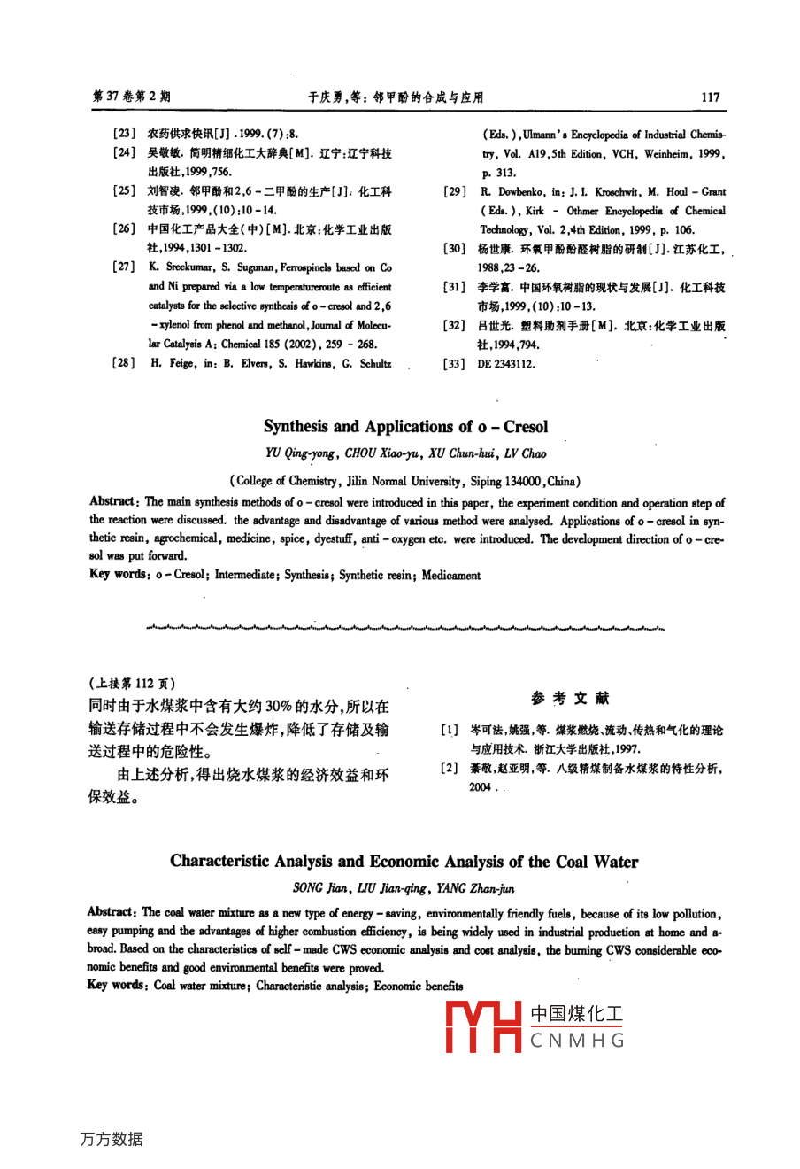 第37卷第2期化工Vol 37, No. 22008年2月iaoning Chemical IndustryFebruary, 2008水煤漿的特性分析和經(jīng)濟(jì)分析宋劍,劉建慶,楊占軍,孫章(沈陽石蜻化工有限公司,遼寧沈陽110141)要:通過對(duì)制備的水煤漿的特性分析和經(jīng)濟(jì)分析,表明了燃燒水煤漿的經(jīng)濟(jì)效益和環(huán)境效益關(guān)鍵詞:水煤漿;特性分析;經(jīng)濟(jì)效益中圖分類號(hào):TQ534.4文獻(xiàn)標(biāo)識(shí)碼:A文章編號(hào):1004-0935(200)02-011-03水煤漿由約70%研磨成一定力度的煤粉約系曲線如圖1。30%的水及少量的化學(xué)添加劑經(jīng)強(qiáng)力攪拌而成的煤水兩項(xiàng)流漿體。作為燃料,具有低污染、易泵送燃燒效率高等優(yōu)點(diǎn)。隨著近年來國內(nèi)外原油市場日益緊張,煤和油的成本差價(jià)太大。我公司用撫順老虎臺(tái)八級(jí)精煤為原料,采用北京華宇工程有限公司設(shè)計(jì)的高濃度濕法制漿工藝,并使用分散劑訴加率為0.50%南京大學(xué)的NDF水煤漿添加劑,自制水煤漿。并亠分散劑量訴加率為055%先后將12油爐改造改燒水煤漿。改燒水煤漿w2分散劑量添加率為0.60以來生產(chǎn)運(yùn)行穩(wěn)定,各項(xiàng)運(yùn)行指標(biāo)均達(dá)到設(shè)計(jì)要求。本文通過對(duì)制備的水煤漿的特性分析和經(jīng)濟(jì)濃度,%分析,表明了燒水煤漿的經(jīng)濟(jì)效益和環(huán)保效益。圖1不同的分散劑用量水煤漿濃度與粘度的關(guān)系曲線1水煤漿的制備、特性和經(jīng)濟(jì)分析由圖1可以看出,增加分散劑用量,相同濃度1.1水煤漿的特性分析下,粘度降低,但考慮到最佳性能價(jià)格比,將分散(1)分散劑用量對(duì)水煤漿粘度的影響劑的用量定為5.0g/^kg(千煤)。由于煤的主要組成部分是有機(jī)物,與水的界(2)定量同添加劑下濃度與粘度的關(guān)系面相容性較差,因此煤、水很難形成穩(wěn)定的分散體提高水煤漿的濃度可增加燃燒的熱效率。有系。而分散劑是一種界面改性劑,它可吸附在煤研究表明:水煤漿中的水份在1%-30%時(shí),每的表面改善煤粒的表面性質(zhì)強(qiáng)化煤和水的相容1%的含水量大約要降低01%的熱值,可當(dāng)提高性,使水煤漿中的煤粒子達(dá)到電荷位阻和自由穩(wěn)水煤漿的濃度時(shí),其表觀粘度也將隨之增大,給管定,從而使水煤漿具有高濃度、低粘度的流變特輸水煤漿帶來困難。所以對(duì)于某一煤種,在同添性。但分散劑的用量直接影響著水煤漿的表觀粘加劑下粘度的增大很大程度上限制了水煤漿濃度,分散劑用量大,就增加了水煤漿成本因此要度的提高。在分散劑添加率為50g/kg(干煤)找出最佳分散劑用量點(diǎn),保證既不影響水煤漿的下,球磨機(jī)出口水煤漿濃度與粘度的關(guān)系曲線見流動(dòng)性,又比較經(jīng)濟(jì)。不同的分散劑用量下濃度中國煤化工與粘度(用Nx14型旋轉(zhuǎn)粘度計(jì)測定)的關(guān)利CNMHG工程師。112遼寧化工2008年2圖2為999%,平均粒徑為30.9μm。將水煤漿靜止放置7天測得濃度為64.8%時(shí),球磨機(jī)出口(未加穩(wěn)定劑)水煤漿的沉降速率為1.5%/d,爐前罐(穩(wěn)定劑添加率為0.15g/kg(干煤))的沉降速率為02%/d,說明此粒度分布使水煤漿具有一定的穩(wěn)定性,并且由于平均粒徑較小,適合管輸和1500噴燃(4)對(duì)水煤漿其它特性的分析取成品漿測得濃度為64.7%,調(diào)整旋轉(zhuǎn)粘10006462263364.464.665,1度計(jì)的剪切速率得出在剪切速率增大時(shí)粘度降濃度%低,符合“剪切變稀”理論,另外將成品漿由60℃圖2水煤漿濃度與粘度的關(guān)系曲線等差10℃降至20℃,測得表觀粘度逐漸增大,即由圖2曲線可以看出濃度增大,粘度上升,提高水煤漿的溫度有利于漿的輸送。當(dāng)提高到一定濃度時(shí),水煤漿將失去流動(dòng)性。實(shí)1.2經(jīng)濟(jì)分析(1)可觀的經(jīng)濟(jì)效益際運(yùn)行表明,球磨機(jī)出口粘度達(dá)到2500MPa·s以我公司為例,實(shí)際運(yùn)行數(shù)據(jù)分析表明,實(shí)際時(shí),濾漿器壓差及曲桿泵電機(jī)電流均明顯增大,水上2.39t水煤漿產(chǎn)汽率(換算標(biāo)煤)才能折合1煤漿流動(dòng)困難將粘度降為2200MPa·8,流動(dòng)正噸油漿產(chǎn)汽率(換算標(biāo)煤)。我公司進(jìn)煤價(jià)格大常,此時(shí)濃度為64.5%~65.5%。加穩(wěn)定劑并約530元/t,包括設(shè)備維護(hù)、工資等費(fèi)用總成本在經(jīng)乳化剪切機(jī)剪切后爐前漿濃度為640%-1089元/左右。那么239×1089=2603元/t65.0%,粘度降為1000~1400MPa·8國際油價(jià)4500~4800元/t。因此燃燒重油與燃(3)穩(wěn)定性與粒度的關(guān)系燒水煤漿的等熱值單位燃料差價(jià)在1900~2200水煤漿性能的一個(gè)重要參數(shù)是穩(wěn)定性它表元。燃料成本下降達(dá)到4%。每年可創(chuàng)利上千明在水煤漿體中固體煤炭顆粒保持均勻分散懸浮萬元。同時(shí)節(jié)省下的燃燒油可作為商品油外賣。狀態(tài)的性質(zhì)。為了保證其穩(wěn)定性就要求水煤漿與燃料油相比水煤漿中的硫的含量低的多不需具有合理的粒度分布特性。當(dāng)水煤漿的濃度為要脫硫裝置。64.8%,粘度為120MPa·8時(shí),用BT-2002水(2)良好的環(huán)境效益煤漿激光粒度儀測得水煤漿的粒度分布如圖。由于水煤漿中含有大約35%的水分,燃燒后1000便于灰塵集中通過靜電除塵器能及時(shí)除去,有利9.0于粉塵控制。從靜電除塵器下來的干灰,可以賣800}}到水泥廠,濕灰及灰渣可以賣