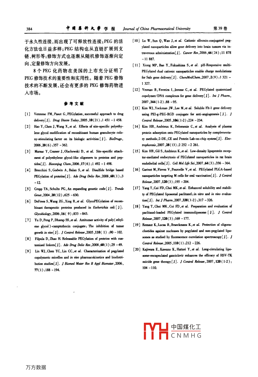 中國其科大學(xué)學(xué)報(bào)Journal of China Pharmaceutical University 2008 ,39(4) :379 - 384379●綜述.聚乙二醇化技術(shù)在藥物轉(zhuǎn)運(yùn)系統(tǒng)中的研究進(jìn)展田法,姚文兵"(中國藥科大學(xué)生命科學(xué)與技術(shù)學(xué)院,南京20009)摘要:聚乙二醇化技術(shù)又稱為 PEG修飾技術(shù),是目前分子變構(gòu)化學(xué)中最重要的技術(shù)之一。經(jīng)過近幾十年的發(fā)展,PEG化技術(shù)不僅在蛋白質(zhì)類藥物的開發(fā)中得到普遍的應(yīng)用,而且巳擴(kuò)展到新型藥物載體、控釋制劑等各個(gè)領(lǐng)域。本文從.PEG化蛋白質(zhì)類藥物、PEG化疏水性藥物、PEG化納米共聚物給藥系統(tǒng)以及PEG化脂質(zhì)體等方面對(duì)近年來PEG化技術(shù)在藥物轉(zhuǎn)運(yùn)系統(tǒng)中的應(yīng)用及研究進(jìn)展進(jìn)行了綜述。關(guān)鍵詞PEG 化;聚乙二醇;化學(xué)修飾;藥物轉(zhuǎn)運(yùn)系統(tǒng)中團(tuán)分類號(hào)R914文獻(xiàn)標(biāo)識(shí)碼A文章編號(hào) 1000 - 5048(2008)04 -0379 -06Advances in PEGylation in drug delivery systemsTIAN Hong, YAO Wen-bing"School of life Seience and Technology, China Pharmaceutical Unieriy, Nanjing 210009, ChinaAbstract: PEGylation, s0 called polyethylene glycol mdification or chemical modifcation, is one of the mostimportant technologies in molecular alosteric chemistry. In recent years, PEGylation has not only been applied inthe development of protein pharmaceuticals, but also been expanded to many new fields such as drug carriers andcontrolled-release preparations. The latest investigation and application of PEGylation in drug delivery systemincluding pegylated protein drugs, pegylated copolymeric micelles, pegylated liposomes, etc, were reviewed in thispaper.Key words PEGyaion; plyebhylene glycol; chemical modificatin; drug delivery sytemThis study was suported by the National Naturul Science Founndaion of China (No. 30772679, No. 30672559)聚乙二醇化( PEGylation)又稱為PEG修飾,是學(xué)與生命科學(xué)的相互滲透與交融,給生命科學(xué)的研目前分子變構(gòu)化學(xué)中最重要的技術(shù)之一。PEC化究帶來了新的突破和重要的發(fā)展。本文就近年來技術(shù)的研究始于20世紀(jì)70年代, Abuchowski等第PEG化技術(shù)在這方面的應(yīng)用及研究進(jìn)展作一一次將聚乙二醇共價(jià)結(jié)合到蛋白質(zhì)上,以保護(hù)蛋白綜述。質(zhì)免遭破壞,通過聚乙二醇修飾不僅可以增加蛋白質(zhì)的水溶性,還能減少腎臟的清除,優(yōu)化蛋白質(zhì)的1 PEG 化的蛋白質(zhì)類藥物藥動(dòng)學(xué)和藥效學(xué)性質(zhì)。從此,國內(nèi)外的研究人員開1990年P(guān)EC化的S-腺苷脫氨酶獲FDA批準(zhǔn)始關(guān)注用高分子化合物對(duì)生物大分子結(jié)構(gòu)進(jìn)行修上市,使PEC化技術(shù)開始真正走向市場(chǎng)。到2008飾,以克服蛋白質(zhì)類藥物在臨床應(yīng)用中的困難。經(jīng)過幾十年的發(fā)展, PEG化技術(shù)不僅在蛋白質(zhì)類藥年共有8種PEG化生物技術(shù)藥物獲得FDA批準(zhǔn)上物的開發(fā)中得到普遍的應(yīng)用,而且已擴(kuò)展到新型藥市(見表1) ,還有十幾種藥物處于臨床或臨床前研物載體控釋制劑等各個(gè)領(lǐng)域"。這種高分子化究階段中國煤化工收稿日期2008-01-16'通訊作者Tel:025 -83271375 E-mail:wbyeTYHCNMHG基金項(xiàng)目國家 自燃科學(xué)基金資助項(xiàng)目(Na. 30772679 ,Na.30672559)380中國巢科大學(xué)學(xué)報(bào)Journal of China Phamaceutcal University第39卷表1美國FDA 已批準(zhǔn)的PEC化藥物半胱氨酸的蛋白質(zhì)容易形成聚合體,會(huì)給后續(xù)研究商品名有效成分生產(chǎn)公司適應(yīng)證帶來干擾。PECADA PEG-S-腺 昔脫氨酶Enon和ADA相關(guān)的免疫缺陷最近,倫敦大學(xué)的Brocchini等(4)設(shè)計(jì)出一種針綜合癥ONCASPAR PEG天冬酰胺酶Enzon急性淋巴細(xì)胞性白血病對(duì)二硫鍵的定點(diǎn)PEG修飾劑,使用這種修飾劑的方PEC-IFN PEC-IFNa-2bSchering丙型肝炎法包括兩個(gè)步驟:首先,將蛋白質(zhì)中天然存在的二硫NEULASTA PEG-G-CSFAmgen腫瘤化療 后中性粒細(xì)胞鍵還原成兩個(gè)巰基;然后,用一個(gè)連接有PEG鏈的PEGASYS PEC-IFNa-2a Roche 丙型肝炎三碳橋?qū)蓚€(gè)巰基重新連接起來(見圖1)。SOMAVERT PEC-生長(zhǎng)激素Pize肢端肥大受體拮抗劑MacugenPEG抗VECF Pize年齡相關(guān)性黃斑變性disufide、抗體MircenPEG促紅細(xì)胞Roche生成素βR-PEGprotein-隨著PEG化技術(shù)的深入發(fā)展,早期直鏈、低相對(duì)分子質(zhì)量、隨機(jī)修飾的PEG化技術(shù)顯現(xiàn)出一定Figure 1 lustrationo o disulide bridging PEGylation with a theecar的局限性,如:產(chǎn)物不均一、修飾后蛋白質(zhì)生物活性bon bridge spanning the oniginal doulide bond降低等。為了克服這些缺點(diǎn),近年來PEG化技術(shù)這種修飾劑可以對(duì)含有二硫鍵的各種細(xì)胞因呈以下幾種發(fā)展趨勢(shì)。子抗體、酶等天然蛋白質(zhì)進(jìn)行修飾,而不破壞蛋白1.1 定點(diǎn)PEG化試劑的發(fā)展隨著PEG修飾技術(shù)的發(fā)展, PEG定點(diǎn)修飾已質(zhì)空間結(jié)構(gòu)和生物活性。此外,該研究聚乙二醇化經(jīng)成為主要發(fā)展方向。一個(gè)恰到好處的修飾位點(diǎn),技術(shù)在藥物轉(zhuǎn)運(yùn)系統(tǒng)中的研究進(jìn)展還顯示,這種修不僅會(huì)使修飾后蛋白保留大部分原有活性,還會(huì)對(duì)飾過程中未被修飾的蛋白可以回收重新利用,從而隨后的分離純化工藝