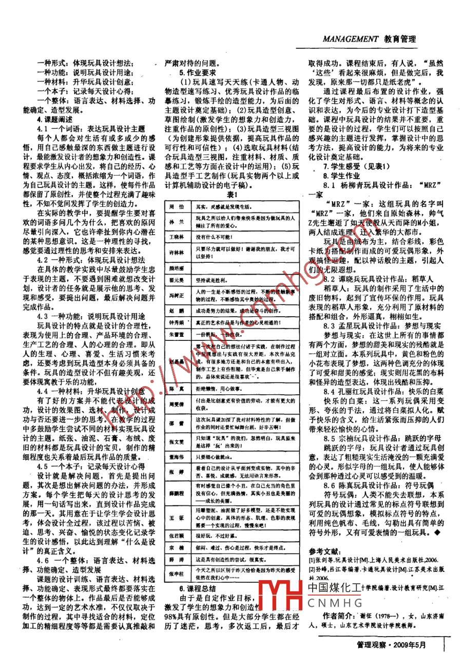 MANAGEMENT教育管理- 種形式:體現(xiàn)玩具設(shè)計想法;嚴(yán)肅對待的問題。取得成功。課程結(jié)束后,有人說,“雖然種功能:說明玩具設(shè)計用途:5.作業(yè)要求‘這些’看起來很麻煩,但是做完后,我-種材料:升華玩具設(shè)計創(chuàng)意:(1)玩具速寫天天練(卡通人物、動發(fā)現(xiàn), 原來那一切都只是紙老虎”。一個本子:記錄每天設(shè)計心得:物造型速寫練習(xí)、優(yōu)秀玩具設(shè)計作品的臨通過課程最后布置的設(shè)計作業(yè),強(qiáng)一個整體:語言表達(dá)、材料選擇、功摹練習(xí), 鍛煉手繪的造型能力,為后面的化了 學(xué)生對形式、語言、材料等概念的認(rèn)能確定、造型發(fā)展。主題設(shè)計奠定基礎(chǔ)); (2)玩具造型創(chuàng)意、識和表達(dá), 為今后的專業(yè)設(shè)計打下造型基4.課題闡述草圖繪制(激發(fā)學(xué)生的想象力和創(chuàng)造力,礎(chǔ)。課程中玩具設(shè)計的結(jié)果并不重要,重4.1一個詞語:表達(dá)玩具設(shè)計主題注重作品的原創(chuàng)性): (3)玩具造型三視圖要的是 設(shè)計的過程,學(xué)生們可以按照自己每個人都會對生活有或多或少的感( 為創(chuàng)建形象提供依據(jù),提高玩具作品的感興趣的主 題進(jìn)行發(fā)揮,掌握設(shè)計中的思悟,用自己感觸最深的東西做主題進(jìn)行設(shè) 可行性和可信性) ; (4)選取玩具材料(結(jié) 考方法,提高設(shè)計的能力,為將來的專業(yè)計,最能激發(fā)設(shè)計者的想象力和創(chuàng)造性。課合玩具造型三視圖, 注重材料、材質(zhì)、質(zhì)化設(shè)計奠定 基礎(chǔ)。程要求學(xué)生從內(nèi)心出發(fā),將自己的經(jīng)歷、心感和工 藝等方面在設(shè)計中的運用): (5)玩7.學(xué)生感受(見表1)情、觀點、態(tài)度,概括濃縮為一個詞語,作具造 型手工藝制作(玩具實物兩個以上或8.學(xué)生作業(yè)為自己玩具設(shè)計的主題。這樣,使每件作品計算機(jī)輔 助設(shè)計的電子稿) .8.1楊柳青玩具設(shè)計作品: “MRZ"都保留了原創(chuàng)性,并使整個過程充滿了趣味表1性,不知不覺間發(fā)揮了學(xué)生的創(chuàng)造力。周怡其實,貝夠就是發(fā)現(xiàn)生活。'MRZ"一家:這組玩具的名字叫在實際的教學(xué)中,要提醒學(xué)生要對喜孫蘭玩具之所以給人們帶來快樂是因為做玩具的人“MRZ”一家,他們來自原始森林,帥氣歡的詞語多問幾個為什么,把喜歡的原因2先生邂逅了如天使般從天而降的M小姐,盡最引向深入,它也許牽扯到你內(nèi)心潛在兩人結(jié)成連理,遷入繁華的大都市。王曉林沒有什么不可能!的某種思想意識。這是一種理性的尋找,玩具是由絨布為主,結(jié)合彩線,彩色感覺要通過理性的思考和安排來表達(dá)。許林林只要盡力就可以做好!謝謝我的朋友。我才可卡紙為搭配制作而成的可愛玩偶形象,外4.2一種形式:體現(xiàn)玩具設(shè)計想法以堅持!觀搞怪逗趣,配以神話般的主題,引起人在具體的教學(xué)實踐中盡最鼓勵學(xué)生忠頗培圈們的尤限遐想。于表現(xiàn)的主題,不要遇到困難就想改變計瞿元昊堅持就是勝利。8.2譚曉兵玩具設(shè)計作品:稻草人劃,設(shè)計者的任務(wù)就是展示他的思考、發(fā)馮樹正人的一生是不斷感悟的過耀,不斷的摟觸新事稻草人:玩具的制作采用了生活中的現(xiàn)和感受,要提出問題,最后解決問題并物的過程,不斷感怕其中奧妙的過程。廢舊物料,起到了宣傳環(huán)保的作用。玩具完成作品。趙鵬成功是努力的結(jié)果,成功是奮斗的創(chuàng)作。表現(xiàn)的稻草人形象,充分利用了原材料的4.3 -種功能:說明玩具設(shè)計用途鐘秀娟‘真正的藝術(shù)作品是與作者的心靈相通的!搭配和組合,外形逼真,栩栩如生.玩具設(shè)計的特點就是設(shè)計的合理性,8.3孟星玩具設(shè)計作品:夢想與現(xiàn)實表現(xiàn)為使用上的合理、產(chǎn)品環(huán)境的合理、朱蕾萱一份耕耘,一份收獲。夢想與現(xiàn)實:在這世上所有的事情都生產(chǎn)工藝的合理、人的心理的合理。即從第一次把自己的想法付諸于實敗,在制作過程有兩個方面,夢想的甜美和現(xiàn)實的殘酷就是人的生理、心理、喜愛、生活習(xí)慣來考中發(fā)現(xiàn)想法與實踐有很大差距,本次作醋兗一組對立面。本系列玩具中,黃色和粉色的慮,還要考慮到玩具造型本身必須具備的趙晶| 成。 有很多地方還是和自己的本意有些出入,小花布表現(xiàn)了夢想,這兩種色調(diào)充分的體現(xiàn)條件。玩具的造型設(shè)計不但有趣美觀,還制作工藝上有些粗糙,但畢竟是自己來手制作了可愛和甜美的感覺;現(xiàn)實則用花黑的布料的??傮w來說還是很喜歡-要體現(xiàn)寓教于樂的功能,和怪異的造型表達(dá),體現(xiàn)出殘酷和壓抑。4.4一種材料:升華玩具設(shè)計創(chuàng)意拒絕懶情,用心做事. .8.4孔麗紅玩具設(shè)計作品:快樂的白菜有了好的方案并不能代表設(shè)計的成同雯倩付出是比創(chuàng)意更有價值的勞動,才能有更大的快樂的白菜:這- -系列玩偶采用變功,設(shè)計的效果圖、選材、制作,設(shè)計成收快。形、夸張的手法,通過將白菜擬人化。賦功與否還要進(jìn)一步的思考。在教學(xué)的過程這次玩具課如璨了我對材料特性的了解,但做予快樂的含義,給生活緊張而壓抑的人們中多鼓勵學(xué)生嘗試不同的材料實現(xiàn)玩具設(shè)