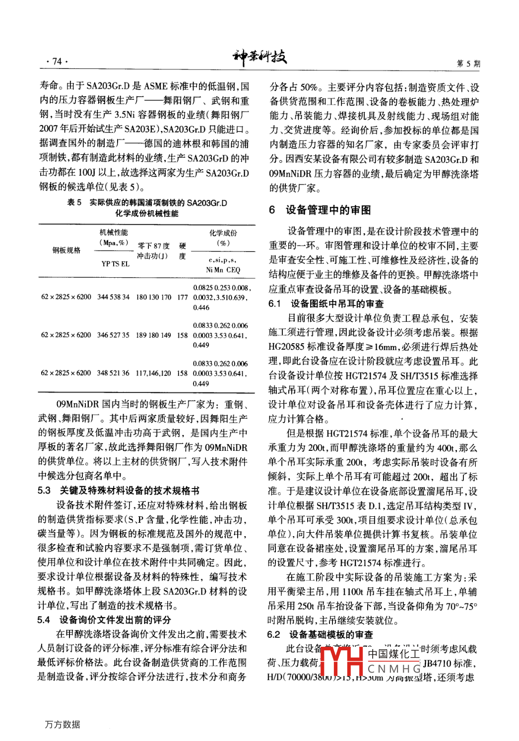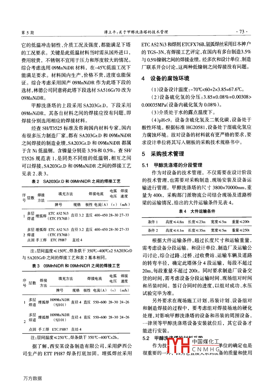 第11卷第5期VOL II NO 5神拳技2013年9月Sep.2013關于甲醇洗滌塔的技術管理譚立平(中國神華煤制油化工有限公司北京工程分公司,北京,100011)摘要:在合成氣凈化裝置中,甲醇洗滌塔是凈化單元非常重要的一臺設備,由于其壓力高(中壓38MPa),又是低溫容器(-70℃),為了保證設備在生產(chǎn)過程中長周期運行,在設計、制造和安裝過程中,須全程進行管理,本文主要論述甲醇洗滌塔的技術管理。關鍵詞:甲醇洗滌塔材料管理焊接中圖分類號:TQ2文獻標識碼:B文章編號:1674-8492(2013)05-072-041前言的材料,在設計制造方面有特殊的補充要求塔體的上段選材,根據(jù)甲醇洗滌塔的設備工況,在工程公司的項目設備管理中,由于管理的內(nèi)須選擇低溫壓力容器用鋼。09 MnNiDR是國內(nèi)最好的容較多需和公司各專業(yè)工程技術人員設計單位技抗低溫N鋼板含N量05%,它的使用溫度為-70℃。術人員施工單位技術人員制造單位技術人員進行而塔上段的設計溫度為-70℃,沒有溫度富裕。另外溝通與聯(lián)系,解決設備的設計、采購制造和安裝等09 MnNiDR根據(jù)GB3531-96標準,國內(nèi)鋼廠此材料·系列問題。因煤制氫裝置需管理的設備較多,本文最大鋼板厚度不超過60mm(GB3531-2008標準鋼板論述煤制氫的重要設備——甲醇洗滌塔設備的技術最大厚度可用到120mm),沒有厚度富裕,且國內(nèi)當管理。時09 MnNiDr用于設計溫度為-70℃的業(yè)績不多2甲醇洗滌塔的設備參數(shù)當時該鋼種只用到-50℃的低溫,-70℃未實際使用過,焊接工藝稍有不當,-70℃的沖擊功達不到標準甲醇洗滌塔是低溫甲醇洗單元中的主要設備之要求(現(xiàn)在09 MnNiDR已有多年使用業(yè)績,可用于。甲醇洗滌塔的設備數(shù)據(jù):工藝介質(zhì):變換合成氣+此工況)。甲醇,上段設計溫度約為-70℃C,下段設計溫度約為查ASME2004《鐵基材料》SA20表A215中低溫45℃,上下段設計壓力都為38MPa,直徑約為38m。材料,知SA662及SA537的含N量較低,在厚度50此塔為板式吸收塔,利用低溫甲醇吸收二氧化碳及硫75mm范圍內(nèi),使用溫度為-60℃以上(在滿足沖擊功化氫能力強的特點塔的上段甲醇吸收變換工藝氣體的前提下),也不滿足設計工況的要求。SA203GrA、B中二氧化碳(塔下切線至上下段連接焊縫約42m),塔含N量2.5%,在滿足平均沖擊功20J的條件下,最的下段甲醇吸收工藝氣體中的硫化氫(塔上切線至大使用厚度為60m,不滿足鋼板厚度要求上下段連接焊縫約19m)。此塔筒體兩切線相距約SA203GrD的焊N量為35%,在設備壁厚50-75mm6lm,塔內(nèi)設雙溢流塔盤,第二類壓力容器(見表1)范圍內(nèi),能用于-87℃以上(即沖擊功符合標準規(guī)范表1變換合成氣進入甲醇洗滌塔前的化學成份(%)要求)的溫度。故此遵照林德工藝要求,塔上段為SA203GrD。H2HS+COS其它塔體下段選材必須能耐-45℃的低溫,國內(nèi)材料55.01.038.50.085.4216MnDR只能用于_40℃的工況,不滿足要求。3塔體的選材SA516Gr70在-45℃工況下,使用鋼板厚度上限為35mm(查2004ASME規(guī)范),即使用厚度≤35mm。甲醇洗滌塔的選材,在設備技術管理中非常重根據(jù)相V凵中國煤化工其計算厚度需要,國內(nèi)有專門的低溫鋼標準規(guī)范(如GBl50附錄C56mm,顯然ˉCNMHG也不能滿足要和HGT20585)。國外在ASME規(guī)范中,對低溫鋼部分求。下段可以采用SA203GrD、SA662及SA537材料第5期譚立平:關于甲醇洗滌塔的技術管理73·它的低溫沖擊韌性介質(zhì)工況及強度都能滿足下塔 ETCAS2N3和焊劑 ETCFX76B,氬弧焊絲采用日本神戶的工況要求。關鍵是此低溫材料當時需從國外進口,的TGS-3N,有焊接工藝評定,在國內(nèi)有多臺制造3.5%費用較貴,不銹鋼不宜用于壓力和厚度較大的情況。與05%鎳鋼之間的焊接業(yè)績。經(jīng)多次和設計單位、制造綜合考慮選用09 MnNiDR材料,在45℃低溫工況下廠聯(lián)系開會討論,這兩種低鎳鋼之間焊接沒有問題能滿足要求。材料國內(nèi)生產(chǎn),價格不貴,進度也能保證。綜合考慮采用國產(chǎn)09 MnNiDR作為此塔下段的4設備的腐蝕環(huán)境選材,林德公司同意將此塔下段選材SA516Gr70改為(1)設備設計溫度:-70°℃<60+2×3.85=676℃。09 MnNiDr。(2)設備硫化氫的分壓:3.85×0.08%=0.00308>甲醇洗滌塔的上段采用SA203GrD,下段采用00005Pa(設備內(nèi)硫化氫為008%)09 MnNiDR,其各自材料之間的焊接應沒有問題,即(3)介質(zhì)處于水的露點溫度下。焊接分別選用相應的焊接材料。(4)pH<9。設備含硫化氫及二氧化碳,設備處于經(jīng)查SHT3525標準及咨詢國內(nèi)材料專家,國內(nèi)酸性環(huán)境。根據(jù)標準HC20581,設備處于濕硫化氫應有很多壓力制造廠家,都有SA203GrD和0 MnNiDR力腐蝕環(huán)境。故對設備的材料就有更嚴格的要求,要之間焊接的制造業(yè)績,SA203CrD和09MnN】DR都屬求設計單位將其寫入鋼板的采購技術規(guī)格書中。于含N低溫鋼,含鎳量分別是3.5%和0.5%。查SHT3526規(guī)范表1,是同類不同組的低溫鋼,相互之間5采購技術管理可以焊接。SA203GrD和09 MnNiDR之間的焊接工藝5.1甲醇洗滌塔的分段管理見表2、表3。作為對設備的技術管理,不僅需要在設計階段表2SA203GrD和09 MnNIDE之間的焊接工藝的技術管理,也需要對采購制造、現(xiàn)場安裝及設備運輸進行管理。甲醇洗滌塔的尺寸3800×70000m,重電弧焊接序焊接填充方法層數(shù)焊接電流電壓速度量為400t,采購部門派物流公司結(jié)合現(xiàn)場及道路橋牌號規(guī)格極性電流(A)(y)(mh)梁的運輸情況,給出的大件運輸條
