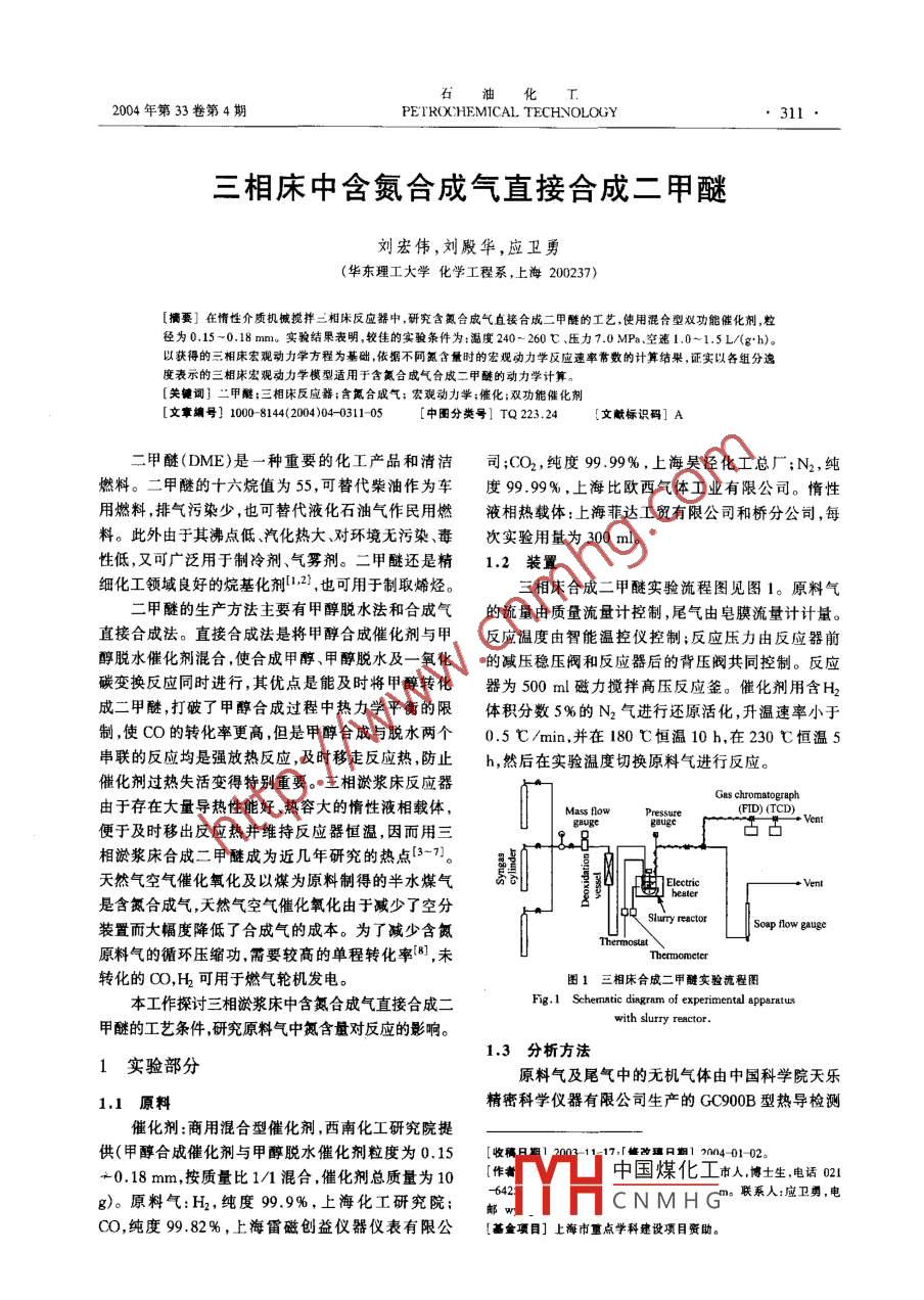 三相床中含氮合成氣直接合成二甲醚