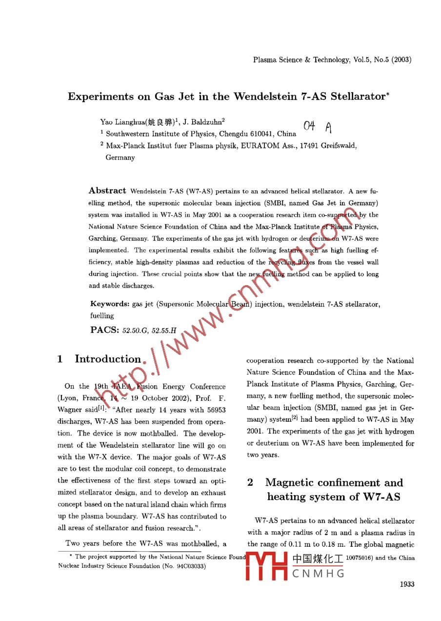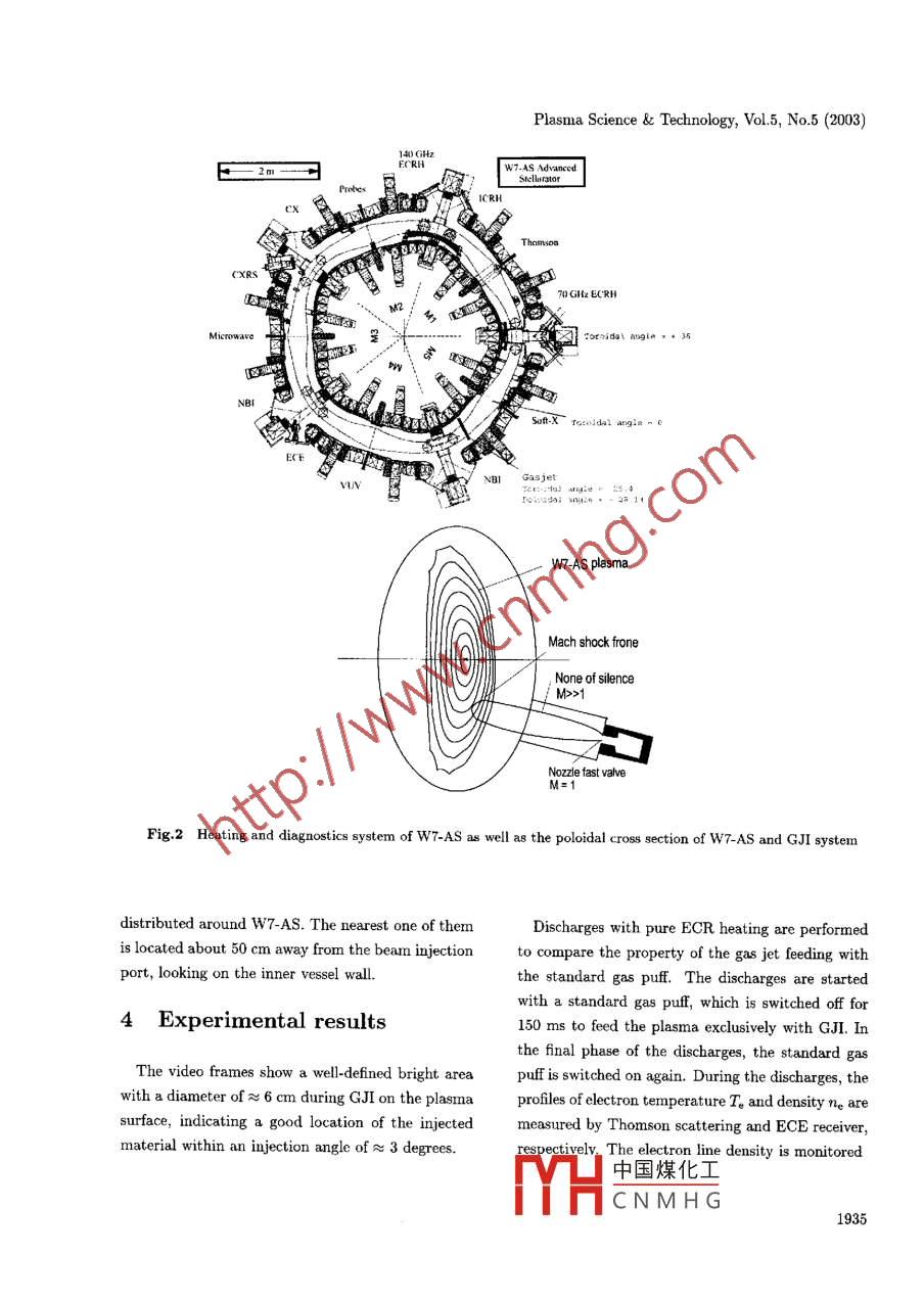 Plasma Science Technology, Vol 5, No 5(2003)Experiments on Gas Jet in the Wendelstein 7-as Stellarator*Yao lianghua(姚良驊)1, J. Baldzuhn21 Southwestern Institute of Physics, Chengdu 610041, China0+ AMax-Planck Institut fuer Plasma physik, EURATOM Ass, 17491 GreifswaldGermanyAbstract Wendelstein 7-AS(W7-AS)pertains to an advanced helical stellarator. A new fu-elling method, the supersonic molecular beam injection(SMBI, named Gas Jet in Germany)system was installed in W7-AS in May 2001 as a cooperation research item co-supported by theNational Nature Science Foundation of China and the Max -Planck Institute of Plasma PhysicsGarching, Germany. The experiments of the gas jet with hydrogen or deuterium on W7-AS wereimplemented. The experimental results exhibit the following features such as high fuelling ef-ficiency, stable high-density plasmas and reduction of the recycling fluxes from the vessel wallduring injection. These crucial points show that the new fuelling method can be applied to longand stable discharges.Keywords: gas jet(Supersonic Molecular Beam) injection, wendelstein 7-AS stellarator,fuellingPACs:52.50G,52.55.H1 Introductioncooperation research co-supported by the NationalNature Science foundation of china and the maxOn the 19th IAEA Fusion Energy ConferencePlanck Institute of Plasma Physics, Garching, Ger(Lyon, France, 14 N 19 October 2002), Prof. Fmany, a new fuelling method, the supersonic molecWagner said(l:"After nearly 14 years with 56953gas jet indischarges, W7-AS has been suspended from opera- many)systern 2) had been applied to W7-AS in Maytion.The device is now mothballed. The develop- 2001. The experiments of the gas jet with hydrogenment of the Wendelstein stellarator line will go on or deuterium on W7-AS have been implemented forwith the w7-X device. The major goals of W7-ASare to test the modular coil concept, to demonstratethe effectiveness of the first steps toward an opti- 2 Magnetic confinement andmized stellarator design, and to develop an exhaustheating system of W7-ASconcept based on the nat ural island chain which firmsup the plasma boundary. W7-AS has contributed toW7-As pertains to an advanced helical stellaratorareasof stellarator and fusion researchwith a major radius of 2 m and a plasma radius inTwo years before the W7-AS was mothballed. a the range of 0.11 m to 0. 18The project supported by the National Nature Science Foune中國(guó)煤化工1005060 and the ChinaNuclear Industry Science Foundation( No. 94C03033)YHCNMHGYao Lianghua et al.: Experiments on Gas Jet in the Wendelstein 7-AS Stellaratormoula" corner coiltriangularplatelliot cal planeLasma tr Midal lichI ccilFig 1 Magnetic confinement coil system and limiters of W7-ASstructure of w7-As with limiters is shown as inThe orientation of gas jet injection(GJI)systemFig 1. W7-AS is a flexible system comprising 45 is on the sectorof M5 with a toroidal angle of-254omodular cojich produce both toroidal and and a poloidal angle of-28.poloidal field components with [=2 and l=3 injection system. The valve used for producing gasdominant poloidal components. An additional sejet is a fast gas valve(type series 99, General Valveof toroidal field coils enables change of rotational Corp, Fairfield, USA)with a Laval nozzle orificetransform. Five separately operated modular coilsof 0. 1 mm diameter, which is installed on a rect-at the corners of the pentagon-like shaped system angular port of the vacuum vessel, as shown in Figwith a n=5 toroidal symmetry allow variation of 2. No skimmer is used in front of the orifice. Thethe toroidal mirror ratio. The plasma position can distance between the nozzle and the edge plasma isbe changed with vertical field coils, and an ohmic about 108 cm, which is two and a half times longersystem was used to modify rotational transform, to than the distance for the beam injection in HL-1Mstudy current-driven instabilities, or to compensatetokamak. To maintain a low background pressurethe bootstrap current. Five pairs of in-vessel controljet injection, a turbo-molecular pumpcoil(top-bottom) being allowed to change the Bspacity 31/sec) is installed half-way be-field spectrum, were used to vary the edge island size tween the plasma and the fast valve. To protect thealong with its connection length employed for diver- fast valve against stray magnetic fields from W7-AStor operationcoil system, a 5 mm thick shield of tempered steelPlasma heating of W7-AS was done with ECRHype ST33)is applied around it. Beside the fast(70 GHz, 140 GHz, 2.4 MW absorbed power, NBI valve, a standard video camera(type Panasonic GP2.8 MW absorbed power, in the last phase with KS162HDE)is installed on the common flange withall-co or all-ctr orientation), and ICRH(up to 1 Mw the fast valve, the camera looks in parallel to theheating conditions.For the experiments the gas pressures between 0.5MPa and 5 MPa are applied and the working gas is3 Arrangement of gas jet injechydrogen or deuterium. The pulse duration of thetion system in W7-AS中國(guó)煤化工nd 40 ms. A system ofors IsCNMHG1934Plasma Science Technology, Vol5, No 5(2003)W7 AS AdvanTharrosCXRTO GHz ECRHSof-x Rosendal angia -cW7-AS plasmaMach shock froneNone of silenceNozzle fast valveFig 2 Heating and diagnostics system of W7-AS as well as the poloidal cross section of W7-AS and GJI systemdistributed around W7-AS. The nearest one of themDischarges with pure ECR heating are performedis located about 50 cm away from the beam injection to compare the property of the gas jet feeding withort, looking on the inner vessel wallthe standard gas puff. The discharges are startedwith a standard gas puff, which is switched off fo4 Experimental result150 ms to feed the plasma exclusively with GJI. InThe video frames show a well-defined bright areapuff is switched on again. During the discharges, thewith a diameter of a 6 cm during GJI on the plasma profiles of electrosurface, indicating a good location of the injected measured by Thomson scattering and ECE