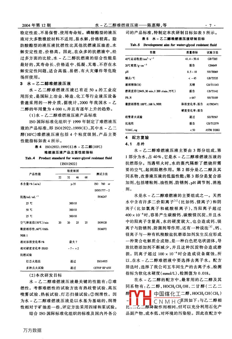 文章編號(hào):1003-0794(2004)12000603水-乙二醇難堪液壓跟陳惠卿,楊華(中石化長城潤滑油公司,北京100085)摘要:敘述了難燃液壓液的分類及水-乙二醇在難燃液壓液中的重要地位,同時(shí)敘述了水乙二醇難燃液壓液的產(chǎn)品標(biāo)準(zhǔn)、國內(nèi)外主要制造商的產(chǎn)品的典型數(shù)據(jù)及使用水一乙二醇難燃液壓液的注意事項(xiàng)。長城公司本次研發(fā)的水-乙二醇難燃液壓液產(chǎn)品達(dá)到研制目標(biāo)及國內(nèi)外同類產(chǎn)品水平。關(guān)鍵詞:難燃;液壓;水-乙二醇中圖號(hào):TH37;TD4文獻(xiàn)標(biāo)識(shí)碼:A1前言表2GB/T76312-2003關(guān)于難燃液壓液分類的部分隨著現(xiàn)代工業(yè)生產(chǎn)向高速、高溫和大容量方向Tab 2 Classes of waterglycol resistant fuld in發(fā)展,解決因油品的噴濺、泄漏引起的火災(zāi)事故已成GB/T7631.2-1987為人們所關(guān)心的重要課題。不少行業(yè)高溫、高壓的產(chǎn)品符號(hào)類型組成和特性設(shè)備,需要使用難燃液壓液如表1所示。因此,抗燃含水型水包油型乳化液HFAE通常含水量大于80%介質(zhì)日益得到重視和迅速發(fā)展化學(xué)水溶液HFAs通常含水量大于80%表1使用難燃液壓液的行業(yè)及設(shè)備油包水乳化液Tab1 Industry and equipment using water-glycol含聚合物水溶液(HFC通常含水量大于35%resistant fluid合成液磷酸酯無水合成液·1HFDR三烷基、三芳基烷基芳基磷酸酯行業(yè)用油設(shè)備其他成分的無水合成1HDU脂肪酸酯煉焦廠、煉鐵廠、連鑄廠、無縫鋼管廠攔焦車、連續(xù)澆鑄、滾軋機(jī)、爐子注:[“]這類液體也可滿足HE品種規(guī)定的生物降解性和毒性控制液壓剪切機(jī)等要求各類抗燃液壓液的性能比較如表3所示發(fā)電汽輪發(fā)電的電液伺服調(diào)節(jié)系統(tǒng)衰3各類抗燃液壓液的性能比較飛機(jī)液壓系統(tǒng)Tab 3 Performance constraction between waterglycol汽車制遣感應(yīng)淬火系統(tǒng)resistant fluids制鋁液壓系統(tǒng)乳化液型芯機(jī)、壓模機(jī)、爐子控制性能磷酸酯脂肪酸酯O/wW/O注塑機(jī)注射壓模壓模機(jī)抗燃性鍛造和擠壓鍛壓機(jī)、擠壓機(jī)、移動(dòng)設(shè)備潤滑性裝配成型壓機(jī)、自動(dòng)焊接機(jī)、運(yùn)輸機(jī)、爐子控制抗腐蝕性石油、化工、動(dòng)力空氣壓縮機(jī)、蒸氣和燃?xì)馔钙椒冷P性良不良良優(yōu)采煤連續(xù)采煤機(jī)、測(cè)位車、帶式輸送機(jī)聯(lián)軸節(jié)常用壓力葉片泵352難燃液壓液產(chǎn)品分類標(biāo)準(zhǔn)及其性能對(duì)比柱塞泵25密封材料適應(yīng)性(適用的)大部分橡膠丁晴丁晴氟膠硅膠大部分橡膠so國際標(biāo)準(zhǔn)化組織于1999年修訂了ISO6743塑料的適應(yīng)性4/1982液壓油(液)產(chǎn)品分類標(biāo)準(zhǔn),我國于2003年潤滑性小小小大等效了上述國際標(biāo)準(zhǔn)化組織的標(biāo)準(zhǔn),制定了GB/混入水分對(duì)T76312-2003,即潤滑劑、工業(yè)用油和相關(guān)產(chǎn)品(L性能的影響鑄性小小小大大穩(wěn)定性小小小大大類)的分類第2部分:H組(液壓系統(tǒng)),關(guān)于難燃液與礦不自自不良不良?jí)阂旱漠a(chǎn)品本版標(biāo)準(zhǔn)與上版(GB76312-1987)的保中國煤化工難g昌區(qū)別是去掉了HFDS(氯化烴無水合成液)、HFDT(磷壽CNMHG酸酸型與氯化烴型混合的無水合成液),現(xiàn)行的難燃經(jīng)濟(jì)適中便宜便宜液壓液的產(chǎn)品分類標(biāo)準(zhǔn)如表2所示從表3可看出,油包水型和水包油型的乳化液2004年第12期水-乙二醇難燃液壓液——陳惠卿,等7穩(wěn)定性差、不易保管、使用壽命短。磷酸酯型的液壓同的產(chǎn)品標(biāo)準(zhǔn),特制定本次研制目標(biāo)如表5所示。液對(duì)大多數(shù)橡膠材料不適用,易水解,價(jià)格較高。脂表5水一乙二醇難燃液壓液研制目標(biāo)肪酸酯型的液壓液抗燃性比其他抗燃液壓油差,水Tab.5 Development aim for waterglycol resistant auld解安定性差,價(jià)格高。因此,在眾多的抗燃液中,經(jīng)性能質(zhì)量指標(biāo)試驗(yàn)方法過多方面的比較,水-乙二醇抗燃液的綜合性能是40℃運(yùn)動(dòng)粘度/m2,s14l4-50.6最好的,其壽命長、價(jià)格適中、低凝、無毒、不存在水20℃密度/gm3解安定性問題,適合高溫、易燃、有火災(zāi)爆炸等危險(xiǎn)8.5-10SH/TO069場(chǎng)所使用。傾點(diǎn)/℃453水一乙二醇難燃液壓液液相銹蝕(B)GB/T11143水-乙二醇難燃液壓液已有近50a的工業(yè)應(yīng)磨斑直徑(N,30mi,120m,t)報(bào)告用歷史,是國際上冶金、鑄造、化工等行業(yè)液壓設(shè)備PN普遍采用的一種介質(zhì),據(jù)統(tǒng)計(jì),200年我國水一乙橡膠相溶性1℃,1h,NBR體積變化率:報(bào)告 ASTMD47二醇的年用量為4000t,并且有逐年上升的趨勢(shì)硬度變化率:報(bào)告(1)水-乙二醇難燃液壓液產(chǎn)品標(biāo)準(zhǔn)歧管著火試驗(yàn)通過SH/Tm567IsO國際標(biāo)準(zhǔn)化組織于1999年制定了難燃液壓抗泡性報(bào)告液的產(chǎn)品標(biāo)準(zhǔn),即IsO12922:199(E),其中水-乙二Ⅴ04C,mgASTM D2882醇(HFC)難燃液壓液包括4個(gè)粘度級(jí)別,產(chǎn)品主要性能指標(biāo)如表4所示4配方復(fù)驗(yàn)表4IsO12922:199(E)水-乙二醇(HFC)4.1原料難燃液壓液產(chǎn)品主要性能指標(biāo)水-乙二醇難燃液壓液主要由3部分組成,第Tab 4 Product standard for water-glycol resistant nuid1部分為水,占40%,它是水醇難燃液壓液的Iso12922抗燃部分。當