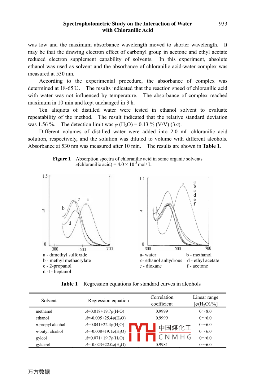 Chinese Chemical Letters Vol. 16, No.7, pp 931-934, 2005931http://www.imm.ac.cn/jourmalccl.htmlSpectrophotometric Study on the Interaction of Water withChloranilic Acid and its A nalytical ApplicationFeng Lin ZHAO'*, Xi Lan FENG, Xue Jing LIU, Na LI', Ke An LI' .1 Department of Chemistry, Peking University, Beijing 1008712 Vocational-Technical Teachers College, Henan 4530033 Experimental Center of Zaozhuang Teachers Collge, Shandong 277160A bstract: The reaction between chloranilic acid and water in alcohol was studiedspectrophotometrically. The conditions of reaction were investigated in detail. The stablepurple complex with an absorption wavelength at 530 nm was produced from the reaction betweenchloranilic acid and water. As a method for determination of H2O, Beer's law was obeyed in rangeof 0-6.0 % or 0-8.0 % (V/V) with the detection limit of 0.13 %. The relative standard deviation(RSD) was less than 2 %,The proposed method has been applied to determination of traceamount of water in ethanol, flour and food flavoring, respectively.The recoveries of water insamples were 97~ 102 %.Key words : Water, chloranilic acid, charge-transfer reaction, spectrophotometry.The determination of water is routine analytical requirement in chemical industry andfood industry.To measure moisture in chemical products, Karl Fischer method(GB-6283-86) is usually employed as a reference method in China and many othercountries'-. The method has several limitations: it is time-taking; the reagents areexpensive; Karl Fisher reagent needs to be calibrated daily. In order to improve theaccuracy of titration, dead-stop endpoint method of potentiometric titration is usuallyused. However, the method is less sensitive and reagents are toxic. Furthermore, theoperation procedure is complicated.To determine the moisture in food industry,oven-drying method and azeotropic distillation are often usedThese methods aretime-consuming and the reagent of benzene or toluene is toxic.Chloranilic acid is an electron-deficient agent (electron acceptor) and can react withelectron-rich agent (electron donor) to form charge-transfer complex. For example, itCL,OH20HH2O:+H20;.中國煤化工I0^~COTHCNMHG"E-mail: zf@chem.pku.edu.cn932Feng Lin ZHAO et al.can react with electron donor medicines to determine pharmaceutics .Water is anelectron-rich compound and can react with chloranilic acid to form a purple complex.The charge transfer reaction is shown to happen between chloranilic acid and water.This paper discussed the charge-transfer reaction between chloranilic acid and water.ExperimentalChloranilic acid(chemical purity, Beijing Chemical Factory, China) of 0.0200 mol/Lsolution in absolute ethanol, methanol, n-propyl alcohol, n-butyl alcohol, n-heptanol and1-hexanol, etc. (Analytical grade, Beijing Chemical Factory, China). All the alcoholswere dehydrated in laboratory before using.A Shimadzu Model UV-265 double-beam spectrophotometer with 1 cm cell (Kyoto,Japan), HHS- 2-NI constant temperature water-bath (Beijing Jingwei Science InstrumentFactory), KQ3200E ultrasonic washing appliance (Kunshan,China).A certain amount of sample solution containing water was pipetted into a 10 mLvolumetric flask, 2.00 mL chloranilic acid solution was added and the solution wasdiluted to volume with anhydrous solvent and mixed thoroughly. The flask was placedat room temperature for 10 min. The absorbance of the solution was measured at 530nm against the reagent blank prepared in the same way simultaneously.Solid sample of 1.5~ 2 g was weighed and put into a conical flask with a stopper,and 30 mL absolute alcohol was added. The mixture was then ultrasonically extractedfor 40 min. The supernatant was collected. Then 20.0 mL absolute alcohol was addedinto the conical flask and the mixture was ultrasonically extracted for 20 min. Thesupernatant was collected and mixed with the first collection. The collection wasdistilled to near dry and the distillate was used for determination.Results and DiscussionA certain amount of chloranilic acid was weighed and dissolved in water, methanol,absolute ethanol, 2-propanol, heptanol, dimethyl sulfoxide, ethyl acetate, methylmethacrylate, acetone and dioxane, respectively. Corresponding solvents were used asblank. The absorption spectra are presented in Figure 1. Solvent has a significanteffect on absorption spectrum of chloranilic acid. Amax and absorbance of chloranilicacid changes with solvent used for dissolving chloranilic acid. As the polarity ofsolvent (dielectric constant ε ) increases, the λ max value shifted to longer wavelength todifferent degrees.The absorption curves of chloranilic acid-water complexes in methanol, absolutealcohol, 1-propanol, 2-propanol, 1-butanol, 1-heptanol, 1-hexanol, dioxane, acetone andethyl acetate were recorded, respectively. The results showed that polarity of solventaffected λmax and absorbance value of chlc中國煤化工eIn solventwith higher polarity, the absorbance sens-water complexbecame higher. In alcohol solvents, the absMHCNMHGacidwasat440nm, Amax of chloranilic acid-water complex moved to a longer wavelength at 530 nmwith a shift of 90 nm. In acetone, ethyl acetate and dioxane, the absorbance sensitivitySpectrophotometric Study on the Interaction of Water933with Chloranilic Acidwas low and the maximum absorbance wavelength moved to shorter wavelength. Itmay be that the drawing electron effect of carbonyl group in acetone and ethyl acetatereduced electron supplement capability of solvents. In this experiment, absoluteethanol was used as solvent and the absorbance of chloranilic acid-water complex wasmeasured at 530 nm.According to the experimental procedure, the absorbance of complex wasdetermined at 18-65C. The results indicated that the reaction speed of chloranilic acidwith water was not influenced by temperature.The absorbance of complex reachedmaximum in 10 min and kept unchanged in 3 h.Ten aliquots of distilled water were tested in ethanol solvent to evaluaterepeatab