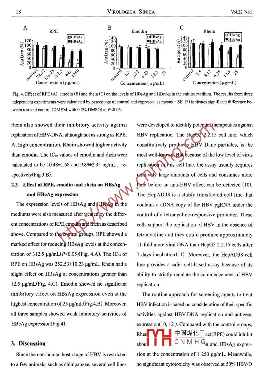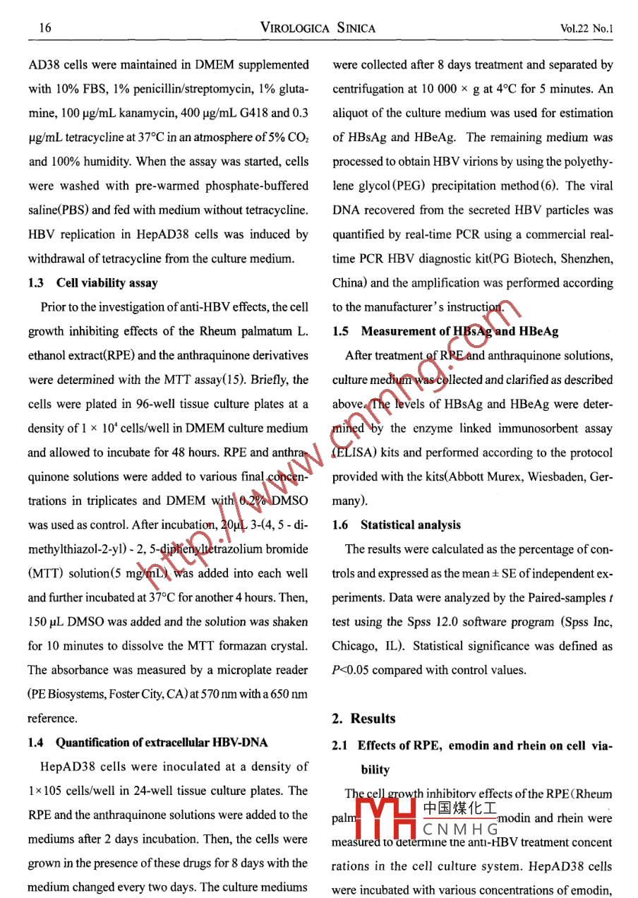 VIROLOGICA SINICA Feb 2007, 22(1): 14-20CLC number: R373 Document code:A Article ID: 1003-5125(2007)01-0014-07Inhibition of Hepatitis B Virus Replication by Rheum palmatum L. EthanolExtract in a Stable HBv-producing Cell LineYan sUN, Li-jun Ll2. 3, Jing Lr, Zhi LI**(1. College ofLife Sciences, Shaanxi Normal University, Xi'an, Shannxi, 710062; 2. Bioengineering Institute, JimeiUniversity, Xiamen, Fujian, 361021; 3. Department of Applied Biology and Chemical Technology, The Hong KongPolytechnic University, Hung Hom, Hong Kong: 4. Department of Infection Disease, Xiangfan Central HospitalXiangfan, Hubei, 441021; 5. The Institute of Molecular Biology, The University of Hong Kong.Abstract: Hepatitis B virus(HBV)infection is a severe health problem in the world. However, there isstill not a satisfactory therapeutic strategy for the HBV infection. To search for new anti-HBV agents withhigher efficacy and less side-effects, the inhibitory activities of traditional Chinese medicine rheumpalmatum L ethanol extract(RPE)against HBV replication were investigated in this study. Quantitativereal-time polymerase chain reaction( PCR) was employed to analyze the inhibitory activity of RPe againstHBV-DNA replication in a stable HBV-producing cell line Hep AD38; the expression levels of HBVsurface antigen (HBsAg) and e antigen (HBeAg) were also determined by enzyme linked immunosorbentassay (ELISA)after RPE treatment. RPE could dose-dependently inhibit the production of HBV-DNAand HBsAg. The concentration of 50% inhibition(ICso)was calculated at 209.63, 252.53 ug/mL, respetively. However, its inhibitory activity against HBeAg expression was slight even at high concentrationsRPE had a weak cytotoxic effect on HepAD38 cells( CCso=1 640 Hg/mL) and the selectivity index(si)was calculated at 7.82: Compared with two anthraquinone derivatives emodin and rhein, rPe showedhigher ability of anti- HBV and weaker cytotoxicity. So Rheum palmatum L. might possess other functional agents which could effectively inhibit hBv-DNA replication and HBsAg expression. Furtherpurification of the active agents, identification and modification of their structures to improve the efficacyand decrease the cytotoxicity are requiredKey words: Hepatitis B virus(HBV); Antiviral; Rheum palmatum L ethanol extract (RPE); HepAD38Hepatitis B is an infectious disease of the liver caused 350 million people are chronic carriers of HBV( 23, 2by Hepatitis B virus(HBV). Globally, about two billion 19, 5). These carriers are at high risk for developmentpeople have been infected by HBV and approximately of中國煤化 Eluding liver cirrhosis,CNMHGReceived:200605-31, Accepted:2006-07-06Equally contributing authorC呀芳?xì)uthor.le82930845.862353-mail:lizhi@snnu.edu.cnSUN et alInhibition of Hepatitis B Virus Replication by RPE in a Stable HBV-producing Cell Lineliver failure and hepatocellular carcinoma(HcC)and the commercial anthraquinone derivatives emodin andmore than one million carriers die from these diseases rhein which are derived from rheumeach year(23, 2). In China, the prevalence of HBV infection is very severe, with an estimated 120 millie1. Materials and methodschronically infected carriers, up to 12 million suffering 1.1 Preparation of herbal plant extract and anthrafrom chronic hepatitis B(5)uinone solutionsInterferon and lamivudine are the mainly acceptable The herbal plant Rheum palmatum L was purchasedantiviral drugs for inhibition of HBV replication( 14, 8). from a herbal materials supply house and verified.OneBoth of drugs can induce virological and biochemical kilogram of dried, ground rhizome was macerated inremission in the treatment of chromic hepatitis B, but 1 000 mL 95% ethanol. After incubation overnight, thetheir clinical chromic hepatitis B, but their clinical sample was subjected to ultrasonication for 30benefit is somewhat limited due to viral mutation, cost, minutes, followed by centrifugation. The residue wasfrequent adverse effects(7)and the likelihood of re- extracted twice, then the supernatant solutions werelapse after the termination of treatment. Moreover, only mixed, filtered, concentrated and lyophilized to give aabout 20% of patients benefit from combination therapy dark brown powder. The dried extract was re-resolvedwith interferon and lamivudine( 13, 9). So, the need to in dulbecco,s modified Eagle's medium(DmEmidentify effective anti- HBV agents is still urgently Gibco BRL) with 0.2%dimethyl sulfoxide(DMSOrequired. The herbal plant Rheum palmatum L is a tradi- Sigma, St. Louis, MO) to the appropriate concentra-tional Chinese medicine which is widely distributedtions. Emodin(1, 3, 8-trihydroxy-6-methylanthraquinonemainland China and which has a long history to treating CisHnoOs)and rhein (1, 8-dihydroxy-9, 10-anthraquino-gastroenteritic and viral diseases(4). Rheum palmatum ne-3-carboxylic acid, Cus HsO,)(Fig. 1. ) were purchasedL. contains several anthraquinone derivatives, which from Sigma Chemical Company and dissolved inhave showed activities against some viruses including ves DMEM with 0. 2% DMSO to the appropriate concentraicular stomatitis virus, herpes simplex virus types l and tions. The resulting solutions were used in the following2, parainfluenza, vaccinia virus, human cytomegalovi- analysisrus and poliovirus(22, 1, 3, 20). It was also reported that 1.2 Cells cultureRheum palmatum L. volatile oil could inhibit HBVThe Hepad3 8 is a human hepatocellular carantigens(HBsAg and HBeAg) expression(24). There- cinoma derivative cell line which can reproduce hepa-fore, it is supposed that Rheum palmatum L. might titis B viruses under control of tetracycline( 11). Hep-possess active agents which may inhibit many virusesHOHincluding HBV. In this study, we evaluated the cytotoxicity and the inhibitory activities of Rheum palmatum L.中國煤化工ethanol extract(rPE)against HBV-DNA replication andCNMHGHBV antigens expression in a stable HBV-producingFig 1 Chemical structure of emodin(R=OH, R-CH,)and rheince