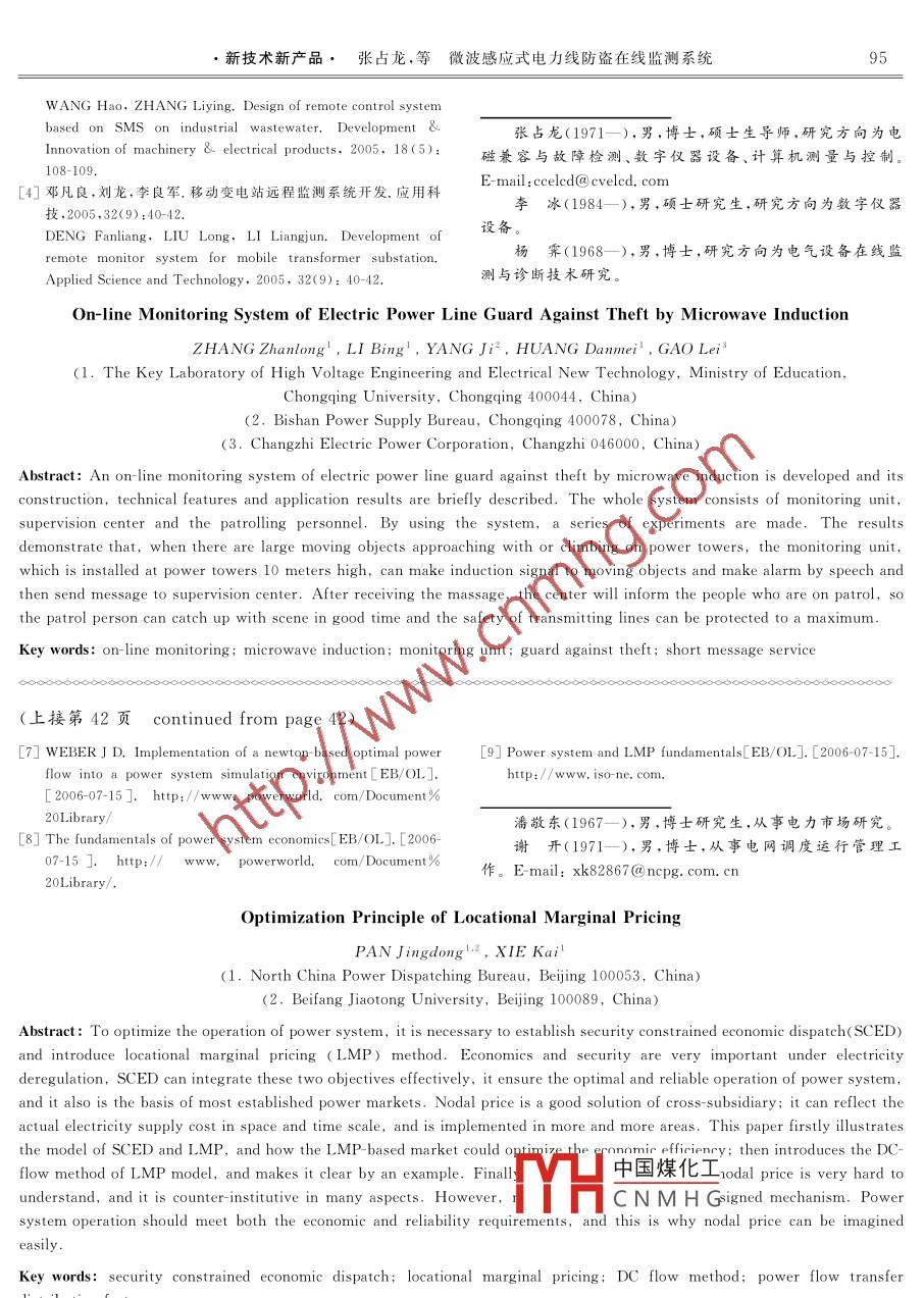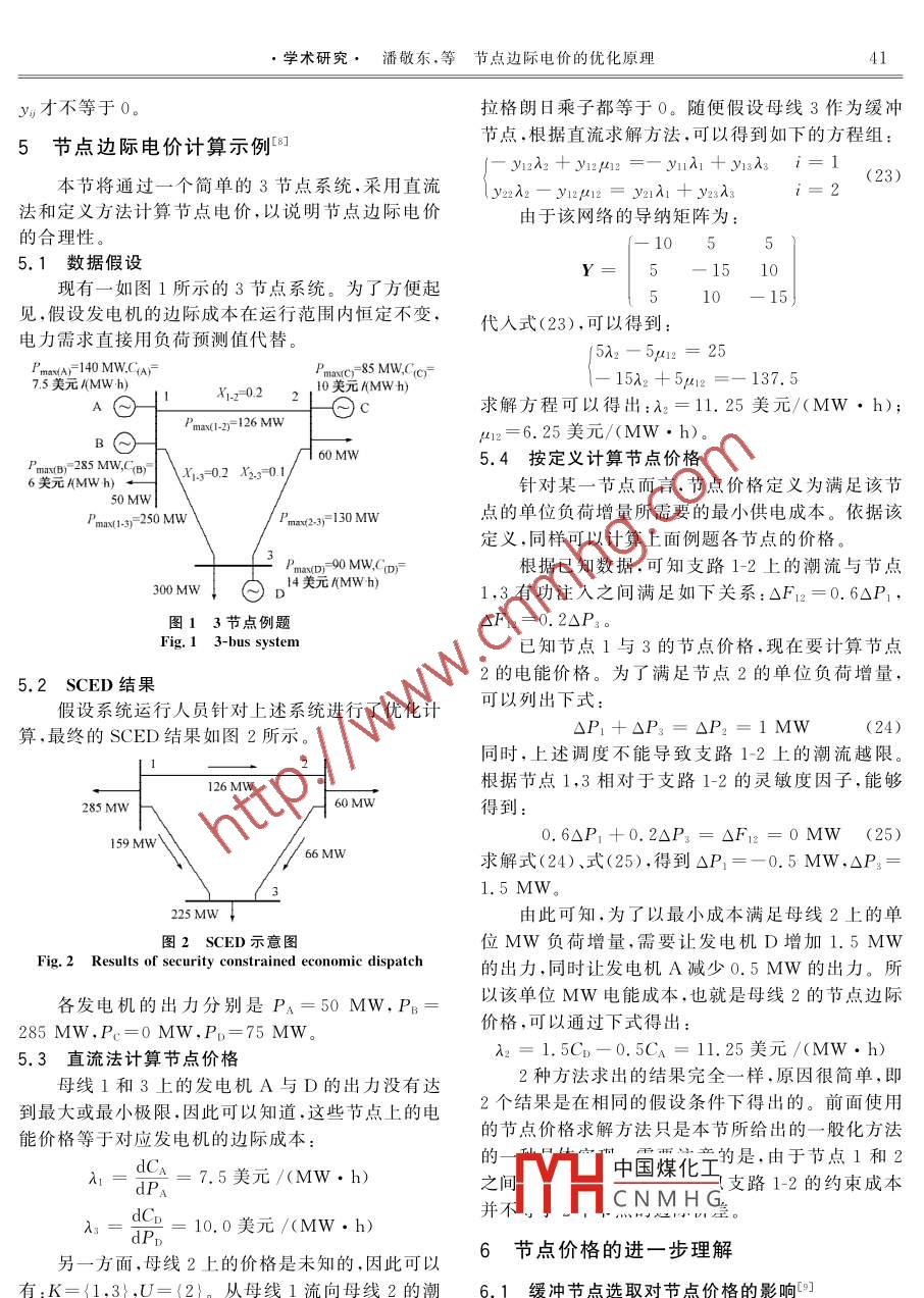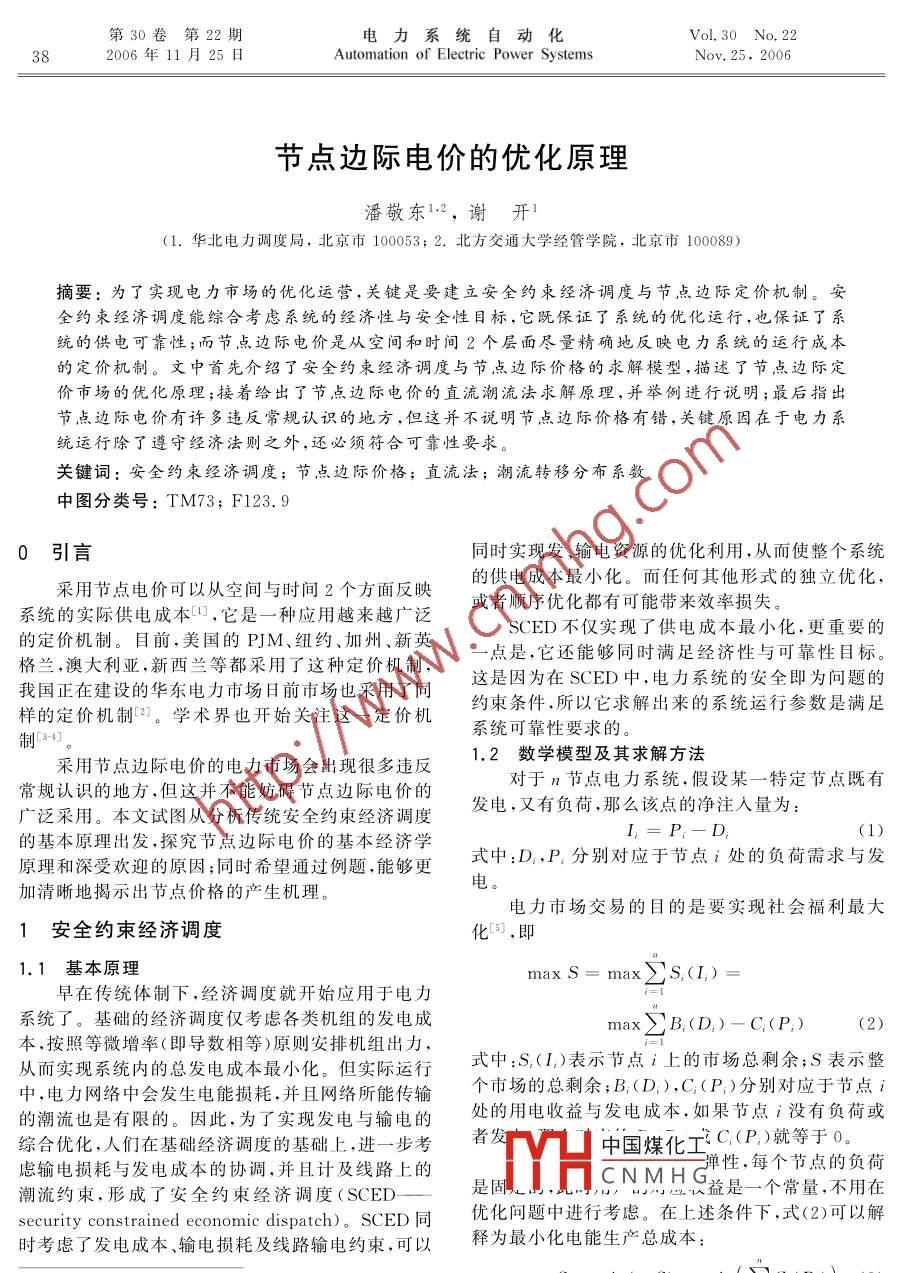第30卷第22期電力系統(tǒng)自動化Vol. 30 No. 2282006年11月25日Automation of Electric Power Sy stemsNov. 25, 2006節(jié)點(diǎn)邊際電價的優(yōu)化原理潘敬東12,謝開1(1.華北電力調(diào)度局,北京市100053; 2.北方交通大學(xué)經(jīng)管學(xué)院,北京市100089)摘要:為了實(shí)現(xiàn)電力市場的優(yōu)化運(yùn)營,關(guān)鍵是要建立安全約束經(jīng)濟(jì)調(diào)度與節(jié)點(diǎn)邊際定價機(jī)制。安全約束經(jīng)濟(jì)調(diào)度能綜合考慮系統(tǒng)的經(jīng)濟(jì)性與安全性目標(biāo),它既保證了系統(tǒng)的優(yōu)化運(yùn)行,也保證了系統(tǒng)的供電可靠性;而節(jié)點(diǎn)邊際電價是從空間和時間2個層面盡量精確地反映電力系統(tǒng)的運(yùn)行成本的定價機(jī)制。文中首先介紹了安全約束經(jīng)濟(jì)調(diào)度與節(jié)點(diǎn)邊際價格的求解模型,描述了節(jié)點(diǎn)邊際定價市場的優(yōu)化原理;接著給出了節(jié)點(diǎn)邊際電價的直流潮流法求解原理,并舉例進(jìn)行說明;最后指出節(jié)點(diǎn)邊際電價有許多違反常規(guī)認(rèn)識的地方,但這并不說明節(jié)點(diǎn)邊際價格有錯,關(guān)鍵原因在于電力系統(tǒng)運(yùn)行除了遵守經(jīng)濟(jì)法則之外,還必須符合可靠性要求。關(guān)鍵詞:安全約束經(jīng)濟(jì)調(diào)度;節(jié)點(diǎn)邊際價格;直流法;潮流轉(zhuǎn)移分布系數(shù)中圖分類號: TM73; F123. 90引言同時實(shí)現(xiàn)發(fā)、輸電資源的優(yōu)化利用,從而使整個系統(tǒng)采用節(jié)點(diǎn)電價可以從空間與時間2個方面反映的供電成本最小化。而任何其他形式的獨(dú)立優(yōu)化,系統(tǒng)的實(shí)際供電成本1,它是一種應(yīng)用越來越廣泛或者順序優(yōu)化都有可能帶來效率損失。的定價機(jī)制。目前,美國的PJM、 紐約、加州、新英SCED不僅實(shí)現(xiàn)了供電成本最小化,更重要的格蘭,澳大利亞,新西蘭等都采用了這種定價機(jī)制,-一點(diǎn)是,它還能夠同時滿足經(jīng)濟(jì)性與可靠性目標(biāo)。我國正在建設(shè)的華東電力市場日前市場也采用了同這是因?yàn)樵赟CED中,電力系統(tǒng)的安全即為問題的樣的定價機(jī)制[2。學(xué)術(shù)界也開始關(guān)注這一定價機(jī)約束條件,所以它求解出來的系統(tǒng)運(yùn)行參數(shù)是滿足系統(tǒng)可靠性要求的。制C34]。采用節(jié)點(diǎn)邊際電價的電力市場會出現(xiàn)很多違反1.2數(shù)學(xué)模 型及其求解方法.常規(guī)認(rèn)識的地方,但這并不能妨礙節(jié)點(diǎn)邊際電價的對于n節(jié)點(diǎn)電力系統(tǒng),假設(shè)某- -特定節(jié)點(diǎn)既有廣泛采用。本文試圖從分析傳統(tǒng)安全約束經(jīng)濟(jì)調(diào)度發(fā)電,又有負(fù)荷,那么該點(diǎn)的凈注人量為:I;= P;- D;的基本原理出發(fā),探究節(jié)點(diǎn)邊際電價的基本經(jīng)濟(jì)學(xué)式中:D,,P:分別對應(yīng)于節(jié)點(diǎn)i處的負(fù)荷需求與發(fā)原理和深受歡迎的原因;同時希望通過例題,能夠更電。加清晰地揭示出節(jié)點(diǎn)價格的產(chǎn)生機(jī)理。電力市場交易的目的是要實(shí)現(xiàn)社會福利最大1安全約束經(jīng)濟(jì)調(diào)度化5日,即1.1 基本原理max S= maxS,(I) =早在傳統(tǒng)體制下,經(jīng)濟(jì)調(diào)度就開始應(yīng)用于電力系統(tǒng)了?;A(chǔ)的經(jīng)濟(jì)調(diào)度僅考慮各類機(jī)組的發(fā)電成max,2B;(D,)- C,(P;)(2)本,按照等微增率(即導(dǎo)數(shù)相等)原則安排機(jī)組出力,式中:S,(I)表示節(jié)點(diǎn)i上的市場總剩余;S表示整從而實(shí)現(xiàn)系統(tǒng)內(nèi)的總發(fā)電成本最小化。但實(shí)際運(yùn)行個市場的總剩余;B;(D;),C;(P)分別對應(yīng)于節(jié)點(diǎn)i中,電力網(wǎng)絡(luò)中會發(fā)生電能損耗,并且網(wǎng)絡(luò)所能傳輸處的用電收益與發(fā)電成本,如果節(jié)點(diǎn)i沒有負(fù)荷或的潮流也是有限的。因此,為了實(shí)現(xiàn)發(fā)電與輸電的綜合優(yōu)化,人們在基礎(chǔ)經(jīng)濟(jì)調(diào)度的基礎(chǔ)上,進(jìn)一一步 考中國煤化工C,(P,)就等于0。慮輸電損耗與發(fā)電成本的協(xié)調(diào),并且計及線路上的是固CH二單性,每個節(jié)點(diǎn)的負(fù)荷潮流約束,形成了安全約束經(jīng)濟(jì)調(diào)度(SCED-CNM HC益是一個常量,不用在security constrained economic dispatch)。SCED 同優(yōu)化問題中進(jìn)行考慮。在上述條件下,式(2)可以解時考慮了發(fā)電成本、輸電損耗及線路輸電約束,可以釋為最小化電能生產(chǎn)總成本:max S = min(-S) = min( ZC(P) (3)收稿日期: 2006-07-19。學(xué)術(shù)研究●潘敬東,等節(jié)點(diǎn)邊際電價的優(yōu)化原理39式(3)與傳統(tǒng)的最優(yōu)潮流定義比較一致[6]。該這也就意味著節(jié)點(diǎn)i處發(fā)電商所面臨的節(jié)點(diǎn)價優(yōu)化問題還需要滿足一定的約束條件。首先,系統(tǒng)格會因?yàn)榫W(wǎng)損而減少,原因是該點(diǎn)向網(wǎng)絡(luò)注人的電無論在什么條件下都必須保證發(fā)電與負(fù)荷平衡,在能增量會導(dǎo)致網(wǎng)損增加,所以需要受到懲罰。另一計及網(wǎng)損的前提下,問題將有如下形式的等式約束:方面,節(jié)點(diǎn)i處用戶只需支付較低的電能價格,這是2I:= L(1.1..1-1)(4)因?yàn)樵谠擖c(diǎn)增加用電可以減少系統(tǒng)的網(wǎng)損。如果情況相反,增加節(jié)點(di