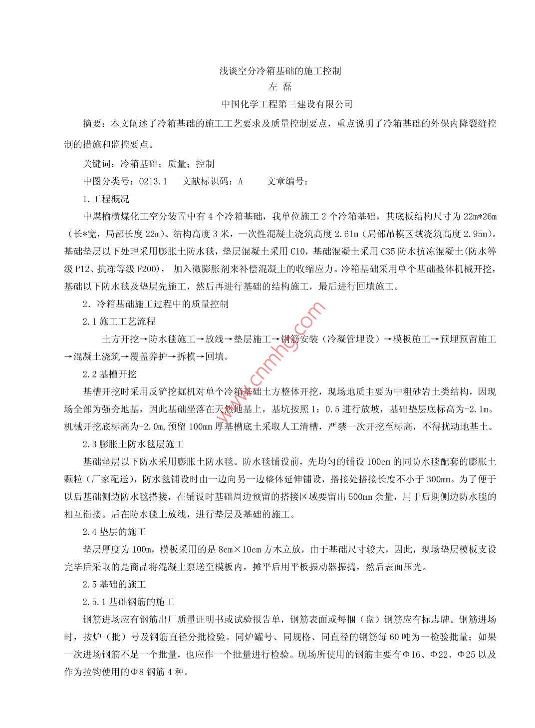 淺談空分冷箱基礎的施工控制中國化學工程第三建設有限公司摘要:本文闡述了冷箱基礎的施工工藝要求及質量控制要點,重點說明了冷箱基礎的外保內降裂縫控制的措施和監(jiān)控要點。關鍵詞:冷箱基礎;質量;控制中圖分類號:0213.1文獻標識碼:A文章編號:1.工程概況中煤榆橫煤化工空分裝置中有4個冷箱基礎,我單位施工2個冷箱基礎,其底板結構尺寸為22m*26m(長*寬,局部長度22m)、結構髙度3米,一次性混凝土澆筑高度2.6lm(局部吊模區(qū)域澆筑高度2.95m)?;A墊層以下處理采用膨脹土防水毯,墊層混凝土采用C10,基礎混凝土采用C35防水抗凍混凝土(防水等級P12、抗凍等級F200,加入微膨脹劑來補償混凝土的收縮應力。冷箱基礎采用單個基礎整體機械開挖,基礎以下防水毯及墊層先施工,然后再進行基礎的結構施工,最后進行回填施工。冷箱基礎施工過程中的質量控制1施工工藝流程土方開挖→防水毯施工→放線→墊層施工→鋼筋安裝(冷凝管埋設)→模板施工→預埋預留施工→混凝土澆筑→覆蓋養(yǎng)護→拆?!靥睢?.2基槽開挖基槽開挖時采用反鏟挖掘機對單個冷箱基礎土方整體開挖,現(xiàn)場地質主要為中粗砂巖土類結構,因現(xiàn)場全部為強夯地基,因此基礎坐落在天然地基上,基坑按照1:0.5進行放坡,基礎墊層底標高為-2.1m。機械開挖底標髙為-2.0m,預留100m厚基槽底土采取人工淸槽,嚴禁一次開挖至標高,不得擾動地基土。2.3膨脹土防水毯層施工基礎墊層以下防水采用膨脹土防水毯。防水毯鋪設前,先均勻的鋪設100cm的同防水毯配套的膨脹土顆粒(廠家配送),防水毯鋪設時由一邊向另一邊整體延伸鋪設,搭接處搭接長度不小于300m。為了便于以后基礎側邊防水毯搭接,在鋪設時基礎周邊預留的搭接區(qū)域要留出500mm余量,用于后期側邊防水毯的相互銜接。后在防水毯上放線,進行墊層及基礎的施工。2.4墊層的施工墊層厚度為100m,模板采用的是8cm×10cm方木立放,由于基礎尺寸較大,因此,現(xiàn)場墊層模板支設完畢后采取的是商品將混凝土泵送至模板內,攤平后用平板振動器振搗,然后表面壓光2.5基礎的施工2.5.1基礎鋼筋的施工鋼筋進場應有鋼筋岀廠質量證明書或試驗報告單,鋼筋表面或每捆(盤)鋼筋應有標志牌。鋼筋進場時,按爐(批)號及鋼筋直徑分批檢驗。同爐罐號、同規(guī)格、同直徑的鋼筋每60噸為一檢驗批量;如果次進場鋼筋不足一個批量,也應作一個批量進行檢驗?,F(xiàn)場所使用的鋼筋主要有Φ16、Φ22、Φ25以及作為拉鉤使用的Φ8鋼筋4種鋼筋綁扎扎絲使用20號鍍鋅鐵絲,雙絲綁扎,水平鋼筋網(wǎng)片采用滿扎滿扣,側面鋼筋采用的梅花扣綁扎,基礎內鋼筋網(wǎng)片分為4層,綁扎時從下往上進行綁扎,綁扎完下一層再綁扎上一層。最下一層綁扎完畢后,搭設上部三層鋼筋的滿堂支撐鋼管腳手架立杄,鋼筋支撐架采用φ48*3.0腳手架鋼管,立杄縱橫向間距按3m布置。每層橫杄亦為縱橫向布置,橫杄步距均為80omm。待下層板筋綁扎完畢后,再搭設上層鋼筋橫杄;橫杄搭設及加固完畢后,再綁扎夲層鋼筋,在底板腳手架攴撐系統(tǒng)內設置三道腳手架剪刀撐,分別設置在兩端部及中部,防止施工過程中腳手架傾斜或坍塌。直徑≥22的鋼筋連接方式采用的是直螺紋套管連接,直螺紋連接的鋼筋絲扣的長度、扣數(shù)以及絲距應符合規(guī)范要求。Φ16鋼筋采用搭接連接,根據(jù)抗震需要,搭接長度不小于700m(3ld*1.4md為鋼筋直徑),搭接部分應綁扎牢固,不少于6處綁扎,同一截面鋼筋接頭不得大于50%,接頭與接頭之間錯開的距離不小于500m,同時避開受剪力較大的區(qū)域。2.5.2基礎模板支撐系統(tǒng)的施工基礎側面模板均采用15ⅷ厚鏡面木模板,木模內背楞采用50*80木方,豎向布置間距30omm,外背楞及支撐采用Φ48*3.0鋼管配合對拉螺栓進行固定,在木背棱外側設置雙道水平向鋼管橫背棱@800,對拉螺栓的水平間距為800m?;A側邊外圍搭設雙排腳手架以利于上部檐口結構支模使用,雙排架的外架采用鋼管斜撐牢靠固定在基槽斜坡上。當模板及其支撐架安裝完成后,再進行螺栓的安裝,將預埋在砼內部的螺栓,用鋼筋頭與基礎鋼筋點焊,并在高于基礎表面200m處設置回字形定位盤,并用螺母擰緊上下卡住定位盤,防止螺栓在澆筑過程中偏移和垂直度改變。2.5.3冷箱基礎裂縫控制措施由于冷箱基礎屬于大體積混凝土,為防止?jié)仓螽a生溫度裂縫,1、采用外保內降的養(yǎng)護措施,基礎澆注完畢后在基礎表面覆蓋一層塑料薄膜一層5σm厚棉被保溫養(yǎng)護,在基礎內部均勻設置雙層循環(huán)水管來降溫,水流控制在lm/s水管采用φ48*3腳手架鋼管,材質Q235B,通過熱工計算可得,每小時混凝土中心溫度可降低0.16℃,每24小時可降溫3.84℃,根據(jù)天氣情況和經驗,C35礦渣水泥混凝土最髙溫度約為65度,白天空氣溫度約為30度,則將混凝土溫度溫度降至50℃左右,需65-50/3.84=3.9天,因此在4天內應連續(xù)不斷的保證循環(huán)水,方可減少混凝土的溫度應力2.5.4基礎混凝土的施工商品混凝土采用的水泥為水化熱相對較低的礦渣水泥,并加入微膨脹劑來補償混凝土的收縮應力。澆筑為分層澆筑,每次澆筑的高度控制在5ωm左右。振搗釆用插λ式振搗棒,振搗時快插慢拔,插點要均勻排列,逐點移動,順序進行,做到均勻振實。移動間距不大于振搗作用半徑的1.5倍(一般為300-400m),振搗至預埋螺栓位置時,控制螺栓與振動棒之間距離不宜過近,鋼筋較密