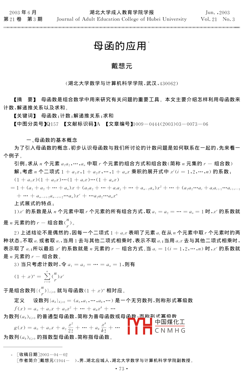 2003年6月湖北大學(xué)成人教育學(xué)院學(xué)報(bào)Jun.,2003第21卷第3期 Journal of Adult Education College of Hubei University Vol.21No.3母函的應(yīng)用戴想元(湖北大學(xué)數(shù)學(xué)與計(jì)算機(jī)科學(xué)學(xué)院,武漢,430062)【摘要】母函數(shù)是組合數(shù)學(xué)中用來(lái)研究有關(guān)問(wèn)題的重要工具。本文主要介紹怎樣利用母函數(shù)來(lái)計(jì)數(shù),解遞推關(guān)系以及求和?!娟P(guān)鍵詞】母函數(shù);計(jì)數(shù);解遞推關(guān)系;求和【中圖分類號(hào)】Q157【文獻(xiàn)標(biāo)識(shí)碼】A【文章編號(hào)】109-0444(2003)03-0073-06母函數(shù)的基本概念為了引入母函數(shù)的概念,初步認(rèn)識(shí)母函數(shù)與我們所討論的計(jì)數(shù)問(wèn)題是如何聯(lián)系在一起的,先來(lái)看個(gè)例子引例:求從n個(gè)元素a1a2中取r個(gè)元素的組合方式和組合數(shù)(簡(jiǎn)稱n元集的r-組合數(shù))解:考慮n個(gè)二項(xiàng)式1+a1x,1+a2x,…,1+anx乘積的展開(kāi)式中x(i=1,2,…,n)的系數(shù):(1+a1x)(1+a2x)…(1+ax)…(1+anx)1+(a1+a2+…+an)x+(a(2+…+aa+aa1+1…a;+r-1+2…an)x上式展式的特點(diǎn)1)x的系數(shù)是從n個(gè)元素中取r個(gè)元素的所有組合方式,取a1=a2an=1時(shí),x的系數(shù)就是n元素的的r一組合數(shù)(")2)上述結(jié)論不是偶然的,因每一個(gè)二項(xiàng)式1+a1x表明了元素a在從n個(gè)元素中取r個(gè)元素時(shí)的兩種狀態(tài):不取a,或者取a,當(dāng)用1去與其他二項(xiàng)式相乘時(shí),表示不取a;當(dāng)用ax去與其他二項(xiàng)式相乘時(shí),表示取了a;所以最后x的系數(shù)就是n元素的r-組合方式。當(dāng)a=1(i=1,2,…,n)時(shí),x的系數(shù)就是n元素的r—組合數(shù)3)當(dāng)只考慮計(jì)數(shù)時(shí),令a1=a2an=1,則有(1+x)于是組合數(shù)列{()}≥。就與母函數(shù)(1+x)相對(duì)應(yīng)定義設(shè)數(shù)列{ak}k≥0=(a,a1,…,ak,…)是一個(gè)無(wú)窮數(shù)列,則稱形式冪級(jí)數(shù)為數(shù)列(ak)k≥0的普通型母函數(shù),簡(jiǎn)稱為普母函數(shù)或母五稱形式冪級(jí)數(shù)中國(guó)煤化工(x)=a0+a1x+a2CNMHG為數(shù)列(ak)k≥的指數(shù)型母函數(shù),簡(jiǎn)稱指母函數(shù)收稿日期]2003-04-02作者簡(jiǎn)介]戴想元(1944—),男,湖北應(yīng)城人,湖北大學(xué)數(shù)學(xué)與計(jì)算機(jī)科學(xué)學(xué)院副教授定義中“形式冪級(jí)數(shù)”一語(yǔ),指的是撇開(kāi)了級(jí)數(shù)的收斂性問(wèn)題。而當(dāng)我們須對(duì)冪級(jí)數(shù)進(jìn)行微分或積分時(shí),則認(rèn)為該級(jí)數(shù)具有分析學(xué)中函數(shù)應(yīng)滿足的性質(zhì)。形式冪級(jí)數(shù)的代數(shù)運(yùn)算,即加、減和乘法都按多項(xiàng)式運(yùn)算法則進(jìn)行,而微分、積分則按數(shù)學(xué)分析中的算法則進(jìn)行二、母函數(shù)與排列組合基本公式Ⅰ,從n元集S={a1,a2,…,an}中取k個(gè)元的組合,其中限定元素a出現(xiàn)的次數(shù)之集為M(i=1,2,…,n)時(shí)的組合數(shù)記為c,則數(shù)列(ck)≥0的母函數(shù)是f(x)基本公式Ⅰ包含了許多特殊情況,如1°當(dāng)M1=MMn{0,1}時(shí),f(x)=(1+x)2°當(dāng)M1=M{0,1,2,…},f(x)=(1+x+x2+…)3°當(dāng)M1=M2=…=Mn={0,2,4,…},f(x)=(1+x2+x4+…)基本公式Ⅰ的一個(gè)等價(jià)命題是:把k個(gè)相同的球放入n個(gè)互不相同的盒子a1,a2,…,an中,要求盒子a,中放入m個(gè)球,其放法數(shù)的母函數(shù)是m(>x")對(duì)于我們要求的組合數(shù)c,如果能找到其對(duì)立的母函數(shù)f(x)=m(∑x),將這母函數(shù)展開(kāi)成f(x)=∑cx,則x的系數(shù)c就是我們要求的組合數(shù)例1求證n元集的k-可重組合數(shù)是(+k-1)k證明所謂n元集的k可重組合指的是從n元集s=(a1,a2,…,an}中選取的無(wú)序k元組(x1x2,…,x),這里x1,x2,…,xk∈S,它們可彼此相同,每個(gè)元素a,出現(xiàn)的次數(shù)集M1={0,1,2,…k)(依n元集的k一可重組合的的定義,這組合數(shù)的母函數(shù)是f(x)=(1+x+x2+…)將其展開(kāi)(1+x+x2+…)"=(n(-n-1)(-n-2)…(-n-t+1)(-1)2n(n+1)(n+2)…(+=1)所求n元集的k一可重組合數(shù)就是上面展開(kāi)式中x的系數(shù)(+k-1應(yīng)該強(qiáng)調(diào)的是,在求可以重復(fù)的組合數(shù)時(shí),常用函數(shù)=(1-x)”,今后可以把它的展開(kāi)式中國(guó)煤化工)x作為公式來(lái)用CNMHG例2求n元集S={a1,a2,…,an}的k一可重組合數(shù)c,要求a1,a2出現(xiàn)偶數(shù)次,其余元素出現(xiàn)奇數(shù)次解該問(wèn)題的母函數(shù)是f(x)=(1+)2(x+x3+x5+…)”-2+r-1k上式中x的系數(shù)就是ck2基本公式I,從n元集S={a1,a2,…,an}中取k個(gè)元的排列,其中限定元b出現(xiàn)的次數(shù)之集是M(i1,2,…,n),把這種排列的個(gè)數(shù)記為p,則數(shù)列()≥0的母函數(shù)是f(x)=∑x5k!=m(∑,)注:1°若M1=M2=…Mn={0,1,2,…},則f(x)=(1+2若M1=M2=Mn={0,2,4,…},則f(x)={1+2,+M1=M2=…=Mn={1,3,5,…},則f(x)=(x+,++…)=(對(duì)于我們要求的排列數(shù)p,如果能找到其對(duì)應(yīng)的母函數(shù)∫(x)=Ⅱ(、x),將這母函數(shù)展開(kāi)成f(x)=∑Pk1,則的系數(shù)內(nèi)就是我們要求的排列數(shù)例3求字母集{a,b,c,d}上含偶數(shù)個(gè)a的k元字的個(gè)數(shù)f解()≥。的母函數(shù)是(1+x++…)(1+x++(elr+ezr)的系數(shù)是=D(4+2)。例4用1,2,3,4這四個(gè)數(shù)字組成7位數(shù),要求1出現(xiàn)2次或3次,2出現(xiàn)偶數(shù)次,4出現(xiàn)奇數(shù)次,求這樣7位數(shù)的個(gè)數(shù)解此排