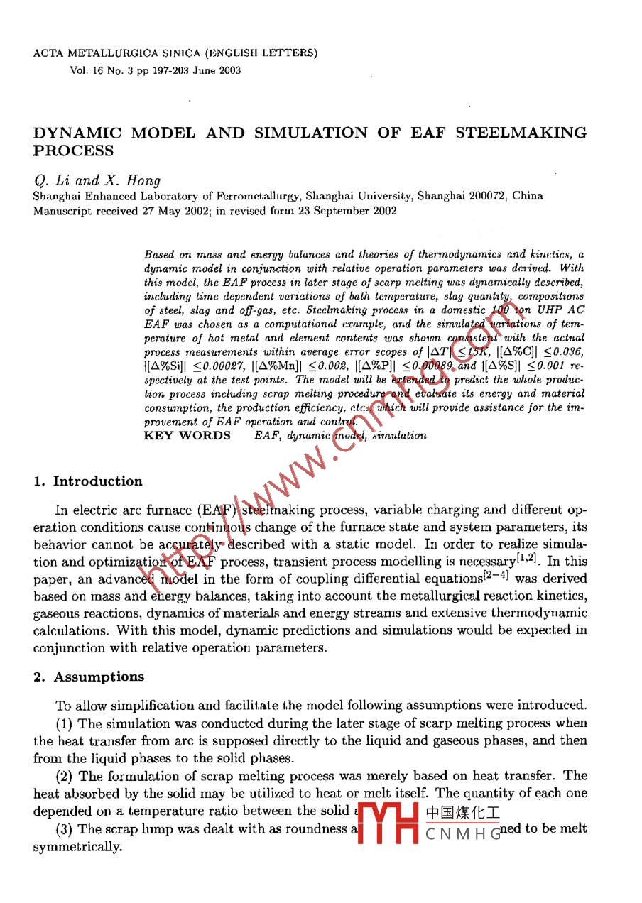 ACTA METALLURGICA SINICA {ENGLISH LETTERS)Vol. 16 No. 3 pp 197 203.June 2003DYNAMIC MODEL AND SIMULATION OF EAF STEELMAKINGPROCESSQ. Li and X. HongShanghai Enhanced Laboratory of Ferronetallurgry, Shanghai University, Shanghai 200072, ChinaManuscript received 27 May 2002; in revised form 23 September 2002Based on mass and energy balances and theories of therrmodynamics and kirne:tics, adynamic model in conjunction with relative operation parameters was derined. Withthis model, the EAF process in later stage of scarp melting was dynamically described,including time dependent uariations of bath temperature, slag quantity, compositionsof steel, slag and ofF-gas, etc. Steelmakting process in a domestic 100 ton UHP ACEAF was chosen as a compustational r:carnple, (nd the simulated variations of tem-perature of hot metal and element contents was shown consistent with the actualprocessmeasurements within average error scopes of |OT|≤15K, |[O%C]|≤0.036,i[△%Si]| <0.00027, |[A%Mn]|≤0.002, |[A%P]| ≤0.00089 and |[O%S]| <0.001 re-spectively at the test points. The model will be extended to predict the whole produc-tion process including scrap melting procedure and evaluate its energy and materialconsumption, the produsction efficiency, elc., twhich will provide assistance for the im-provement of EA F operation and conlrul.KEY WORDSEAF, dynamic rode, sirnuslation1. IntroductionIn electric arc furnacc (EAF) steelmaking process, variable charging and different op-eration conditions cause continuous change of the furnace state and system parameters, itsbehavior cannot be accilrately described with a static model. In order to realize simula-tion and optimization of EAF process, transient process modelling is necessaryl1,2]. In thispaper, an advanced ruodel in the form of coupling diferential equations2- 4J was derivedbased on rass and energy balances, taking into account the metallurgical reaction kinetics,gaseous reactions, dynamics of materials and energy streams and exlensive thermody namiccalculations. With this model, dynamic prcdictions and simulations would be expected inconjunction with relative operation parameters.2. AssumptionsTo allow simplification and facilitate t.he model following assumptions were introduced.(1) The simulation was conductcd during the later stage of scarp melting process whenthe heat transfer from are is supposed directly to the liquid and gaseous phases, and thenfrom the liquid phases to the solid phases.(2) The formulation of scrap melting process was merely based on heat transfer. Theheat absorbed by the solid may be utilized to heat or mclt itself. The quantity of each onedepended on a temperature ratio between the solid中國煤化工(3) The scrap lump was dealt with as roundness 8:YHCNMHGnedtobemeltsymmetrically.198.(4) The solid phases consisting of the scrap and the solid slag were at the same temper-ature, while the liquid metal, molten slag and gas phase were all at the same temperature.(5) The injected oxygen reacted merely with [Fe], and then the resultant of (FeO) wouldreact with carbon powder injected and other elements in the hot metal.(6) The oxidations of [C], [Si] were ranked in apparently first order reactions and theoxidation rate of carbon powder was proportional to its injection rate and content of ferrousoxide in the liquid slag.(7) All reactions took places at the same temperature.(8) The two-film reaction theory was used to describe the dephosphorization reaction5whose rate was limited by the mass transfer rates of phosphor in both the hot metal andthe liquid slag. The changes of [S] and [Mn] were dealt with in the same way.(9) The heat and mass transfcr cofficients were constant.(10) A relationship of the leaked air flow rate proportional to the square root of thevalue of the relative pressure in EAF was deduced by dimensional analysis.3. Variables and Model DescriptionThe variables and related parameters were listed in Appendix I. Accordingly, the dy-namic model was mainly constructed with following nonlinear coupling differential equa~tions.Emsr-MsrQ2(Ts/T)(1)OtAHsr+ Cp,sr(T-T)0mar1= _ me - S+(i=Fe, C, Si, Mn, P, S)(2)8tHthere,(i = Fc)i:=ka;(Xi- xi)(i=C, Si)Aen 1%i1-(%)/Lps.(i=Mn, P, S)17Pm Eq)+17(Psik(1)Lp.i)irpo= -(2MreO)wc+ (MreO)rgr+MReO)rc + (2MneO)is + (MmeO)riMnMO2f(McMcMsi” MMnkcmpeOWgrms,1a[%i]amar100=-(ri +(i%)}s);(i=C, Si, Mn, P, S)(3)otTesr, 1Omsl, 1=-MsI, sQ3(Ts/Ti) .(4)△Hs1+ Cp,中國煤化工0msI,s_ 8mgl,TYHCNMHG“sue(5)0t1998mFeO= -TFeO(6)Htomim-)gas - r + fri9leak .(i=CO, CO2; N2, O2)(7)tmgashere,Gleak ={ -kpVPRT(Pr> 0)( kp√|Pe| (Pr<0)i= fi(W)(irc + fgr)(i= CO, CO2, N2, O2)J fco=-1, fco,=0, fo2=0, fN2=0(Xo2 < xq2)f:{fco=0, fco,=-1, fo2=1/2, JN2=0 (Xo2 > X8q)oTPg + QRr- kx(Ti - Tair)(8)msr, ICp,sr,1/Msr,l + 7s,JCp,sL,/Mst,IATs(Q2 + Q3)(1 - Ts/T)(9msCp.sr/Msr + ThsL,Cp,Is/ Ms,sOPrR,.(5 )M; Ot(i=CO, CO2, O2, N2) (10)DtM;'HtvlThe correlative terms of heat income were listed as follows.(1) Chemical rcaction heat:Fe+ 1/202 + FeOCO + 1/2O2→CO2C+(FeO)→Fe+CO[C] + (FcO)→Fe + CO[Si] + 2(FeO)→2Fe + (SiO2)[Mn] + (FcO)→Fe + (MnO)[P] + 5/2(reO)→5/2Fe + 1/2(P2Os)[S]+ (CaO) + Fe→FeO + (CaS)Q1= ZIC(NHsc)react - E(0H,;)resut]Herc,瓷refers to the molar reaction rate of cach term above.(2) Physical heat中國煤化工Heating and melting of scrap Q2 = Asrm&(ms/m.MHCNMHGIleating and melting of slag Q3 = Agmi,s (ms/msl,s,. ns1-1(41- 1s)200Heating of injected carbon powder Q4 = wgrCpger(Ts - Tair)/Mc .Hcating of injected oxygen Q5 = wo2Cp,o2(T - Tair)/Mo2Heating of leaked air Q6 = kpVTPrTCp,air(T- Tair) (PRr <0)Qr=Q1-2Qi(11)4. SimulationIn order to test and verify the model, the process of a specific domestic 100t UHP ACEAF in commissioning was chosen for simulation, so that more test points available thanusual process could be used. Meanwhilc, some unusual operations would appear but wouldhave no effect on the verification of the model. The changes of the operation paraneterswere shown in Fig.1. The initial temperature of