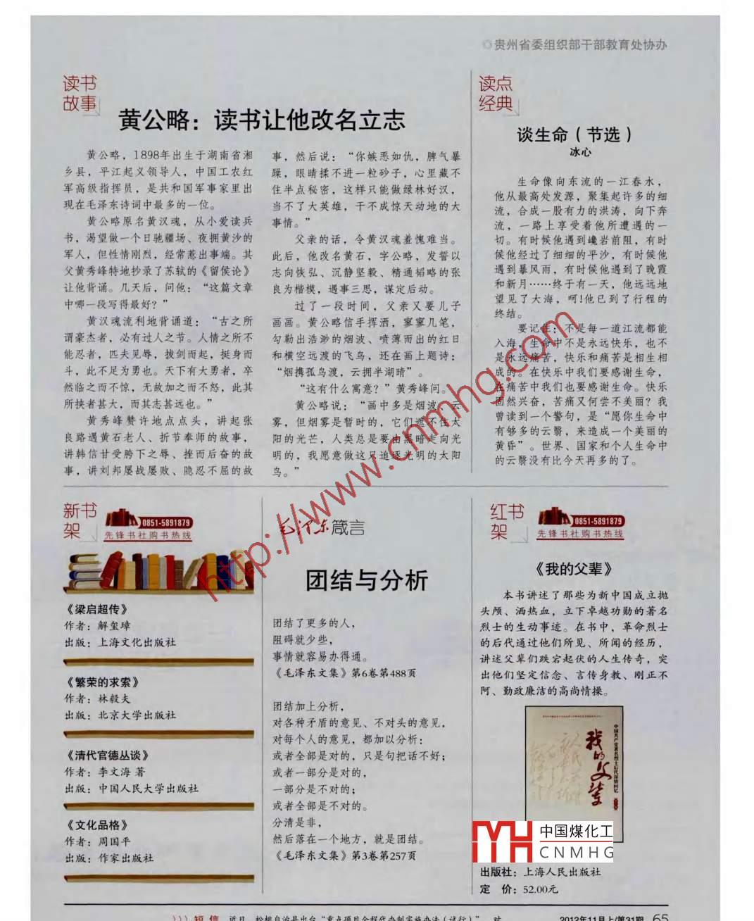 0貴州省委組織部干部教育處協(xié)辦讀書讀點故事經(jīng)典黃公略:讀書讓他改名立志談生命(節(jié)選)黃公略,1898年出生于湖南省湘事,然后說:“你嫉惡如仇,脾氣暴冰心鄉(xiāng)縣,平江起義領(lǐng)導(dǎo)人,中國工農(nóng)紅躁,眼晴揉不進一粒砂子,心里藏不軍高級指揮員,是共和國軍事家里出住半點秘密,這樣只能做綠林好漢,生命像向東流的一江春水現(xiàn)在毛澤東詩詞中最多的一位。他從最高處發(fā)源,聚集起許多的細當(dāng)不了大英雄,干不成驚天動地的大流,合成一股有力的洪濤,向下奔黃公略原名黃漢魂,從小愛讀兵事情流,一路上享受著他所遭遇的書,渴望做一個日馳疆場、夜擁黃沙的父親的話,令黃漢魂羞愧難當(dāng)切。有時候他遇到巉巖前阻,有時軍人,但性情剛烈,經(jīng)常惹出事端。共此后,他改名黃石,字公略,發(fā)誓以候他經(jīng)過了細細的平沙,有時候他父黃秀峰特地抄錄了蘇軾的《留侯論》志向恢弘、沉靜堅毅、精通韜略的張遇到暴風(fēng)雨,有時候他遇到了晚霞讓他背誦。幾天后,問他:“這篇文章良為楷模,遇事三思,謀定后動。和新月……終于有一天,他遠遠地中哪一段寫得最好?”過了一段時間,父親又要兒子望見了大海,呵!他已到了行程的黃漢魂流利地背誦道:“古之所畫畫。黃公略信手揮灑,寥寥幾筆終結(jié)。謂豪杰者,必有過人之節(jié)。人情之所不勾勒出浩渺的煙波、噴薄而出的紅日要記住:不是每一道江流都能入海,生命中不是永遠快樂,也不能忍者,匹夫見辱,拔劍而起,挺身而和橫空遠渡的飛鳥,還在畫上題詩是永遠痛苦,快樂和痛苦是相生相斗,此不足為勇也。天下有大勇者,卒“煙攜孤鳥渡,云擁半湖睛成的。在快樂中我們要感謝生命然臨之而不驚,無故加之而不怒,此其“這有什么寓意?”黃秀峰問。在痛苦中我們也要感謝生命??鞓匪鶔墩呱醮?而其志甚遠也?!秉S公略說:“畫中多是煙波、云固然興奮,苦痛又何嘗不美麗?我黃秀峰贊許地點點頭,講起張霧,但煙霧是暫時的,它們遮不住太曾讀到一個警句,是“愿你生命中良路遇黃石老人、折節(jié)奉師的故事,陽的光芒,人類總是要由黑暗走向光有夠多的云翳,來造成一個美麗的講韓信甘受胯下之辱、挫而后奮的故明的,我愿意做這只追逐光明的太陽黃昏”。世界、國家和個人生命中的云翳沒有比今天再多的了。事,講劉邦屢戰(zhàn)屢敗、隱忍不屈的故鳥。新書851-5891879紅書架6東箴言08515891879先鋒書社購書熱線架社購書熱線異1M團結(jié)與分析《我的父輩》本書講述了那些為新中國成立拋《梁啟超傳》頭顱、灑熱血,立下卓越功勛的著名作者:解璽璋團結(jié)了更多的人,烈士的生動事跡。在書中,革命烈士出版:上海文化出版社阻礙就少些,的后代通過他們所見、所聞的經(jīng)歷事情就容易辦得通。講述父輩們跌宕起伏的人生傳奇,突《繁榮的求索》《毛澤東文集》第6卷第488頁出他們堅定信念、言傳身教、剛正不作者:林毅夫阿、勤政廉潔的高尚情操。團結(jié)加上分析,出版:北京大學(xué)出版社對各種矛盾的意見、不對頭的意見對每個人的意見,都加以分析我《清代官德叢談》或者全部是對的,只是句把話不好;作者:李文海著或者一部分是對的出版:中國人民大學(xué)出版社部分是不對的或者全部是不對的。《文化品格》分清是非,然后落在一個地方,就是團結(jié)。H中國煤化工作者:周國平出版:作家出版社《毛澤東文集》第3卷第257頁CNMHG出版社:上海人民出版社定價:5200元))短信近日,松桃自治縣出臺“重點項目全程代辦制實施辦法(試行)”,對2012年11月上第31期65列入國家、省、市、縣重大項目及招商引資重點項目等實行全程代辦。(松桃自治縣縣委組織部石嘯)